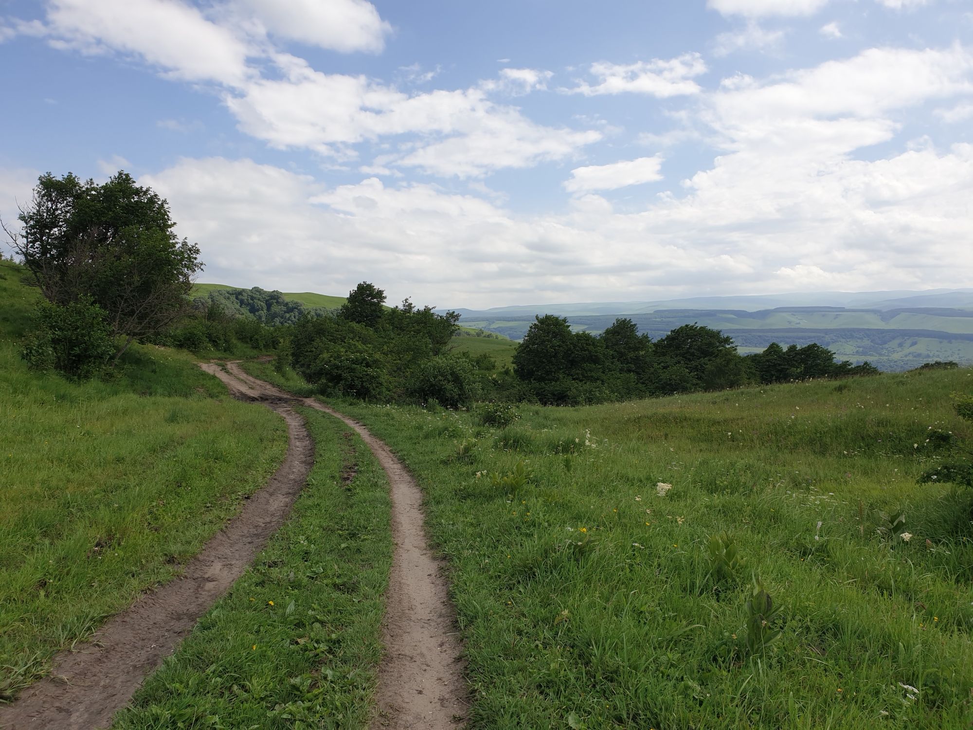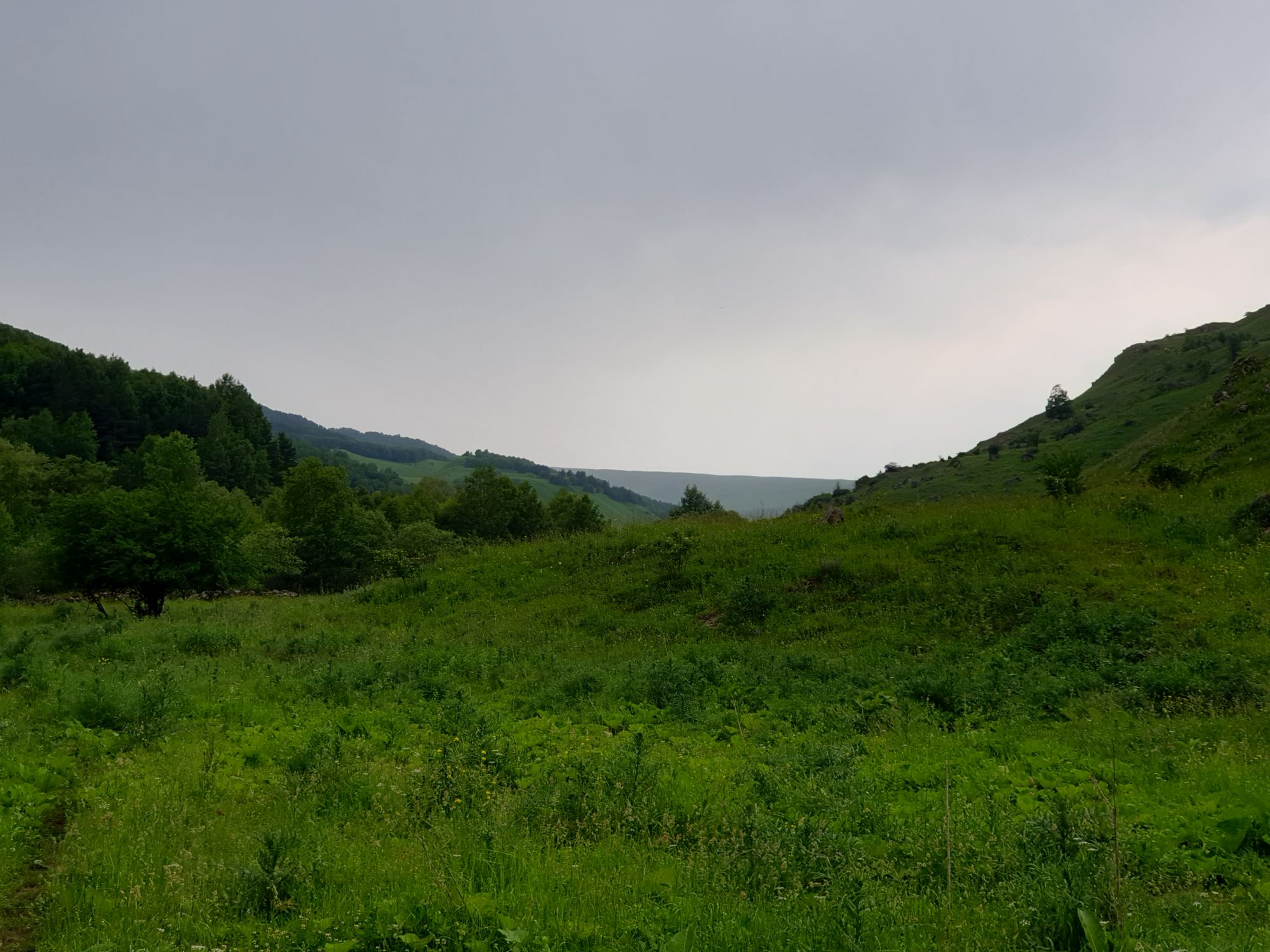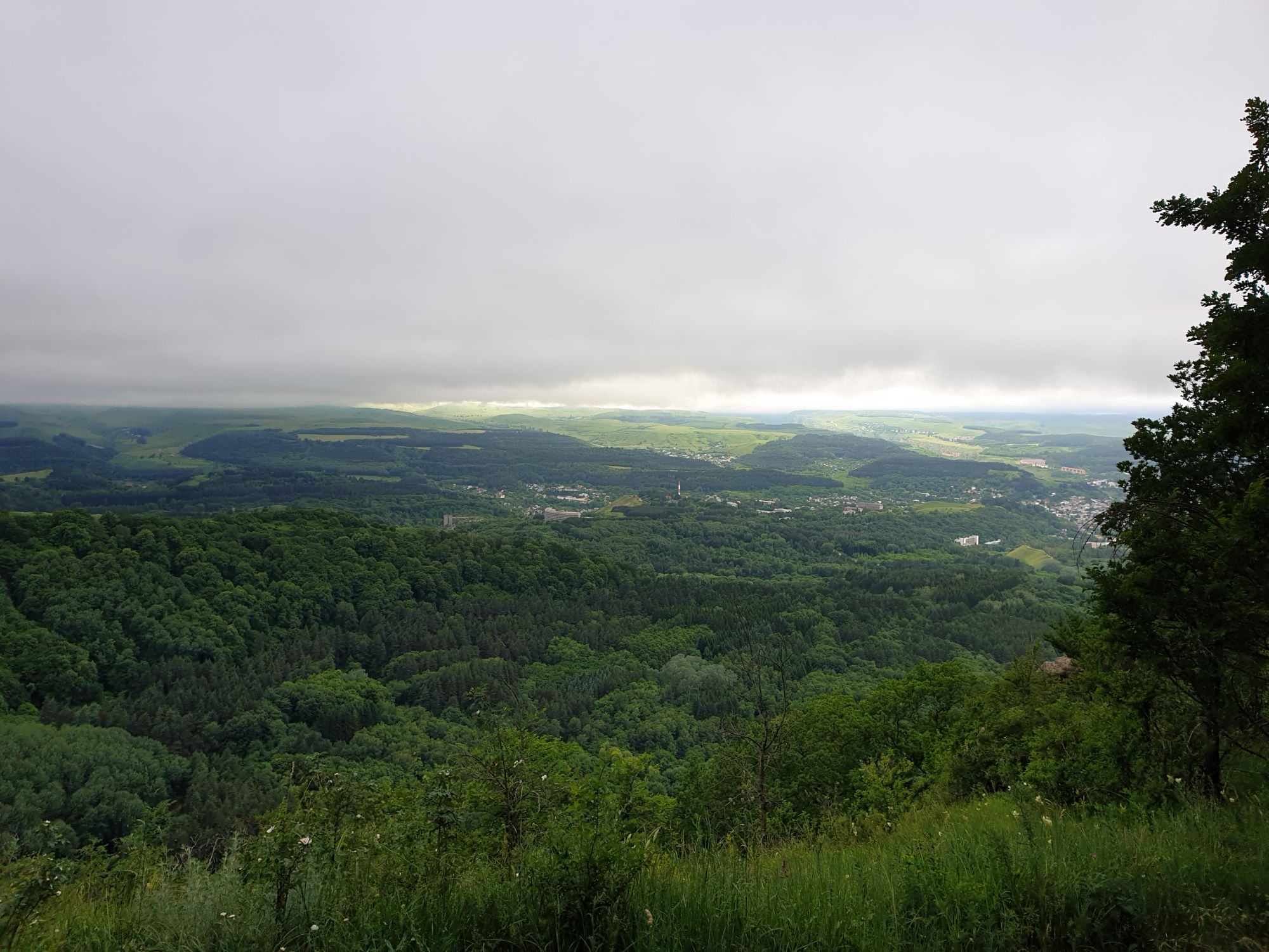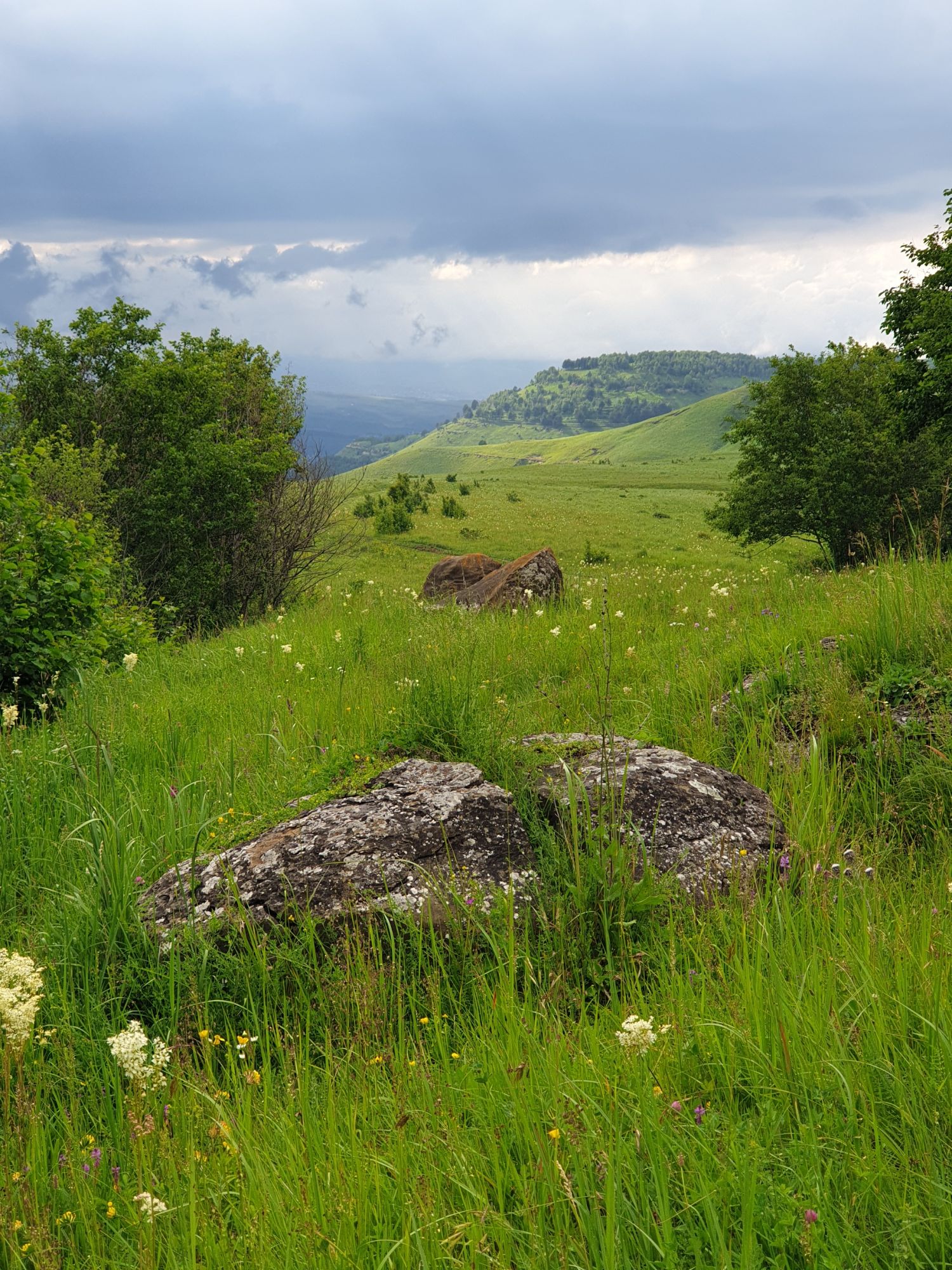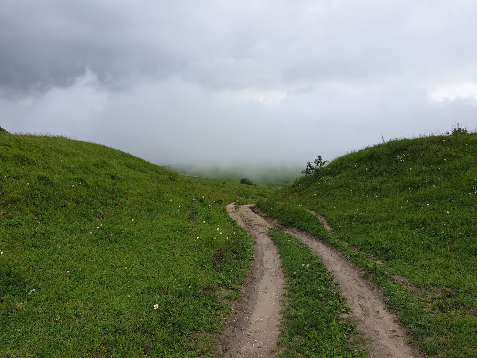 18 июля 2022 Вылазка вторая. Прогулка к Малому Джиналу. Это уже из Кисловодского парка. Гора повыше Малого седла и чуточку пониже Большого (1379м над уровнем моря, если не ошибаюсь). Но подальше от парка и города. Собственно вообще не понятно, к чему она ближе: к Пятигорску, Ессентукам или Кисловодску, но из Кисловодска дорога понятная, не особенно сложная и красивая. Да и мы в Кисловодске))) А еще, по отзывам, оттуда Эльбрус виден едва ли не от самого подножия! Нет, мы не надеялись увидеть Эльбрус, ибо облака, тучи и все тот же прогноз погоды. Но пройти новыми дорогами и немного дальше - почему бы и нет! Тем более это было в тот самый день, когда сорвалась поездка в Джилы-су. Мы поднялись до Малого седла той же дорогой, что и в первый раз. И в это раз подъем дался намного проще: организм таки действительно включился и заработал! Лён изумительно смотрится в горах! А тени от облаков на зеленых склонах сегодня были особенно интересными. Мы на минуточку заглянули на смотровую Малого седла и отправились дальше, мимо того лесочка, где в прошлый раз гуляли и нашли дикую лилию. Я думала, что "до новых мест" почти не буду фотографировать, но как бы не так! Взгляд моментально зацепился за "новые цветочки" : несколько дней назад они еще не цвели, мы тут все травки изучили Яндекс определил как одну из разновидностей дикого клематиса (ломоноса), но я в вопрос не углублялась, точно сказать не могу. А дальше, оставив слева дорогу на Большое седло, мы отправились к новым приключениям. Дорогу было не потерять, она тут одна и подозреваю, что по ней и на внедорожниках ездят, особенно к местам летнего выгона скота, поэтому оставалось только подниматься и спускаться, спускаться и подниматься, преодолевая одну горку за другой. И крутить головой на 360 градусов, конечно. Потому что виды тут невообразимые! В какой-то момент, обернувшись назад, мы увидели лишь макушку Большого седла, на которое с неделю назад забирались. И тот самый лес на соседней с Малым седлом горке. А потом, уже ближе к концу путешествия слева вдалеке открылся вид на пятиглавый Бештау. А слева неизменные зеленые просторы в направление Главного Кавказского хребта. По прямой до него рукой подать, но облака сегодня укрыли горизонт весьма надежно. И они же сделали фотографии особенно живыми и разнообразными) Вокруг цвели луга и это вызывало такой неизъяснимый восторг в душе! Бескрайний густой ковер из цветов, таких трогательных, ярких и нежных одновременно. Я уже старалсь сдерживаться и не снимать каждый цветок (иначе бы никуда не дошли) Но несколько "интересностей" пропустить не могла. Подальше и повыше стали довольно регулярно попадаться орхидеи: А вот этот нежный и миниатюрный красавец удивил. Яндекс определил его как дикий гладиолус! Представляете?! И я склонна ему верить (листья тоже сходятся) . Росточка в этом малыше см 20! Ну и из прочего немного: Преодолев очередной большой подъем мы увидели перед собой завораживающую картину, какую-то бескрайнюю во все стороны. Особенно густая трава и цветы, особенно живописный Бештау как завершение пейзажа с цветущим альпийским лугом, особенно бесконечное и живое море внизу слева и до горизонта... Захотелось остановить момент и погрузиться в него с головой. Запечатлеть его в памяти, в голове, поставить этот вид в рамку на самое видное место в мыслях и благодарить, благодарить,
