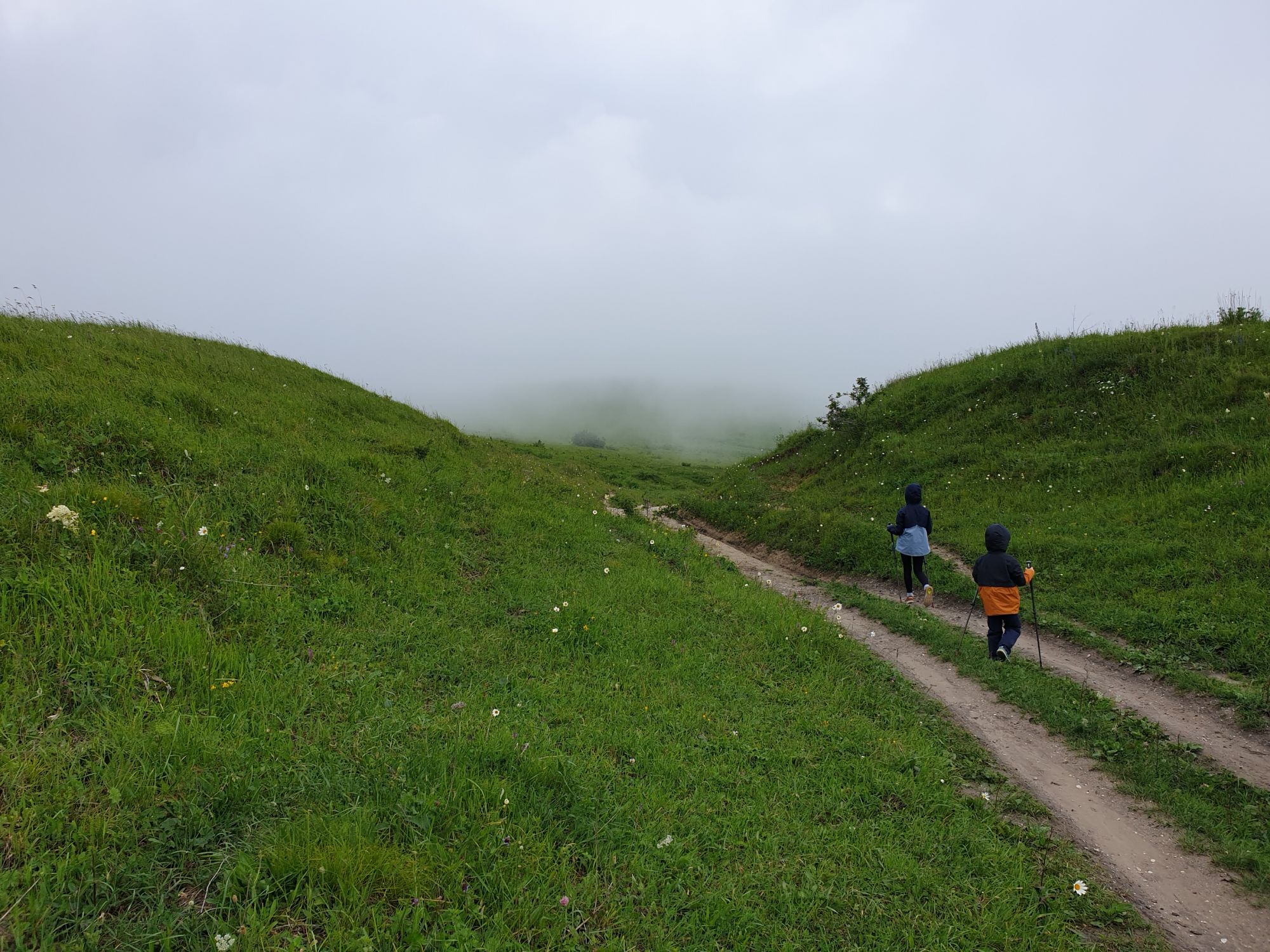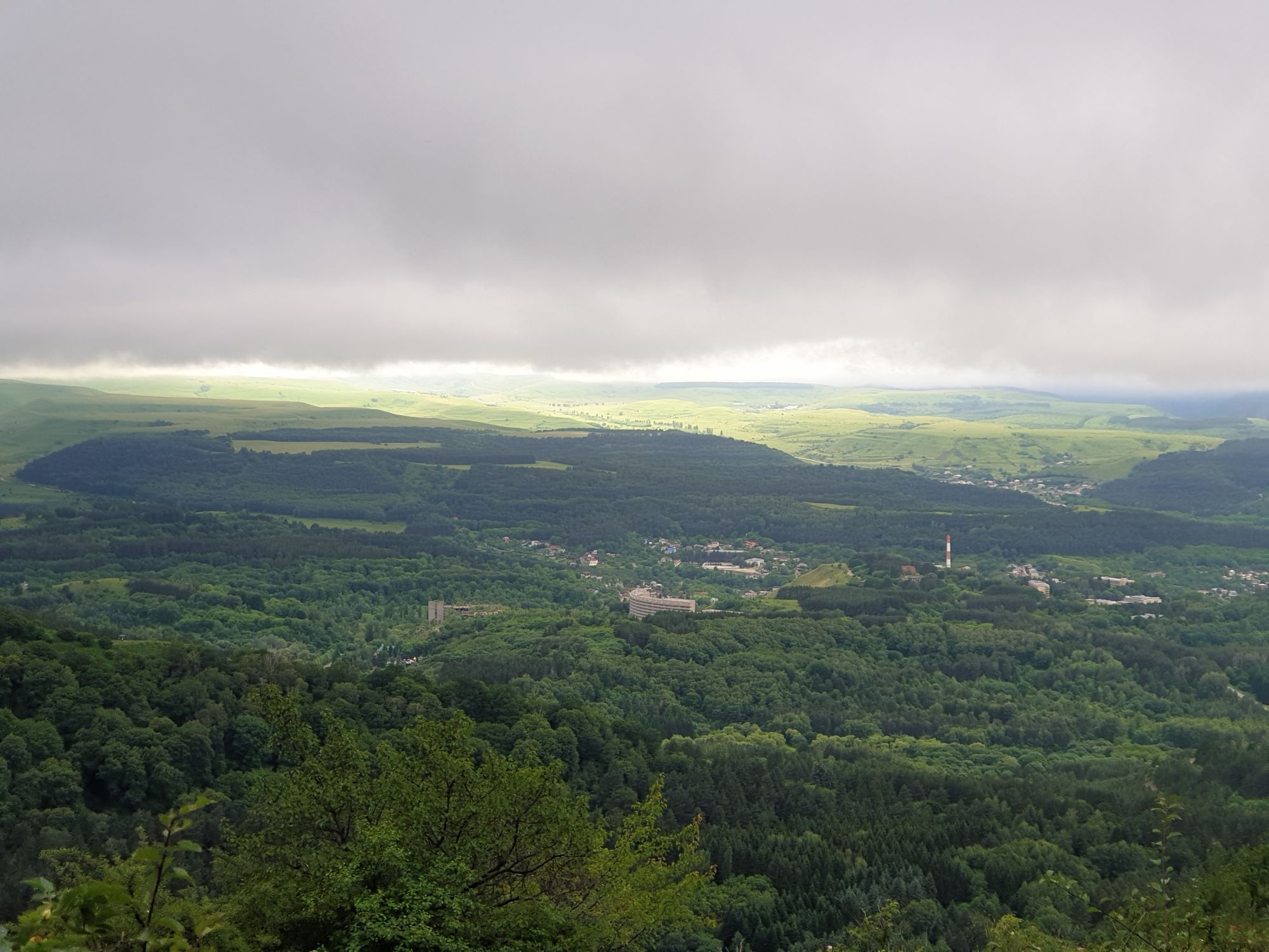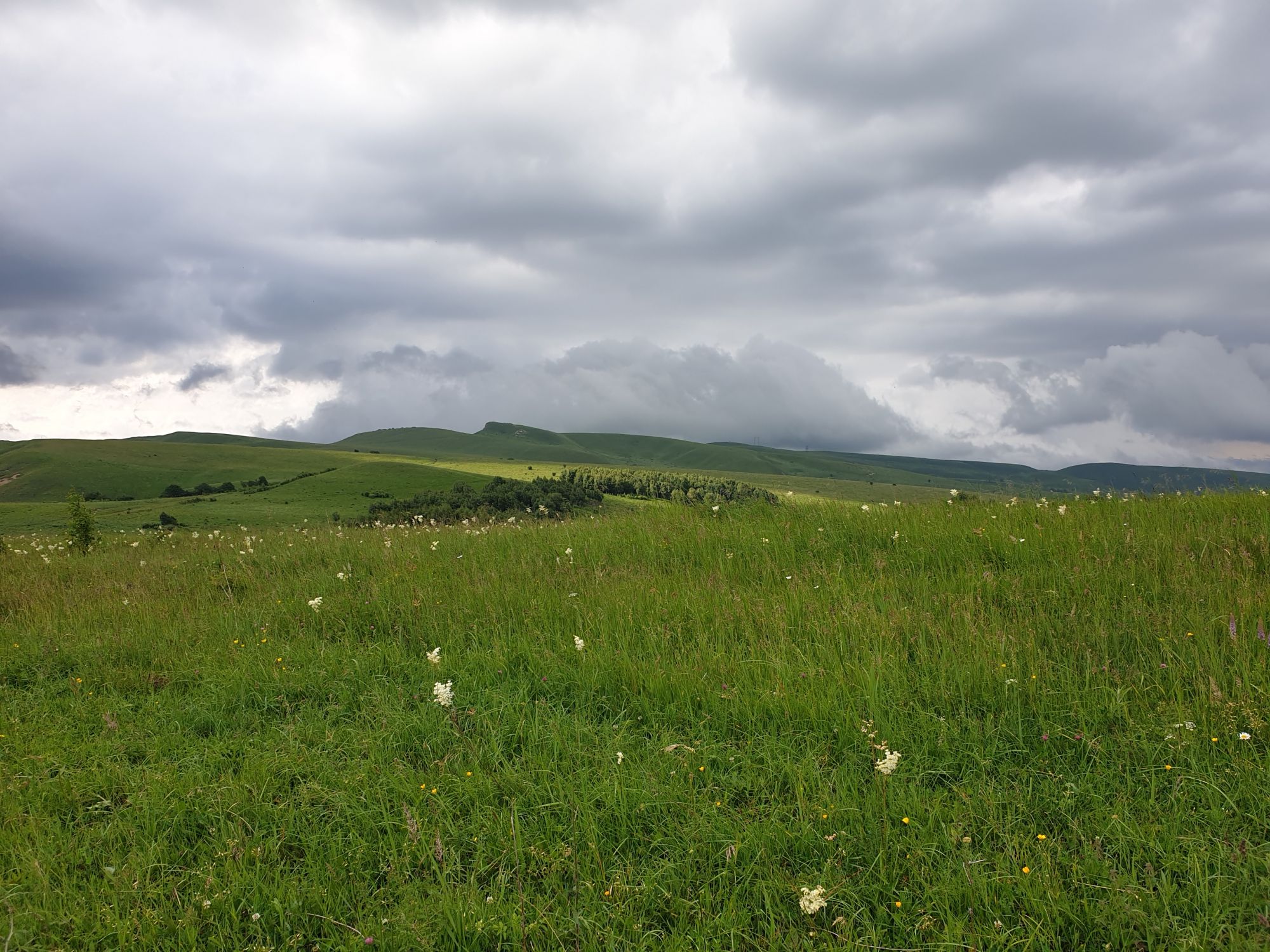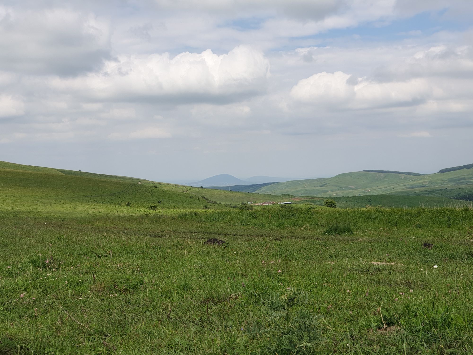 18 июля 2022 Вылазка вторая. Прогулка к Малому Джиналу. Это уже из Кисловодского парка. Гора повыше Малого седла и чуточку пониже Большого (1379м над уровнем моря, если не ошибаюсь). Но подальше от парка и города. Собственно вообще не понятно, к чему она ближе: к Пятигорску, Ессентукам или Кисловодску, но из Кисловодска дорога понятная, не особенно сложная и красивая. Да и мы в Кисловодске))) А еще, по отзывам, оттуда Эльбрус виден едва ли не от самого подножия! Нет, мы не надеялись увидеть Эльбрус, ибо облака, тучи и все тот же прогноз погоды. Но пройти новыми дорогами и немного дальше - почему бы и нет! Тем более это было в тот самый день, когда сорвалась поездка в Джилы-су. Мы поднялись до Малого седла той же дорогой, что и в первый раз. И в это раз подъем дался намного проще: организм таки действительно включился и заработал! Лён изумительно смотрится в горах! А тени от облаков на зеленых склонах сегодня были особенно интересными. Мы на минуточку заглянули на смотровую Малого седла и отправились дальше, мимо того лесочка, где в прошлый раз гуляли и нашли дикую лилию. Я думала, что "до новых мест" почти не буду фотографировать, но как бы не так! Взгляд моментально зацепился за "новые цветочки" : несколько дней назад они еще не цвели, мы тут все травки изучили Яндекс определил как одну из разновидностей дикого клематиса (ломоноса), но я в вопрос не углублялась, точно сказать не могу. А дальше, оставив слева дорогу на Большое седло, мы отправились к новым приключениям. Дорогу было не потерять, она тут одна и подозреваю, что по ней и на внедорожниках ездят, особенно к местам летнего выгона скота, поэтому оставалось только подниматься и спускаться, спускаться и подниматься, преодолевая одну горку за другой. И крутить головой на 360 градусов, конечно. Потому что виды тут невообразимые! В какой-то момент, обернувшись назад, мы увидели лишь макушку Большого седла, на которое с неделю назад забирались. И тот самый лес на соседней с Малым седлом горке. А потом, уже ближе к концу путешествия слева вдалеке открылся вид на пятиглавый Бештау. А слева неизменные зеленые просторы в направление Главного Кавказского хребта. По прямой до него рукой подать, но облака сегодня укрыли горизонт весьма надежно. И они же сделали фотографии особенно живыми и разнообразными) Вокруг цвели луга и это вызывало такой неизъяснимый восторг в душе! Бескрайний густой ковер из цветов, таких трогательных, ярких и нежных одновременно. Я уже старалсь сдерживаться и не снимать каждый цветок (иначе бы никуда не дошли) Но несколько "интересностей" пропустить не могла. Подальше и повыше стали довольно регулярно попадаться орхидеи: А вот этот нежный и миниатюрный красавец удивил. Яндекс определил его как дикий гладиолус! Представляете?! И я склонна ему верить (листья тоже сходятся) . Росточка в этом малыше см 20! Ну и из прочего немного: Преодолев очередной большой подъем мы увидели перед собой завораживающую картину, какую-то бескрайнюю во все стороны. Особенно густая трава и цветы, особенно живописный Бештау как завершение пейзажа с цветущим альпийским лугом, особенно бесконечное и живое море внизу слева и до горизонта... Захотелось остановить момент и погрузиться в него с головой. Запечатлеть его в памяти, в голове, поставить этот вид в рамку на самое видное место в мыслях и благодарить, благодарить,