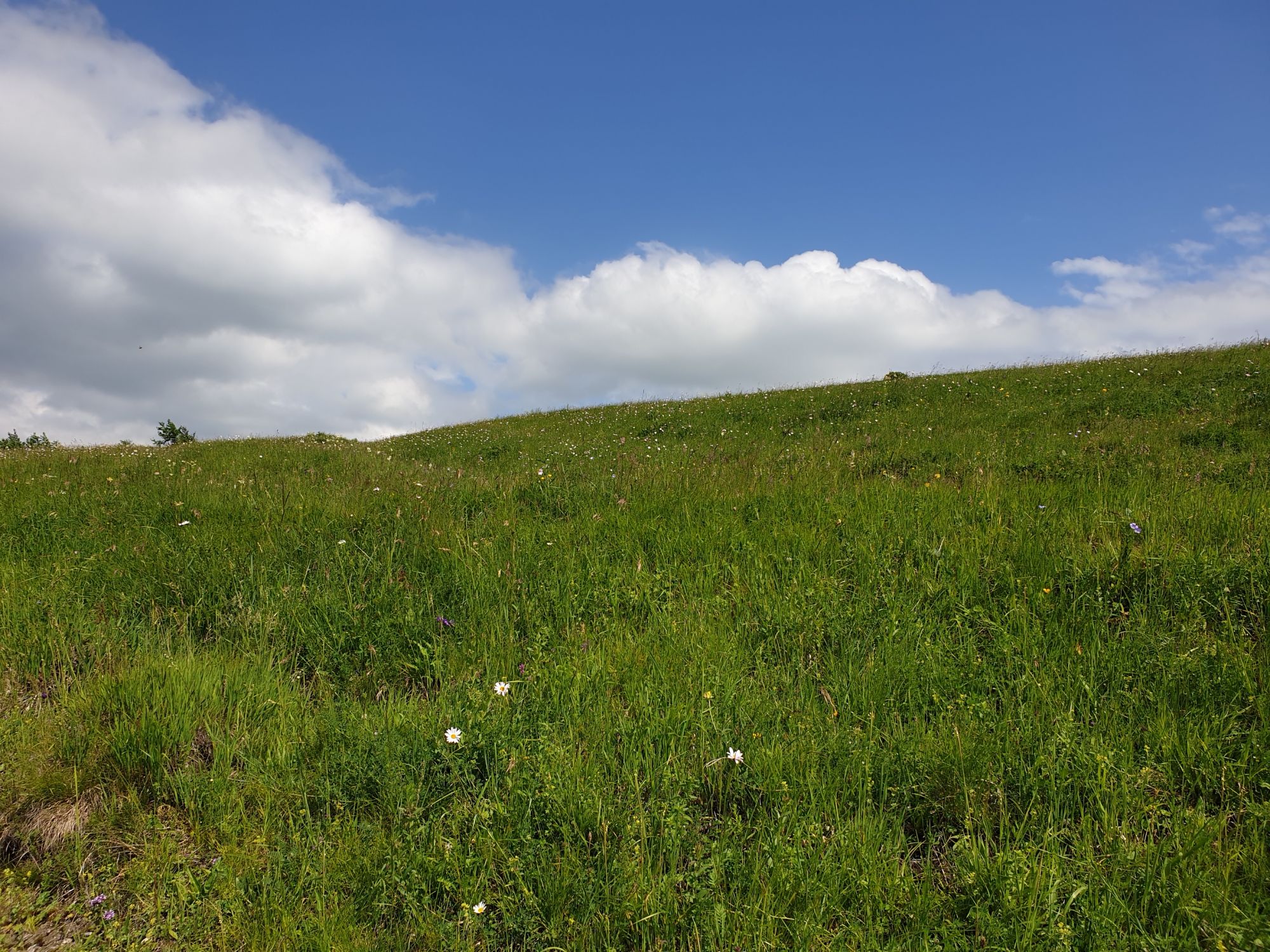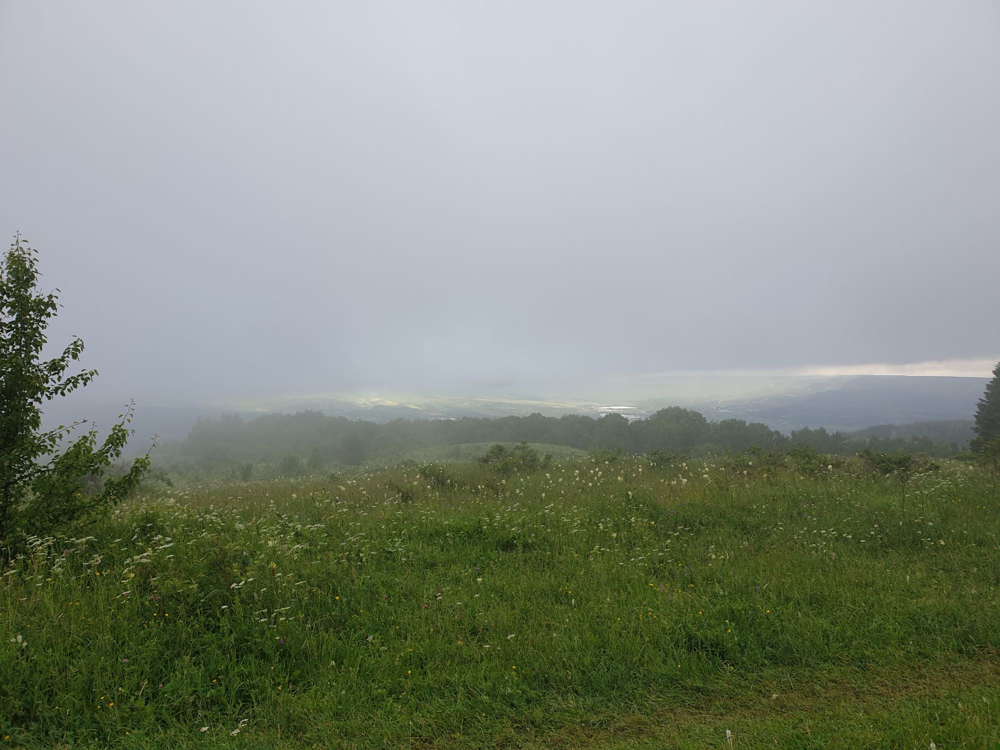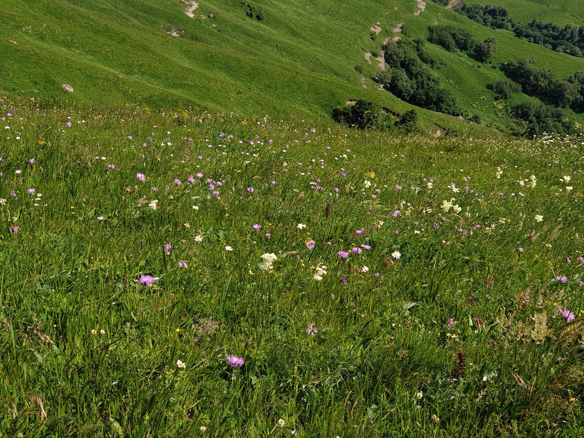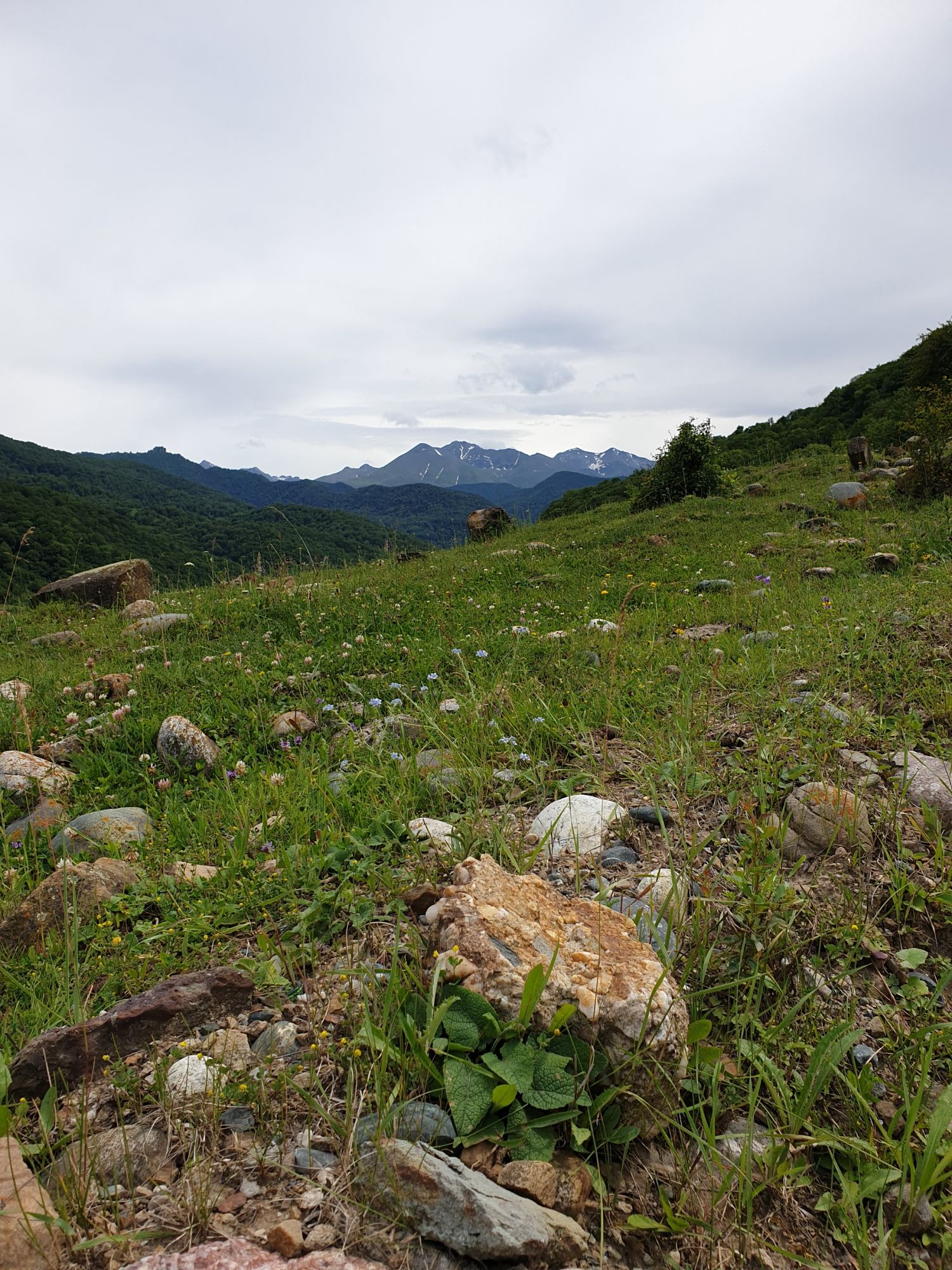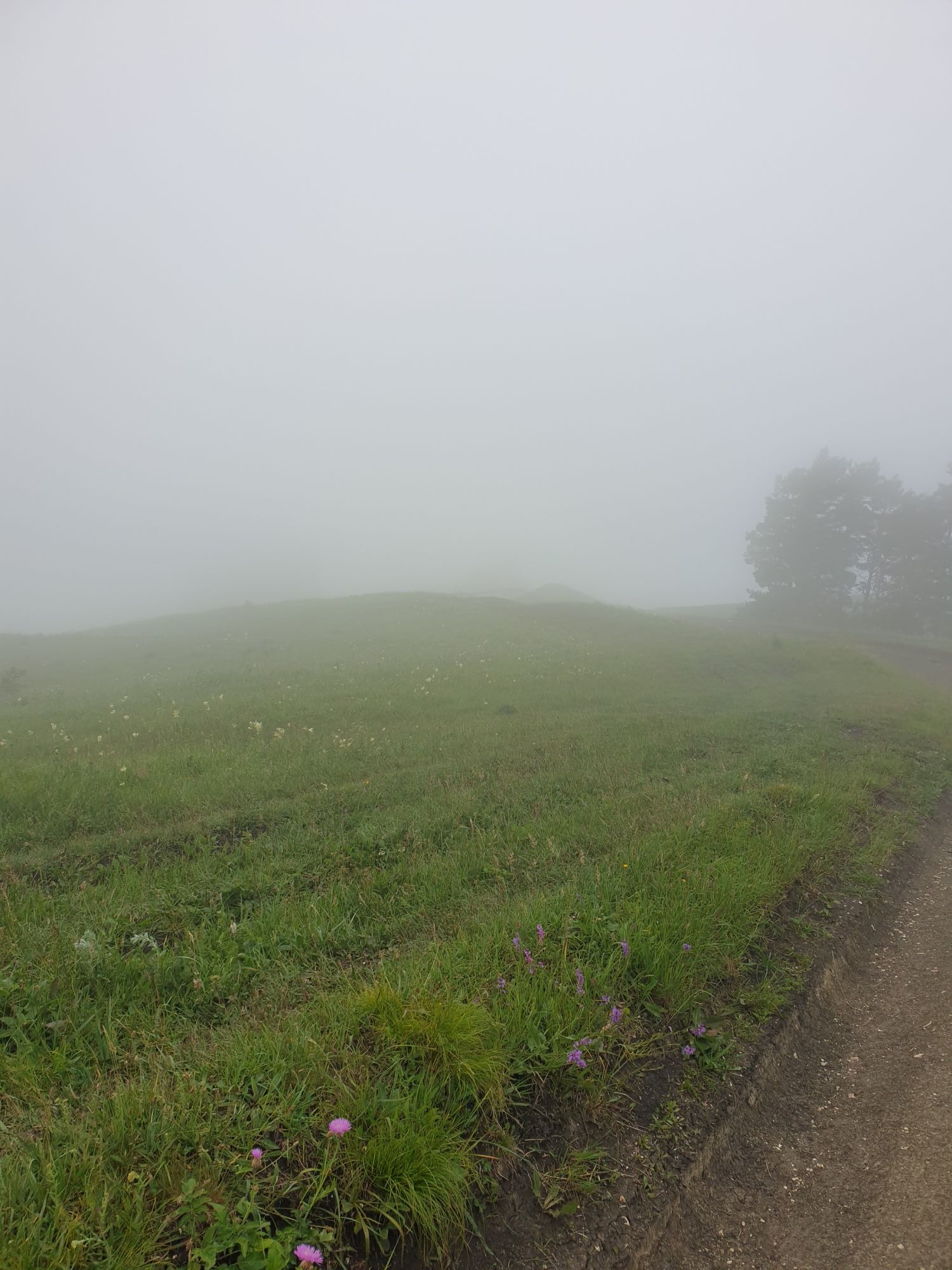 18 июля 2022 Вылазка вторая. Прогулка к Малому Джиналу. Это уже из Кисловодского парка. Гора повыше Малого седла и чуточку пониже Большого (1379м над уровнем моря, если не ошибаюсь). Но подальше от парка и города. Собственно вообще не понятно, к чему она ближе: к Пятигорску, Ессентукам или Кисловодску, но из Кисловодска дорога понятная, не особенно сложная и красивая. Да и мы в Кисловодске))) А еще, по отзывам, оттуда Эльбрус виден едва ли не от самого подножия! Нет, мы не надеялись увидеть Эльбрус, ибо облака, тучи и все тот же прогноз погоды. Но пройти новыми дорогами и немного дальше - почему бы и нет! Тем более это было в тот самый день, когда сорвалась поездка в Джилы-су. Мы поднялись до Малого седла той же дорогой, что и в первый раз. И в это раз подъем дался намного проще: организм таки действительно включился и заработал! Лён изумительно смотрится в горах! А тени от облаков на зеленых склонах сегодня были особенно интересными. Мы на минуточку заглянули на смотровую Малого седла и отправились дальше, мимо того лесочка, где в прошлый раз гуляли и нашли дикую лилию. Я думала, что "до новых мест" почти не буду фотографировать, но как бы не так! Взгляд моментально зацепился за "новые цветочки" : несколько дней назад они еще не цвели, мы тут все травки изучили Яндекс определил как одну из разновидностей дикого клематиса (ломоноса), но я в вопрос не углублялась, точно сказать не могу. А дальше, оставив слева дорогу на Большое седло, мы отправились к новым приключениям. Дорогу было не потерять, она тут одна и подозреваю, что по ней и на внедорожниках ездят, особенно к местам летнего выгона скота, поэтому оставалось только подниматься и спускаться, спускаться и подниматься, преодолевая одну горку за другой. И крутить головой на 360 градусов, конечно. Потому что виды тут невообразимые! В какой-то момент, обернувшись назад, мы увидели лишь макушку Большого седла, на которое с неделю назад забирались. И тот самый лес на соседней с Малым седлом горке. А потом, уже ближе к концу путешествия слева вдалеке открылся вид на пятиглавый Бештау. А слева неизменные зеленые просторы в направление Главного Кавказского хребта. По прямой до него рукой подать, но облака сегодня укрыли горизонт весьма надежно. И они же сделали фотографии особенно живыми и разнообразными) Вокруг цвели луга и это вызывало такой неизъяснимый восторг в душе! Бескрайний густой ковер из цветов, таких трогательных, ярких и нежных одновременно. Я уже старалсь сдерживаться и не снимать каждый цветок (иначе бы никуда не дошли) Но несколько "интересностей" пропустить не могла. Подальше и повыше стали довольно регулярно попадаться орхидеи: А вот этот нежный и миниатюрный красавец удивил. Яндекс определил его как дикий гладиолус! Представляете?! И я склонна ему верить (листья тоже сходятся) . Росточка в этом малыше см 20! Ну и из прочего немного: Преодолев очередной большой подъем мы увидели перед собой завораживающую картину, какую-то бескрайнюю во все стороны. Особенно густая трава и цветы, особенно живописный Бештау как завершение пейзажа с цветущим альпийским лугом, особенно бесконечное и живое море внизу слева и до горизонта... Захотелось остановить момент и погрузиться в него с головой. Запечатлеть его в памяти, в голове, поставить этот вид в рамку на самое видное место в мыслях и благодарить, благодарить,