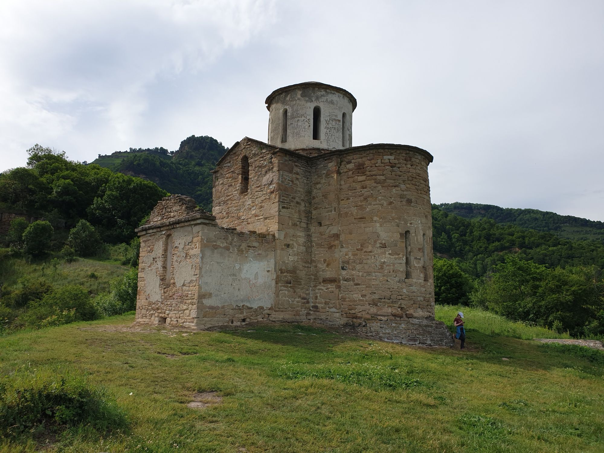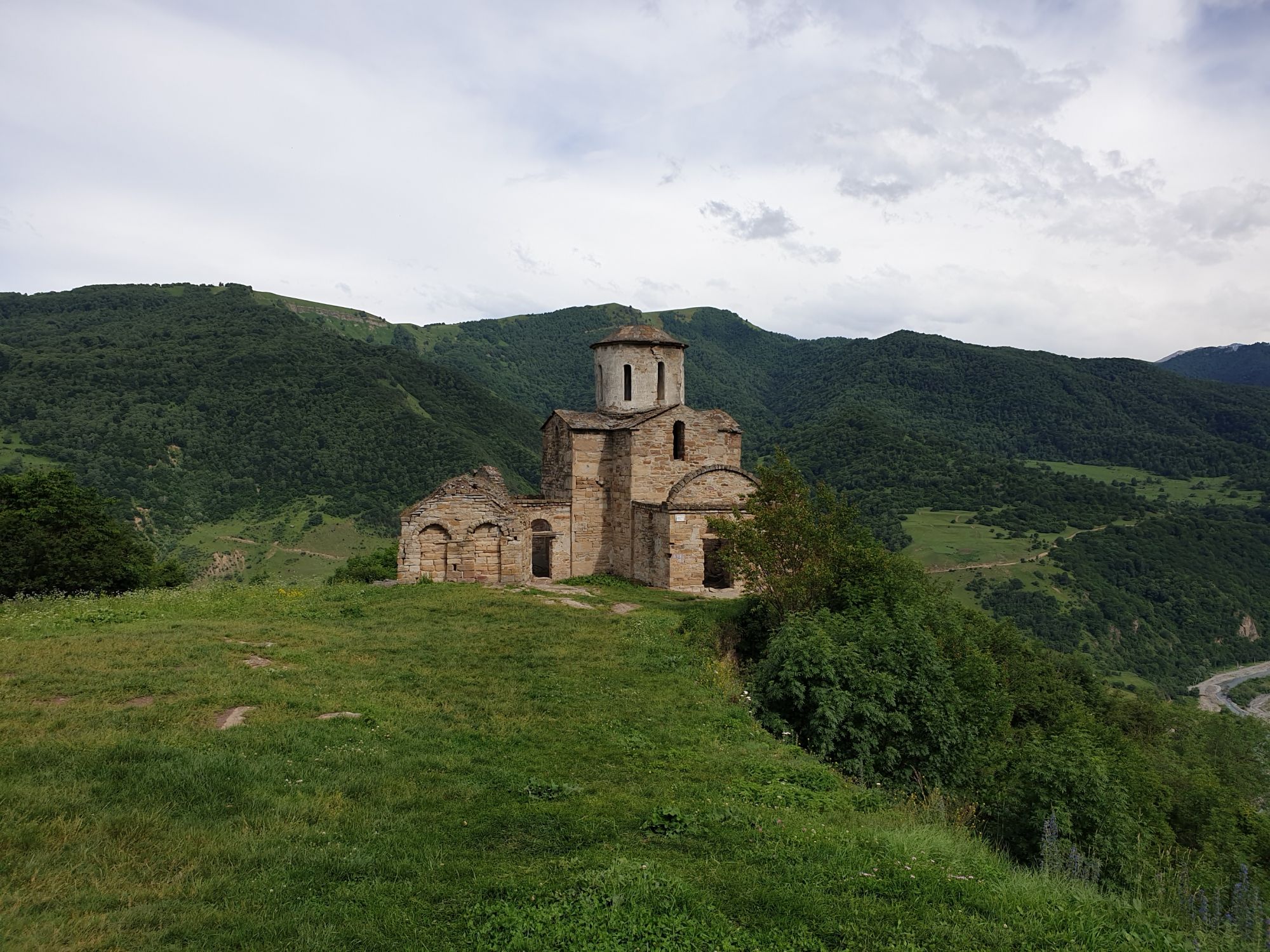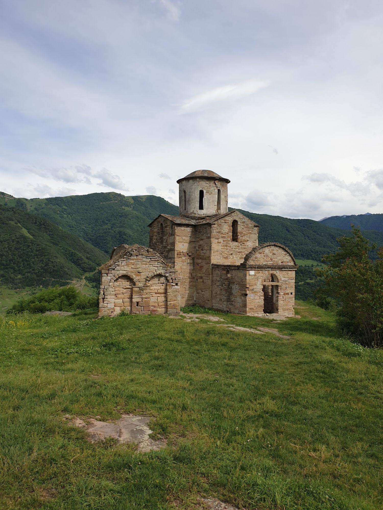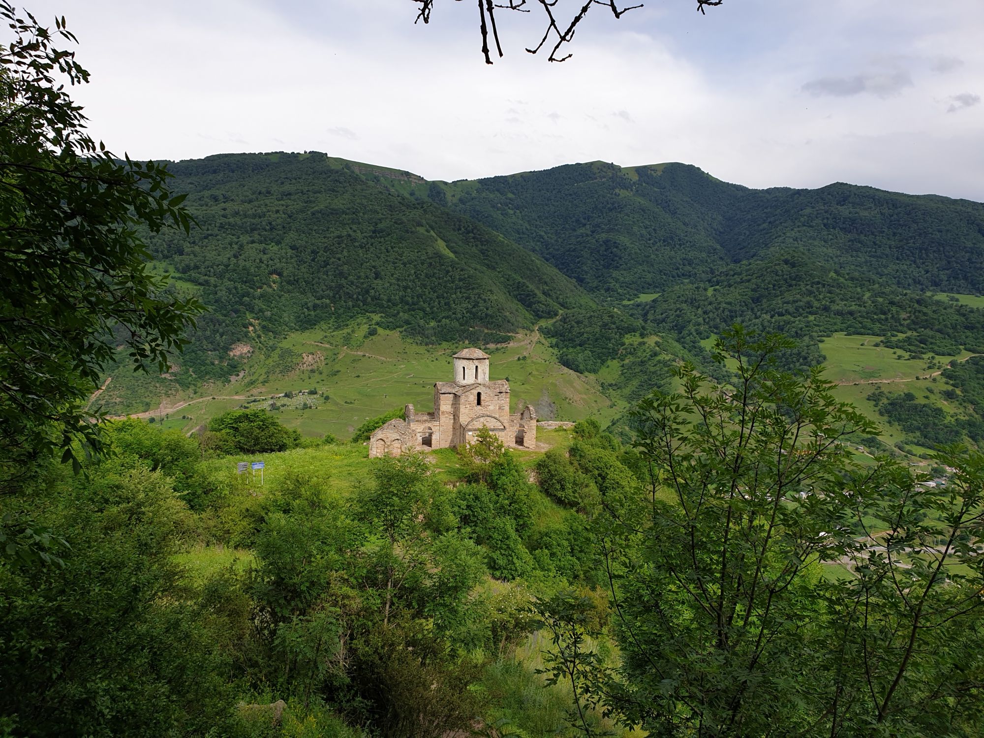 19 июля 2022 И вылазка третья и заключительная. В самом конце отпуска мы решили еще раз наведаться Карачаево-Черкессию. Отчасти потому, что после фееричного похода на Малый Джинал перебивать впечатления чем-то аналогичным не хотелось, отчасти потому, что это было единственное место из умеренно доступных, где яндекс не обещал дождя весь день, отчасти потому что муж и дети хотели заехать на Карачаевский пивзавод и увезти с собой из отпуска пару ящиков их потрясающего лимонада и (уже только муж) "немного еще чего-нибудь" В общем, отправились мы той же дорогой, что и в прошлый раз. И минут на десять нам даже Эльбрус показался, потом быстро скрывшийся в облаках. После успешного посещения магазинчика при заводе, первой нашей целью стал поселок Нижняя Теберда, из которого мы намеревались пешком подняться к Сентинскому храму, расположенному высоко на горе. Храм христианский, построоен в X веке, относится к расцвету Аланского государства, которое как раз примерно в это время приняло христианство по Византийскому образцу. Собственно этот храм и совсем чуть более поздний Шоанинский, что находится относительно недалеко и тоже в долине реки Теберда - одни из немногих примеров сохранившихся христианских храмов столько раннего периода постройки. Если вдуматься: ведь Сентинский храм построен даже раньше, чем Русь официально приняла христианство! Сейчас этот храм не действует и даже не реставрируется, хотя таблички про памятник таки появились. Но, как вы понимаете, для нас главным было не это. А природа. Красавица Теберда с голубой водой, я не устану признаваться тебе в своей любви! Мы предполагали, что подъем будет непрост и долог. Но на деле вышло, что он был приятен и закончился неожиданно быстро. Только вначале пришлось попотеть немного. Вот нам туда, на ту гору... Дорога в целом проезжаема. Вероятно даже для высоких седанов в сухую погоду при умелом вождении. Но камнепады и обвалы тут, явно, случаются постоянно, это надо учитывать. Но мы ж как обычно, хотим погулять)) И вот он храм. Я очень впечатлена. Он прост, но совершенен. Не говоря уже про то, что виды тут открываются на поселок, долину и заснеженные горы Тебердинского заповедника впечатляющие. А это я повыше забралась)) : Нам посчастливилось побывать тут в полном одиночестве. И я очень рада, что мы выбрали в качестве цели поездки и пешей прогулки именно это место. Не зря его многие рекомендуют к посещению. Красиво, интересно и устать не успеваешь)) На обратном пути уже шли, расслабившись и выискивая по лесу землянику. Иногда и не только ягода попадалась)) Потом мы заехали в Карачаевск поесть. А пока наслаждались вкусной едой, думали, куда мы сегодня еще можем успеть. Юля в своей теме рассказывала про сырные пещеры, может к ним? Или все таки к Шоанинскому храму? Дети, конечно, за пещеры. Ну что ж, попробуем их отыскать. Свернули в сторону перевала Гум-баши и почти сразу пошел дождик. И время около шести часов вечера. Что-то мне подсказывает, что в таких условиях нам не очень хотелось их найти (точнее нам с мужем лезть по мокрым скалам вверх и снова ходить по дождю), а потому мы и не нашли)))) Быстренько уговорили детей не расстраиваться и муж решительно поставил точку в навигаторе на Шоанинский храм. Он тоже на скале, но уже над огромным селом им.Коста Хетагурова. Одно "но". Подняться к нему пешком мы уже не успева