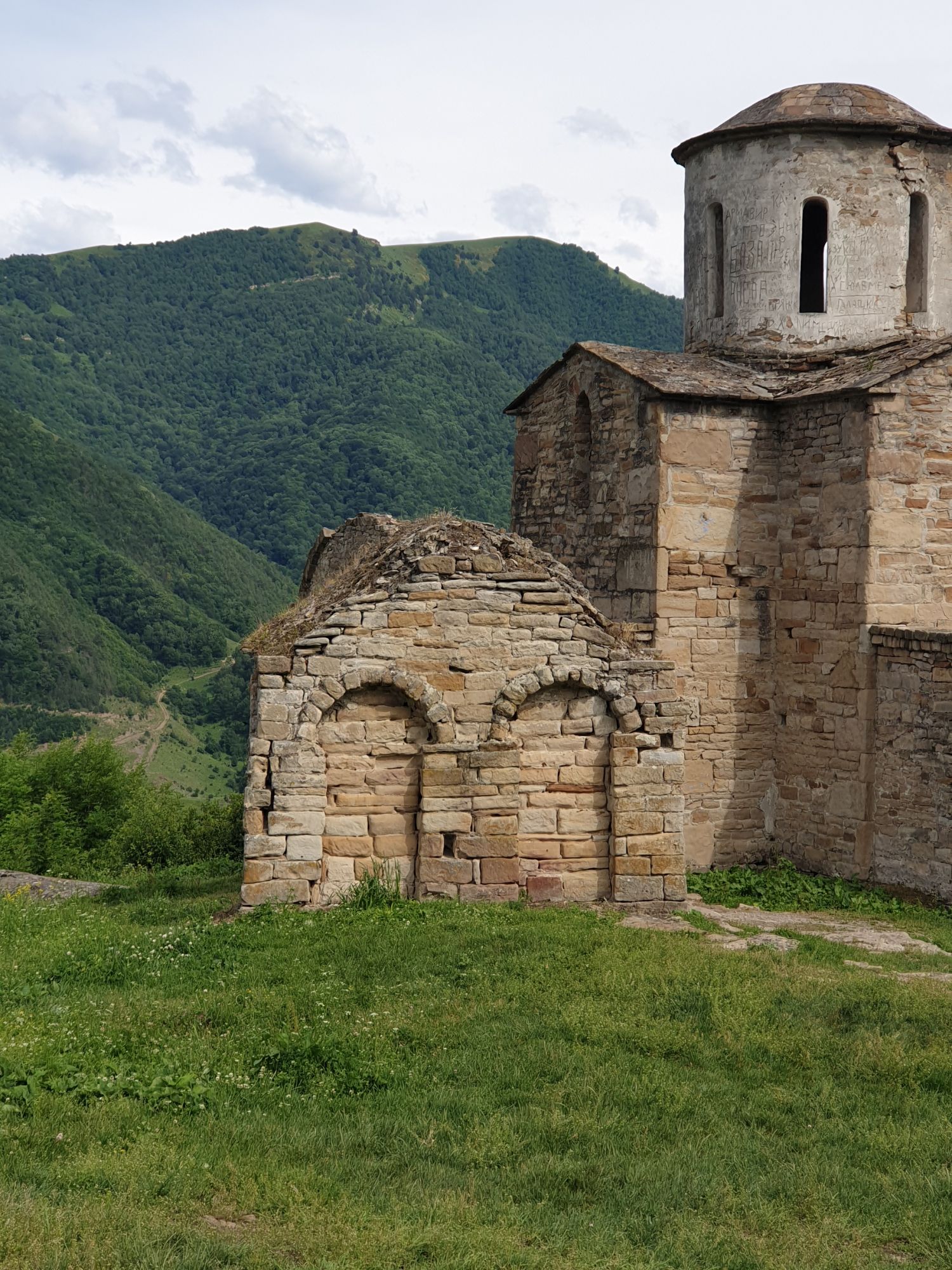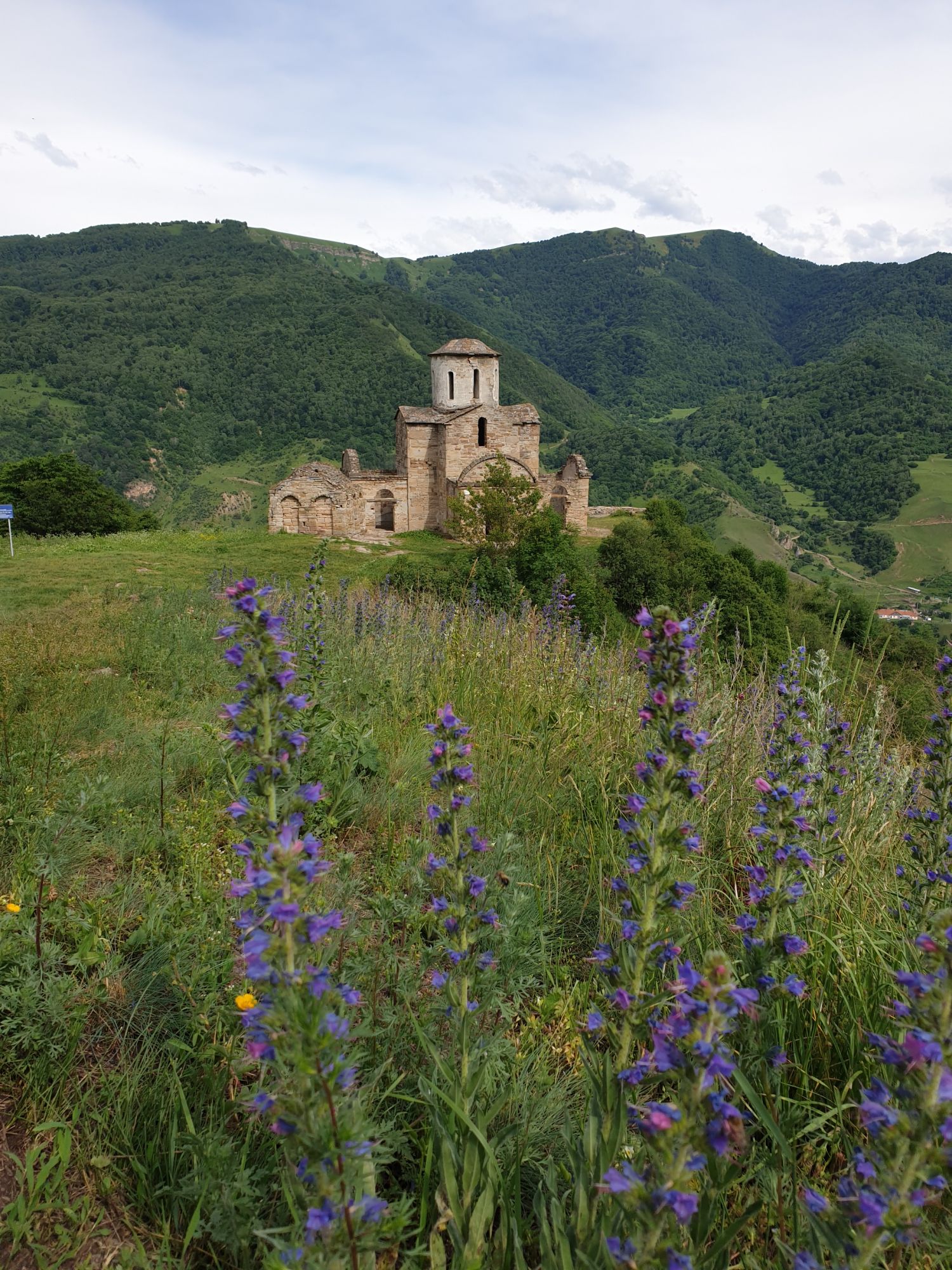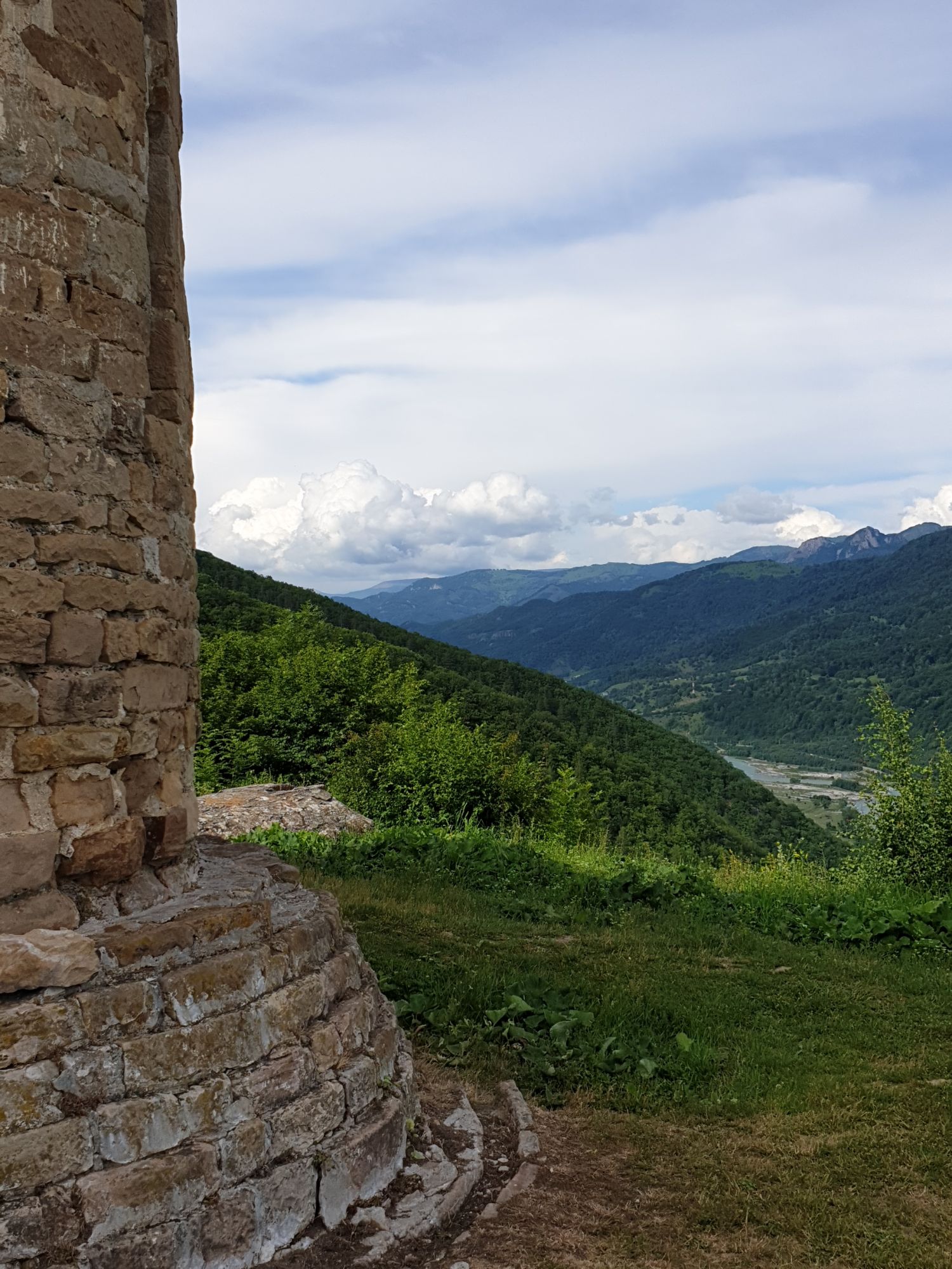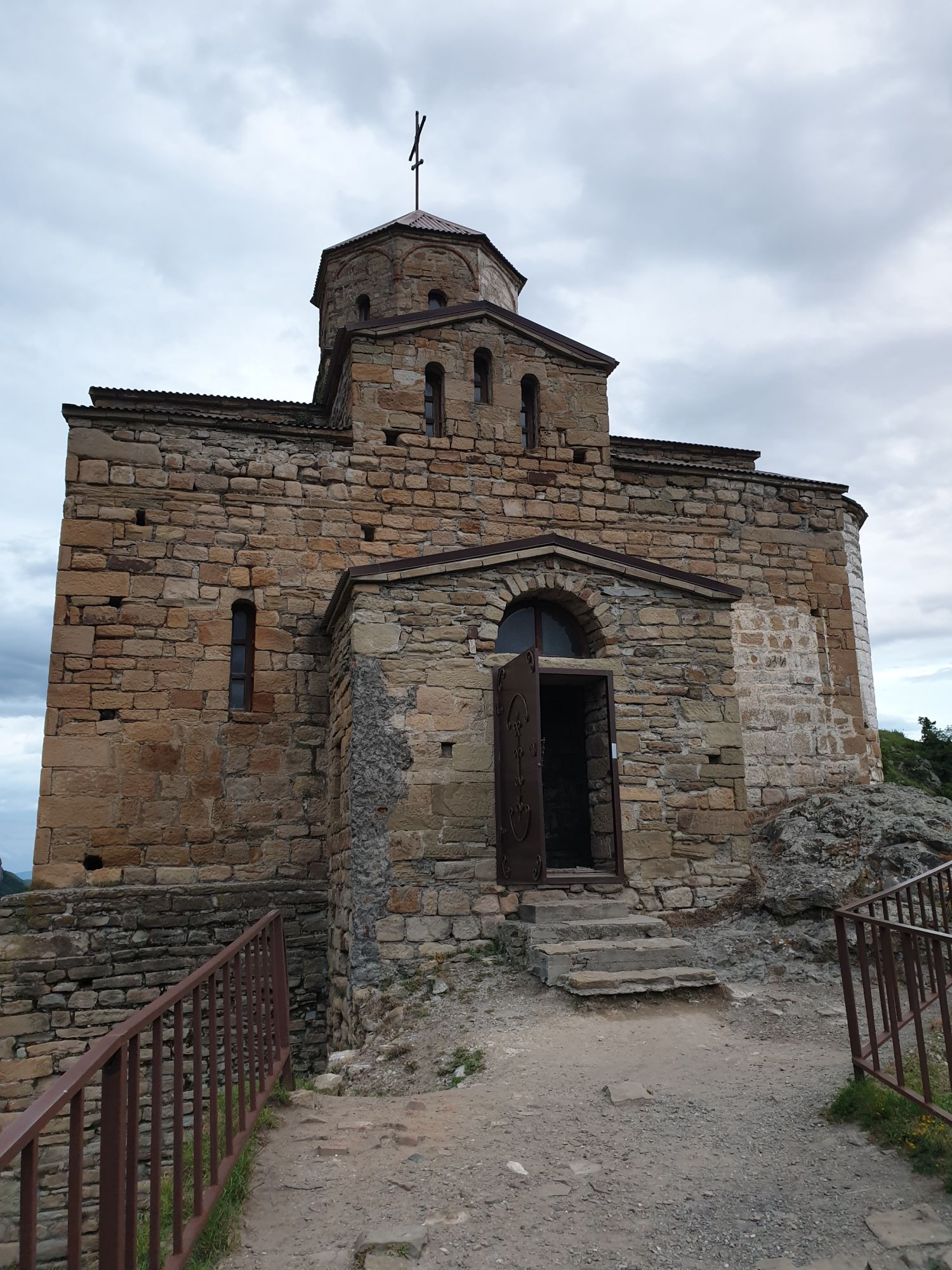 19 июля 2022 И вылазка третья и заключительная. В самом конце отпуска мы решили еще раз наведаться Карачаево-Черкессию. Отчасти потому, что после фееричного похода на Малый Джинал перебивать впечатления чем-то аналогичным не хотелось, отчасти потому, что это было единственное место из умеренно доступных, где яндекс не обещал дождя весь день, отчасти потому что муж и дети хотели заехать на Карачаевский пивзавод и увезти с собой из отпуска пару ящиков их потрясающего лимонада и (уже только муж) "немного еще чего-нибудь" В общем, отправились мы той же дорогой, что и в прошлый раз. И минут на десять нам даже Эльбрус показался, потом быстро скрывшийся в облаках. После успешного посещения магазинчика при заводе, первой нашей целью стал поселок Нижняя Теберда, из которого мы намеревались пешком подняться к Сентинскому храму, расположенному высоко на горе. Храм христианский, построоен в X веке, относится к расцвету Аланского государства, которое как раз примерно в это время приняло христианство по Византийскому образцу. Собственно этот храм и совсем чуть более поздний Шоанинский, что находится относительно недалеко и тоже в долине реки Теберда - одни из немногих примеров сохранившихся христианских храмов столько раннего периода постройки. Если вдуматься: ведь Сентинский храм построен даже раньше, чем Русь официально приняла христианство! Сейчас этот храм не действует и даже не реставрируется, хотя таблички про памятник таки появились. Но, как вы понимаете, для нас главным было не это. А природа. Красавица Теберда с голубой водой, я не устану признаваться тебе в своей любви! Мы предполагали, что подъем будет непрост и долог. Но на деле вышло, что он был приятен и закончился неожиданно быстро. Только вначале пришлось попотеть немного. Вот нам туда, на ту гору... Дорога в целом проезжаема. Вероятно даже для высоких седанов в сухую погоду при умелом вождении. Но камнепады и обвалы тут, явно, случаются постоянно, это надо учитывать. Но мы ж как обычно, хотим погулять)) И вот он храм. Я очень впечатлена. Он прост, но совершенен. Не говоря уже про то, что виды тут открываются на поселок, долину и заснеженные горы Тебердинского заповедника впечатляющие. А это я повыше забралась)) : Нам посчастливилось побывать тут в полном одиночестве. И я очень рада, что мы выбрали в качестве цели поездки и пешей прогулки именно это место. Не зря его многие рекомендуют к посещению. Красиво, интересно и устать не успеваешь)) На обратном пути уже шли, расслабившись и выискивая по лесу землянику. Иногда и не только ягода попадалась)) Потом мы заехали в Карачаевск поесть. А пока наслаждались вкусной едой, думали, куда мы сегодня еще можем успеть. Юля в своей теме рассказывала про сырные пещеры, может к ним? Или все таки к Шоанинскому храму? Дети, конечно, за пещеры. Ну что ж, попробуем их отыскать. Свернули в сторону перевала Гум-баши и почти сразу пошел дождик. И время около шести часов вечера. Что-то мне подсказывает, что в таких условиях нам не очень хотелось их найти (точнее нам с мужем лезть по мокрым скалам вверх и снова ходить по дождю), а потому мы и не нашли)))) Быстренько уговорили детей не расстраиваться и муж решительно поставил точку в навигаторе на Шоанинский храм. Он тоже на скале, но уже над огромным селом им.Коста Хетагурова. Одно "но". Подняться к нему пешком мы уже не успева