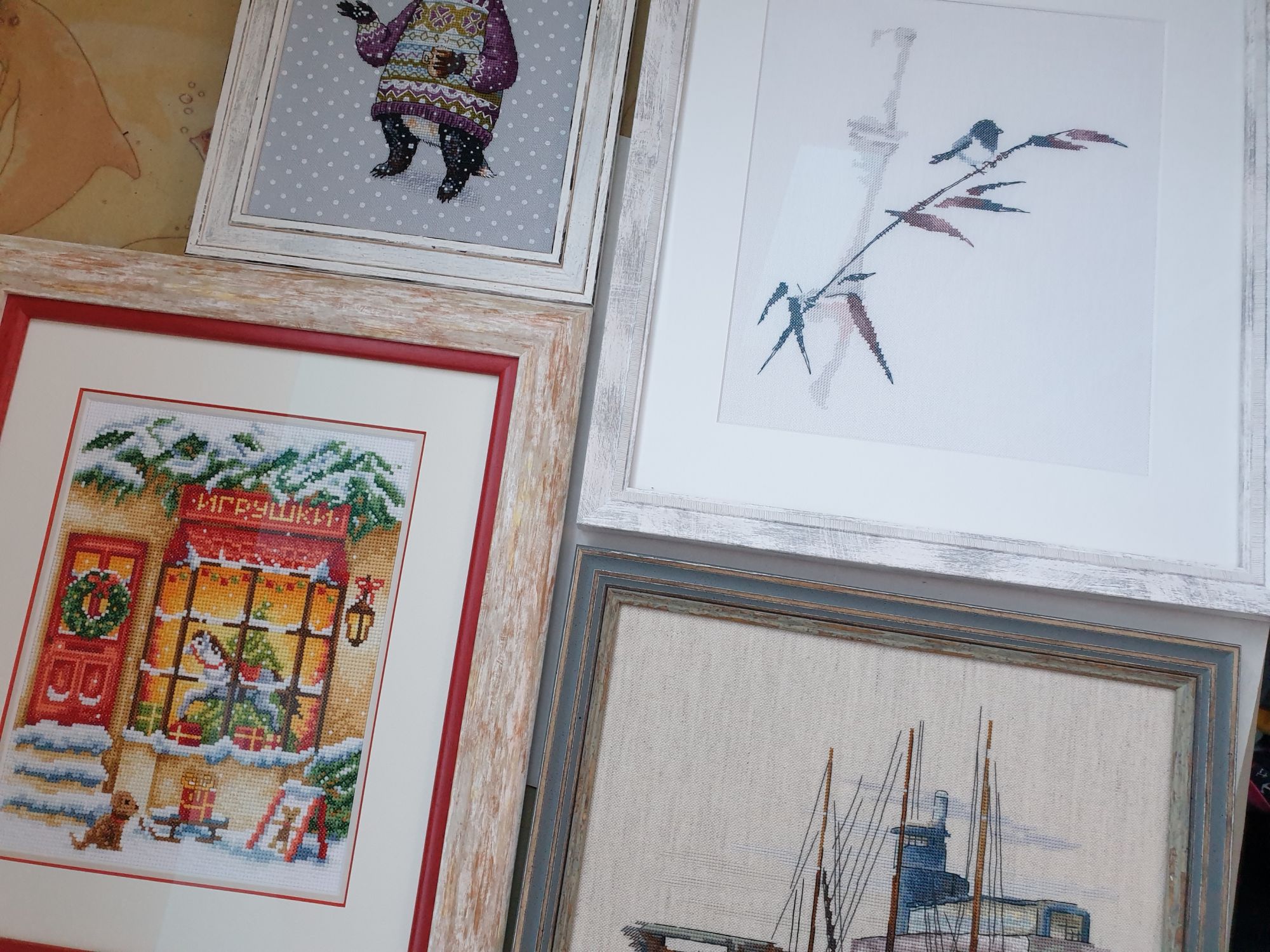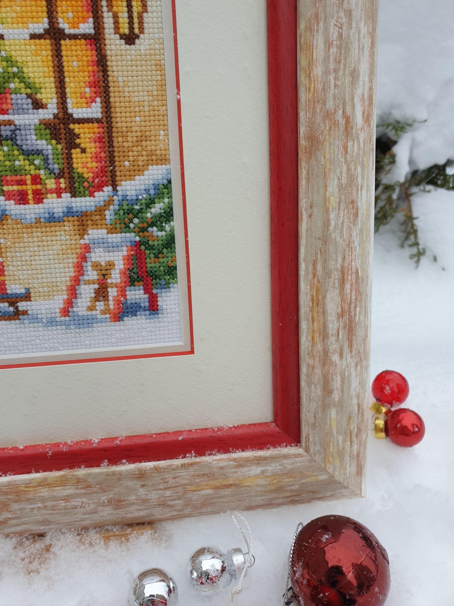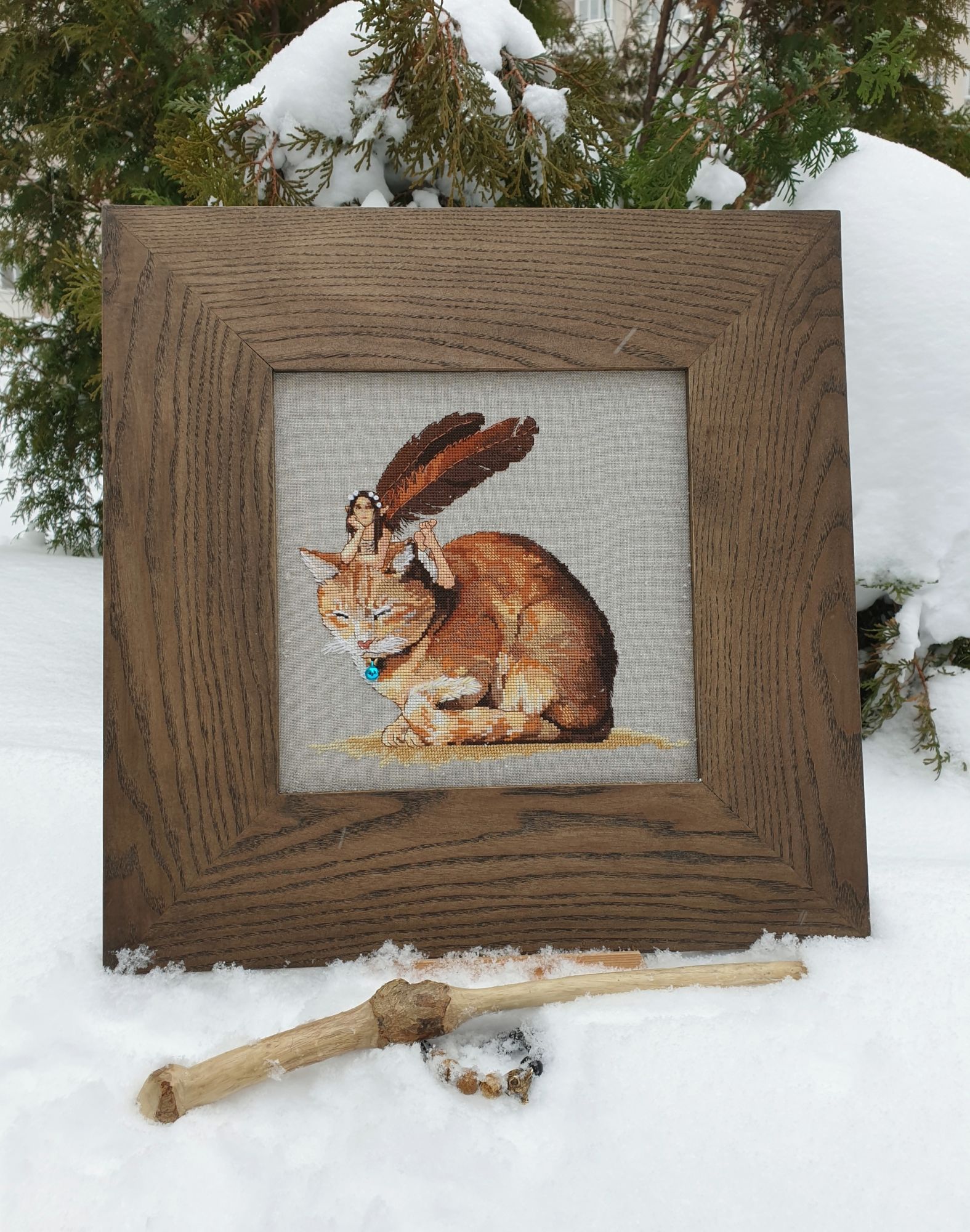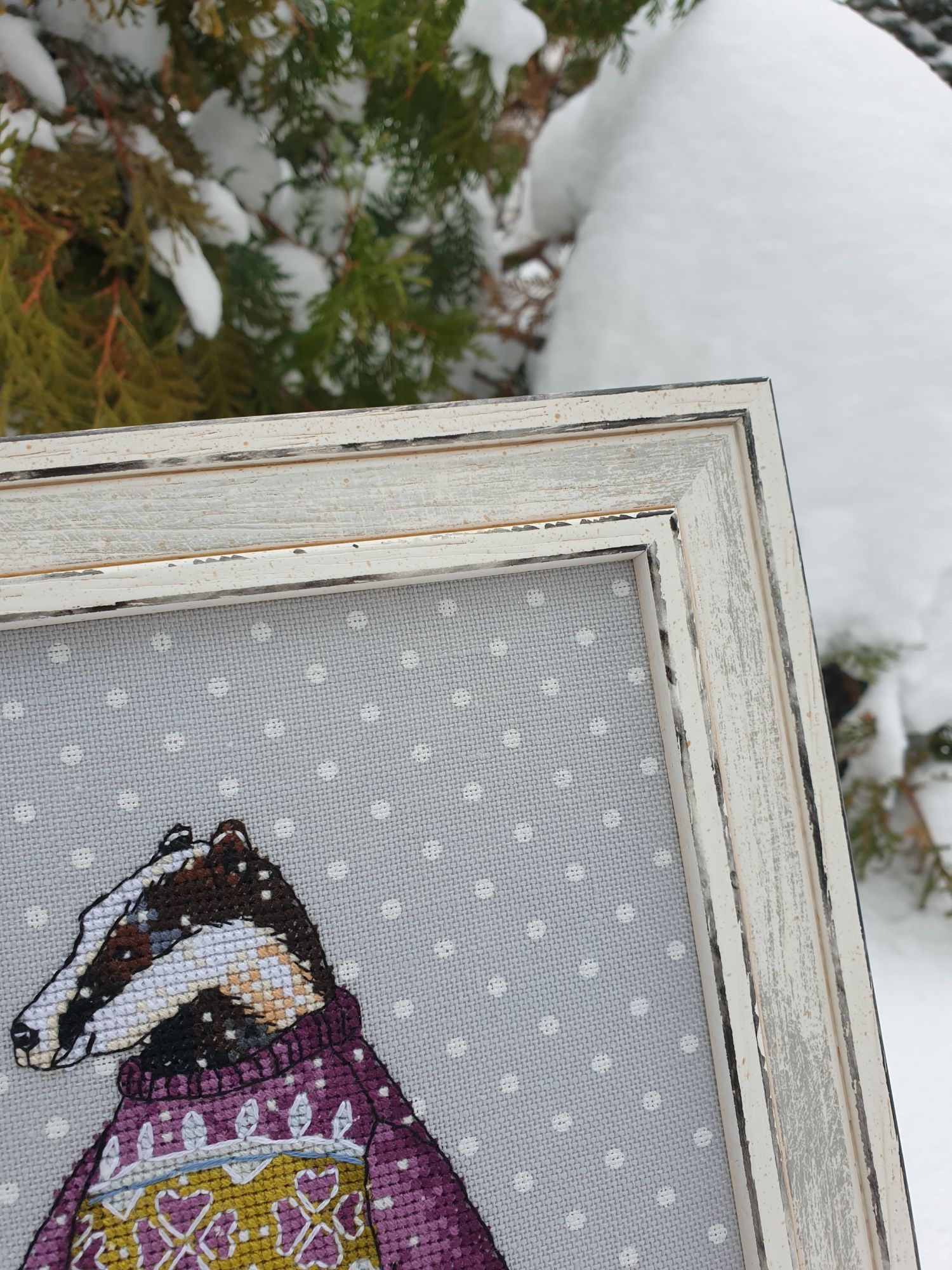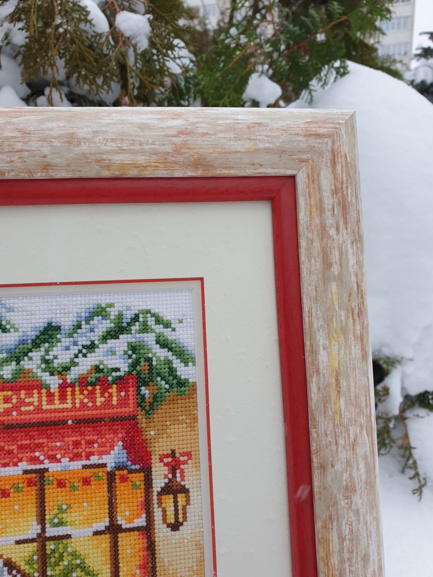 29 декабря 2022 Вечер добрый! Вот и подоспел финальный отчет года. С оформлениями и финишами. И даже немного с нашей елкой Итак, перво-наперво выполняю обещание и показываю оформленные работы. Вот эту четверку невероятно тонких и восхитительно моих работ я забрала из любимой багетки еще в конце ноября... Но фотосессия задержалась аж...до подходящего природного антуража для парочки из них))) Снежную съемку, кстати, проводила в приличную такую метель. Так что не удивляйтесь, что в кадре кое-где пролетают снежинки, а на работах за время фотографирования образуются небольшие снежные заносы Барсук от МиКи из популярной серии просто в багете. Всегда хотелось из него сделать что-то типа "картинки на рабочий стол", чтобы зимой доставать) Вервако, Магазин игрушек. Очень давний процесс. Закончен был прошлой зимой и не без помощи сочувствующих, за что им моя бесконечная признательность Оформлен к новогодней смене экспозиции дома)) Моя невероятно тонкая птичка от Vetlanka. Минимализм в светлых оттенках. Тот самый случай, когда ты понимаешь, что оттенков белого паспарту на самом деле штук десять, а тебе нужен одиннадцатый Тут к счастью, все нашлось) И моя новая любовь в оформлении - порт от О.Ланкевич. Тут и один из любимых багетов, и горячо обожаемый деревянный подранный слип, который я еще на своих РТОшных ботинках в 2019м оценила, и которого, к слову, в багетке оставалась одна единственная планка, и итоговое сочетание всего: мрачноватого строгого сюжета, грубоватости лукана, этих вот деревяшек... И к ним добавилась нимюшная Котофея. Рама у меня была: ясень, очень широкий профиль... Интересная вещь получилась. Хотя, конечно, и не классическая. Пока не нашла ей дома подходящего места, даже закрадывались мысли переоформить более стандартно. Но ее место нашлось Теперь к финишам. РТО, Мечты под луной - финиш! Волчок завершен! Старт аж 2016го года, кажется. Никогда не переставал нравится. Просто большой)) Ниток всех оказалось с запасом, экономить нигде не пришлось. Осталось сшить подушку. Собственно я даже уже задник раскроила, но вот к отчету не успела. В финальном коллаже будет оформленным! (*так что не обессудьте, если итогов придется ждать долго Шутка. Надеюсь)) РТО, Новогодняя прогулка - финиш! Ох, какой же он классный! Такой отважный, такой смешной, такой очаровательный! Я как никогда правильно в этом году выбрала себе новогодний процесс - он заставлял улыбаться безусловно и независимо ни от чего. Спасибо РТОшникам за него от души. Помимо замены основы мелкие снежинки шить не стала, т.к. есть нарисованные на ткани, а бэк на больших вместо B5200 из набора заменила dmc E5200 - такая жесткая нитка с перламутровым блеском. На прямых линиях снежинок трудностей с ней не возникло, а приятный несильный искрящийся блеск добавился. Вместе с неярким блеском нарисованных снежинок смотрится гармонично. Хотя на фотографии этого не видно, как ни старайся. А это фото со вспышкой. Тут хоть чуточку видно, как элементы на свет реагируют. (не для гайки) А вообще буду ждать теперь солнышка и понесу в снег на фотосессию) . Но, скорее всего, уже в следующем году. Волшебная страна, Шарик с лисичкой - финиш! Ну да, конечно, же и этот процесс завершен. Как же иначе?)) Подбор бисера классный: искрящийся зеленый, матовые основные, перламутровый белый и кремовый, совершенно особенный красный на ягодках... Этому шар