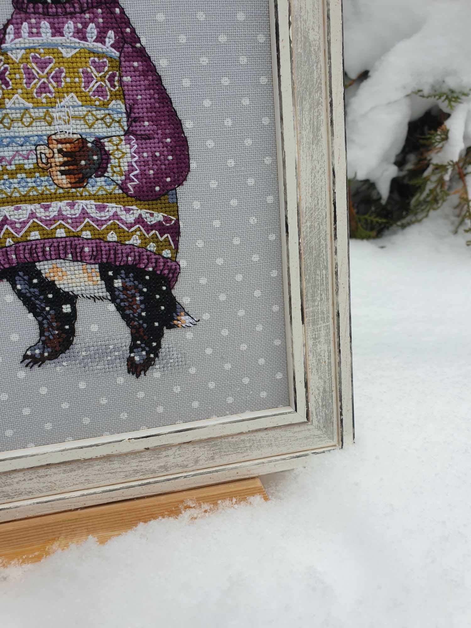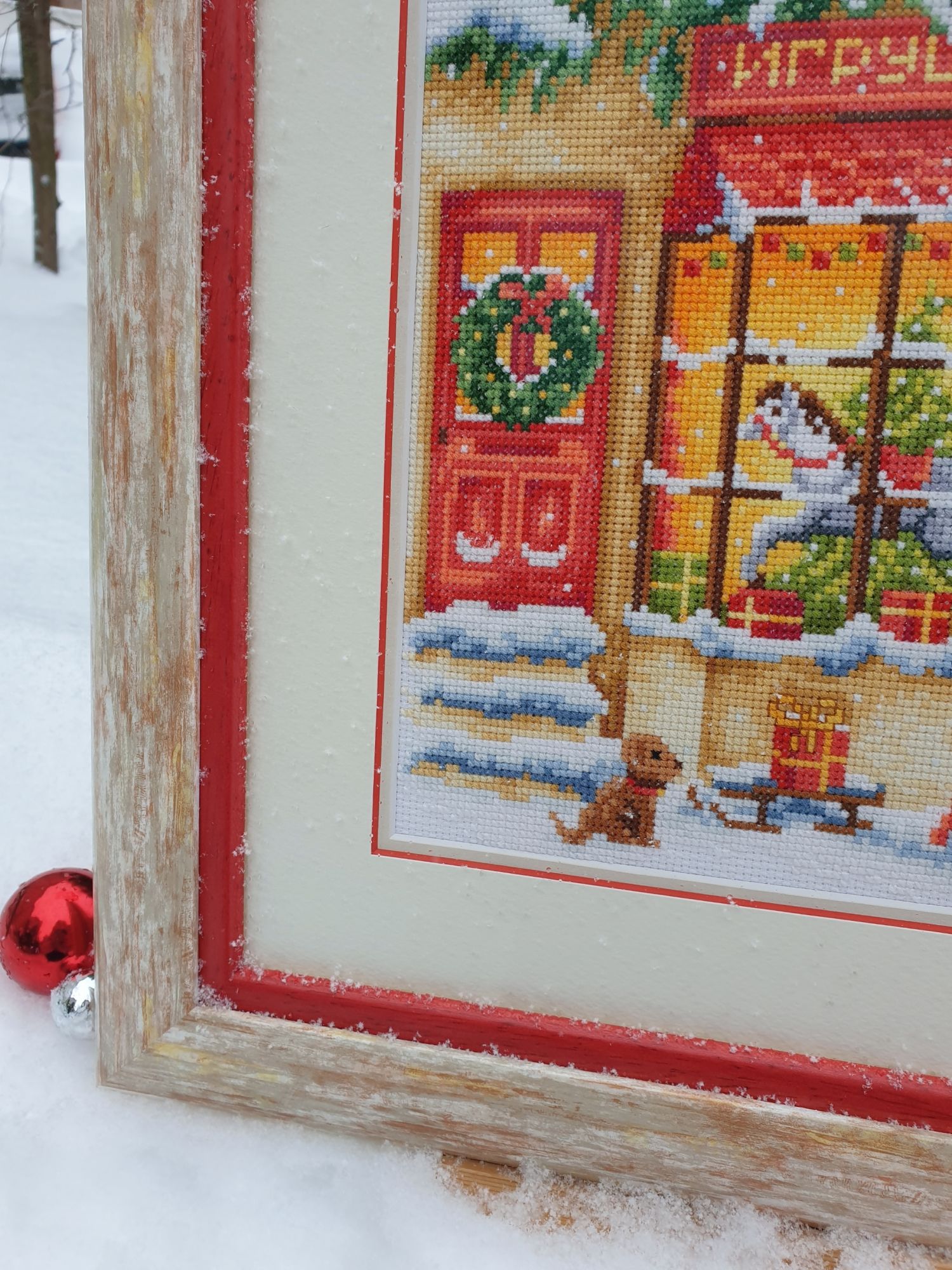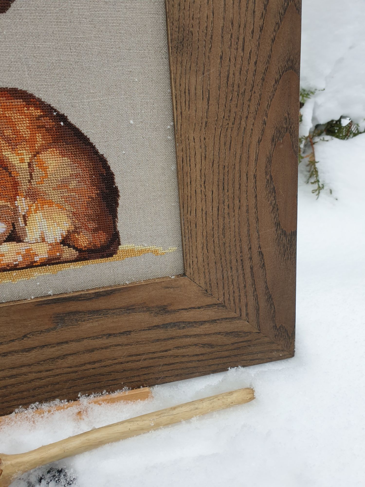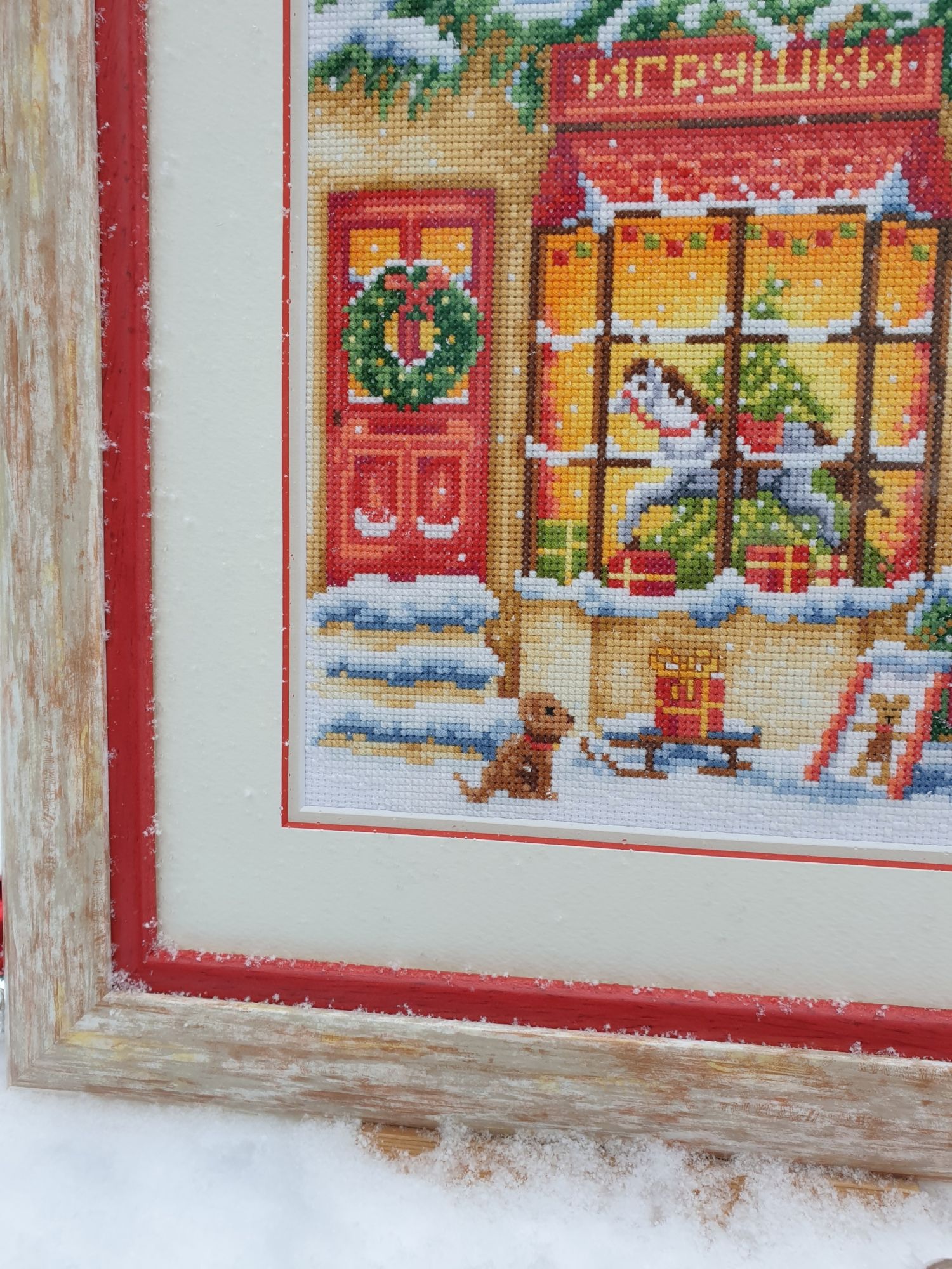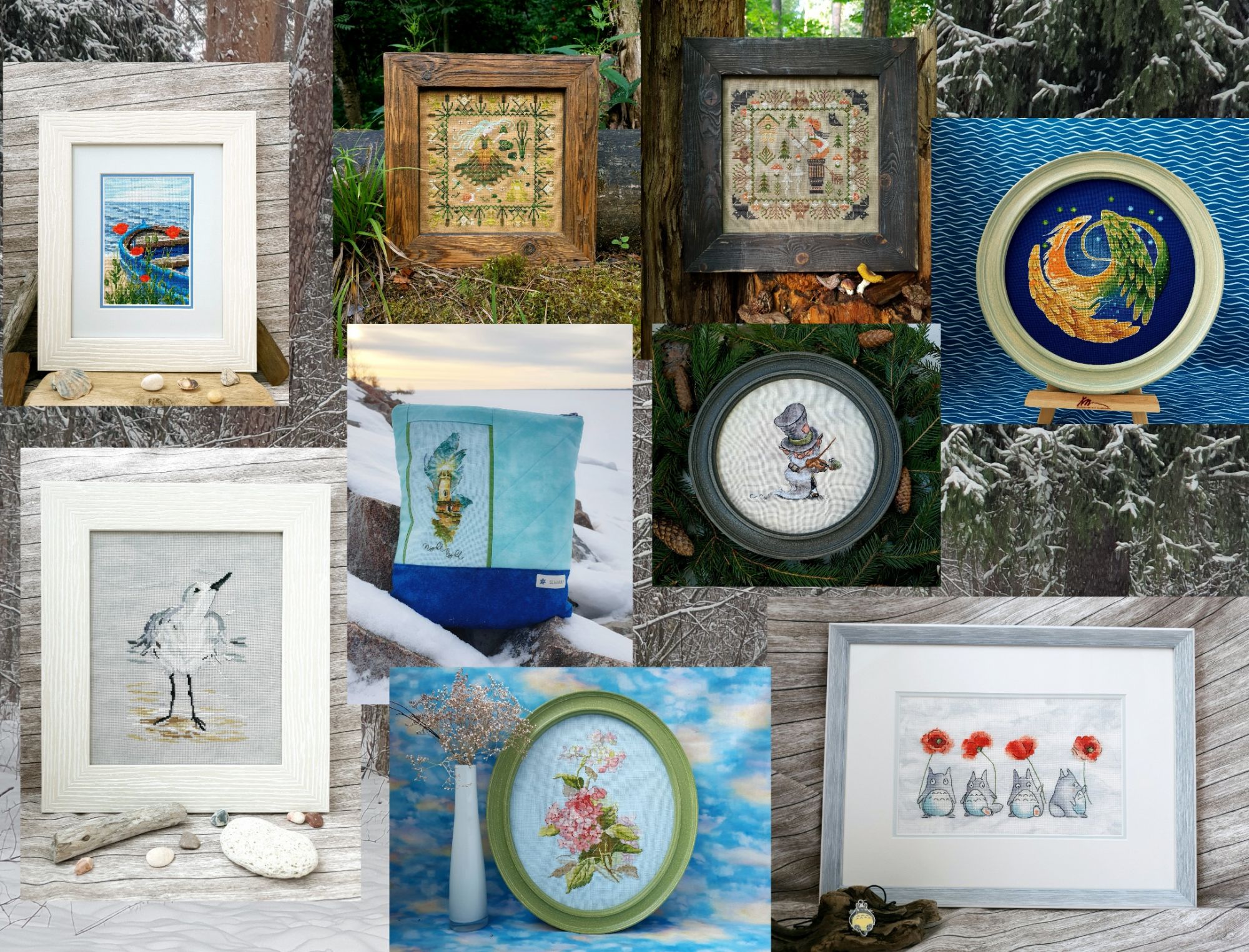 29 декабря 2022 Вечер добрый! Вот и подоспел финальный отчет года. С оформлениями и финишами. И даже немного с нашей елкой Итак, перво-наперво выполняю обещание и показываю оформленные работы. Вот эту четверку невероятно тонких и восхитительно моих работ я забрала из любимой багетки еще в конце ноября... Но фотосессия задержалась аж...до подходящего природного антуража для парочки из них))) Снежную съемку, кстати, проводила в приличную такую метель. Так что не удивляйтесь, что в кадре кое-где пролетают снежинки, а на работах за время фотографирования образуются небольшие снежные заносы Барсук от МиКи из популярной серии просто в багете. Всегда хотелось из него сделать что-то типа "картинки на рабочий стол", чтобы зимой доставать) Вервако, Магазин игрушек. Очень давний процесс. Закончен был прошлой зимой и не без помощи сочувствующих, за что им моя бесконечная признательность Оформлен к новогодней смене экспозиции дома)) Моя невероятно тонкая птичка от Vetlanka. Минимализм в светлых оттенках. Тот самый случай, когда ты понимаешь, что оттенков белого паспарту на самом деле штук десять, а тебе нужен одиннадцатый Тут к счастью, все нашлось) И моя новая любовь в оформлении - порт от О.Ланкевич. Тут и один из любимых багетов, и горячо обожаемый деревянный подранный слип, который я еще на своих РТОшных ботинках в 2019м оценила, и которого, к слову, в багетке оставалась одна единственная планка, и итоговое сочетание всего: мрачноватого строгого сюжета, грубоватости лукана, этих вот деревяшек... И к ним добавилась нимюшная Котофея. Рама у меня была: ясень, очень широкий профиль... Интересная вещь получилась. Хотя, конечно, и не классическая. Пока не нашла ей дома подходящего места, даже закрадывались мысли переоформить более стандартно. Но ее место нашлось Теперь к финишам. РТО, Мечты под луной - финиш! Волчок завершен! Старт аж 2016го года, кажется. Никогда не переставал нравится. Просто большой)) Ниток всех оказалось с запасом, экономить нигде не пришлось. Осталось сшить подушку. Собственно я даже уже задник раскроила, но вот к отчету не успела. В финальном коллаже будет оформленным! (*так что не обессудьте, если итогов придется ждать долго Шутка. Надеюсь)) РТО, Новогодняя прогулка - финиш! Ох, какой же он классный! Такой отважный, такой смешной, такой очаровательный! Я как никогда правильно в этом году выбрала себе новогодний процесс - он заставлял улыбаться безусловно и независимо ни от чего. Спасибо РТОшникам за него от души. Помимо замены основы мелкие снежинки шить не стала, т.к. есть нарисованные на ткани, а бэк на больших вместо B5200 из набора заменила dmc E5200 - такая жесткая нитка с перламутровым блеском. На прямых линиях снежинок трудностей с ней не возникло, а приятный несильный искрящийся блеск добавился. Вместе с неярким блеском нарисованных снежинок смотрится гармонично. Хотя на фотографии этого не видно, как ни старайся. А это фото со вспышкой. Тут хоть чуточку видно, как элементы на свет реагируют. (не для гайки) А вообще буду ждать теперь солнышка и понесу в снег на фотосессию) . Но, скорее всего, уже в следующем году. Волшебная страна, Шарик с лисичкой - финиш! Ну да, конечно, же и этот процесс завершен. Как же иначе?)) Подбор бисера классный: искрящийся зеленый, матовые основные, перламутровый белый и кремовый, совершенно особенный красный на ягодках... Этому шар