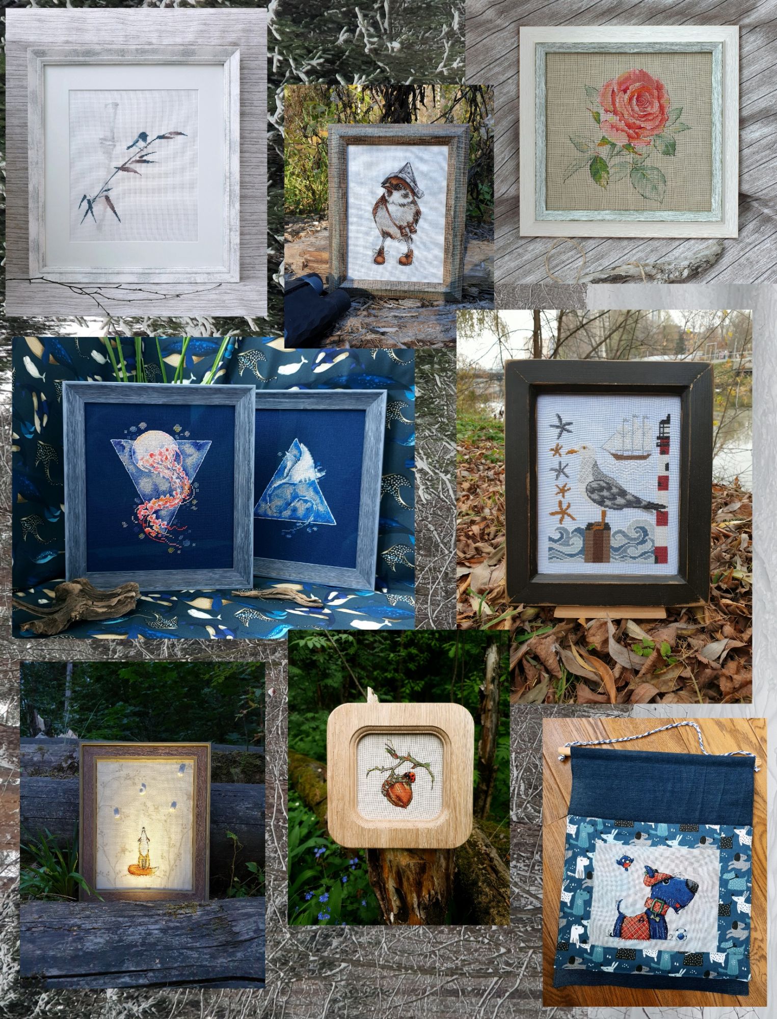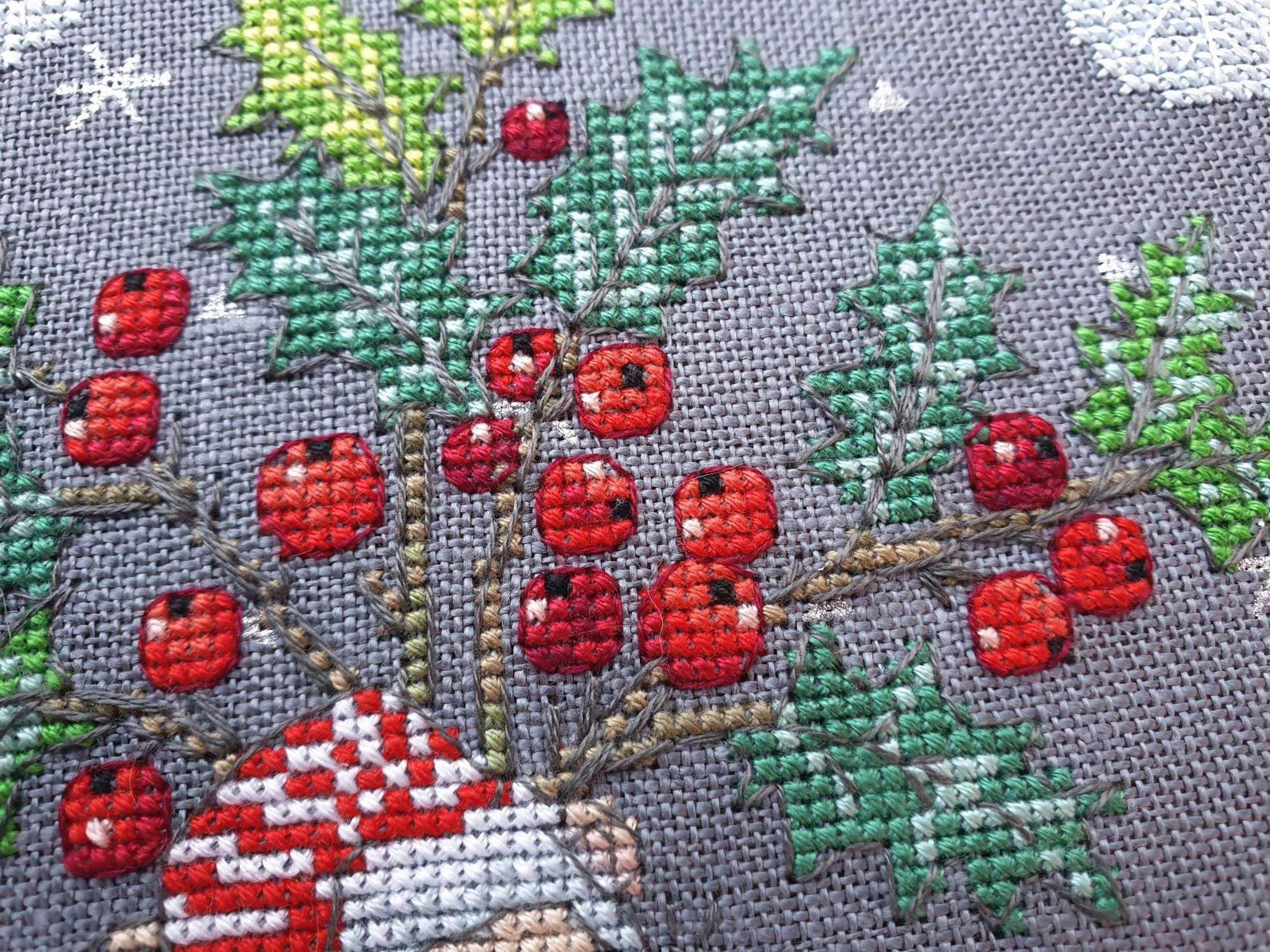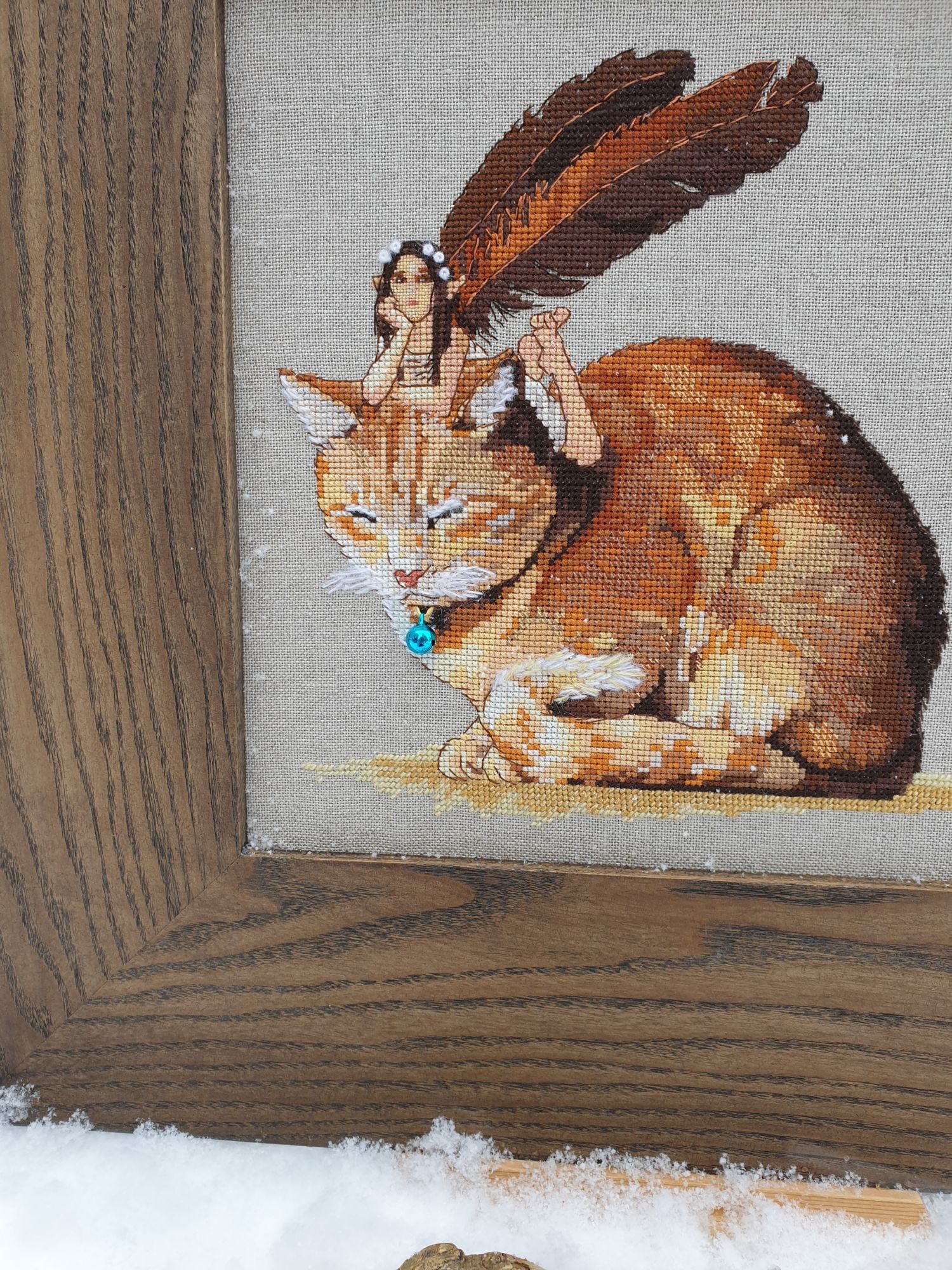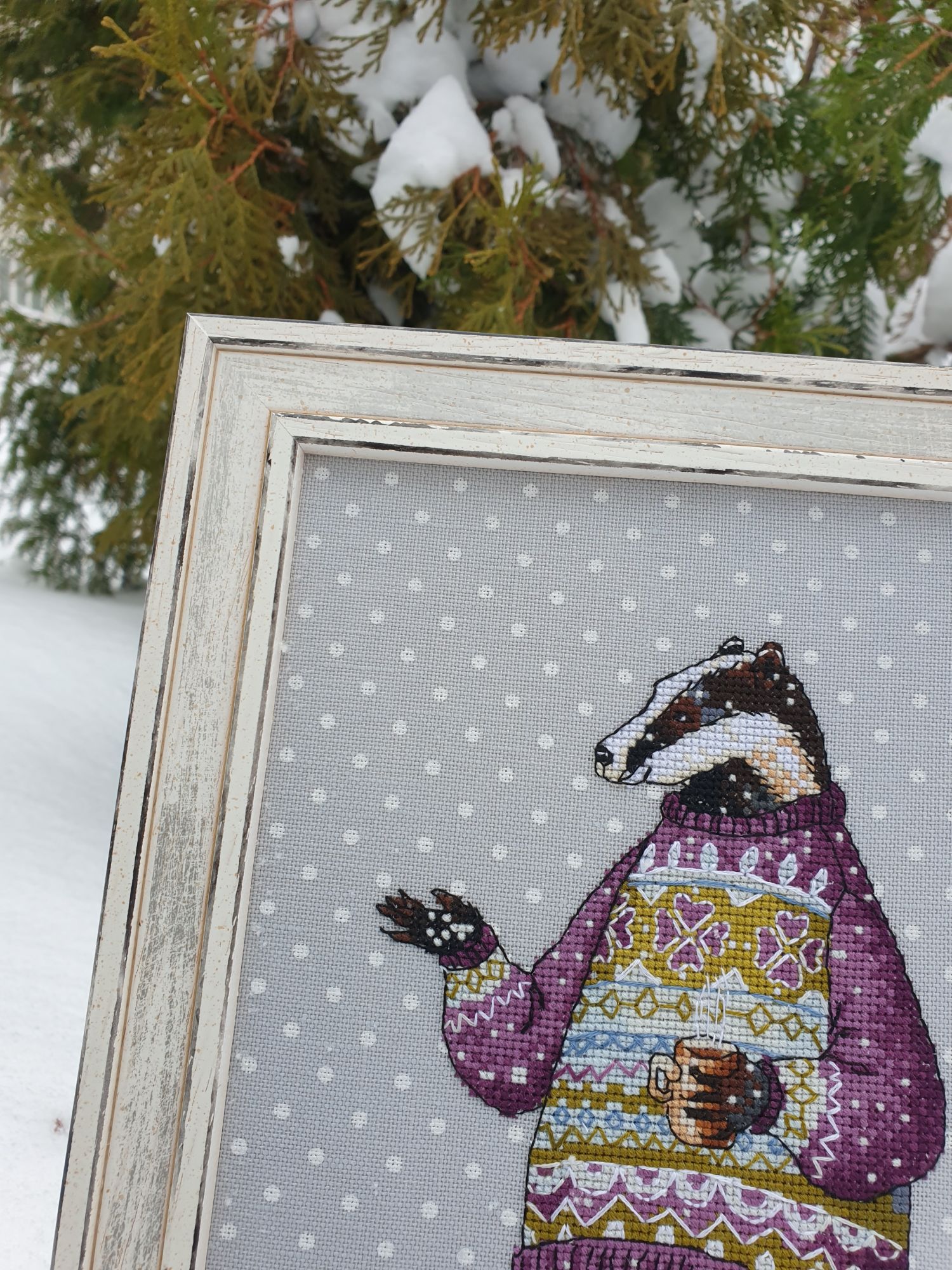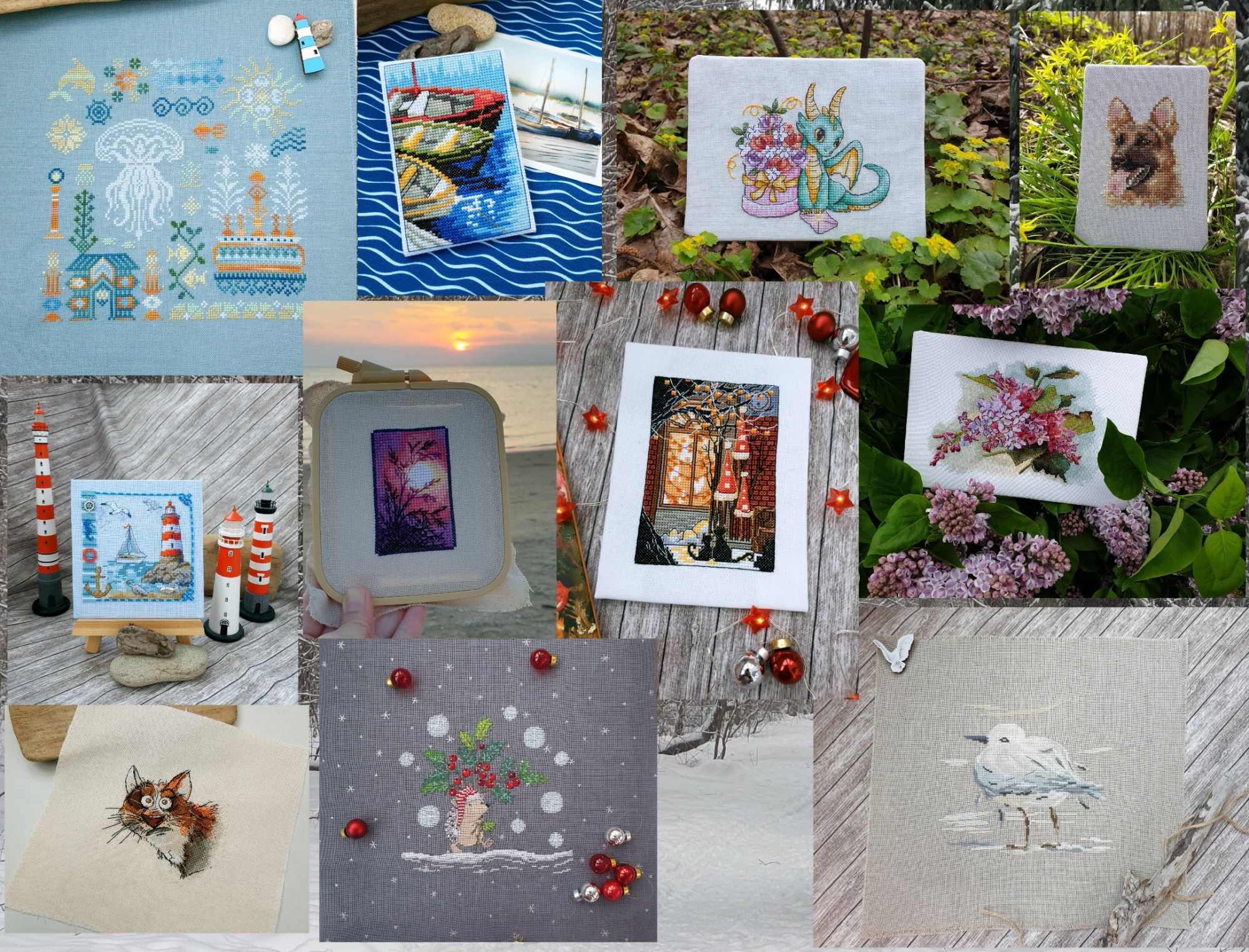 29 декабря 2022 Вечер добрый! Вот и подоспел финальный отчет года. С оформлениями и финишами. И даже немного с нашей елкой Итак, перво-наперво выполняю обещание и показываю оформленные работы. Вот эту четверку невероятно тонких и восхитительно моих работ я забрала из любимой багетки еще в конце ноября... Но фотосессия задержалась аж...до подходящего природного антуража для парочки из них))) Снежную съемку, кстати, проводила в приличную такую метель. Так что не удивляйтесь, что в кадре кое-где пролетают снежинки, а на работах за время фотографирования образуются небольшие снежные заносы Барсук от МиКи из популярной серии просто в багете. Всегда хотелось из него сделать что-то типа "картинки на рабочий стол", чтобы зимой доставать) Вервако, Магазин игрушек. Очень давний процесс. Закончен был прошлой зимой и не без помощи сочувствующих, за что им моя бесконечная признательность Оформлен к новогодней смене экспозиции дома)) Моя невероятно тонкая птичка от Vetlanka. Минимализм в светлых оттенках. Тот самый случай, когда ты понимаешь, что оттенков белого паспарту на самом деле штук десять, а тебе нужен одиннадцатый Тут к счастью, все нашлось) И моя новая любовь в оформлении - порт от О.Ланкевич. Тут и один из любимых багетов, и горячо обожаемый деревянный подранный слип, который я еще на своих РТОшных ботинках в 2019м оценила, и которого, к слову, в багетке оставалась одна единственная планка, и итоговое сочетание всего: мрачноватого строгого сюжета, грубоватости лукана, этих вот деревяшек... И к ним добавилась нимюшная Котофея. Рама у меня была: ясень, очень широкий профиль... Интересная вещь получилась. Хотя, конечно, и не классическая. Пока не нашла ей дома подходящего места, даже закрадывались мысли переоформить более стандартно. Но ее место нашлось Теперь к финишам. РТО, Мечты под луной - финиш! Волчок завершен! Старт аж 2016го года, кажется. Никогда не переставал нравится. Просто большой)) Ниток всех оказалось с запасом, экономить нигде не пришлось. Осталось сшить подушку. Собственно я даже уже задник раскроила, но вот к отчету не успела. В финальном коллаже будет оформленным! (*так что не обессудьте, если итогов придется ждать долго Шутка. Надеюсь)) РТО, Новогодняя прогулка - финиш! Ох, какой же он классный! Такой отважный, такой смешной, такой очаровательный! Я как никогда правильно в этом году выбрала себе новогодний процесс - он заставлял улыбаться безусловно и независимо ни от чего. Спасибо РТОшникам за него от души. Помимо замены основы мелкие снежинки шить не стала, т.к. есть нарисованные на ткани, а бэк на больших вместо B5200 из набора заменила dmc E5200 - такая жесткая нитка с перламутровым блеском. На прямых линиях снежинок трудностей с ней не возникло, а приятный несильный искрящийся блеск добавился. Вместе с неярким блеском нарисованных снежинок смотрится гармонично. Хотя на фотографии этого не видно, как ни старайся. А это фото со вспышкой. Тут хоть чуточку видно, как элементы на свет реагируют. (не для гайки) А вообще буду ждать теперь солнышка и понесу в снег на фотосессию) . Но, скорее всего, уже в следующем году. Волшебная страна, Шарик с лисичкой - финиш! Ну да, конечно, же и этот процесс завершен. Как же иначе?)) Подбор бисера классный: искрящийся зеленый, матовые основные, перламутровый белый и кремовый, совершенно особенный красный на ягодках... Этому шар