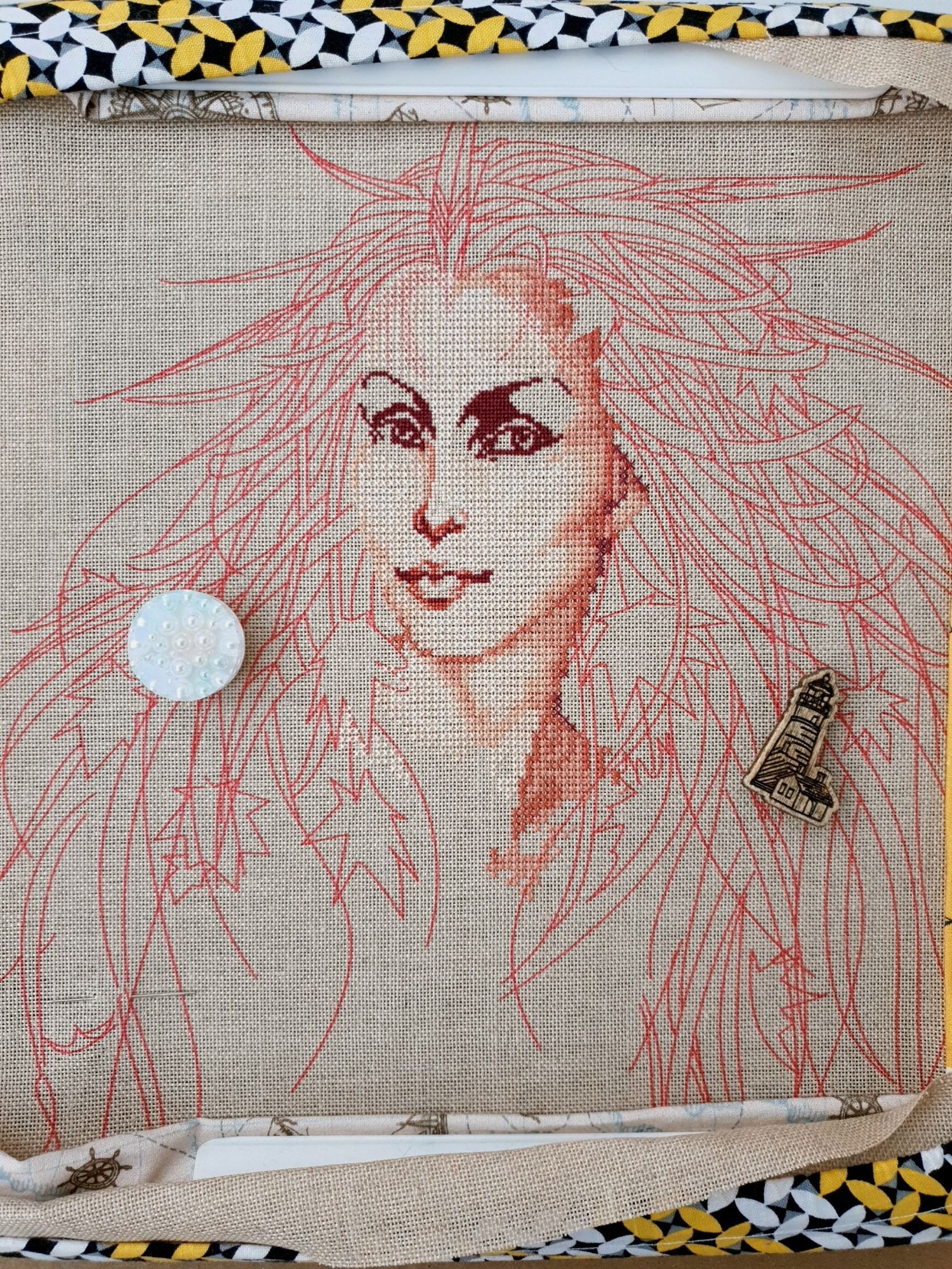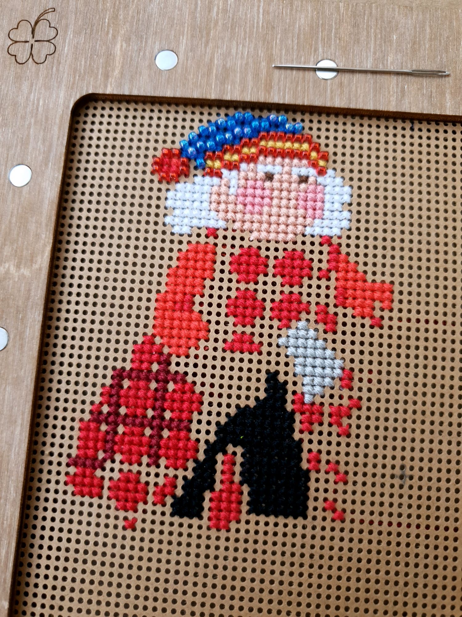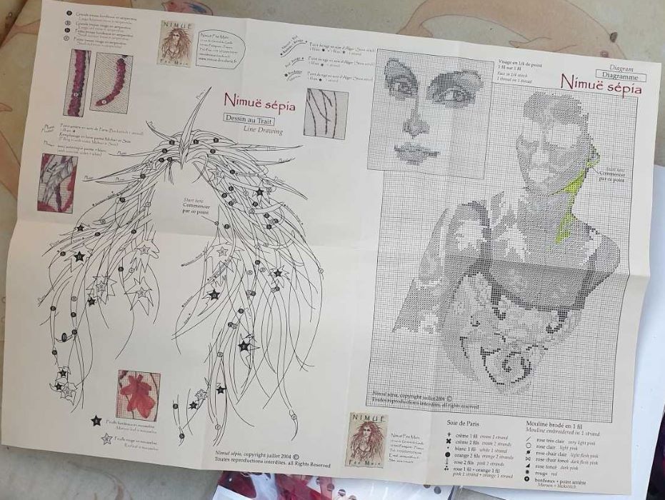 10 января 2023 Всем здравствуйте! Я сегодня в ночи и на бегу. Не успеваю последнее время ни почитать форум, ни повышивать толком. Но т.к. в любом случае надеюсь, что это когда-нибудь изменится, то очень хочу хотя бы в своей теме немножко наследить))) Mill Hill MH20-2231 Scotch Pine Santa - новый процесс! Я начала его перед самым-самым новым годом, числа 30го, наверное, и хотела завершить за каникулы. Но вот каникулы позади, а в Санте нет и половины. Поэтому заведу-ка я гайку, чтобы не забыть закончить к следующему НГ О процессе: это ж Милл Хилл! И хотя я не отношу себя к его ярым фанатам, которые без него жить не могут, но все же я успела проникнуться его прелестью и очарованием, когда из странного ниточного нЕчто после пришивания бисера оно превращается "из гусеницы в бабочку". Мне очень нравится этот эффект, нравится как преображается дизайн с бисером. Это не говоря уже о том, что бисер здесь сам по себе чудесный и вызывает массу положительных эмоций. А еще я люблю МХ именно на бумаге. Для меня МХ на канве не очень привлекателен, а замену бумаги на что-то для себя никогда не собираюсь даже рассматривать. Лучше что-то другое вышью)) Но одна беда была - гнется она, эта бумага. От пальцев тех же или магнитов. Да и шью я долго. И вот я обзавелась магнитными пяльцами от Неокрафта. О, они офигенные! Мои сложности и затруднения с бумагой убрали напрочь. И держать удобно. И магниты по всему периметру, причем в плоскости, так что нитка не цепляется. Тот, кто регулярно шьет пластик, наверняка поймет, про что я сейчас. В общем, рекомендую! И собственно, процесс, ради которого я сегодня сюда пришла. Знаковый для меня процесс. Очень сильный. И отчего-то мне очень хочется назначить его процессом года. Ну не в том смысле, что шить только его и расшибиться, но закончить, а в смысле, чтобы сбывались давно задуманные планы и желания Путь я к мистике и не склонна в целом, но как тут не пуститься вглубь веков и легенд, когда сама Озерная владычица смотрит на тебя))) Nimue K30 Волшебница Вивиан (sepia) - новый процесс! Я влюбилась в этот дизайн довольно давно. Тогда на ФР приезжала Аннаик Шовель (автор схемы) и на выставке соорудили целый шатер - волшебный мир из легенд, который в вышивке создает хозяйка бренда Нимю. Сама Аннаик совершенно невероятная. Хранительница замка, между прочим! И сама будто вышедшая из волшебного леса. Вышитые работы, которые там были представлены, хотелось рассматривать бесконечно. А меня, помимо прочего, тогда приковал к себе взгляд Её глаз. Глаз той самой волшебницы, что висела напротив входа в шатер и что служит обложкой самого бренда. Я несколько раз возвращалась в тот шатер и рассматривала невероятные сплетения лент в косах, какое-то восхитительно нежное платье, всю ее целиком и по крестику.... Год назад муж подарил мне набор. И я дала себе слово, что начну его, как только закончу предыдущий процесс от Нимю. А набор тем временем все время стоял перед глазами, завораживая взглядом... И вот в декабре был завершен процесс с котофеей. И я тут же распечатала этот набор. Сфотографировала, начала переводить понемногу инструкцию, чтобы перестать бояться))) Она, к слову тут примерно такая(это фото не для гайки) Заодно немножко французский повспоминала И где-то недели за полторы до НГ я ее начала. Сначала было сложно, потому что страшно)) А еще потому что было неясно, отчего такая ткань темная и какая-