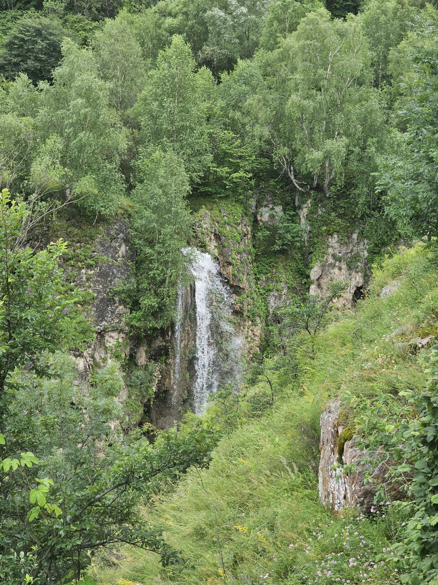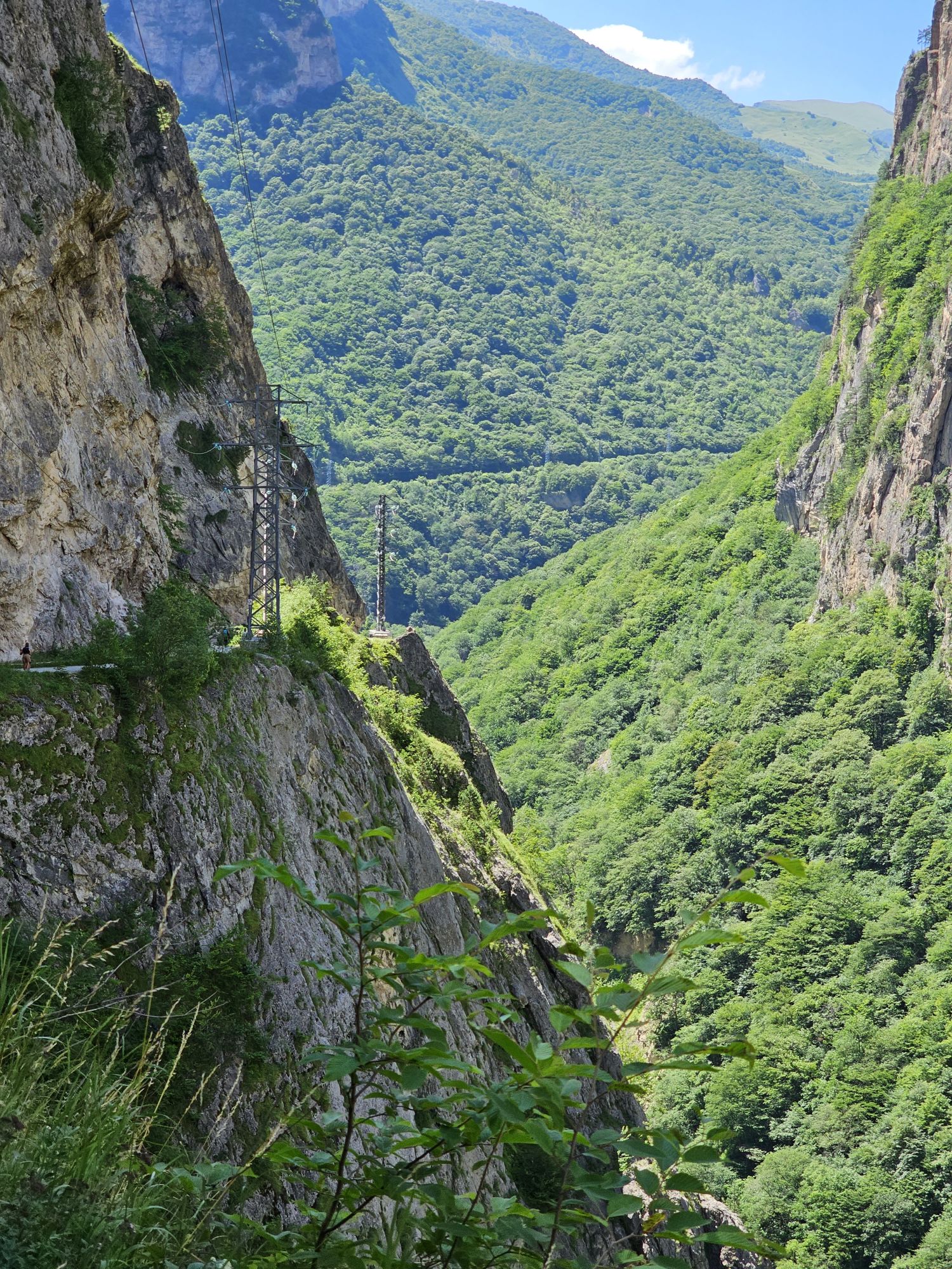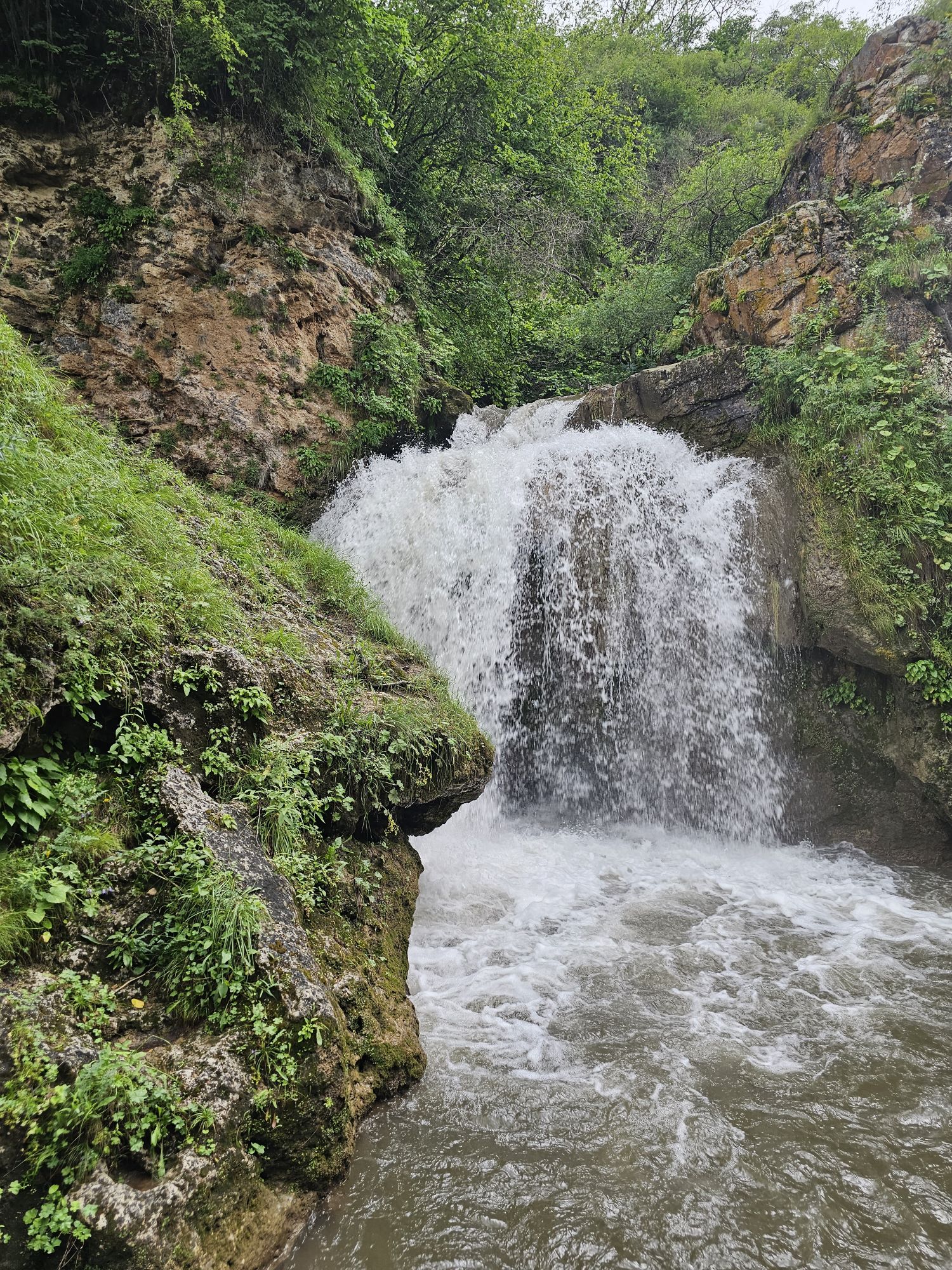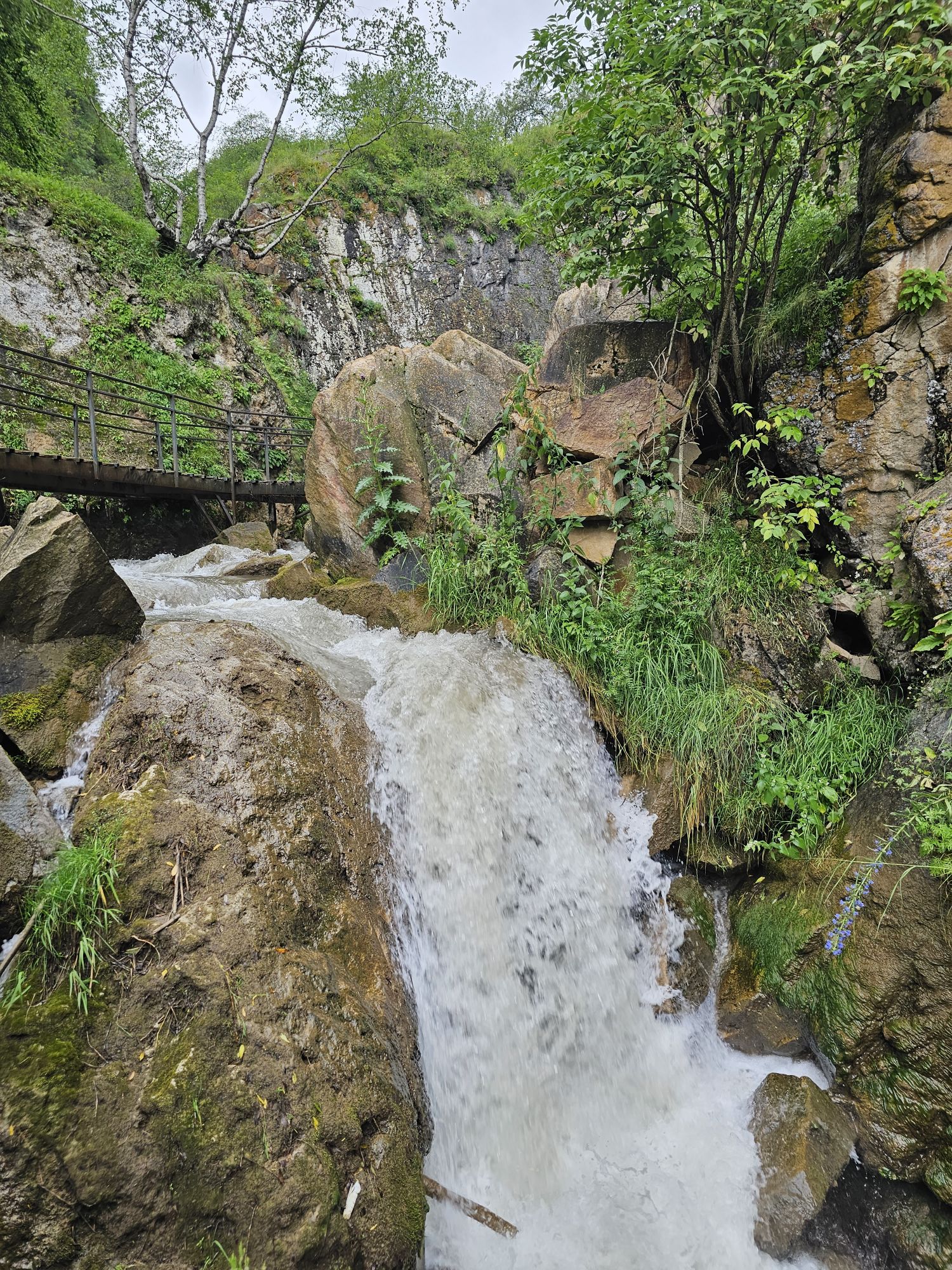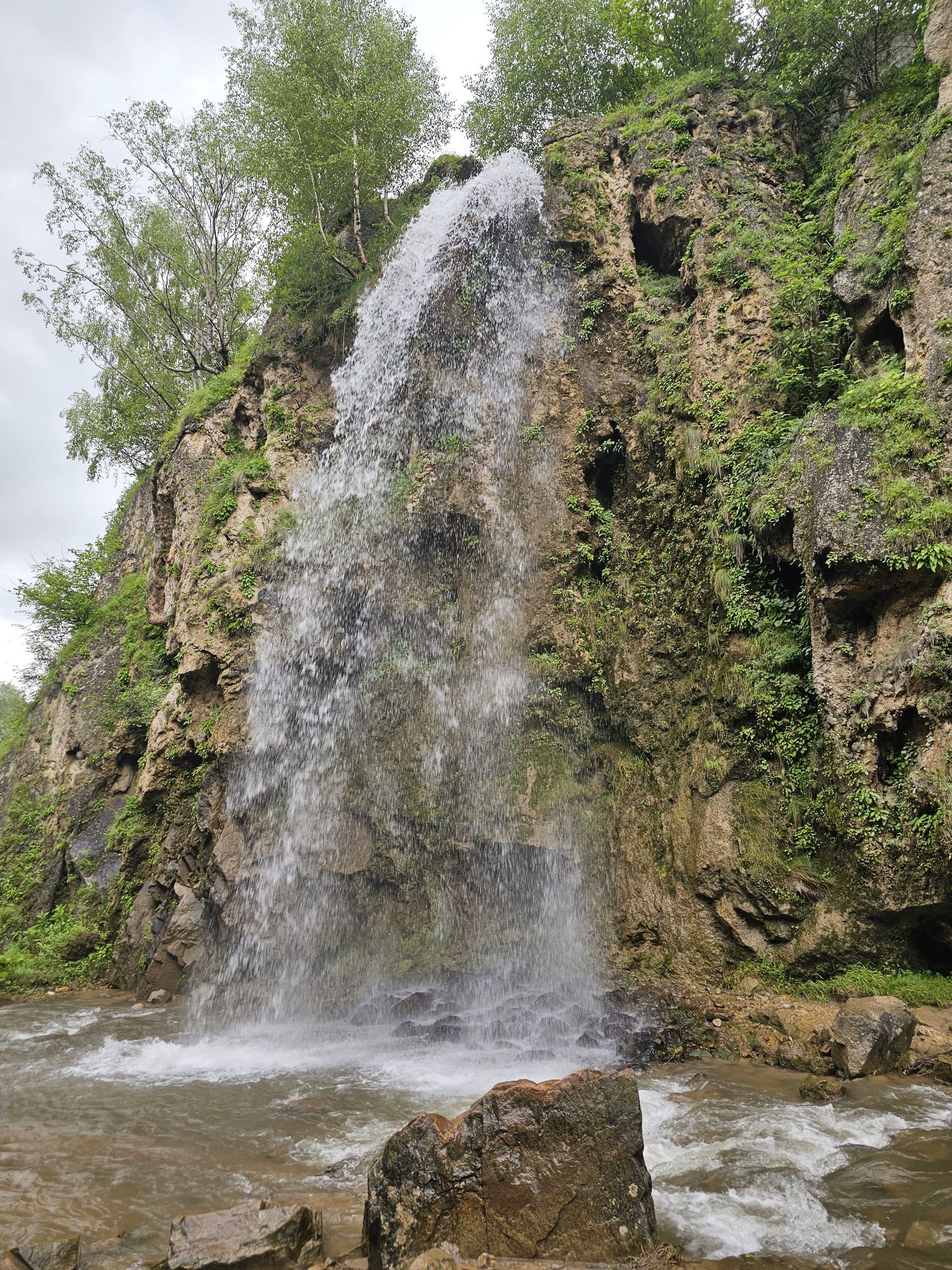8 августа 2023 И снова здравствуйте! Где-то недавно прочитала комментарий примерно следующего содержания: "Я уже давно вернулся из поездки, но никак не напишу об этом. Вероятно потому, что впечатления от нее у меня в сердце, а не в голове"... "Именно так", - подумалось мне. Уже пора писать про всякое, что случалось после возвращения, а я все никак про отпуск не допишу. Потому что эти впечатления в сердце и их так сложно облечь в слова. И они такие сильные, что я до сих пор в своих снах оказываюсь там... У меня собственно осталось немного, но, пожалуй, самое сложное и самое сильное по впечатлениям. Я постараюсь сегодня завершить рассказ, хотя не могу обещать...)) Но сначала будет еще один "дождевой день". Для разминки))) Итак, дожди накрыли и КМВ, и все Приэльбрусье. Уехать от них было некуда, а накануне мы промочили насквозь первую пару обуви и она была еще далека даже от влажного состояния. Поэтому вторую пару надо было беречь. Прогноз - весь день дожди с вероятными небольшими просветами. Далеко в горы не уйдешь. А не рвануть ли нам... на Медовые водопады?! Только на этот раз на машине, чтобы в случае чего быстро в нее прыгнуть и не сильно промокнуть. Сказано - сделано. И вот мы уже мчим по новой для себя дороге, хотя на самих водопадах были дважды (но пешком по Аликоновскому ущелью от замка коварства и любви). Мокрая дорога, мокрая зелень и облака, что стелются почти у земли... И вот показалось оно, Аликоновское ущелье, что так дорого моему сердцу! Спускаемся со стоянки и вот уже самый высокий из здешних водопадов. Просто задумайтесь: это не просто вода со скалы течет, это же таким образом одна речка в другую впадает! Слияние рек!))) В горах все привычные нам, равнинникам, сочетания слов приобретают неожиданные значения))) А какие тут крыши! Я к таким неровно дышу, но видела в основном на фотографиях из Северных стран) Сегодня нам некуда спешить и мы с удовольствием заглянули на имеющееся здесь небольшое Карачаевское подворье, где живут карачаевские козы и ослик. Они клевые. Даже взрослые получили удовольствие от "общения", не говоря уже о детях. А этот товарищ - прямо звезда! Каков взгляд! Дальше прогулка по водопадам. Сегодня не очень лётная погода. Да и время автобусов еще не подошло, так что людей не очень много. Самый высокий водопад очень живописен. Падая со скалы, вода разбивается на тысячи капелек и струй, и на это можно смотреть бесконечно. А еще можно зайти за него в небольшое углубление в скале и посмотреть сквозь эту стену брызг. Или даже попробовать заглянуть вверх)) Правда остаться сухим точно не выйдет Потом остальные водопады, названий которых я никак не запомню, но это не умаляет их красоты и живописности. И снова первый: . На последних кадрах уже начал капать приличный дождик, и от самих водопадов людей совсем смыло. Такие безлюдные кадры тут редкость) А мы поднялись чуть выше к кафешкам. Тут очень вкусно кормят. Во-первых хычины. Хотя я и люблю больше тонкие балкарские, но все же не могу не отметить, что местные карачаевские тоже очень вкусные. А еще мы с мужем попробовали в этот раз шашлык из черного барашка. Он тут потрясающий! Самый вкусный из всего, что мне доводилось пробовать. Еще и относительно недорого. После пошли к машине. Дождик на какое-то время прекратился и наши мальчики решили, что они хотят прокатиться на зиплайне. Он тут, к слову, самый длинный 