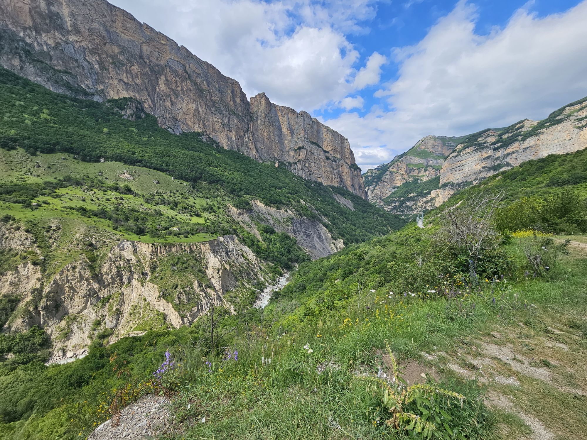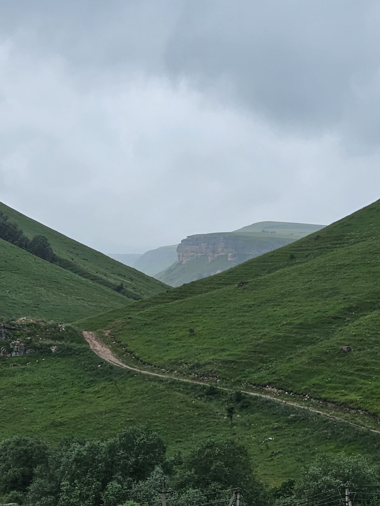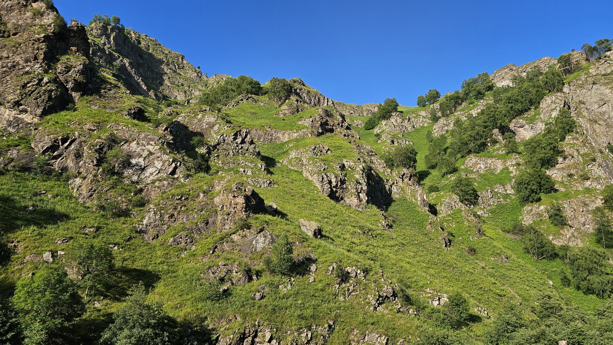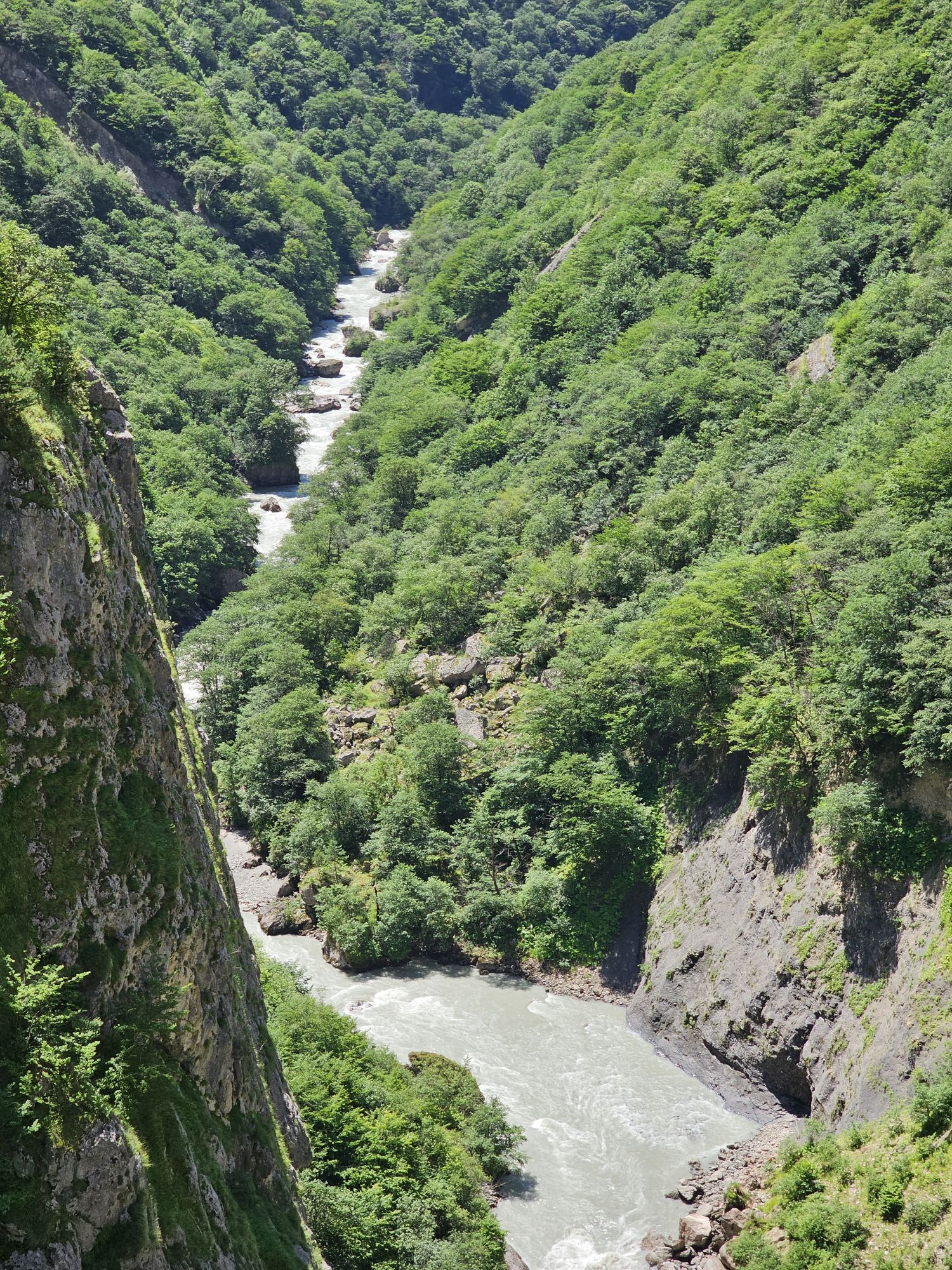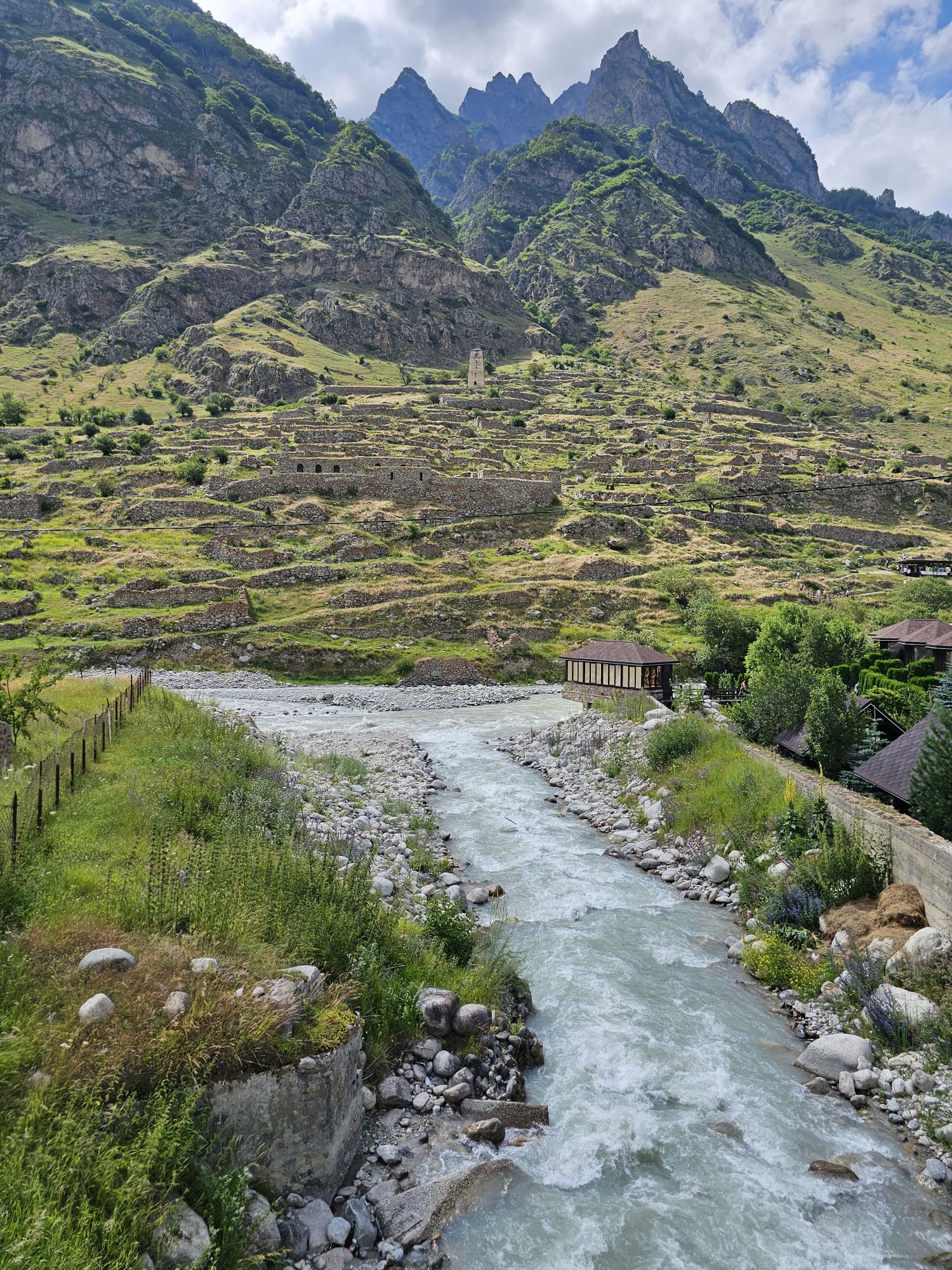 8 августа 2023 И снова здравствуйте! Где-то недавно прочитала комментарий примерно следующего содержания: "Я уже давно вернулся из поездки, но никак не напишу об этом. Вероятно потому, что впечатления от нее у меня в сердце, а не в голове"... "Именно так", - подумалось мне. Уже пора писать про всякое, что случалось после возвращения, а я все никак про отпуск не допишу. Потому что эти впечатления в сердце и их так сложно облечь в слова. И они такие сильные, что я до сих пор в своих снах оказываюсь там... У меня собственно осталось немного, но, пожалуй, самое сложное и самое сильное по впечатлениям. Я постараюсь сегодня завершить рассказ, хотя не могу обещать...)) Но сначала будет еще один "дождевой день". Для разминки))) Итак, дожди накрыли и КМВ, и все Приэльбрусье. Уехать от них было некуда, а накануне мы промочили насквозь первую пару обуви и она была еще далека даже от влажного состояния. Поэтому вторую пару надо было беречь. Прогноз - весь день дожди с вероятными небольшими просветами. Далеко в горы не уйдешь. А не рвануть ли нам... на Медовые водопады?! Только на этот раз на машине, чтобы в случае чего быстро в нее прыгнуть и не сильно промокнуть. Сказано - сделано. И вот мы уже мчим по новой для себя дороге, хотя на самих водопадах были дважды (но пешком по Аликоновскому ущелью от замка коварства и любви). Мокрая дорога, мокрая зелень и облака, что стелются почти у земли... И вот показалось оно, Аликоновское ущелье, что так дорого моему сердцу! Спускаемся со стоянки и вот уже самый высокий из здешних водопадов. Просто задумайтесь: это не просто вода со скалы течет, это же таким образом одна речка в другую впадает! Слияние рек!))) В горах все привычные нам, равнинникам, сочетания слов приобретают неожиданные значения))) А какие тут крыши! Я к таким неровно дышу, но видела в основном на фотографиях из Северных стран) Сегодня нам некуда спешить и мы с удовольствием заглянули на имеющееся здесь небольшое Карачаевское подворье, где живут карачаевские козы и ослик. Они клевые. Даже взрослые получили удовольствие от "общения", не говоря уже о детях. А этот товарищ - прямо звезда! Каков взгляд! Дальше прогулка по водопадам. Сегодня не очень лётная погода. Да и время автобусов еще не подошло, так что людей не очень много. Самый высокий водопад очень живописен. Падая со скалы, вода разбивается на тысячи капелек и струй, и на это можно смотреть бесконечно. А еще можно зайти за него в небольшое углубление в скале и посмотреть сквозь эту стену брызг. Или даже попробовать заглянуть вверх)) Правда остаться сухим точно не выйдет Потом остальные водопады, названий которых я никак не запомню, но это не умаляет их красоты и живописности. И снова первый: . На последних кадрах уже начал капать приличный дождик, и от самих водопадов людей совсем смыло. Такие безлюдные кадры тут редкость) А мы поднялись чуть выше к кафешкам. Тут очень вкусно кормят. Во-первых хычины. Хотя я и люблю больше тонкие балкарские, но все же не могу не отметить, что местные карачаевские тоже очень вкусные. А еще мы с мужем попробовали в этот раз шашлык из черного барашка. Он тут потрясающий! Самый вкусный из всего, что мне доводилось пробовать. Еще и относительно недорого. После пошли к машине. Дождик на какое-то время прекратился и наши мальчики решили, что они хотят прокатиться на зиплайне. Он тут, к слову, самый длинный 