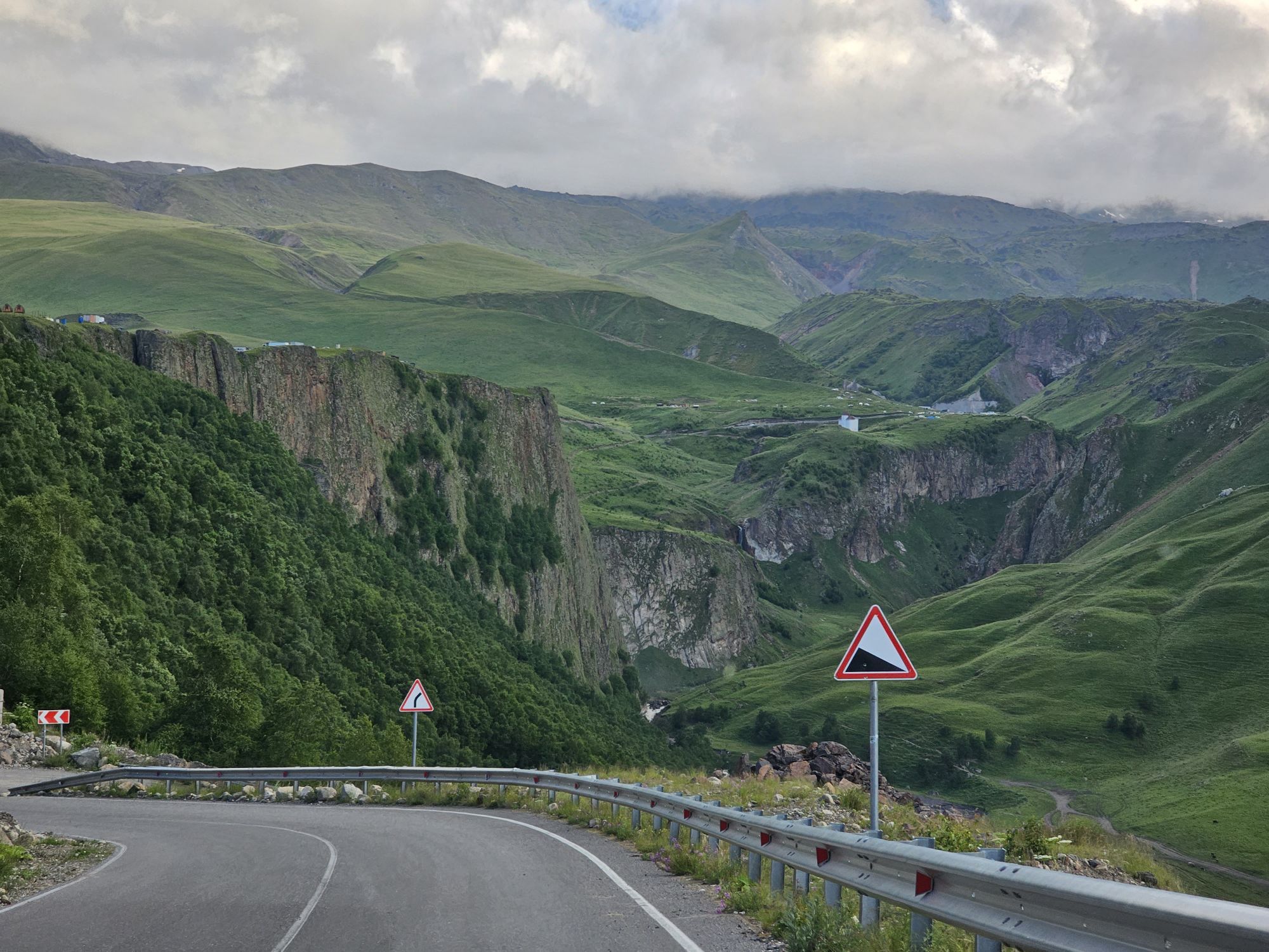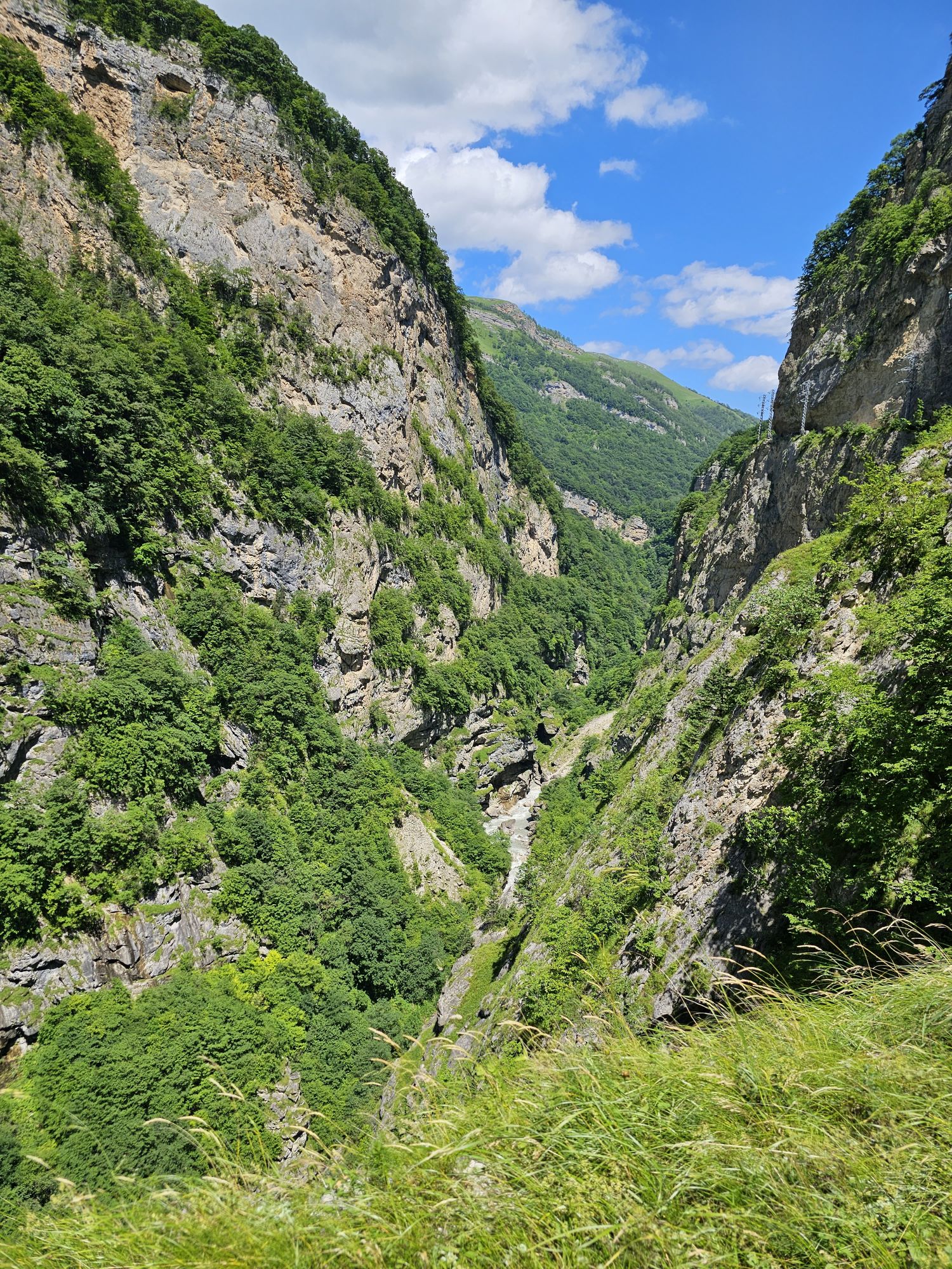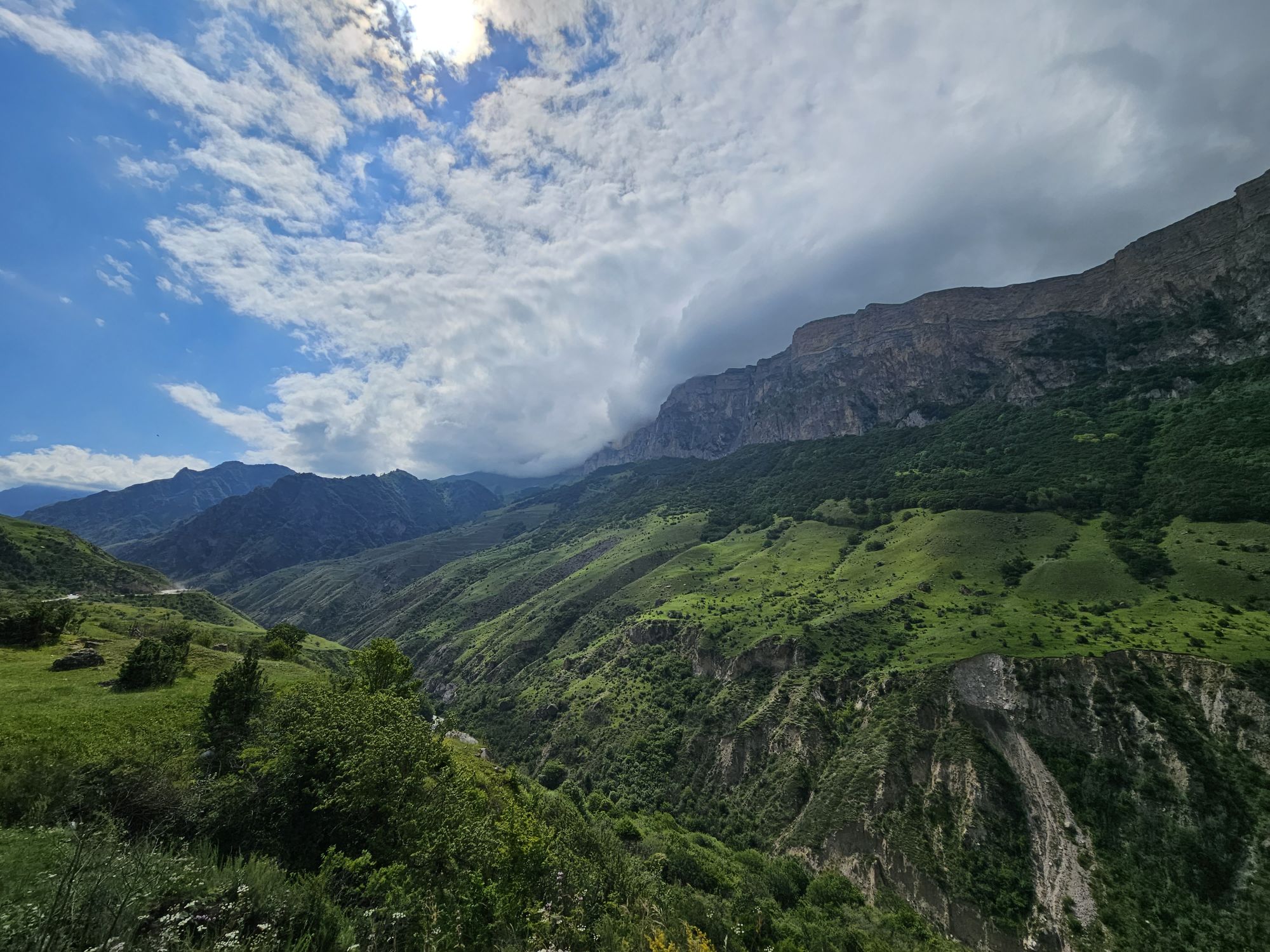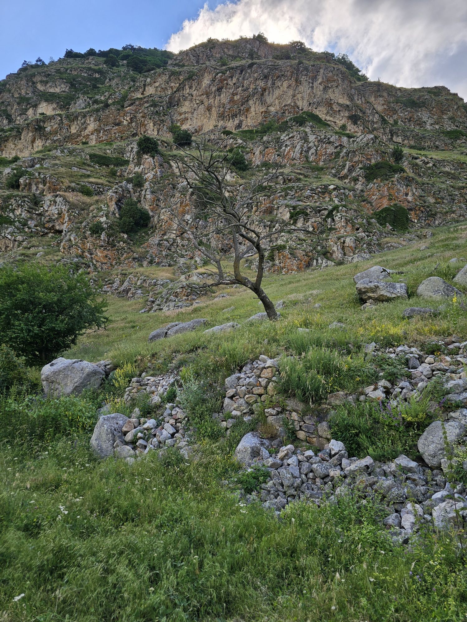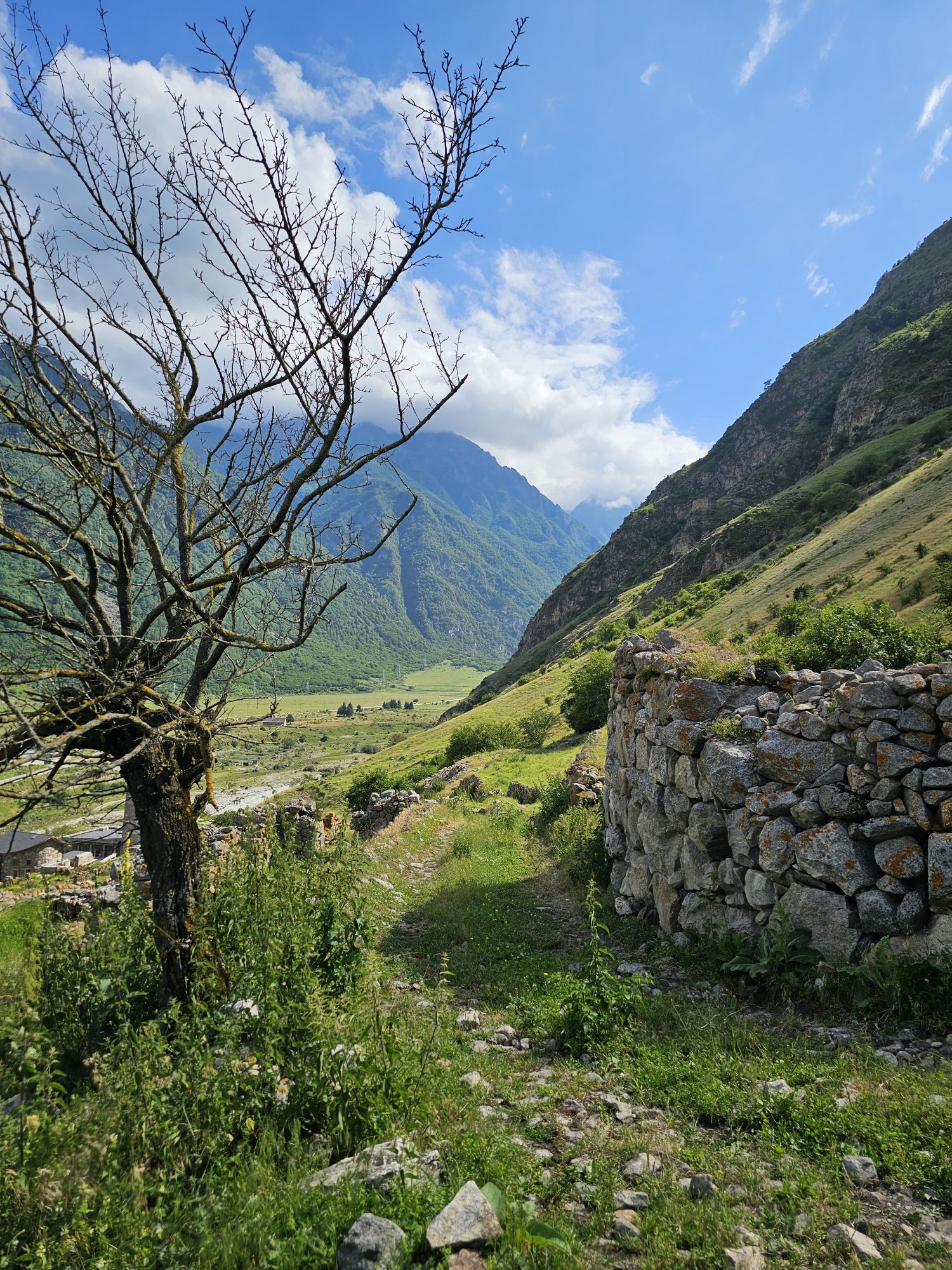 8 августа 2023 И снова здравствуйте! Где-то недавно прочитала комментарий примерно следующего содержания: "Я уже давно вернулся из поездки, но никак не напишу об этом. Вероятно потому, что впечатления от нее у меня в сердце, а не в голове"... "Именно так", - подумалось мне. Уже пора писать про всякое, что случалось после возвращения, а я все никак про отпуск не допишу. Потому что эти впечатления в сердце и их так сложно облечь в слова. И они такие сильные, что я до сих пор в своих снах оказываюсь там... У меня собственно осталось немного, но, пожалуй, самое сложное и самое сильное по впечатлениям. Я постараюсь сегодня завершить рассказ, хотя не могу обещать...)) Но сначала будет еще один "дождевой день". Для разминки))) Итак, дожди накрыли и КМВ, и все Приэльбрусье. Уехать от них было некуда, а накануне мы промочили насквозь первую пару обуви и она была еще далека даже от влажного состояния. Поэтому вторую пару надо было беречь. Прогноз - весь день дожди с вероятными небольшими просветами. Далеко в горы не уйдешь. А не рвануть ли нам... на Медовые водопады?! Только на этот раз на машине, чтобы в случае чего быстро в нее прыгнуть и не сильно промокнуть. Сказано - сделано. И вот мы уже мчим по новой для себя дороге, хотя на самих водопадах были дважды (но пешком по Аликоновскому ущелью от замка коварства и любви). Мокрая дорога, мокрая зелень и облака, что стелются почти у земли... И вот показалось оно, Аликоновское ущелье, что так дорого моему сердцу! Спускаемся со стоянки и вот уже самый высокий из здешних водопадов. Просто задумайтесь: это не просто вода со скалы течет, это же таким образом одна речка в другую впадает! Слияние рек!))) В горах все привычные нам, равнинникам, сочетания слов приобретают неожиданные значения))) А какие тут крыши! Я к таким неровно дышу, но видела в основном на фотографиях из Северных стран) Сегодня нам некуда спешить и мы с удовольствием заглянули на имеющееся здесь небольшое Карачаевское подворье, где живут карачаевские козы и ослик. Они клевые. Даже взрослые получили удовольствие от "общения", не говоря уже о детях. А этот товарищ - прямо звезда! Каков взгляд! Дальше прогулка по водопадам. Сегодня не очень лётная погода. Да и время автобусов еще не подошло, так что людей не очень много. Самый высокий водопад очень живописен. Падая со скалы, вода разбивается на тысячи капелек и струй, и на это можно смотреть бесконечно. А еще можно зайти за него в небольшое углубление в скале и посмотреть сквозь эту стену брызг. Или даже попробовать заглянуть вверх)) Правда остаться сухим точно не выйдет Потом остальные водопады, названий которых я никак не запомню, но это не умаляет их красоты и живописности. И снова первый: . На последних кадрах уже начал капать приличный дождик, и от самих водопадов людей совсем смыло. Такие безлюдные кадры тут редкость) А мы поднялись чуть выше к кафешкам. Тут очень вкусно кормят. Во-первых хычины. Хотя я и люблю больше тонкие балкарские, но все же не могу не отметить, что местные карачаевские тоже очень вкусные. А еще мы с мужем попробовали в этот раз шашлык из черного барашка. Он тут потрясающий! Самый вкусный из всего, что мне доводилось пробовать. Еще и относительно недорого. После пошли к машине. Дождик на какое-то время прекратился и наши мальчики решили, что они хотят прокатиться на зиплайне. Он тут, к слову, самый длинный 