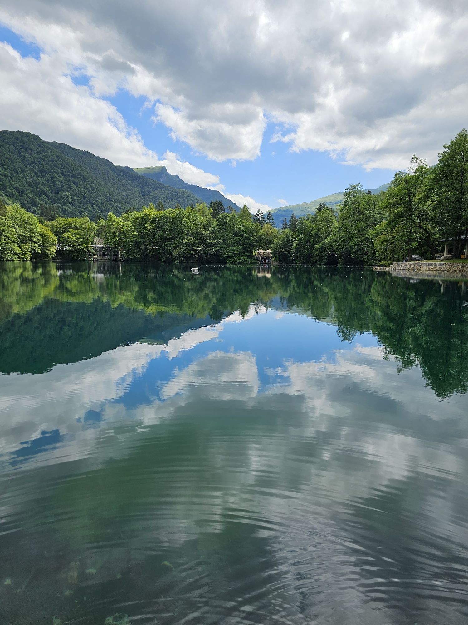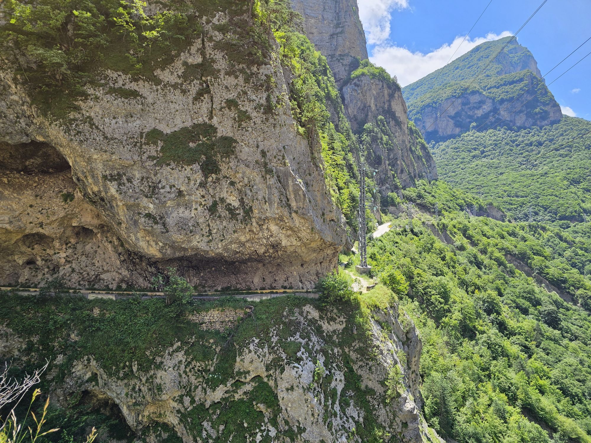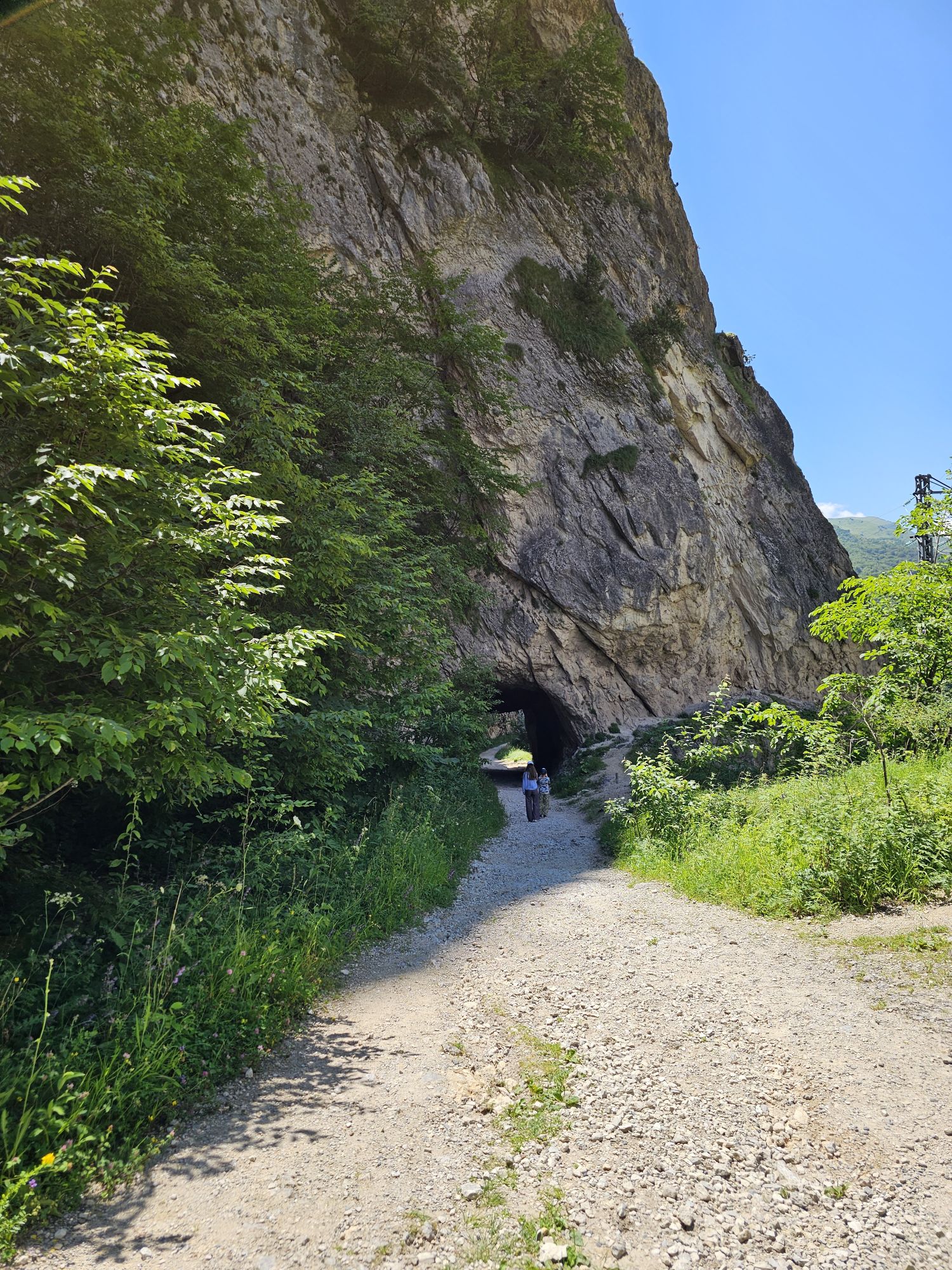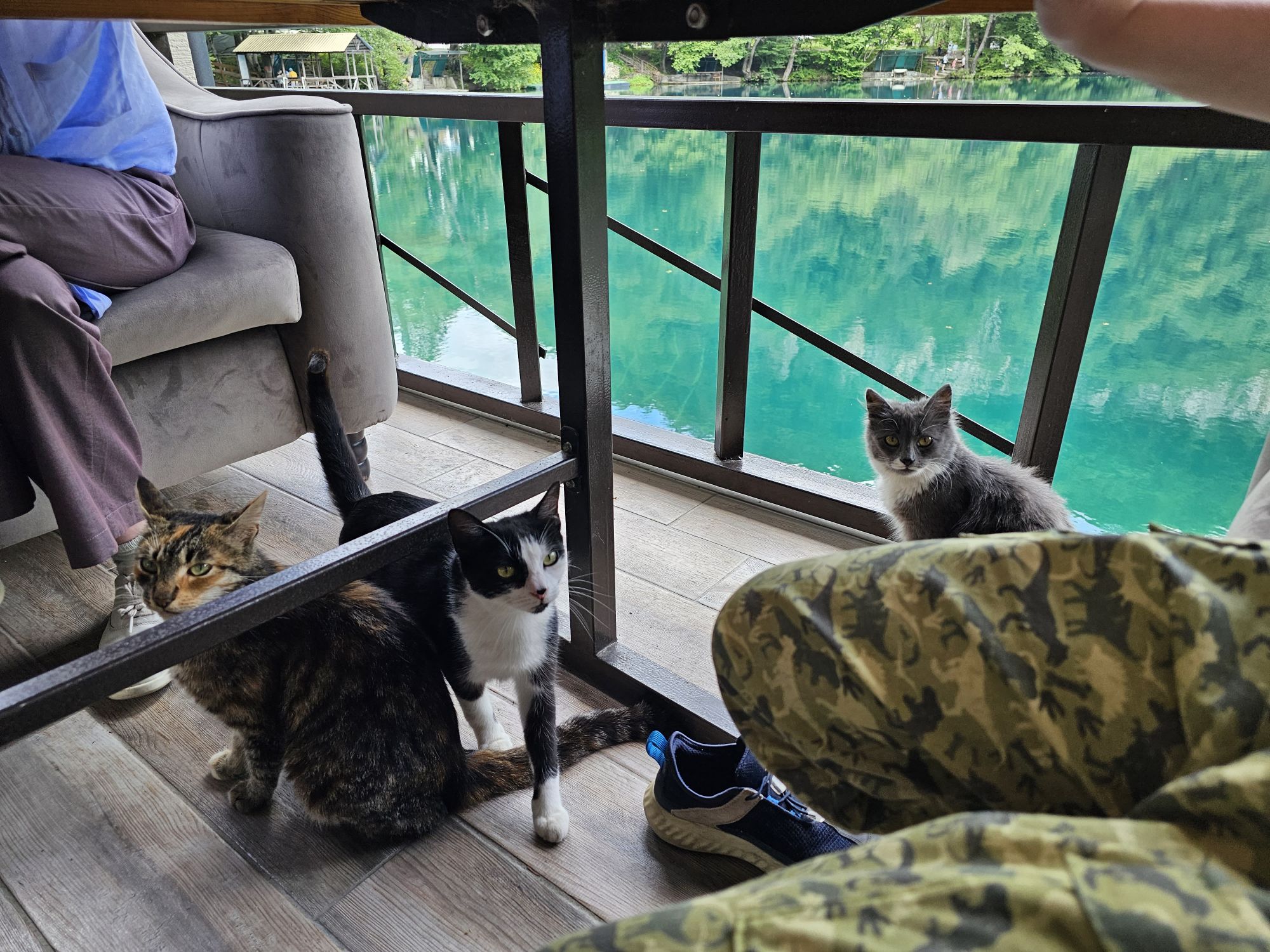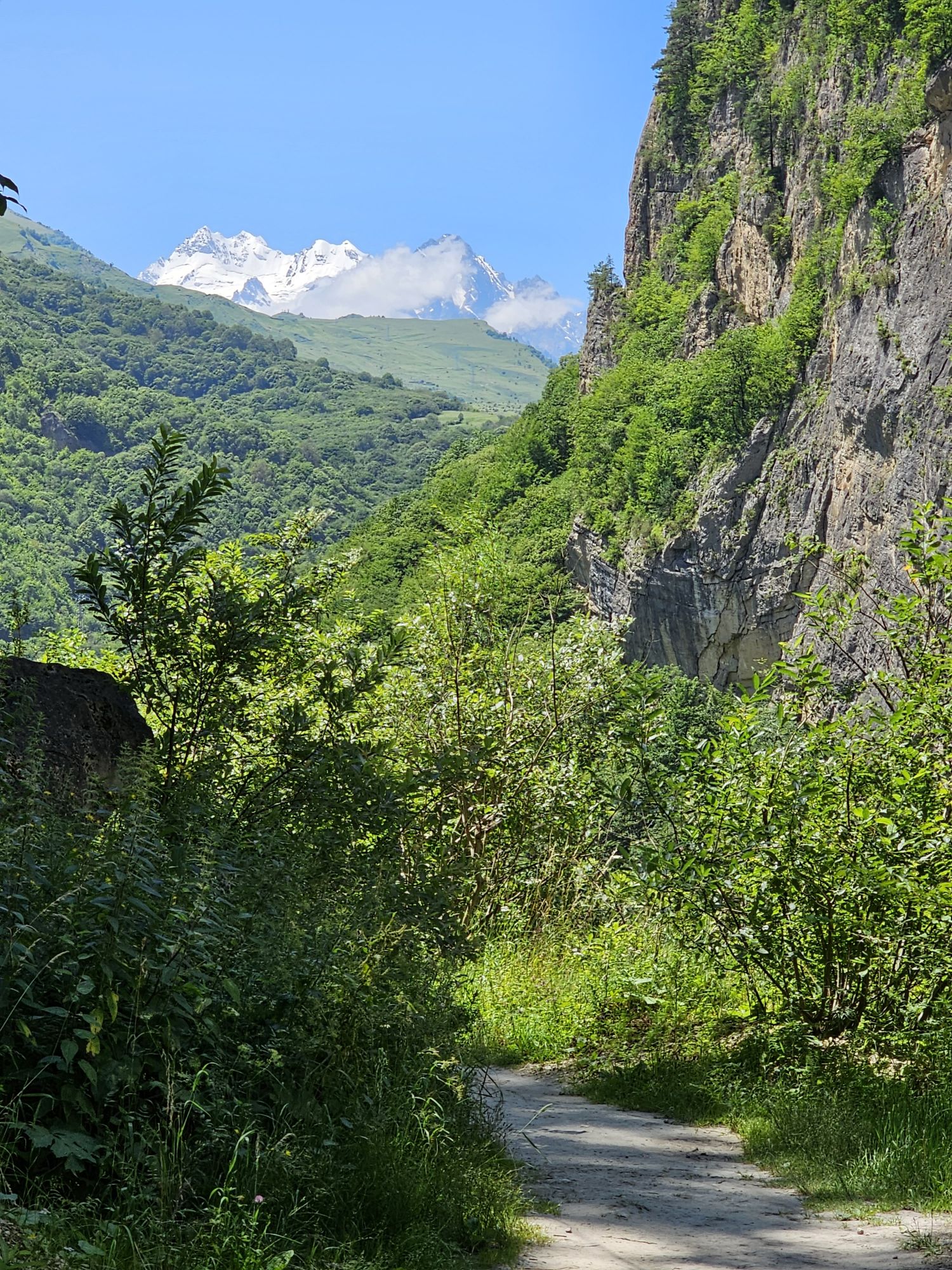 9 августа 2023 Продолжаю рассказ. Осталось собственно совсем немного. На следующий день после Джилы-су мы поехали в Кабардино-Балкарию, в Черекское ущелье. На самом деле это не самое лучшее решение - большой выезд в новые места сразу после Джилы-су, потому что эмоции еще не улеглись и воспринимать новое непросто. Но погода внесла свои коррективы и на дальний выезд у нас остался только этот день, а побывать там хотелось. Выехали утром, было ясно и солнечно. Сначала нам показался силуэт Бештау, а потом и приветственно выглянул Эльбрус. На фоне желтых подсолнухов он смотрелся особенно эффектно Еще через час дороги показались и другие заснеженные спины гор Кавказского хребта, а Эльбрус стал еще ближе.. Вот позади остался Баксан и поворот на Терскол, а вместе с ними и Эльбрус. Нам сегодня дальше и нас ждут другие горы Петляя по живописным горам, оставив пока позади Голубое озеро с невероятными отражениями, около десяти утра мы достигли первой точки нашего путешествия - старая колесная дорога в Черекской теснине. Огромные отвесные скалы на десятки метров вверх и не меньше вниз, а на дне несет свои воды Черек Балкарский.... Когда-то по этому обрыву ехали люди и грузы. Сейчас в скале пробит тоннель, а дорогу оставили для прогулок туристов. Виды - дух захватывает! А еще тут же стоят электрические опоры. На самом краю. В попытке преодолеть силы природы. А так сейчас выглядит тоннель и современная дорога (выглянули на секундочку): Вот из-за очередного поворота меж гор показались заснеженные вершины кавказских гигантов. Дорога не очень длинная. Мы неспешно прогулялись по ней туда и обратно, размышляя об особенностях жизни человека в горах и просто наслаждаясь видами. Сегодня речь не шла о километрах и треках. Сегодня был день созерцания Потом мы вернулись к Нижнему голубому озеру в надежде полюбоваться его красотой, увидеть своими глазами удивительный цвет и заодно пообедать. Расстроились - по озеру шла заметная рябь, отражения были смазанными, а цвет едва уловимым. Хотя озеро все равно красивое: Немного напрягло количество торговых столов вокруг всей дорожки, наперебой предлагающих разные товары от сладостей до сувениров и украшений. Но после вчерашнего Джилы-су вообще многое воспринималось с трудом. Открыв меню в кафе, мне даже немного взгрустнулось. От нечего делать решила попробовать хычины с ливером. Потому что люблю балкарские хычины и потому что есть пельмени или вареники в КБР совсем не было желания, такое мы и у себя поедим. И вот что я вам скажу: это были одни из самых вкусных хычинов в моей жизни! Я до сих пор помню их вкус и скучаю по нему. Вот без преувеличения - я бы поехала сюда снова только ради того, чтобы снова поесть их))) Вкусная еда добавила в организм немного радости и желания восхищаться. Плюс ели мы в очень наглой и очень очаровательной компании Сытые и довольные мы пошли дальше вдоль озера. Рябь улеглась и в воде снова отражались горы и облака Озеро совсем небольшое по площади. В длину 235 метров, а в ширину от 120 до 180м. Зато глубина! 279 м! (хотя сейчас вроде бы официальные данные уменьшили на несколько метров, но сути не меняет) Вниз больше, чем в длину! Здесь даже глубоководную технику разную испытывают. А еще здесь удивительный цвет воды и невероятная прозрачность. Пишут, что видно вглубь на 22м. И оптические обманы на каждом шагу: подхо