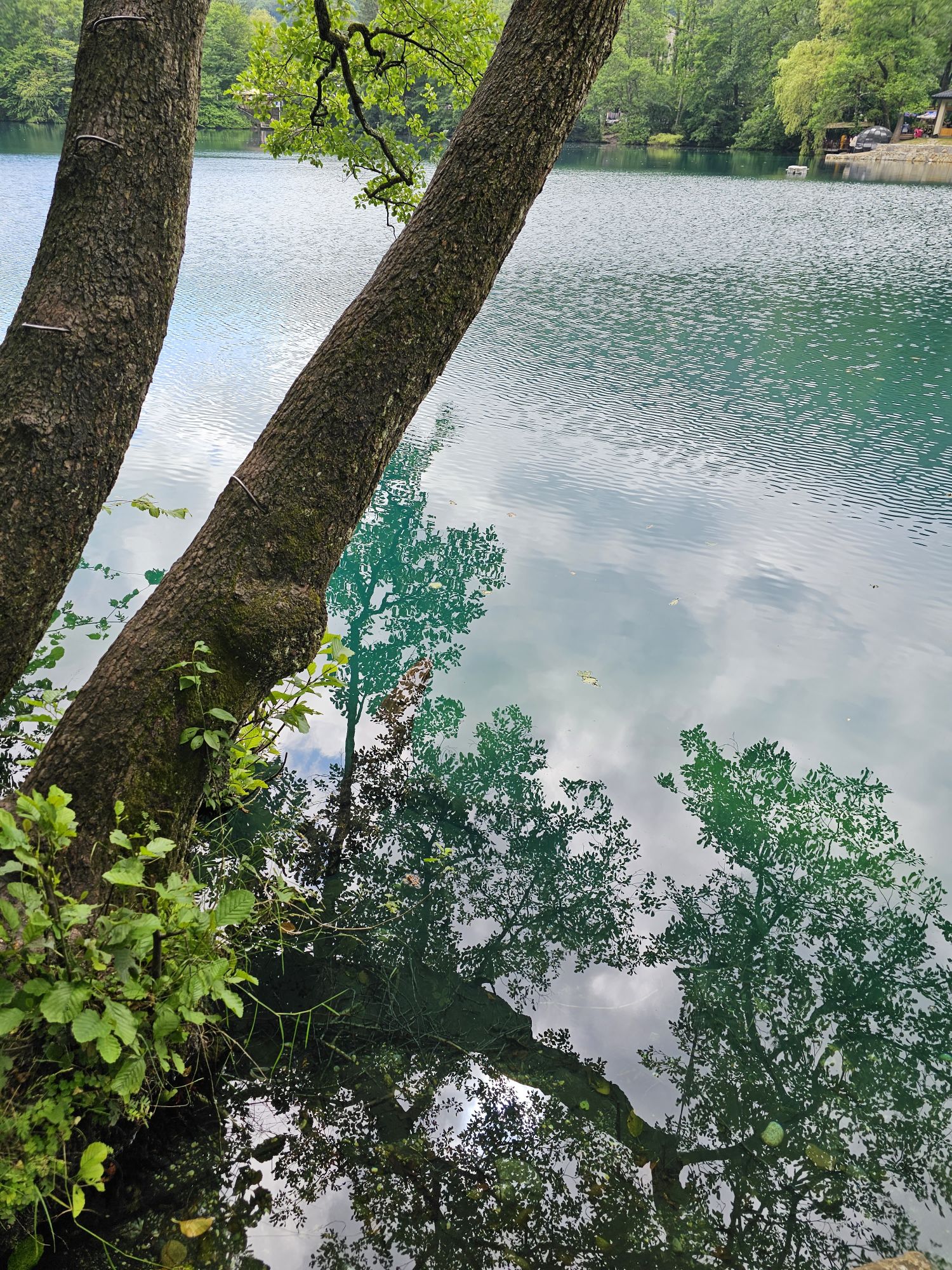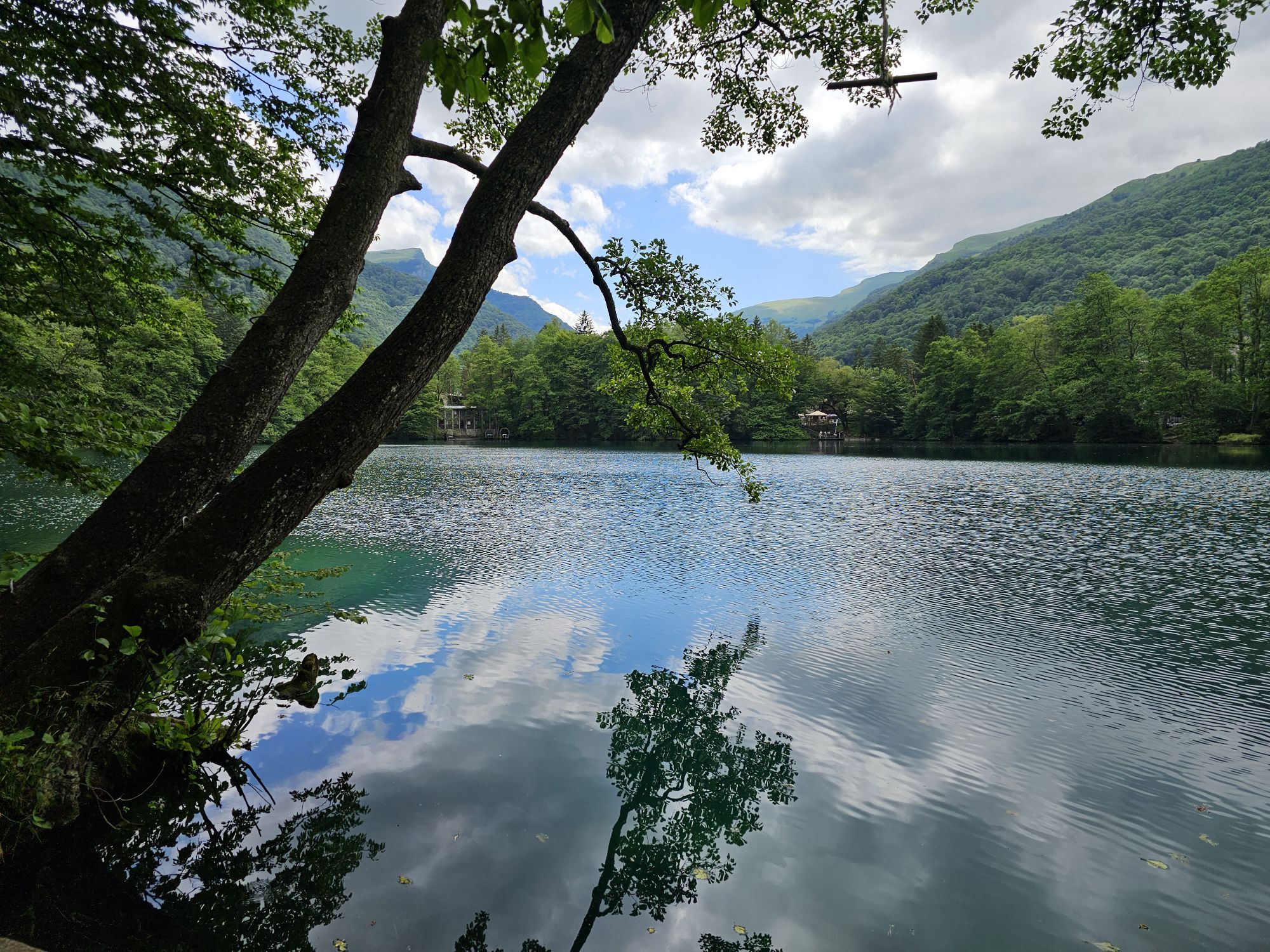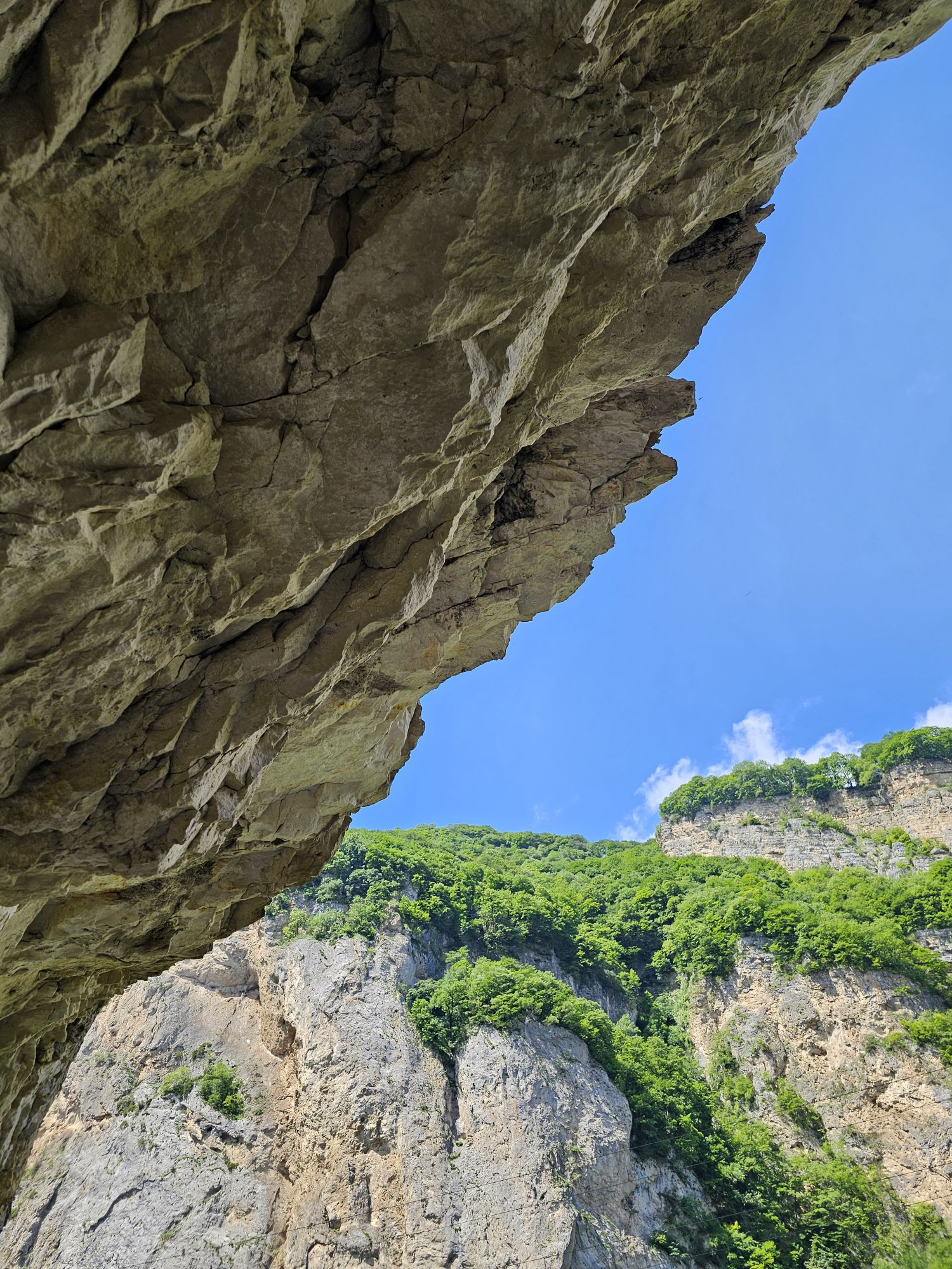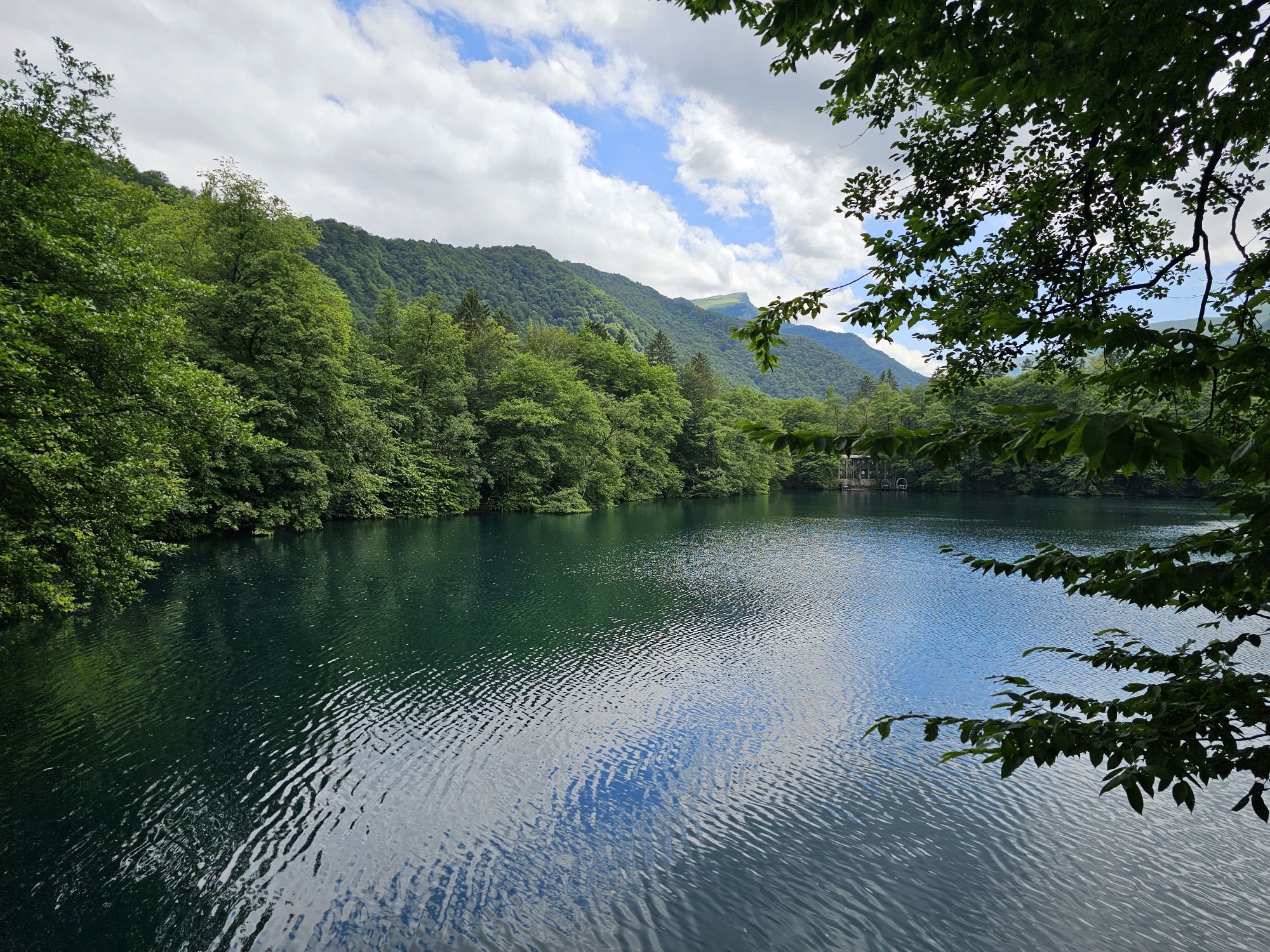 9 августа 2023 Продолжаю рассказ. Осталось собственно совсем немного. На следующий день после Джилы-су мы поехали в Кабардино-Балкарию, в Черекское ущелье. На самом деле это не самое лучшее решение - большой выезд в новые места сразу после Джилы-су, потому что эмоции еще не улеглись и воспринимать новое непросто. Но погода внесла свои коррективы и на дальний выезд у нас остался только этот день, а побывать там хотелось. Выехали утром, было ясно и солнечно. Сначала нам показался силуэт Бештау, а потом и приветственно выглянул Эльбрус. На фоне желтых подсолнухов он смотрелся особенно эффектно Еще через час дороги показались и другие заснеженные спины гор Кавказского хребта, а Эльбрус стал еще ближе.. Вот позади остался Баксан и поворот на Терскол, а вместе с ними и Эльбрус. Нам сегодня дальше и нас ждут другие горы Петляя по живописным горам, оставив пока позади Голубое озеро с невероятными отражениями, около десяти утра мы достигли первой точки нашего путешествия - старая колесная дорога в Черекской теснине. Огромные отвесные скалы на десятки метров вверх и не меньше вниз, а на дне несет свои воды Черек Балкарский.... Когда-то по этому обрыву ехали люди и грузы. Сейчас в скале пробит тоннель, а дорогу оставили для прогулок туристов. Виды - дух захватывает! А еще тут же стоят электрические опоры. На самом краю. В попытке преодолеть силы природы. А так сейчас выглядит тоннель и современная дорога (выглянули на секундочку): Вот из-за очередного поворота меж гор показались заснеженные вершины кавказских гигантов. Дорога не очень длинная. Мы неспешно прогулялись по ней туда и обратно, размышляя об особенностях жизни человека в горах и просто наслаждаясь видами. Сегодня речь не шла о километрах и треках. Сегодня был день созерцания Потом мы вернулись к Нижнему голубому озеру в надежде полюбоваться его красотой, увидеть своими глазами удивительный цвет и заодно пообедать. Расстроились - по озеру шла заметная рябь, отражения были смазанными, а цвет едва уловимым. Хотя озеро все равно красивое: Немного напрягло количество торговых столов вокруг всей дорожки, наперебой предлагающих разные товары от сладостей до сувениров и украшений. Но после вчерашнего Джилы-су вообще многое воспринималось с трудом. Открыв меню в кафе, мне даже немного взгрустнулось. От нечего делать решила попробовать хычины с ливером. Потому что люблю балкарские хычины и потому что есть пельмени или вареники в КБР совсем не было желания, такое мы и у себя поедим. И вот что я вам скажу: это были одни из самых вкусных хычинов в моей жизни! Я до сих пор помню их вкус и скучаю по нему. Вот без преувеличения - я бы поехала сюда снова только ради того, чтобы снова поесть их))) Вкусная еда добавила в организм немного радости и желания восхищаться. Плюс ели мы в очень наглой и очень очаровательной компании Сытые и довольные мы пошли дальше вдоль озера. Рябь улеглась и в воде снова отражались горы и облака Озеро совсем небольшое по площади. В длину 235 метров, а в ширину от 120 до 180м. Зато глубина! 279 м! (хотя сейчас вроде бы официальные данные уменьшили на несколько метров, но сути не меняет) Вниз больше, чем в длину! Здесь даже глубоководную технику разную испытывают. А еще здесь удивительный цвет воды и невероятная прозрачность. Пишут, что видно вглубь на 22м. И оптические обманы на каждом шагу: подхо
