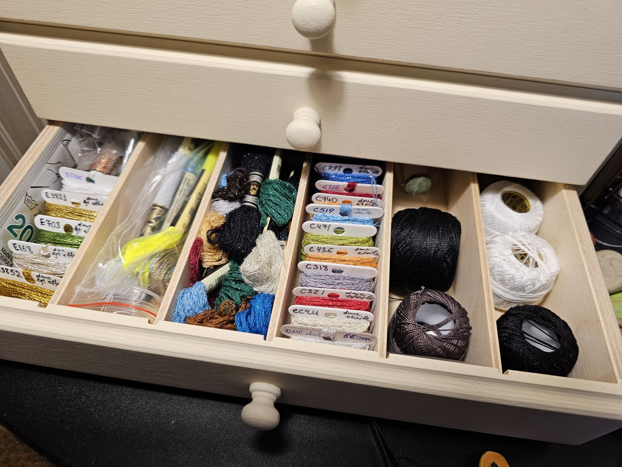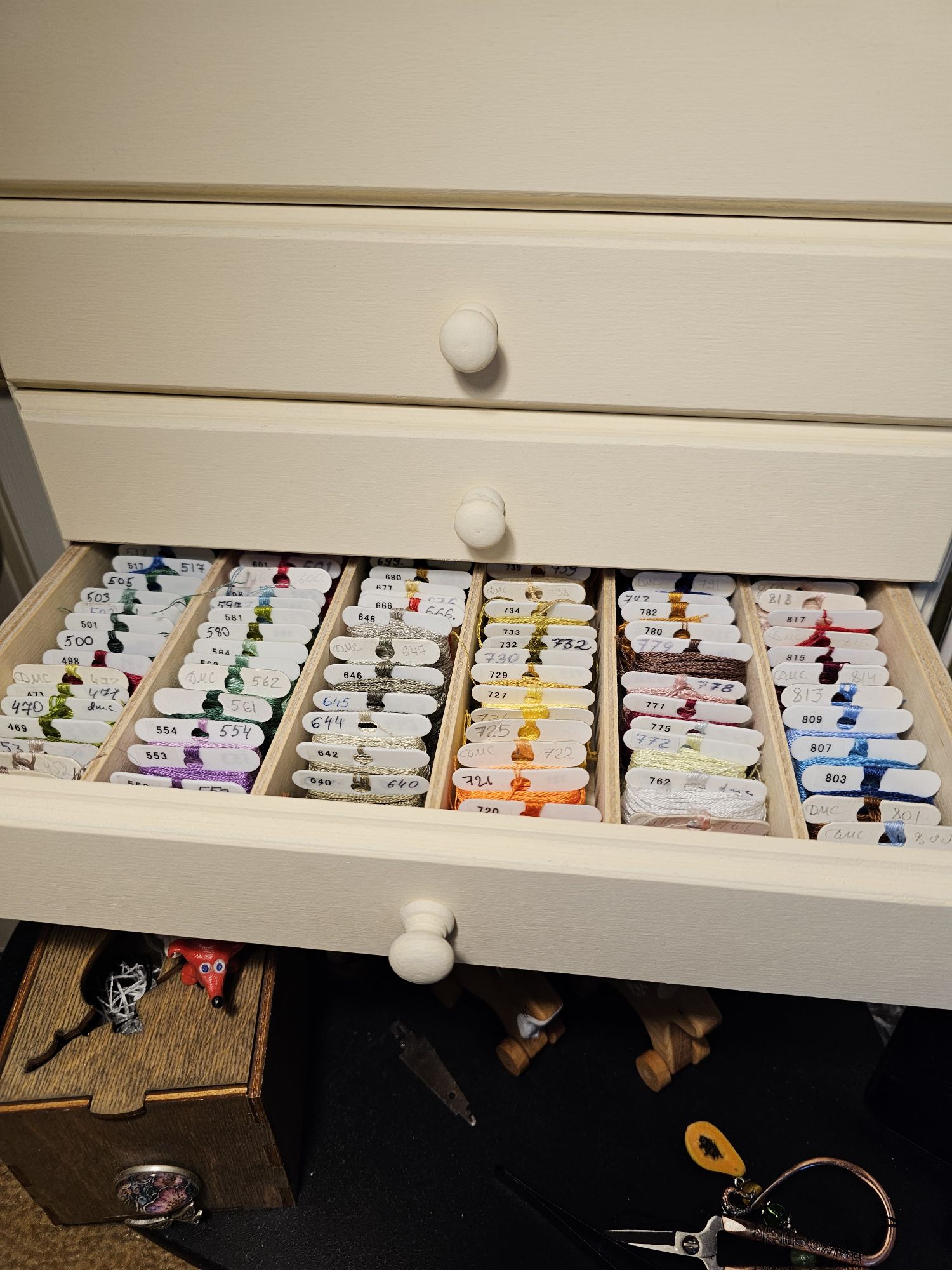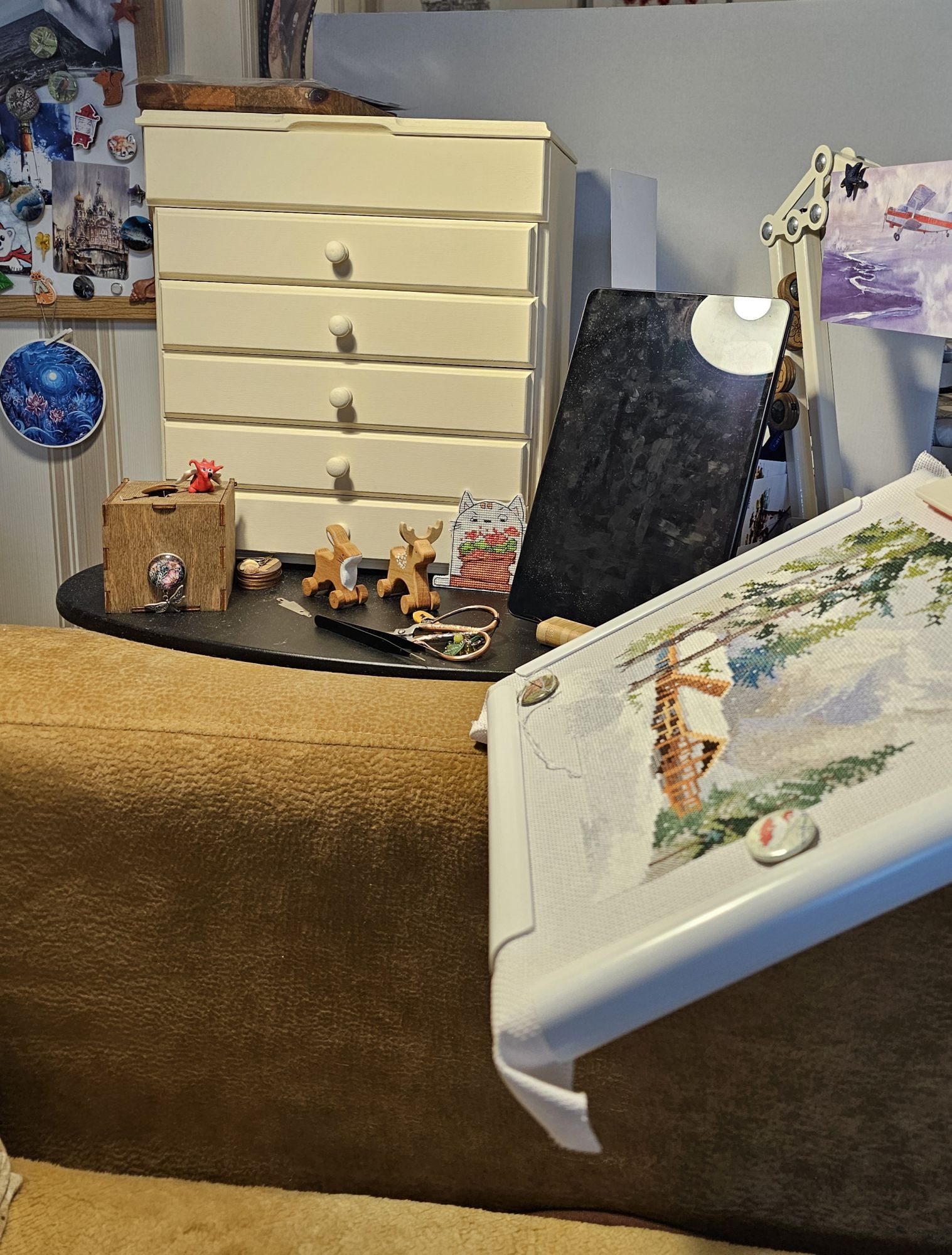 20 декабря 2023 Всем привет! Сегодня хочу быстренько про комодик накатать. Обещала так сказать)) А заодно и пару процессов закину, чтобы под новый год опять целую кучу не оставлять) Овечкины забавы, Охотник за теплом - финиш! Это процесс когда-то начинался в самое темное время года, так он и завершился примерно в то же время. И хотя официальное название мне так и не стало близко, но ощущения где-то рядом. Вот он свет в фонарной свече. Чтобы пережить темноту и снова взять курс на весну)) По технике. Крестики были обычными. С умеренным количеством блендов и вполне достойным переплетением цветов в рамках темы "шерсть животного". Цвета классные: не мультяшные и очень подходящие друг к другу. Спокойные что ли. Иногда хотелось поярче, но это не к этому процессу претензия, а к настроению. Тут просто на некоторое время меняла процесс. А вот про бэк хочу сказать отдельно. Его здесь немало. Примерно столько же, сколько и в зимородке. И в 1, и в 2, и даже в 3 нити. Но! Что удивительно, он настолько хорошо сделан, что не вызвал ни единого нарекания или секундного раздражения. Он будто шел сам. И если на зимородке бэк я делала в 4 захода (4 дня) с перерывами на успокоиться другие процессы, то бэк на лисе я сделала за вечер без преувеличения! Вот это, на мой взгляд, и есть мастерство дизайнера. И еще одно замечание про бэк. Черный в одну нить шила привычным мулине dmc, в две нити - dmc perle 12, а в три нити - finca perle 12. И вот этот момент мне показался очень интересным. Раньше у меня только финка перле 12 была и я ей вполне успешно заменяла бэк в 2 нити. А тут недавно по вменяемой цене попался моточек dmc perle 12. И когда я взяла их в руки, то сразу увидела, что финка несколько толще. Ну я вижу невооруженным глазом по крайней мере) Решила попробовать этот эффект в дизайне и, на мой вкус, все получилось. Не говоря уже про то, что конечно, так много аккуратнее и проще) Punochka (Евдокия Николаева), птицы - продолжение В птичьем семействе от Пуночки прибавилось три птички. Это пуночка (на ней я остановилась в прошлый раз) - северный воробей, как ее еще называют, воробьиный сычик (еще один в мою вышивальную биографию) и яркая свиристель. По прежнему восхищаюсь их простотой и при этом неотразимым шармом в результате. Уже даже хочется поскорее их оформить. Но впереди еще несколько птиц. Сейчас готово 10. Не знаю, буду ли шить все 15, но как минимум 3 еще точно будут. *Татуся, это еще не финиш Ну и дальше про комодик для мулине. Во-первых, почему решилась, ведь долго считала просто декорацией, причем слишком дорогой. Я шью много процессов сразу. Даже очень много. Достаю их по настроению и порой меняю хоть каждый день (или чаще). С наборами все просто: нитки в своих упаковках на родных органайзерах, достал и готово. А вот схемы... раньше я набирала нитки из коробок с палитрой на 3-4 процесса и держала их на рабочем месте. Но со временем меня стало это все больше и больше раздражать, т.к. при завершении непонятно, какие нитки надо убрать, а какие пересекаются с остальными процессами. А если хочется вот сегодня денек пошить что-то? Или миниатюру на пару вечеров? Коробки со шкафа водружались на диван и падали, когда сынуля, например, прибегал обниматься перед сном и прыгал на диван со всей своей девятилетней тогда еще прытью)) Ну и вообще, напрягало, каждый раз это перебирание туда-сюда. Поэтому я стала искать комодик, который встанет на 