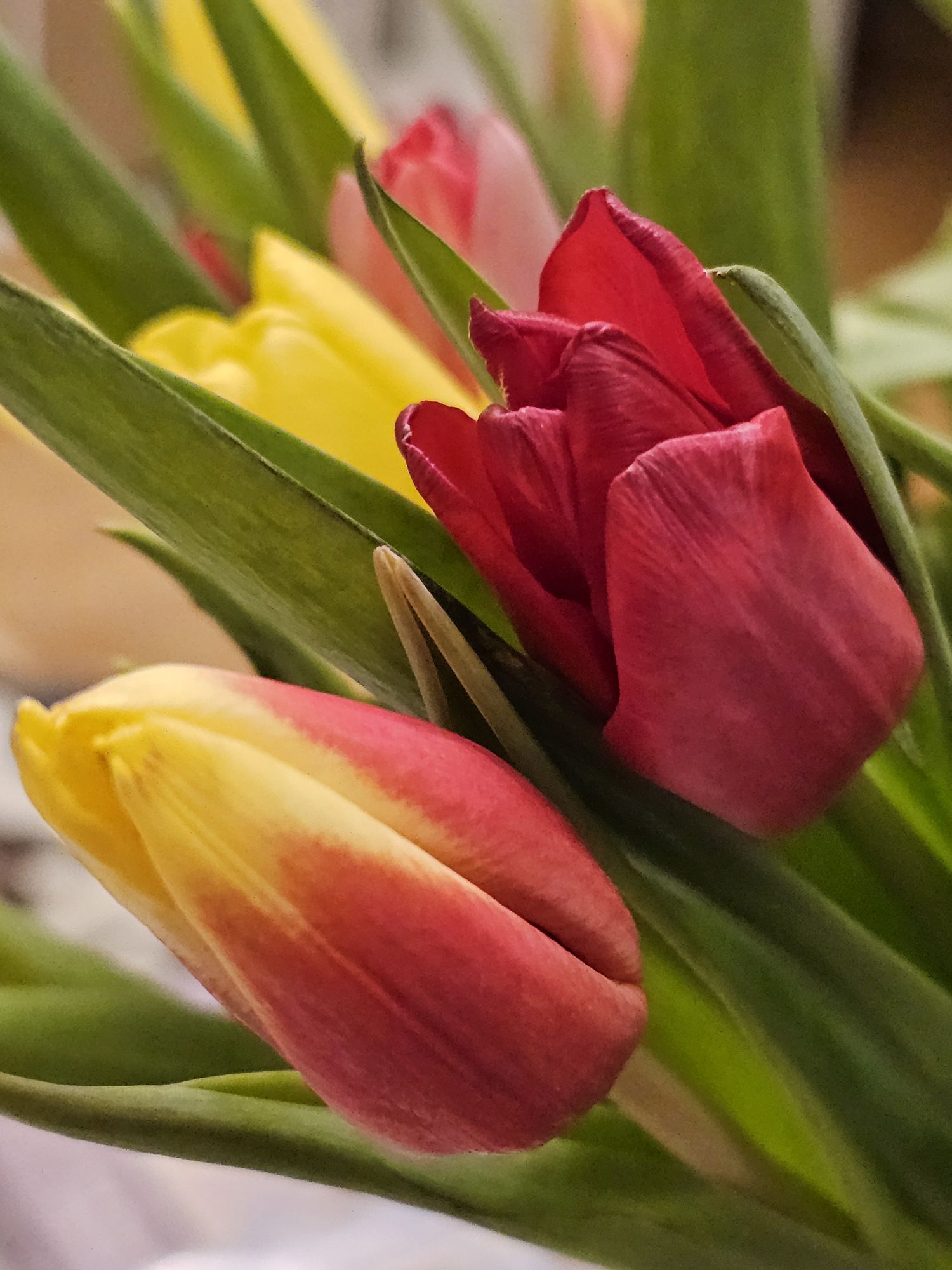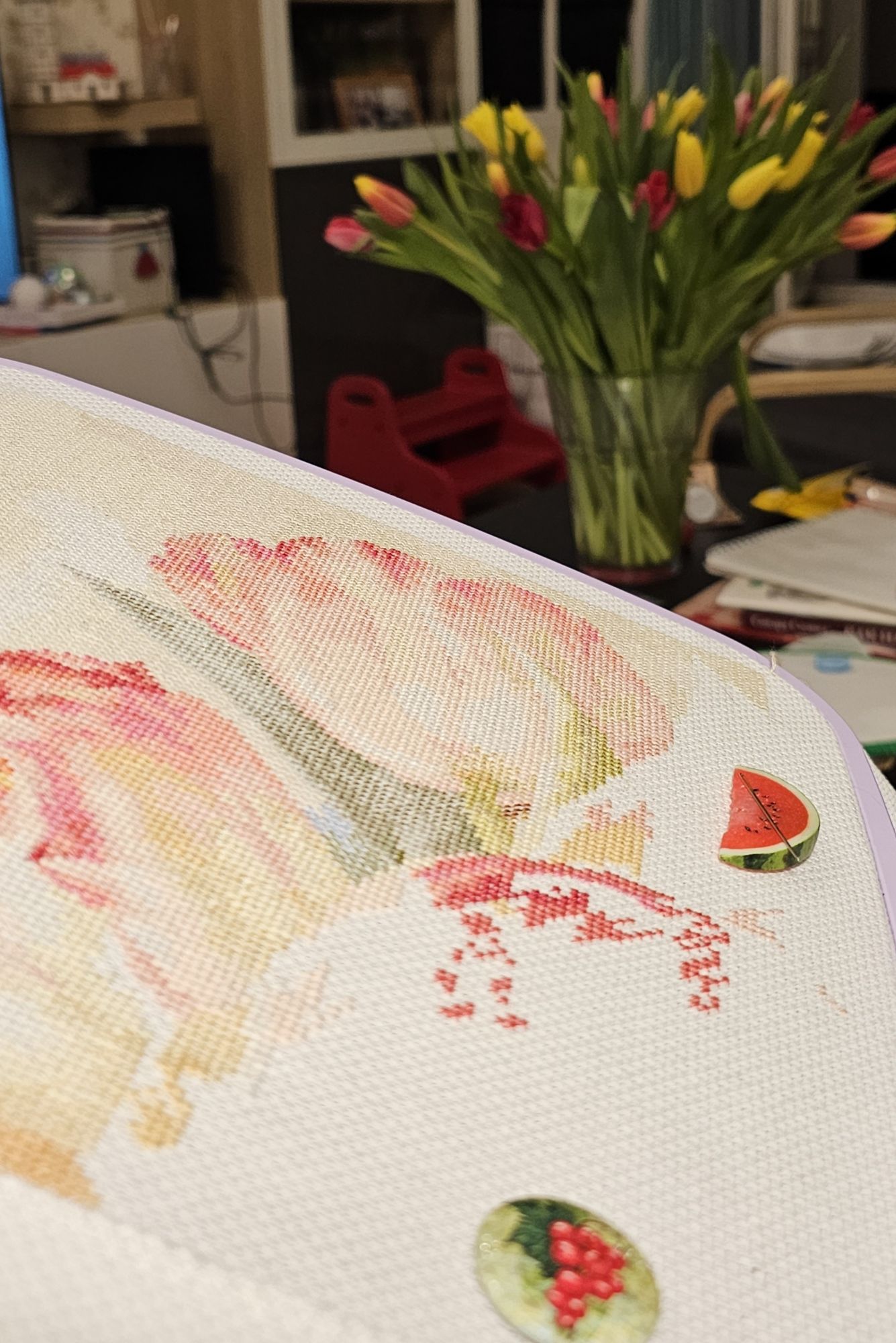 16 марта 2024 13.03.2024 в 12:54, OlkaY сказал(а): День добрый мартовский! Что-то в этом году март меня в целом не расстраивает совсем. Возможно дело в солнышке, а может еще в чем. Но сегодня я вам цветочный отчет принесла. В самых разных смыслах. Ну и в вышивальном, конечно, тоже) Началось все с того, что на 8 марта муж решил превратить нашу квартиру в цветочное царство. И повсюду засверкали краски. Красные и белые, сиреневые и желтые, воздушные облака и озорные "подсолнушки". Ну и конечно, солнышки-нарциссы, которые особенно поднимали настроение Для вышивки это имело несколько последствий. Во-первых, немедленное вдохновение на фотосессию номер раз)) Ольга Антропова, Зимний сон - финиш! *Татуся, добавь, пожалуйста, эти фото в гайку. В прошлый раз ты мне гайку сразу позеленила: спасибо за веру в меня, пришлось соответствовать Я как раз дошила тогда мишку и искала идеи для итоговой фотосессии. Но сначала процесс: Я просто в восторге от результата! Оттенки и узор на подушке - чудесны Будильник выглядит отлично, а не какой-нибудь "пластмасской", но самая моя любовь - это микроскопические пуговки на подушке. Они действительно ооочень маленькие и так тут в тему А еще процесс. Все же Ольга Антропова настоящий мастер подобного жанра. Суть даже не только в итоговом результате (хотя он в большинстве случаев превосходен), а в том, как это удобно сделано, минимальными средствами, с минимумом цветов и совершенно без мешанины. Т.е. это действительно отдых и удовольствие. Особенно я смогла это прочувствовать, когда после мишки взяла вторую миниатюрку с ФР, дракончика от Лисы-рукодельницы. С набором там тоже все ок, и результат я в руках держала - будет чудесно, но вот с дизайнером у меня любви не вышло: мешанина такая, что вышиваю по ниточке-две в день исключительно ради результата. А вы знаете, что для меня процесс как минимум не менее важен в вышивке. Так что я даже гайку заводить не буду, ибо фотографировать процесс нет желания. В общем, Ольге Антроповой респект еще раз! А вот и итоговая цветочная фотосессия. Как только Лешка назвал эти цикламены "облачками на ножках", в голове у меня все сложилось Последствие цветочного нашествия номер два: вдохновение на очень старенький и всем известный процесс с тюльпанами: Алиса, Тюльпаны - продолжение Я очень люблю этот дизайн. Очень! Несмотря на годы, прошедшие с его выпуска и с того времени, как он поселился в моей гайке. Но это не мешает однако откладывать его вновь и вновь, вышив ниточку-другую. А тут все совпало: весна, желание шить и видеть цветы и эти самые цветы вокруг! Так что буквально за неделю полностью оформился еще один бутон, а другой вышился как минимум наполовину. Если в количестве крестиков, то там почти рекордные для меня значения выходят. Для удобства надо передвигать пяльца, поэтому пусть будет фото для гайки. И для цветочного отчета, конечно) По секрету скажу, что вчера вечером я пяльца передвинула и даже обрисовала нижний угол! Надеюсь, что в ближайшее время эти тюльпаны снова появятся в отчете)) И наконец, еще одна фотосессия. Тут уже не для гайки, я вам завершение процесса показывала. Но для красоты и Галереи. Потому что пока оформление не планируется. Скорее всего ближе к зиме теперь. Или к осенней ФР, если решу в круг оформлять. А еще одна приятность связана с тем солнышком и голубым небом, что я показывала совсем недавно. 