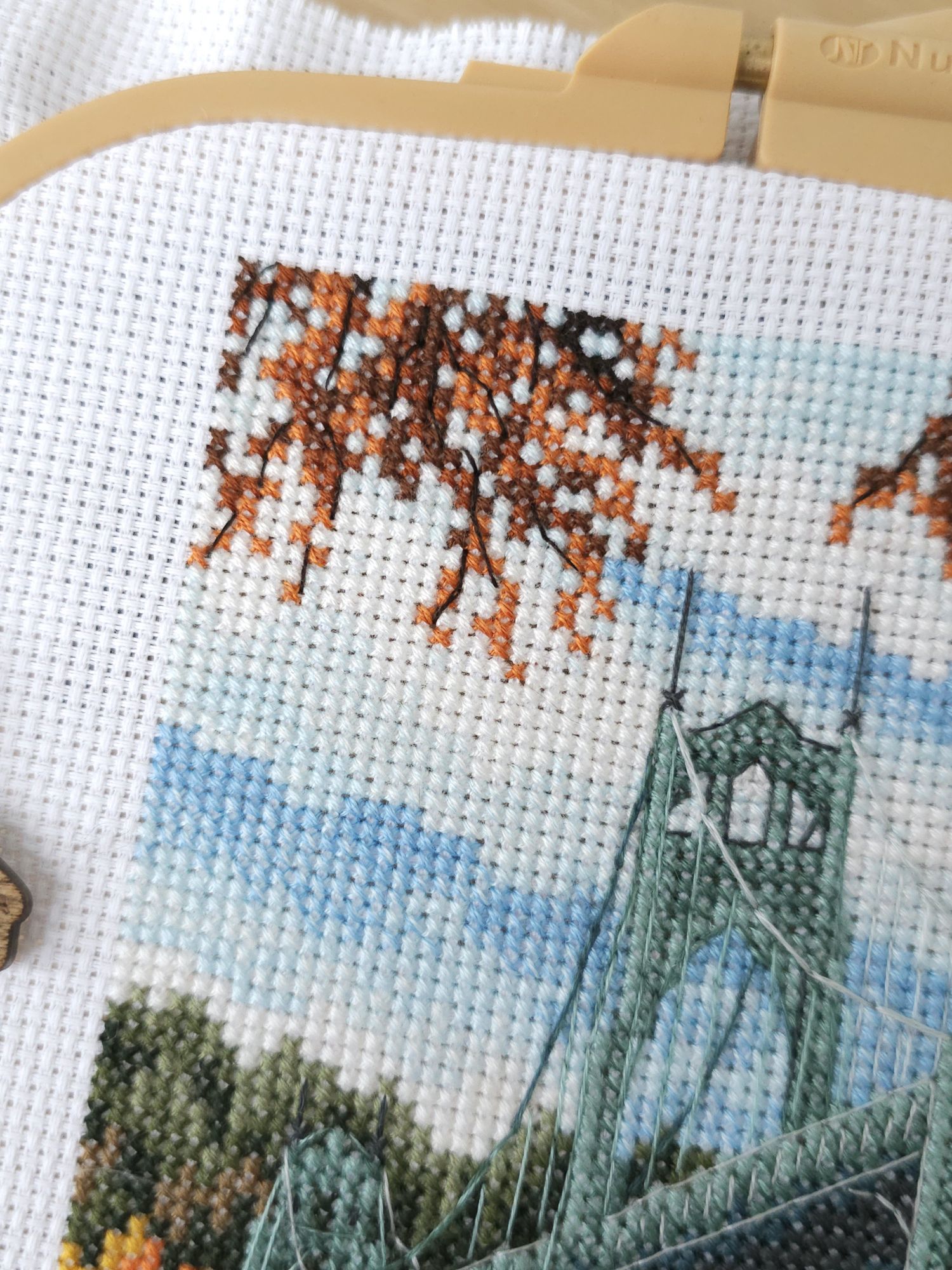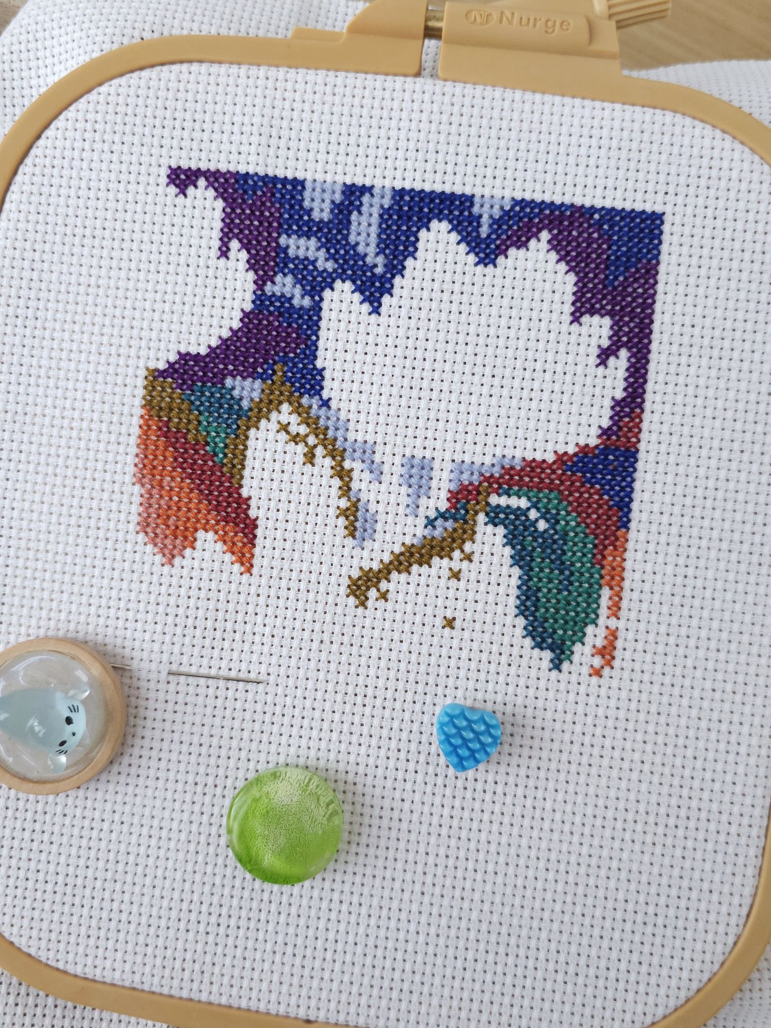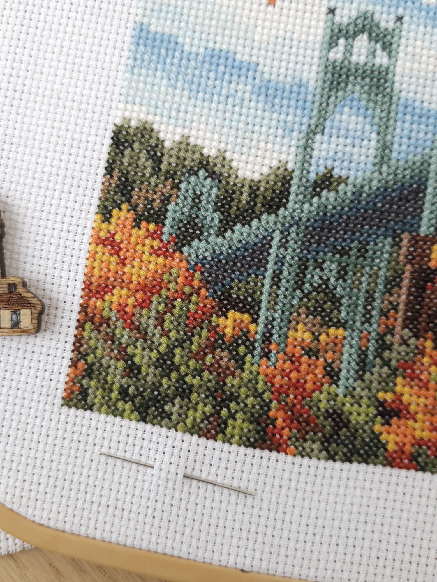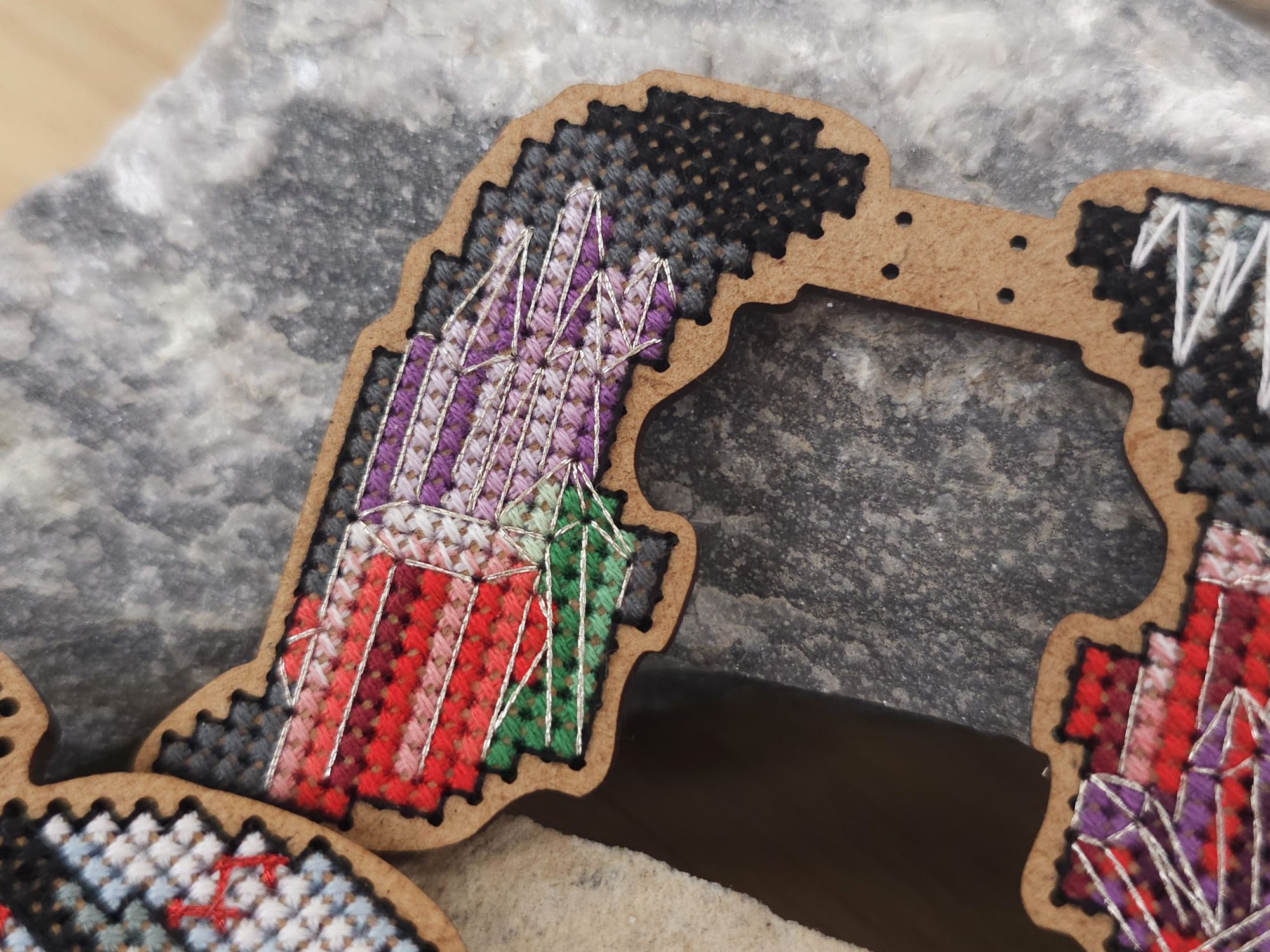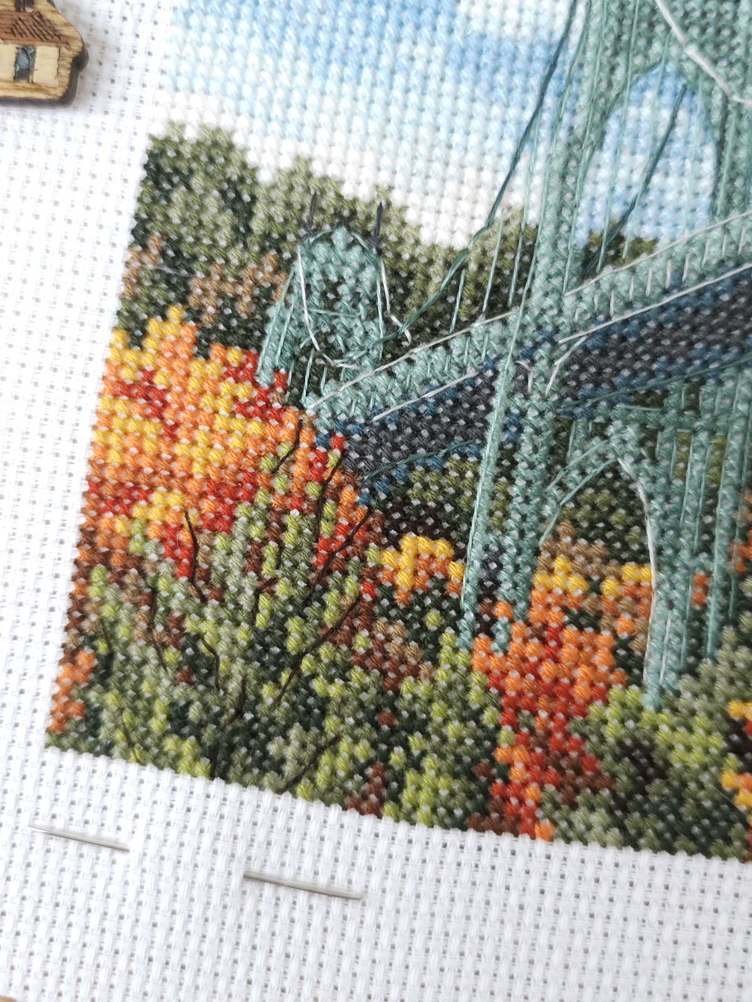 27 октября И снова здравствуйте. У меня опять отчет. Внезапно) И снова с финишем! Что-то я разошлась не на шутку. Вот бы подольше такое настроение продлилось. Хотя это вряд ли - ко мне из Димшопа еще РТОшки из новой коллекции едут Ну а пока: Совиный лес, Прялка - финиш! Ух как мне этого хотелось. И как упорно я шла к этому. Чуть невышиванца не словила, но вовремя отложила на пару дней и потом уже финальный рывок. И это при том, что мне очень нравится и то, что получилось, и процесс. Парадокс, однако! Я списываю на малое количество оттенков, которые не обладают "веселящим" эффектом посреди хмурой и темной осени, да еще под аккомпанемент болезни. При этом для прялки эти оттенки идеальны- эдакая потертая доска из сундука получилась. Правда с фото совсем беда. То ли оттенки эти такие сложные, то ли всему виной осенняя хмарь, но фото категорически не передают того, что я вижу перед глазами. Ни правильного баланса цветов, ни соотношения яркости. Оставлю пока как есть, чтобы гайку закрыть (как долго я к этому шла!), а потом буду думать-пробовать еще. +1 ярус, уникальный отсутствием симметрии и наличием сюжета: И финальный ярус фигурно-украшательный: Разворачиваем, стираем. гладим и вуаля: Для масштаба с мотком ниток:(это фото не в гайку) Ну в общем, я не только миниатюры шью порой Следующий процесс - новый, тот самый, что вклинился между ярусами прялки и спас от невышиванца. Хотела бы я сказать, что финиш, но это не совсем так. Евгения Колесникова, Ангел минералов - новый процесс! Соскучилась по этим ангелам. А минерального давно руки чесались в работу взять. Он по картинке мрачноват немного. Но почему-то мне казалось, что живьем все иначе. А камни я люблю, у сына так вообще коллекция большая и он их помнит все и периодически рассказывает интересности. Скрин от автора: Вышивка на деревянной основе, нитки по ключу. включая цветные металлики. В процессе вышивки поняла, что тут еще и явно жеода аметиста подразумевается (а аметисты я очень люблю), так что вообще все сомнения пропали. Крылья так вообще калейдоскоп ярких цветов, их которых серебристый бэк нарисовал красивые графичные кристаллы... А в аметистовой жеоде вообще многоцветный металлик в 1 и 2 нити - живьем смотрится здорово. На фотографиях блеск, конечно теряется. Но об этом я подумаю позже. Осталось ерунда - пришить шармик и собрать. Но это не мой случай. Мне опять категорически не понравился блестящий золотой шарм из набора. Как по мне он совершенно не монтируется с серебристым бэком на платье и крыльях. Поэтому, перелопатив сначала закрома, а потом и озон, я нашла то. что может подойти. Но приедет оно не раньше 7 ноября. Так что гайка пока будет краснеть, а я терпеливо ждать, подпрыгивая периодически от нетерпения И еще один процесс на сегодня. Следующий кандидат на финиш. У меня есть несколько дней, чтобы попытаться его закончить, пока посылочка от Александры едет из Ростовской области в Московскую РТО, Мост Сент-Джонс - продолжение Наконец-то взялась за него. Правда, предварительно, добыв перенабор. Так-то гайка от 2019го года. Отличный и немного читерский способ поправить статистику и повесить себе на грудь виртуальную медаль за победу над очередным долгостроем Такой кайф, однако. 14я канва еще нормального качества, яркие цвета, прямо душа и глаза радуются. Помню да, что главная засада этих мостов в бэке (и много, и эст