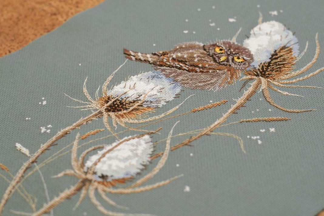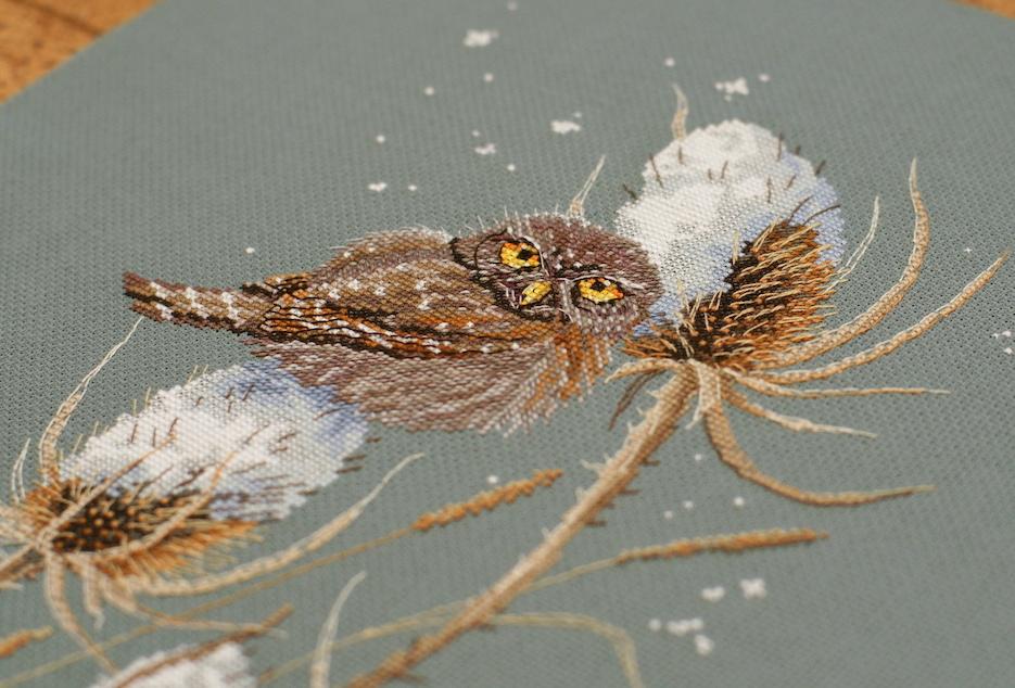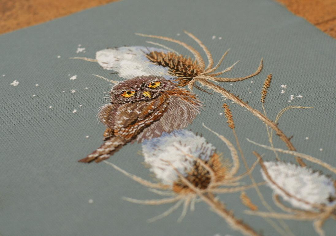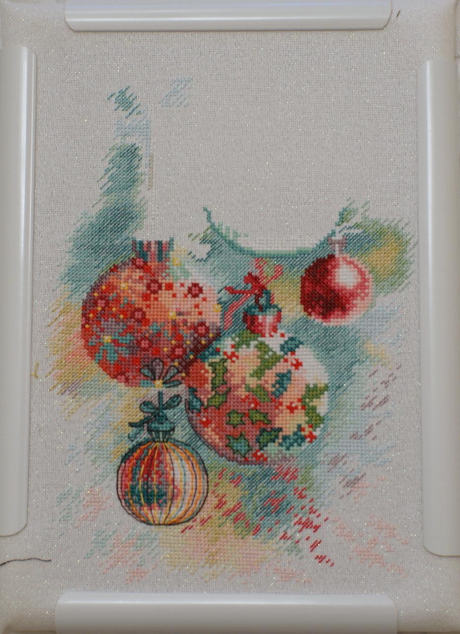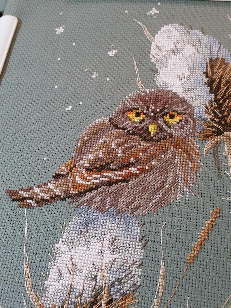 21 ноября 2015 Всем привет! Погода за окном очень тоскливая. Выпавший было на неделе снег, подарив немного радости и света, превратился в отвратительную кашу, а потом и просто в лужи. Небо не перестает плакать печальными слезами...Эх, не знает небо, что ноябрь к концу, совсем скоро начнется предновогодняя суета...ему бы Шарики повышивать Восстанавливаться после кишечной болячки вообще грустно и тяжело. А тут еще дети всю ночь плохо спали, любимого форума на сутки лишили...короче, встав утром "в печали" решила я непременно выйти на улицу и найти там "красоту и вдохновение"... ибо надоело... Даже небо перестало плакать, опешив от такой неожиданности. А потому для начала несколько кадров из серии "было бы желание видеть или вдохновение всегда рядом" Теперь о процессах... 1. Сычик... По поводу пятен... пятна никуда не делись, их много на канве, причем откуда они взялись - мне неизвестно. Но! Их хорошо заметно в мокром виде, а на высохшей канве при освещении, имеющемся в квартире они незаметны. Я, зная где и что искать, под определенным углом, конечно, вижу намеки на них, но не более. Пока диагноз таков - офомляться везти! А вот там, под светом операционной багетки будем ставить диагноз вместе с Ириной. Но, думаю, что пациент скорее жив, чем мертв. О происхождении остается гадать...возможно это какая-то технологические разводы от веществ, которыми обрабатывают канву. В целом, если их будет не видно, мне все равно. Ну а вы, граждане страждущие и желающие иметь такую птичку дома, думайте сами менять или не менять. Возможно просто стоит намочить перед работой и посмотреть, есть ли эти пятна у вас, а потом решать. Ну а птичка, спрятавшаяся среди шариков чертополоха, получилась очень классная! Чертополошины невероятные! Не устаю восхищаться работой дизайнера, который сумел создать на канве такой живой и настоящий сюжет. Казалось бы, море бэка...но в этой работе он меня ни капельки не напрягал, я его даже ждала, поняв на первом элементе, как он хорош и как преображает и без того удивительную картинку. Но все же...рекомендую весь бэк на конец не оставлять - можно не выдержать количества. Довольно слов, буду показывать фото. Правда фотографировать пришлось при искусственном освещении - слишком уж пасмурно на улице, - поэтому фото не до конца передают все магию работы...но что уж есть. Сычик до бэка: и после него : Ну и готовая работа целиком: Про снежинки. Они состоят их крестиков белым цветом в одну и в три нити. Испугавшись бугров на отшиве, виденном на выставке, делала их немного извращенческим методом: брала нить в одно сложение и сразу шила одно- и трехниточные крестики, прогоняя иглу трижды по одному стежку. Что дало: меньше обрывов и закрепок, закрепки из одной нити, а не из трех, времени ушло гораздо больше. А будет ли визуальный эффект "отсутствия бугров", узнаем после оформления. Ну и еще несколько фото в разных ракурсах: 2. Новогодние Шары им на этой неделе досталось совсем мало внимания. Но именно они спасли меня от желания "бросить вышивку" при виде пятен на Сычике. Мне даже было почти все равно, потому что есть Шары и теперь можно шить их не отвлекаясь ни на что другое. Как итог дошитый "ветряночный" шарик и начало бэка. Полосатенький готов полностью. Кстати бэк здесь тоже кайфовый, равно как и крестико-полукрестиковая часть, - логичный, понятный, без лишних обрывов. В общем я теп