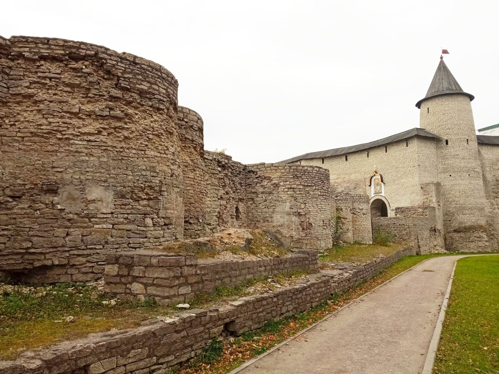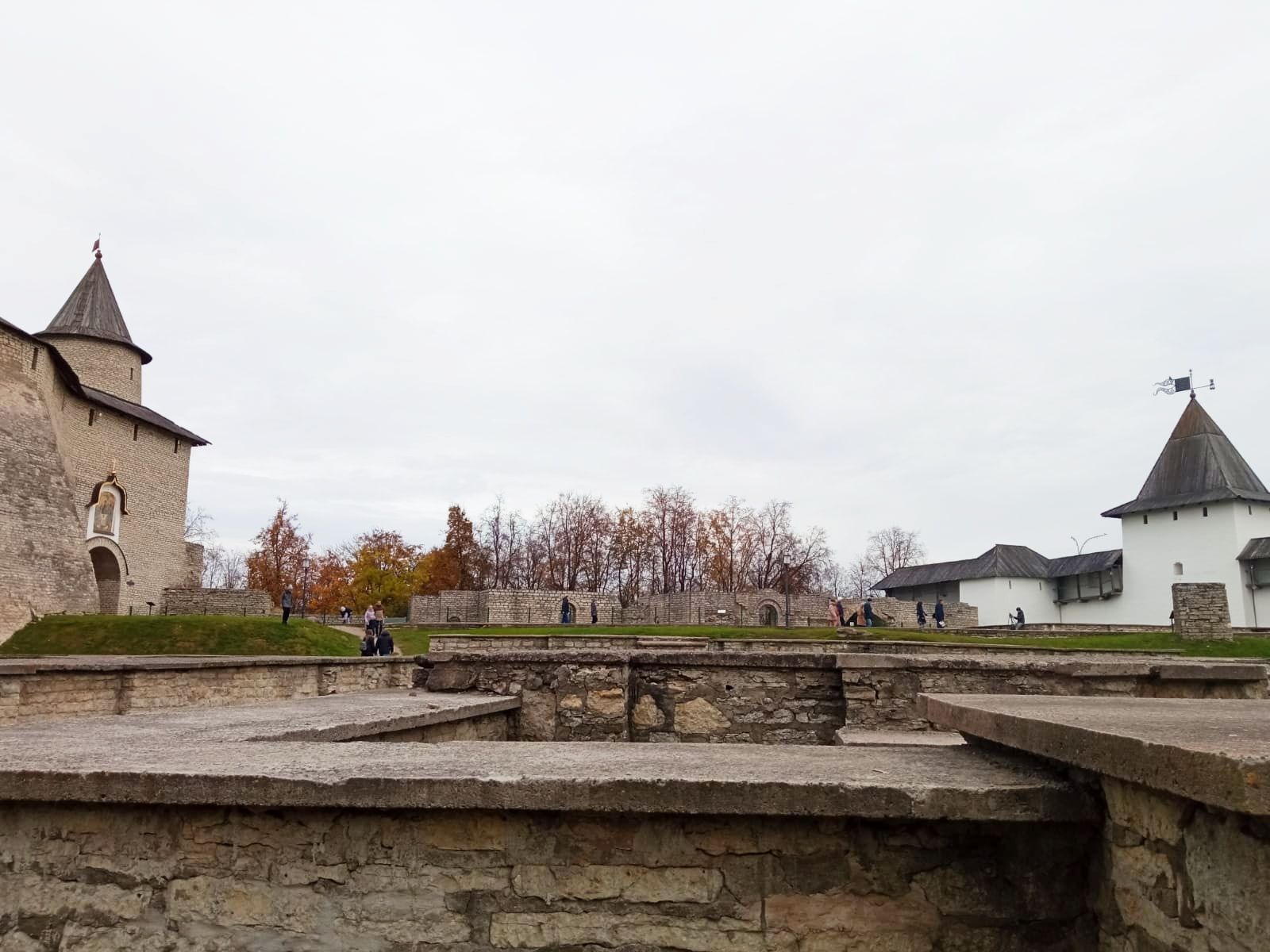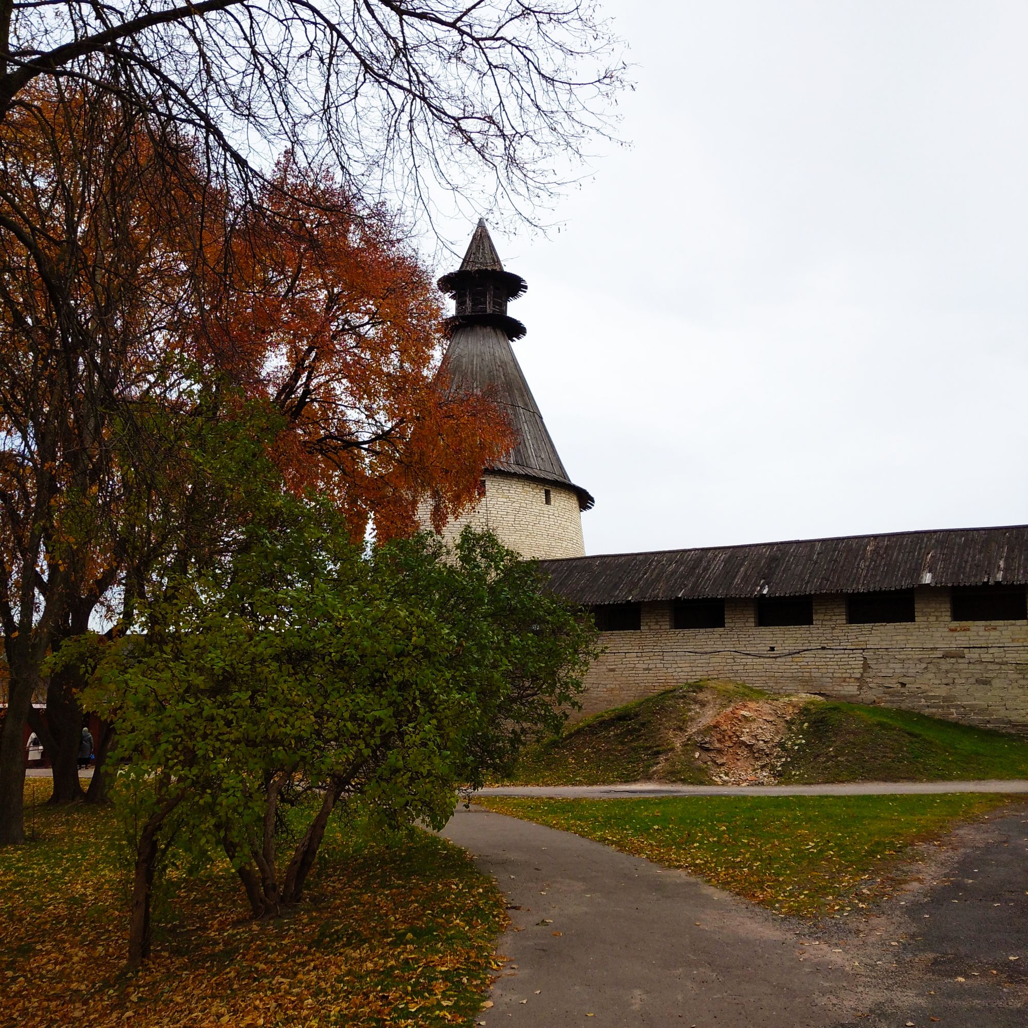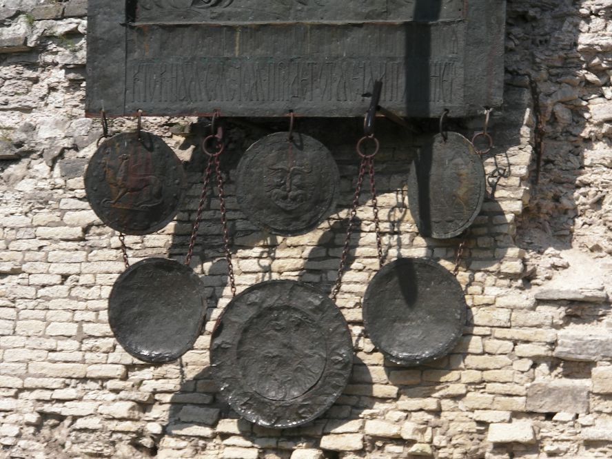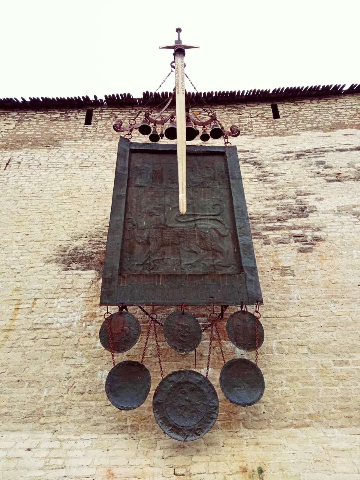 19 октября 2021 Третья часть - последняя. Уже о выходе. Или о входе.... Войти в Кром можно по захабу. Что это такое? Заха́б — фортификационное сооружение в средневековых крепостях, укрепление, защищавшее крепостные ворота. Слово “захаб” происходит от древне-русского “охабень”, что означает – “рукав”. Обычно это длинный, узкий проход между двумя крепостными стенами, ведущий от внешних ворот города к внутренним, действительно напоминающий рукав. Смысл захаба прост, как и все гениальное. Самое слабое место в любой стене — это дверь, а в любой крепости — ворота. Именно через ворота всегда пытался пробиться противник, по крайней мере пока артиллерия не развилась настолько, что могла разворотить каменную стену в несколько метров толщиной. Пробив одни ворота, противник устремлялся вперед на штурм крепости и тут оказывался пойманным в захабе. С обеих сторон защитники крепости стреляли в атакующих из луков, закидывали камнями, поливали смолой – короче, всячески портили жизни тем, кто решился прийти к ним с мечом. Но, пройдя по захабу мы еще из Крома не выходим. Мы попадаем в Довмонтов город. В пору вечевой республики (до 1510 г.) Довмонтов город считался центром церковного и административного управления Пскова и Псковской земли. Несмотря на небольшую территорию – около полутора гектаров – в XII-XVI вв. псковичи возводят из камня в Довмонтовом городе более 20 церковных и гражданских построек. К сожалению, храмы и административные здания Довмонтова города не сохранились до наших дней. Местные жители по-своему называют это место – «Псковские Помпеи», т.к. на этом месте остались лишь фундаменты и небольшие части стен. На передней стене Псковского Крома находится композиция, установленная в 1972 году в честь 730-летия победы Александра Невского на Чудском озере в 1242 году. Это Довмонтов меч со щитом. Псковский князь Довмонт прославился своей храбростью и военными победами, а его меч стал символом власти и отваги: его вручали каждому восходящему на псковский престол князю. Сейчас меч находится в Псковском музее, а на стене городской крепости висит его увеличенная копия. Под ним — гербы участников Ледового побоища: Пскова, Новгорода, Владимира, Твери и Переславля. На ветру меч и пластины звенят — тогда и нужно загадывать желание. Ветра не было, ничего не звенело, поэтому насчет загадывания желаний ничего сказать не могу. Ну и уже практически на выходе мы прошли мимо Поганкиных палат. Сейчас это музей, где можно увидеть старинную утварь, предметы кладов найденных на территории Пскова и его окрестностях. Псковичи рассказывают об одном бедном человеке, который занимался изготовлением бочек и внезапно разбогател. По одной из версий, в углу своей скромной лачуги ему удалось найти клад с несметными сокровищами. Правда, на Руси не одобряли такой способ получения богатства и называли его поганым. Так и приклеилась к человеку фамилия Поганкин, а его потомки стали купцами. Один из них - Сергей Поганкин — в XVII веке построил в Пскове палаты, называть их стали Поганкиными. Есть еще одно предание о происхождении фамилии. Однажды царь Иван Грозный приехал в Псков, разграбил его вместе со своей ратью и потребовал ещё денег у купцов. Тогда один из них поинтересовался, сколько же государю надобно, чтобы он успокоился. Грозный разгневался и воскликнул: «Ах ты, поганый! Да 