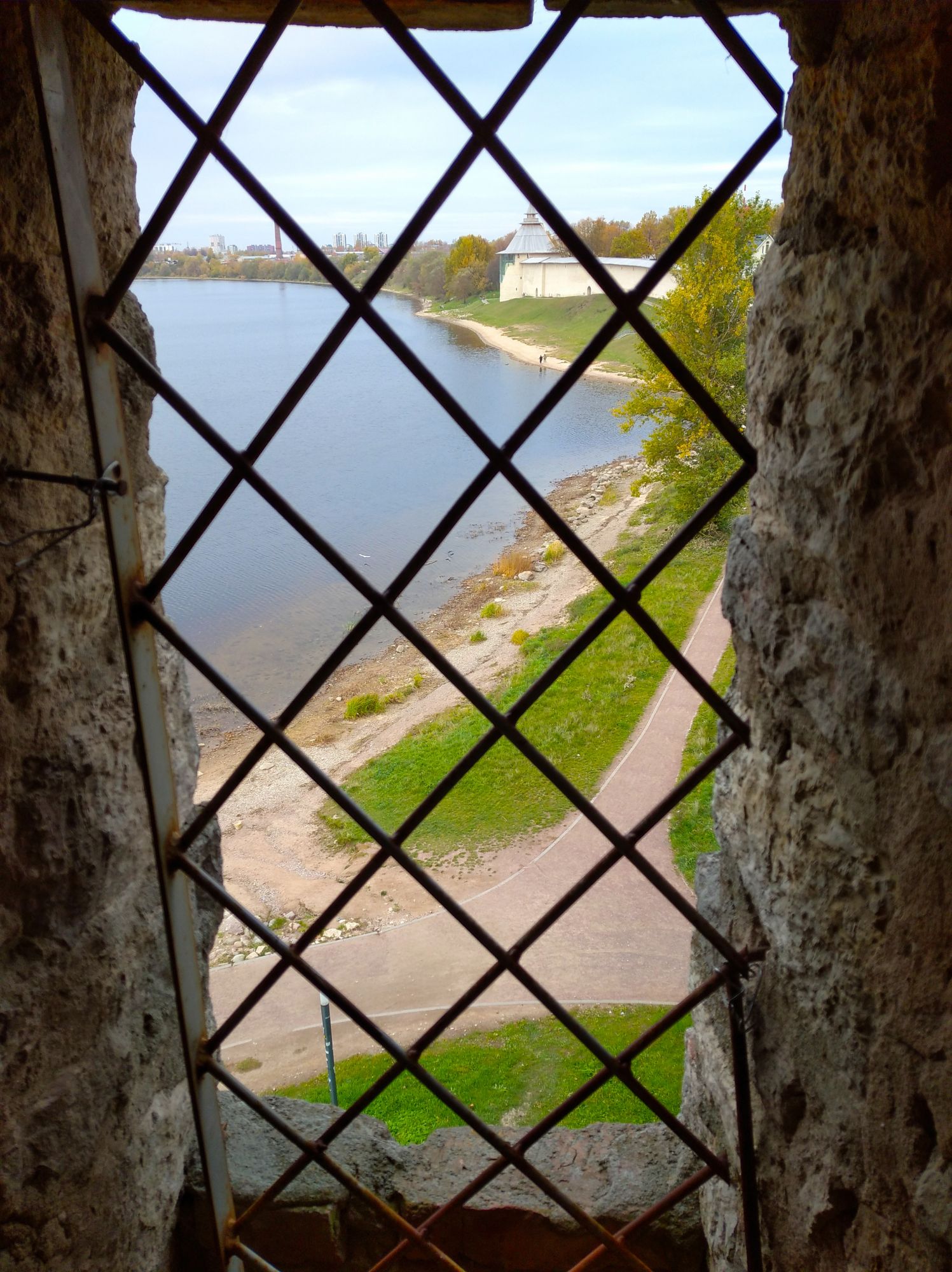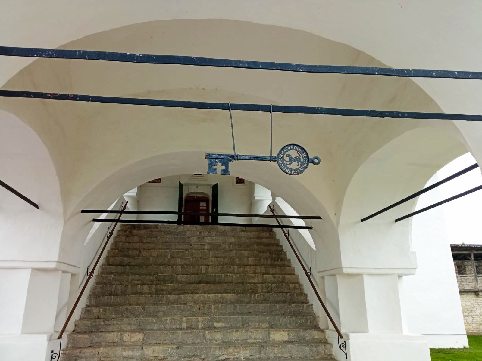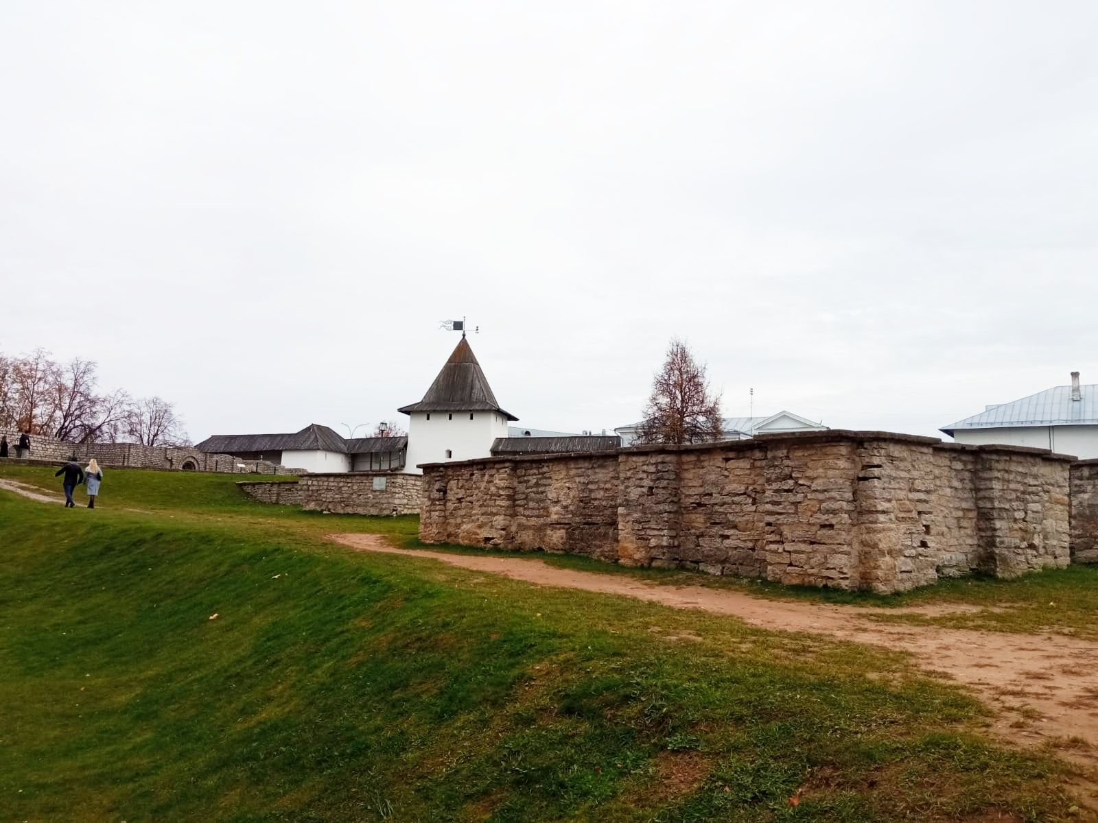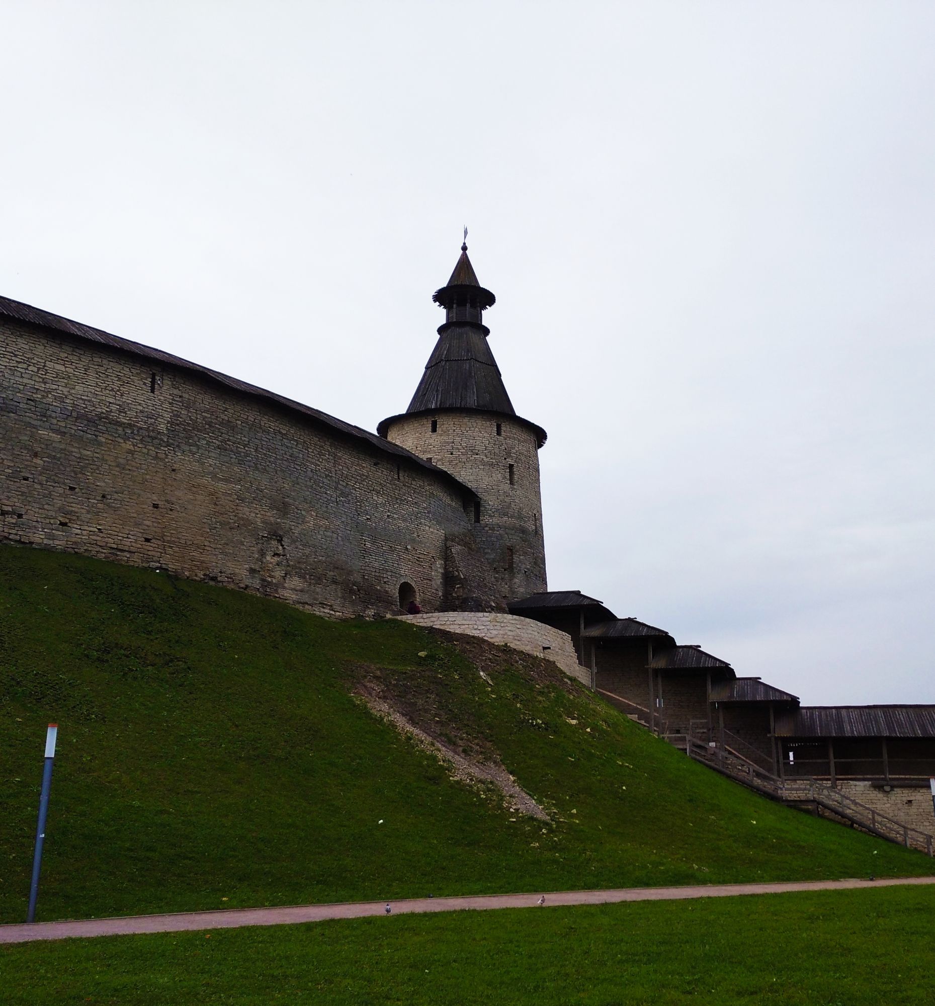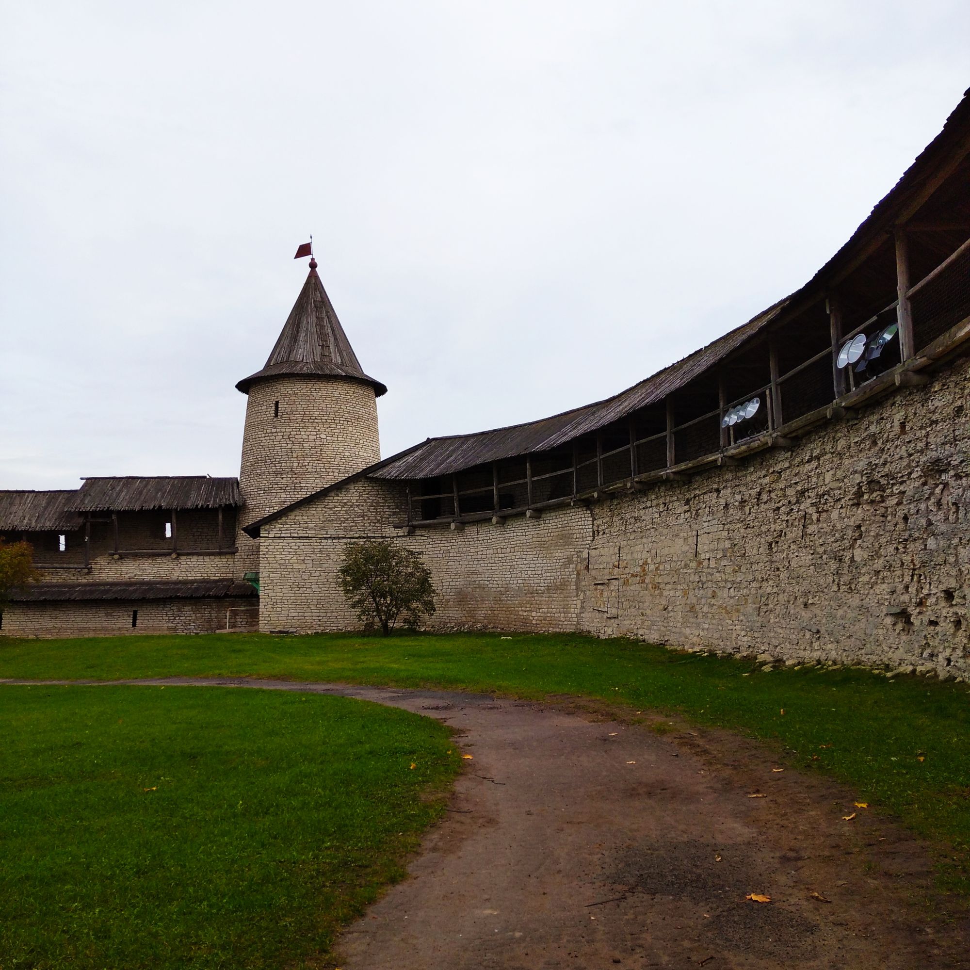 19 октября 2021 Третья часть - последняя. Уже о выходе. Или о входе.... Войти в Кром можно по захабу. Что это такое? Заха́б — фортификационное сооружение в средневековых крепостях, укрепление, защищавшее крепостные ворота. Слово “захаб” происходит от древне-русского “охабень”, что означает – “рукав”. Обычно это длинный, узкий проход между двумя крепостными стенами, ведущий от внешних ворот города к внутренним, действительно напоминающий рукав. Смысл захаба прост, как и все гениальное. Самое слабое место в любой стене — это дверь, а в любой крепости — ворота. Именно через ворота всегда пытался пробиться противник, по крайней мере пока артиллерия не развилась настолько, что могла разворотить каменную стену в несколько метров толщиной. Пробив одни ворота, противник устремлялся вперед на штурм крепости и тут оказывался пойманным в захабе. С обеих сторон защитники крепости стреляли в атакующих из луков, закидывали камнями, поливали смолой – короче, всячески портили жизни тем, кто решился прийти к ним с мечом. Но, пройдя по захабу мы еще из Крома не выходим. Мы попадаем в Довмонтов город. В пору вечевой республики (до 1510 г.) Довмонтов город считался центром церковного и административного управления Пскова и Псковской земли. Несмотря на небольшую территорию – около полутора гектаров – в XII-XVI вв. псковичи возводят из камня в Довмонтовом городе более 20 церковных и гражданских построек. К сожалению, храмы и административные здания Довмонтова города не сохранились до наших дней. Местные жители по-своему называют это место – «Псковские Помпеи», т.к. на этом месте остались лишь фундаменты и небольшие части стен. На передней стене Псковского Крома находится композиция, установленная в 1972 году в честь 730-летия победы Александра Невского на Чудском озере в 1242 году. Это Довмонтов меч со щитом. Псковский князь Довмонт прославился своей храбростью и военными победами, а его меч стал символом власти и отваги: его вручали каждому восходящему на псковский престол князю. Сейчас меч находится в Псковском музее, а на стене городской крепости висит его увеличенная копия. Под ним — гербы участников Ледового побоища: Пскова, Новгорода, Владимира, Твери и Переславля. На ветру меч и пластины звенят — тогда и нужно загадывать желание. Ветра не было, ничего не звенело, поэтому насчет загадывания желаний ничего сказать не могу. Ну и уже практически на выходе мы прошли мимо Поганкиных палат. Сейчас это музей, где можно увидеть старинную утварь, предметы кладов найденных на территории Пскова и его окрестностях. Псковичи рассказывают об одном бедном человеке, который занимался изготовлением бочек и внезапно разбогател. По одной из версий, в углу своей скромной лачуги ему удалось найти клад с несметными сокровищами. Правда, на Руси не одобряли такой способ получения богатства и называли его поганым. Так и приклеилась к человеку фамилия Поганкин, а его потомки стали купцами. Один из них - Сергей Поганкин — в XVII веке построил в Пскове палаты, называть их стали Поганкиными. Есть еще одно предание о происхождении фамилии. Однажды царь Иван Грозный приехал в Псков, разграбил его вместе со своей ратью и потребовал ещё денег у купцов. Тогда один из них поинтересовался, сколько же государю надобно, чтобы он успокоился. Грозный разгневался и воскликнул: «Ах ты, поганый! Да 