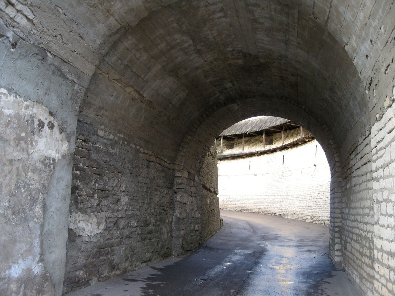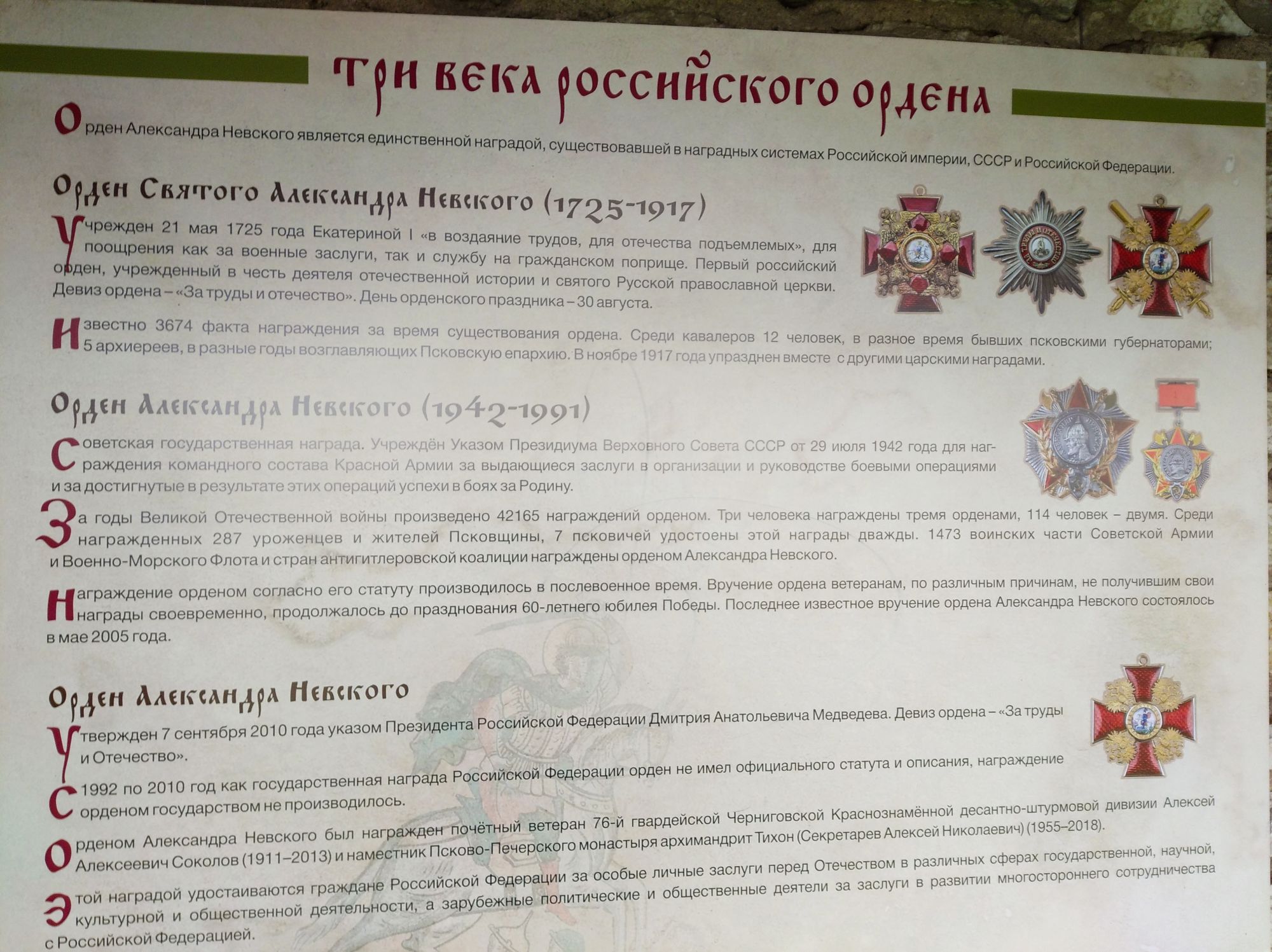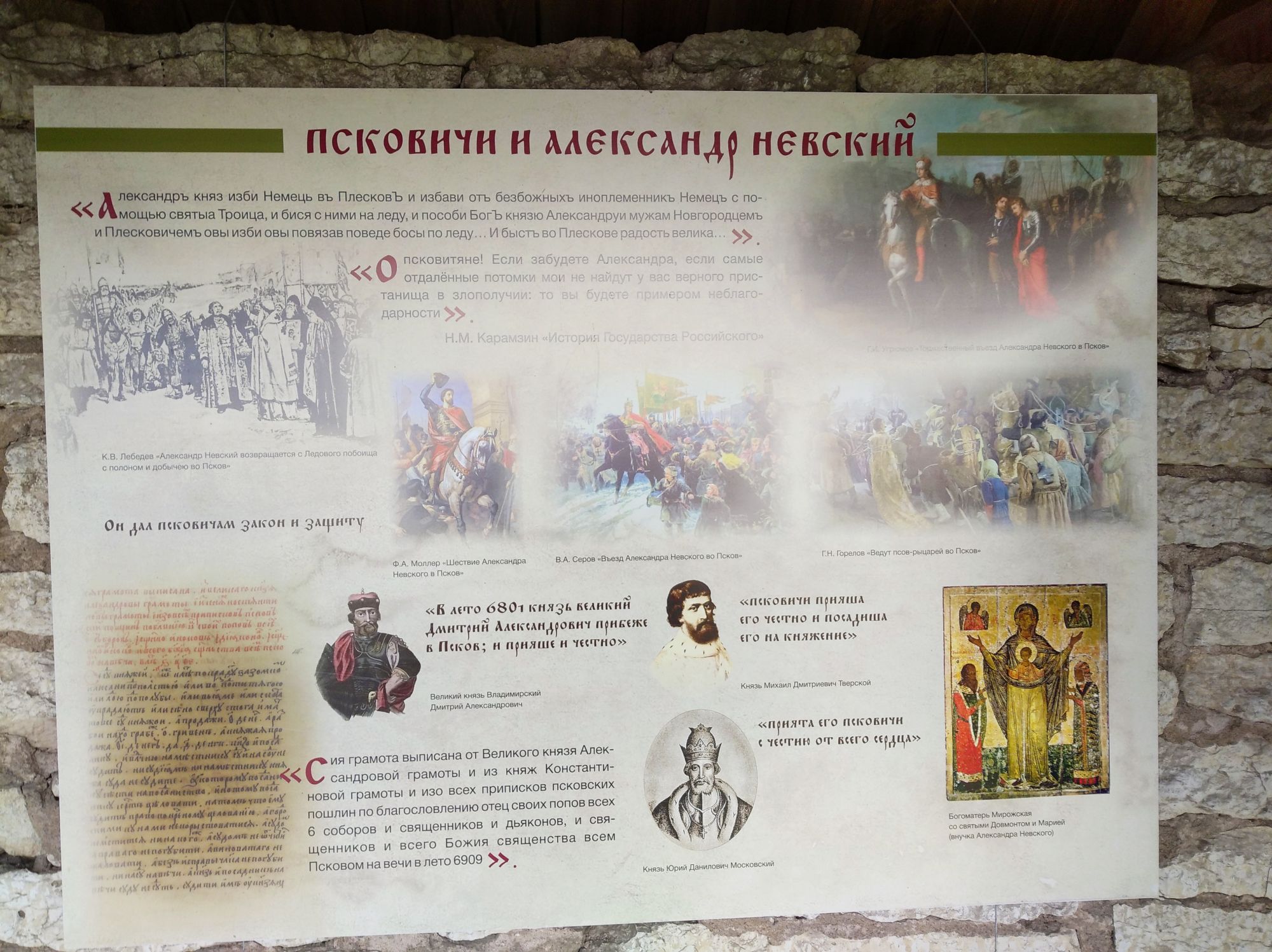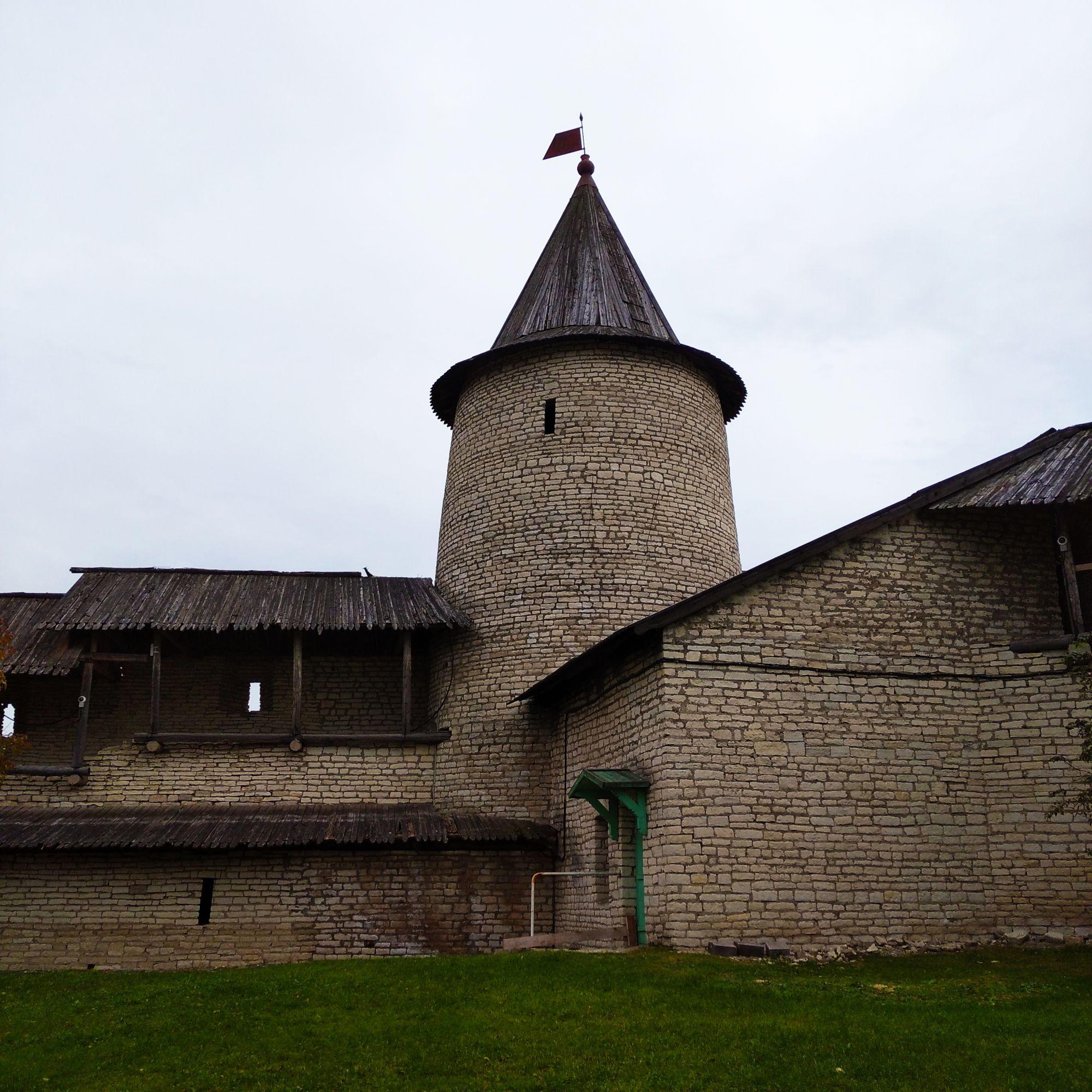 19 октября 2021 Третья часть - последняя. Уже о выходе. Или о входе.... Войти в Кром можно по захабу. Что это такое? Заха́б — фортификационное сооружение в средневековых крепостях, укрепление, защищавшее крепостные ворота. Слово “захаб” происходит от древне-русского “охабень”, что означает – “рукав”. Обычно это длинный, узкий проход между двумя крепостными стенами, ведущий от внешних ворот города к внутренним, действительно напоминающий рукав. Смысл захаба прост, как и все гениальное. Самое слабое место в любой стене — это дверь, а в любой крепости — ворота. Именно через ворота всегда пытался пробиться противник, по крайней мере пока артиллерия не развилась настолько, что могла разворотить каменную стену в несколько метров толщиной. Пробив одни ворота, противник устремлялся вперед на штурм крепости и тут оказывался пойманным в захабе. С обеих сторон защитники крепости стреляли в атакующих из луков, закидывали камнями, поливали смолой – короче, всячески портили жизни тем, кто решился прийти к ним с мечом. Но, пройдя по захабу мы еще из Крома не выходим. Мы попадаем в Довмонтов город. В пору вечевой республики (до 1510 г.) Довмонтов город считался центром церковного и административного управления Пскова и Псковской земли. Несмотря на небольшую территорию – около полутора гектаров – в XII-XVI вв. псковичи возводят из камня в Довмонтовом городе более 20 церковных и гражданских построек. К сожалению, храмы и административные здания Довмонтова города не сохранились до наших дней. Местные жители по-своему называют это место – «Псковские Помпеи», т.к. на этом месте остались лишь фундаменты и небольшие части стен. На передней стене Псковского Крома находится композиция, установленная в 1972 году в честь 730-летия победы Александра Невского на Чудском озере в 1242 году. Это Довмонтов меч со щитом. Псковский князь Довмонт прославился своей храбростью и военными победами, а его меч стал символом власти и отваги: его вручали каждому восходящему на псковский престол князю. Сейчас меч находится в Псковском музее, а на стене городской крепости висит его увеличенная копия. Под ним — гербы участников Ледового побоища: Пскова, Новгорода, Владимира, Твери и Переславля. На ветру меч и пластины звенят — тогда и нужно загадывать желание. Ветра не было, ничего не звенело, поэтому насчет загадывания желаний ничего сказать не могу. Ну и уже практически на выходе мы прошли мимо Поганкиных палат. Сейчас это музей, где можно увидеть старинную утварь, предметы кладов найденных на территории Пскова и его окрестностях. Псковичи рассказывают об одном бедном человеке, который занимался изготовлением бочек и внезапно разбогател. По одной из версий, в углу своей скромной лачуги ему удалось найти клад с несметными сокровищами. Правда, на Руси не одобряли такой способ получения богатства и называли его поганым. Так и приклеилась к человеку фамилия Поганкин, а его потомки стали купцами. Один из них - Сергей Поганкин — в XVII веке построил в Пскове палаты, называть их стали Поганкиными. Есть еще одно предание о происхождении фамилии. Однажды царь Иван Грозный приехал в Псков, разграбил его вместе со своей ратью и потребовал ещё денег у купцов. Тогда один из них поинтересовался, сколько же государю надобно, чтобы он успокоился. Грозный разгневался и воскликнул: «Ах ты, поганый! Да 