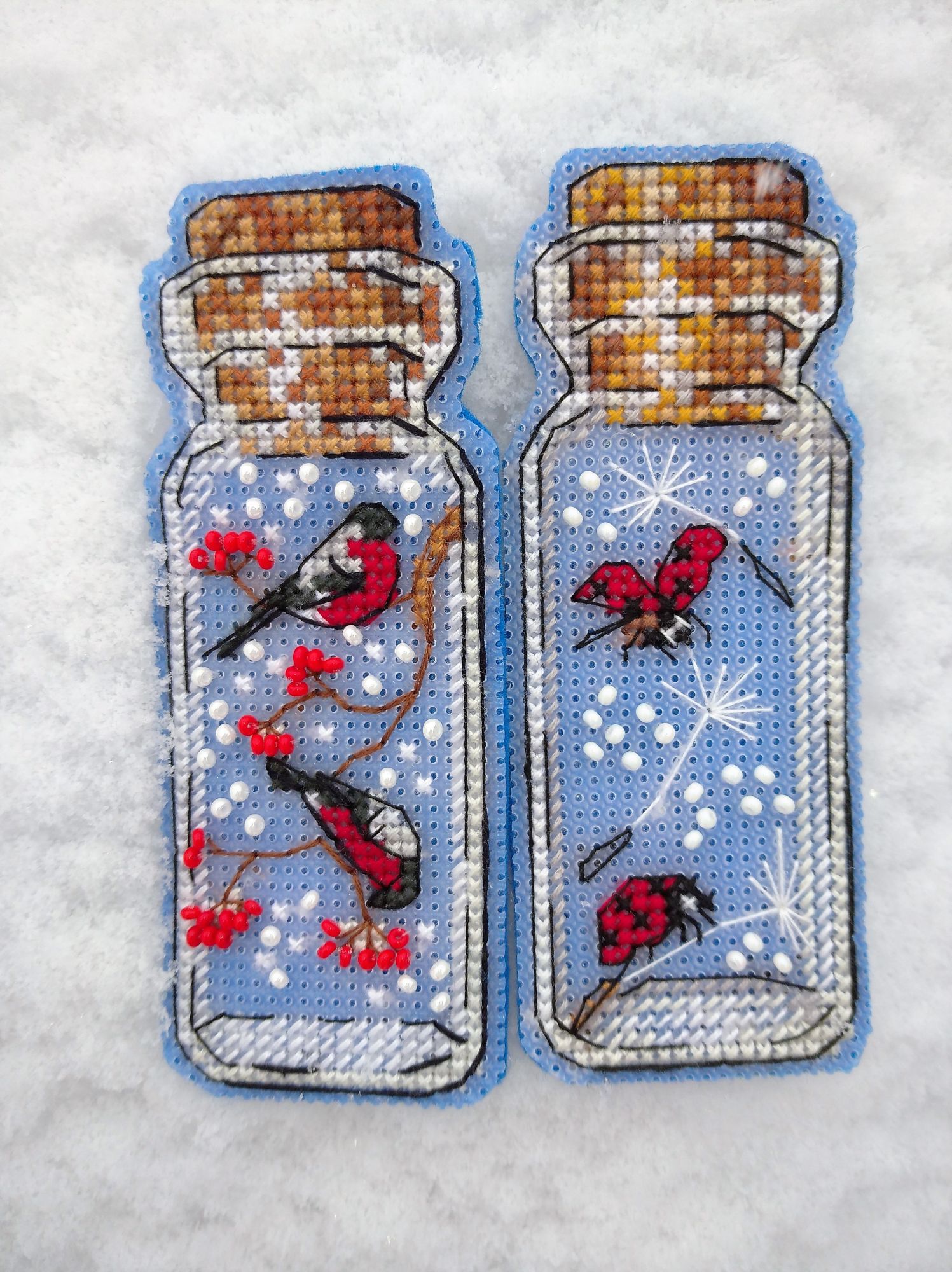 20 февраля 2023 Всем привет! Раз уже раздразнила всех рассказами о том, что закончила, тогда надо и показать. Итак, МП Студия Р-848, Советская ёлочная игрушка. Сосулька - я ее все-таки вырезала и сшила. Победила лень-матушку, потому что много у меня игрушек на пластике вышиты, но даже не вырезаны. Dimensions 65032, Радость каждого дня - закончен. Сам маяк вышился очень легко, а вот надпись далась мне сложнее, чем весь маяк. Я вообще надписи на вышивках не очень люблю. Сначала думала - ничего писать не буду. Но нет, без надписи верх маяка смотрится пустовато и некрасиво. Тогда решила - надписи быть, но на русском языке - зачем мне английский? Думаю - напишу название дизайна - "Радость каждого дня". Написала слово "Радость" и как-то не вдохновилась надписью - что за радость? Какого дня? Непонятно. Стала листать галерею в поисках идей и нашла надпись "Мечты сбываются". Её -то и решила в своём маяке вышить. Распорола "радость". Стала писать "Мечты сбываются" - простым шрифтом-бэком. Написала. Посмотрела. Не понравилось, как выглядит. Распорола. Стала искать шрифты покрасивее - у нас, просто в интернете. Кое-как из нескольких слепила. Теперь вроде бы нравится. Не нравится буква "Б", она не похожа немного. Но еще раз распарывать не стала, думаю - может пожирнее палочку сверху сделаю и выделится лучше? Нет, я не перфекционист, но вот с маяком получилось как-то так И еще один маленьких процесс - очередная бутылочка от Коноплич. Новый процесс - Коноплич Ирина #30395 "Снегири" - начат и завершен. Что-то в последнее время во мне поднимает голову излишняя придирчивость - не кажется ли вам, что слишком пестро получилось со снегом - фрузелки я заменила бисером и кажется, что переборщила - снегирей стало не видно. Или синий фетр тут не очень смотрится? Не пойму но что-то царапает меня в этой бутылке. Хотя у меня есть уже подобная бутылка с Божьими коровками и она мне нравится. В общем с трудом сдерживаюсь, чтобы не отодрать фетр и не пообрезать бисер. На сегодня это все, больше и показать нечего. всем добра и весны! malenta, TheSunniestDay, nogres и 29 других сказали спасибо Поделиться сообщением Ссылка на сообщение