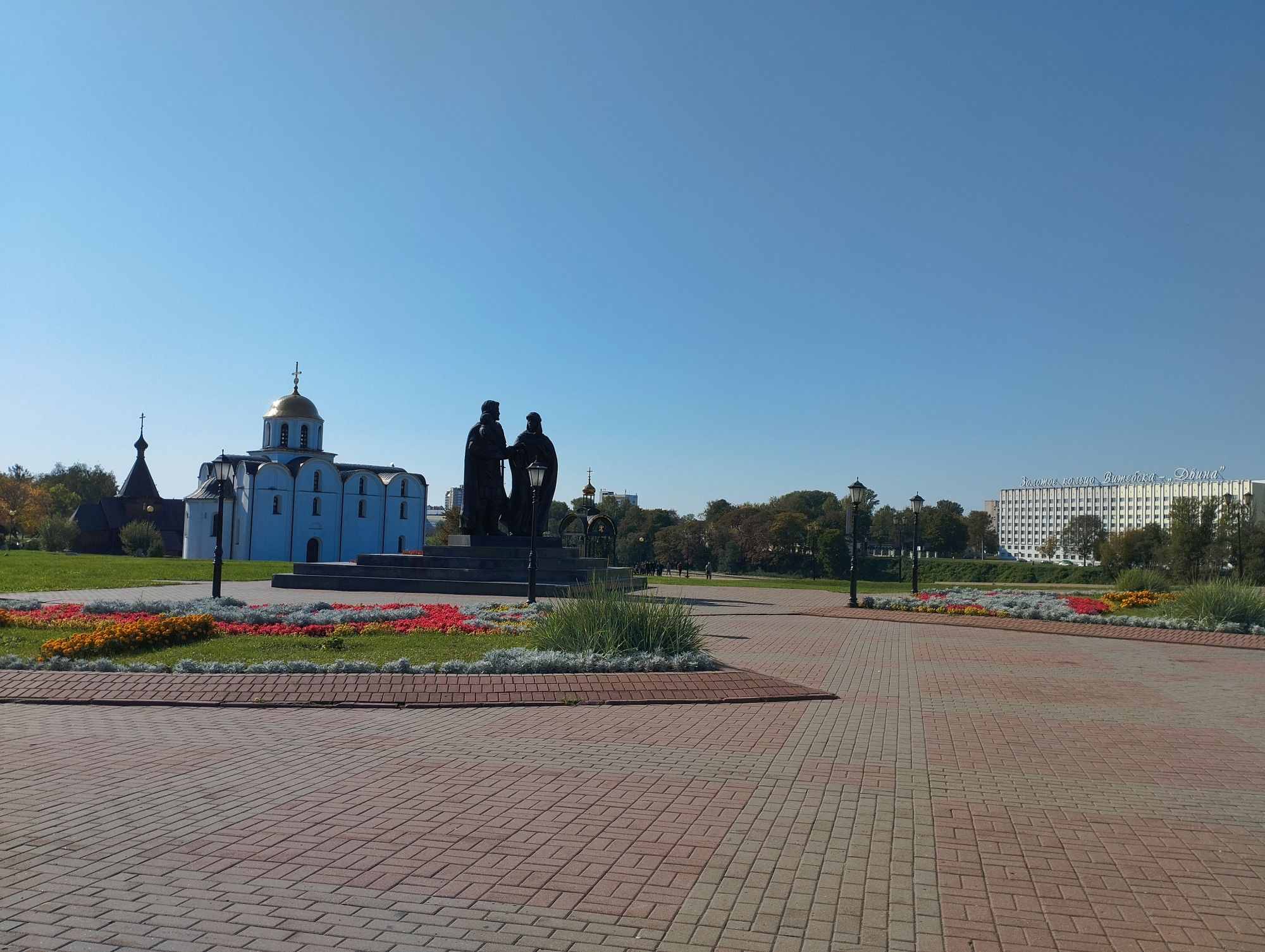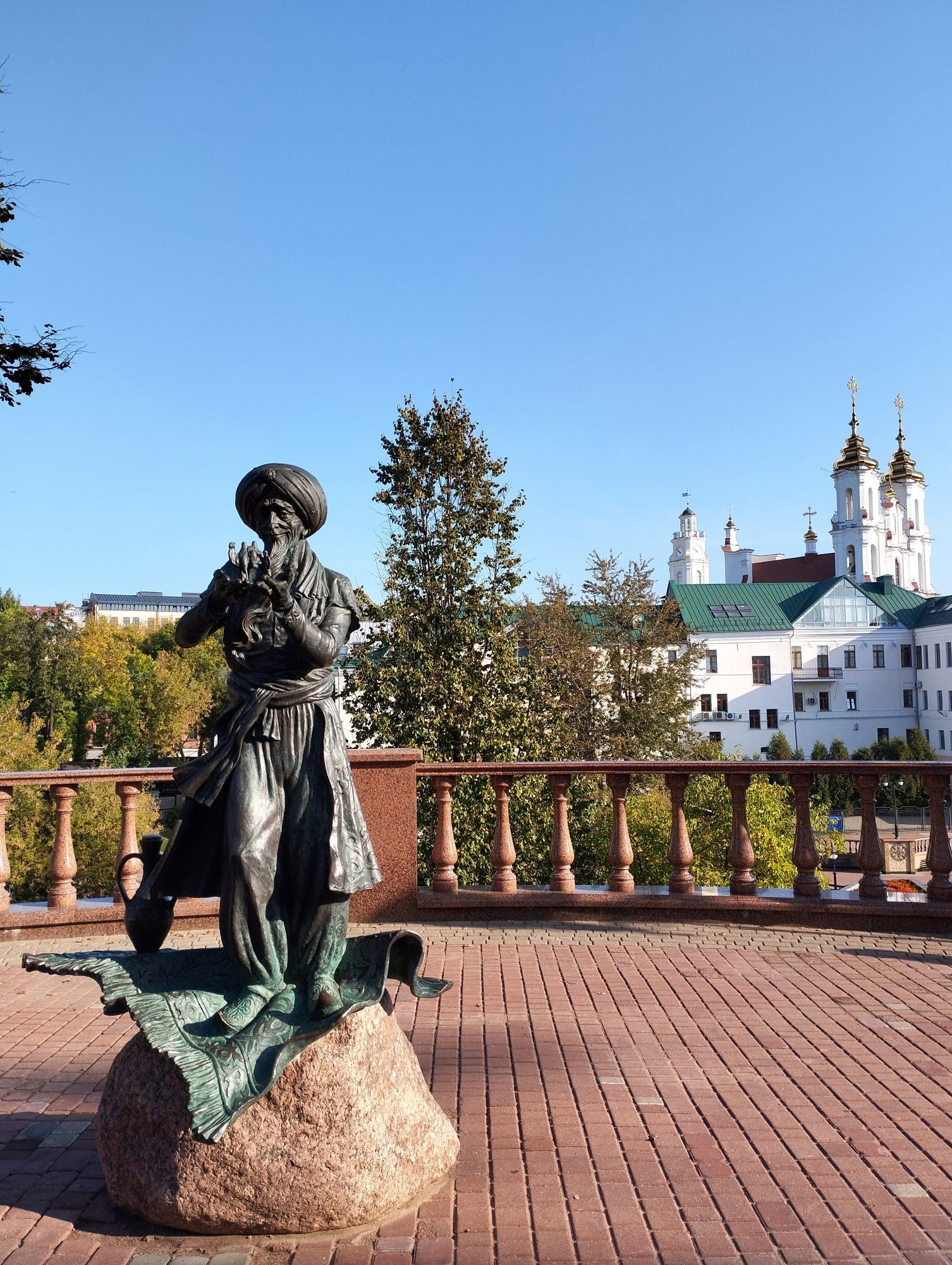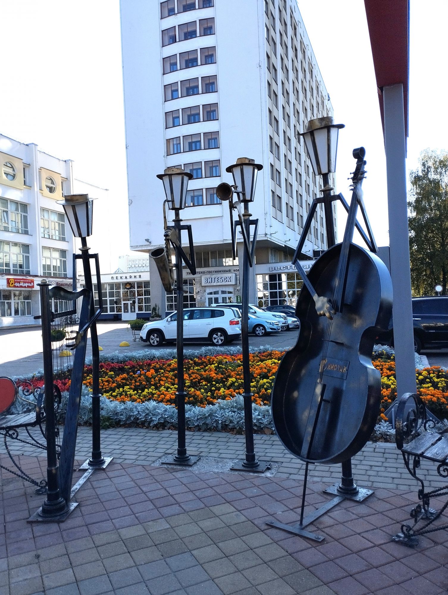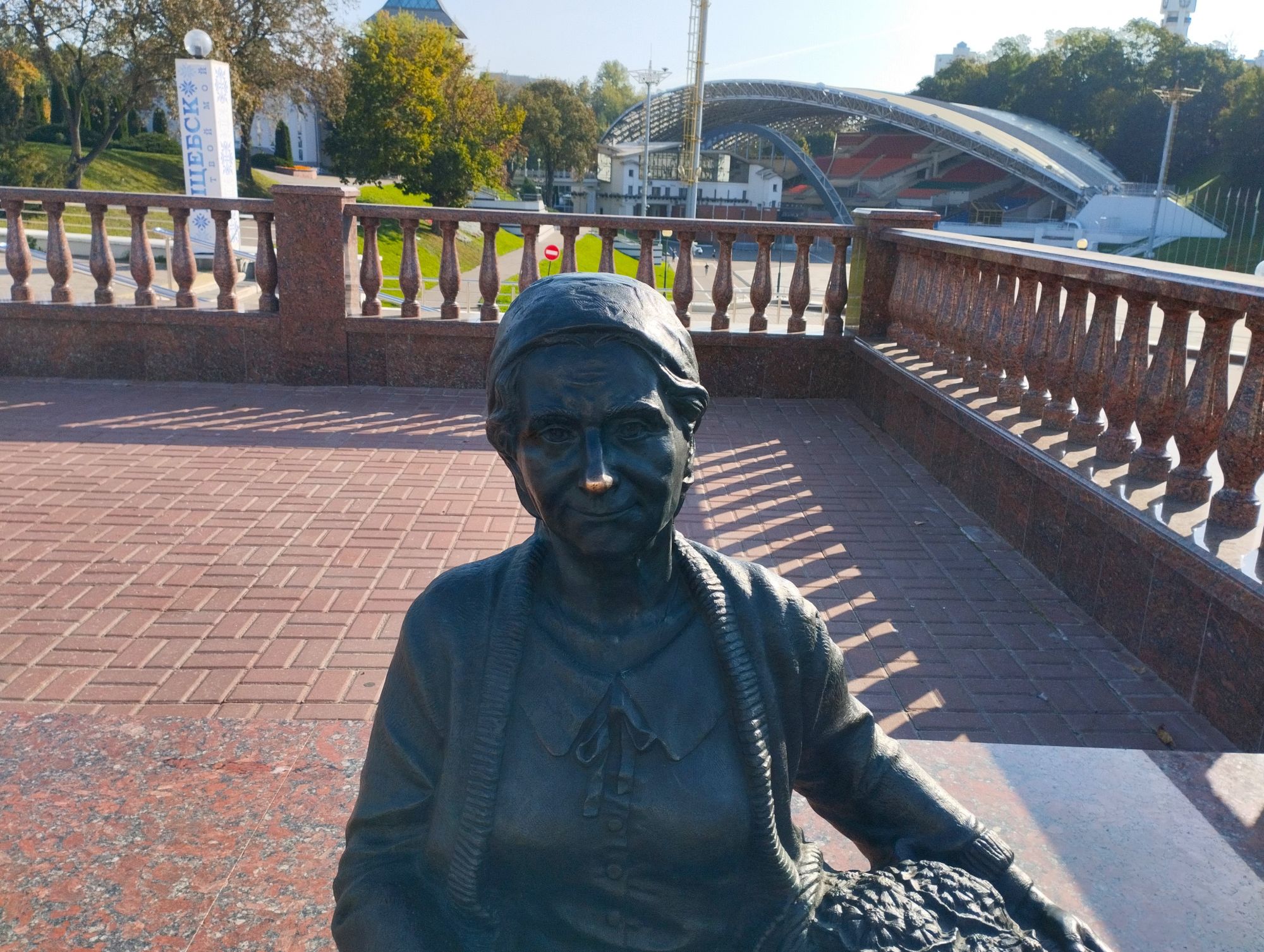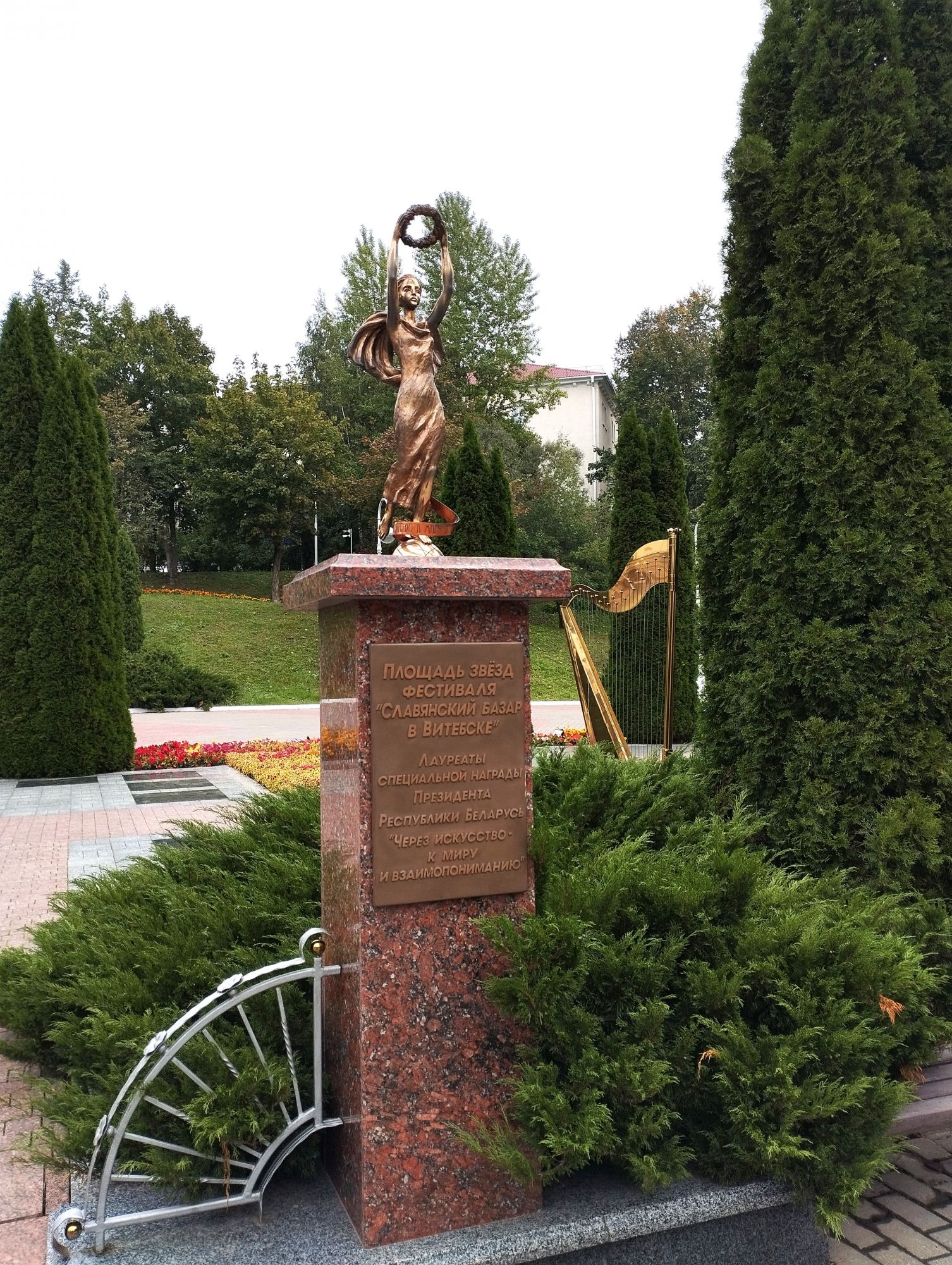 6 октября 2023 Из нашего окна в гостинице был виден Летний Амфитеатр, где проводится "Славянский базар", поэтому, немножко вздремнув, часиков до 11 (я-то и в поезде отрубилась, на верхней полке плацкарта, а муж мой спать в поездах не может) мы навострили лыжи на прогулку и начали знакомство с Витебском именно с этого места. Летний амфитеатр был построен всего за полгода для всесоюзного фестиваля польской песни в 1988 году. Фестиваль польской песни Витебск принимал дважды: в 1988 и 1990 годах. После развала СССР праздник польской песни приказал долго жить, но Витебск уже зарекомендовал себя как фестивальный город. Ждал праздника и готов был его принимать. Первый «Славянский базар в Витебске» состоялся в 1992 г. Тогда у его истоков стояли Беларусь, Россия и Украина, и мероприятие ставило целью ознакомить жителей и гостей белорусского города с творчеством славянских народов, в первую очередь – музыкальным. Через год фестиваль стал членом Международной федерации организаторов фестивалей, что позволило ему расширить географию участников: к площадке присоединились представители из Словакии, Кыргызстана, Литвы, Турции, Болгарии и Югославии. С 1995 г. «Славянский базар» стал называться Международным фестивалем искусств и начал проводиться под покровительством президента Беларуси, который впервые его посетил. География участия расширилась: на фестиваль приехали представители Кипра, Нидерландов, Греции, Узбекистана и Швейцарии. Через год «Славянский базар» стал транслироваться по телевидению, а в 1998 г. стал культурологическим проектом Союзного государства. Проводится Славянский базар до сих пор. Начали мы свой путь к Амфитеатру от гостиницы мимо вот такого глобуса и фортепиано Туман к тому времени стал рассасываться, но все равно было мозгло, я опасалась, что прогноз погоды, который обещал три дня солнечных и теплых, меня обманул. Но, хотя первые фото в этот день получились мрачноватыми, потом погода расстоялась и солнце засветило вовсю. Потом мы дошли до скульптуры уличного клоуна или бродячего музыканта - я встречала два названия. По приметам, если дотронуться до гармошки клоуна, то хорошее настроение не покинет на протяжении дня. А для того, чтобы сопутствовала удача целый день, обязательно нужно поздороваться за лапку с собачкой. Еще говорят, будто, если подержаться за деньги, которые выглядывают из заднего кармана музыканта, будет преследовать финансовая удача. А нос клоуна, если к нему дотронуться, обязательно навлечет на вас любовь. Следующим был "Духовской круглик" Это не древнее здание, а художественная реконструкция типовой башни XIV века., построенное в 2007 году. Сейчас там музей. И нет, в музей мы не заходили... Еще встретили вот такую вот инсталляцию. Это конь с каретой. Ну и, наконец, спустились к Амфитеатру. Сам зал закрыт, но вокруг можно походить, все очень чисто и ухоженно. Акустика шикарная! Откуда я это знаю? Вороны каркают и их карканье разносится на много метров вокруг, резонируя Там же - Аллея звезд Вот мое личное мнение - смотрится странно. Как будто могилы. В общем, мне не понравилось. Сделали бы звездочки что ли, как в Голливуде.. А так стремно. Еще я увидела контрабас и арфу, а еще фигурку Ники и павлина. Что мне понравилось в Витебске - это много зелени. Вот, вроде бы Амфитеатр - туристическое место, но ты его проходишь и начинается рощ