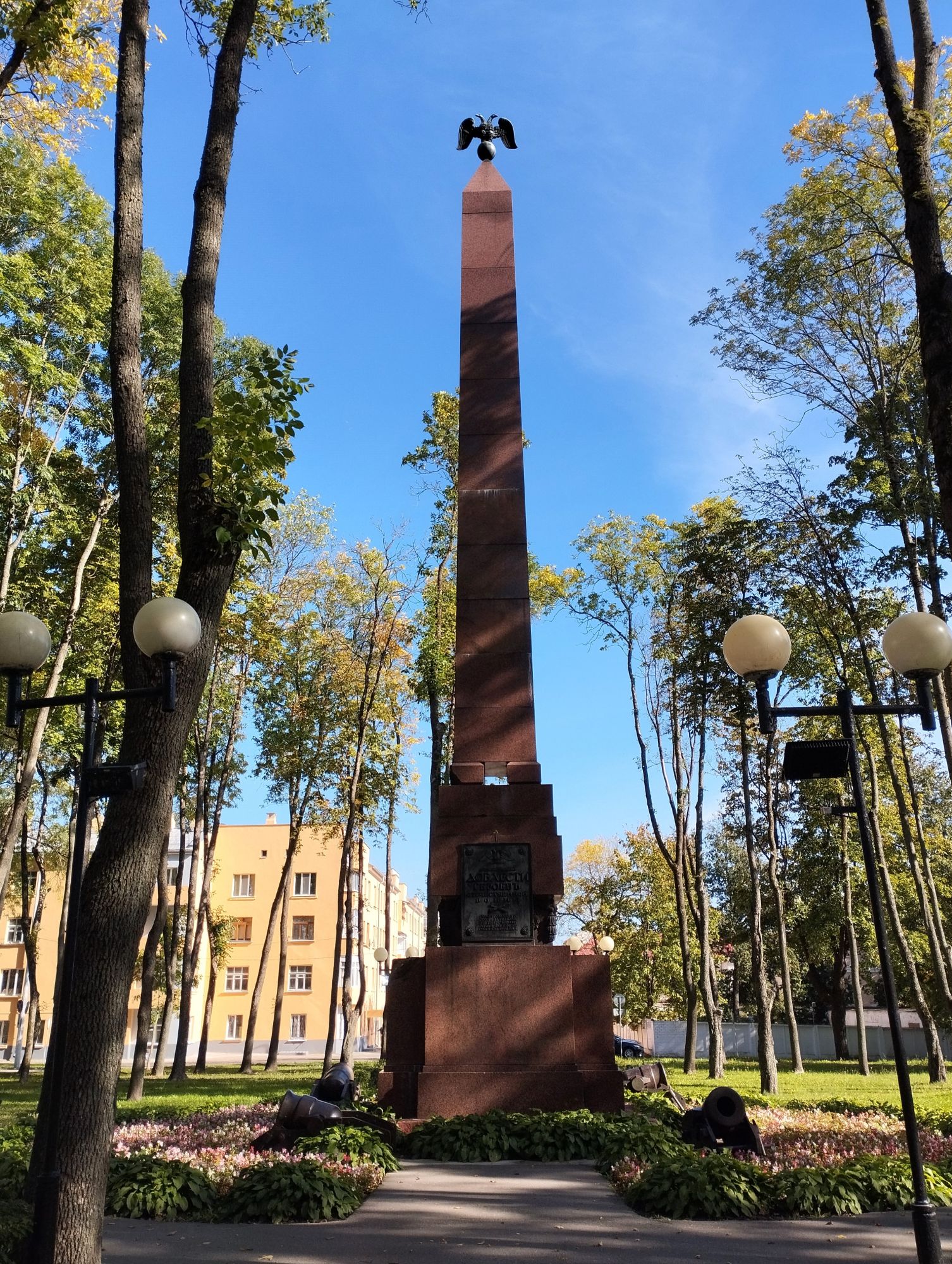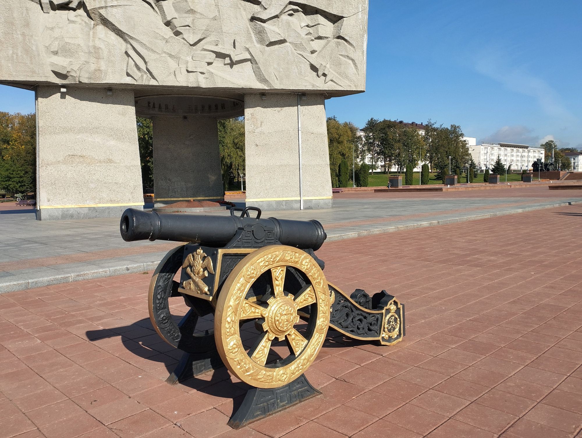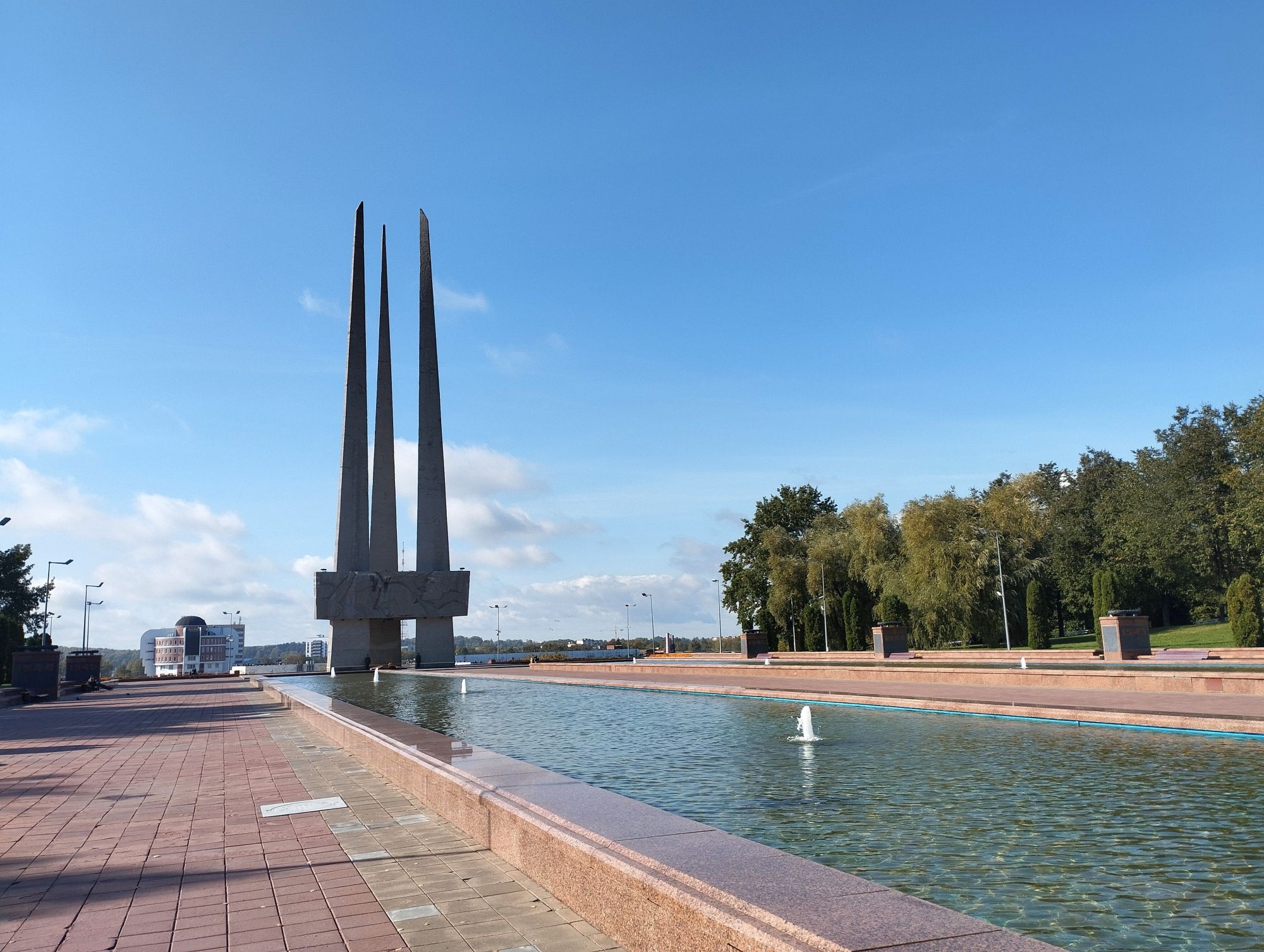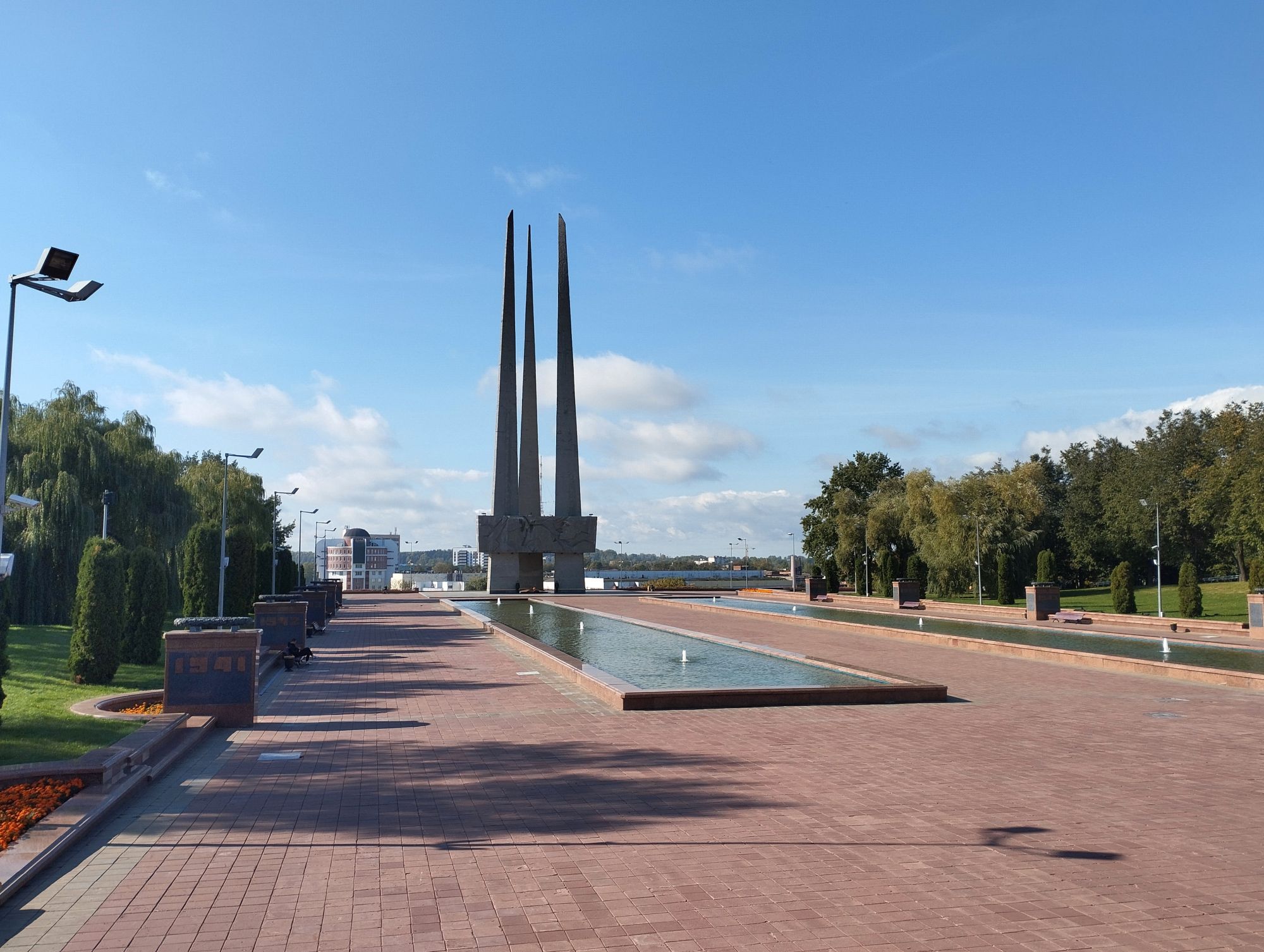 6 октября 2023 Описав круг возле Амфитеатра мы пошли по набережной к новой локации, которую хотел посмотреть мой муж - Площади Победы. И опять - зелень, зелень, зелень.... Шли, любуясь красивыми видами. Дошли вот до такого памятника. Это памятник воинам - десантникам. Молодой парень - собирательный образ десантника, рядом — символический купол парашюта, на котором располагаются эмблема ВДВ и барельефы генералов Ивана Лисова и Героя Советского Союза Василия Маргелова. Прокатились на колесе обозрения и посмотрели на Витебск сверху. Фото мутноватые, и их мало, потому что сейчас все ж помешаны на безопасности и колеса обозрения очень скучные - тебе его открывают, закрывают, все вокруг закрыто стеклами... Эх, то ли в моем детстве - вскакиваешь в дверцу, сам закрываешь за собой защелку (очень сомнительную и хлипкую, тебя обдувает ветерок, а еще в центре кабинки колесо, которое можно было покрутить и кабинка начиналась крутиться тоже... Романтика!!!!! И вот, наконец, мы дошли до того, чего хотели. Большое уважение и поклон беларусам за память. Они помнят, как страна пострадала от фашистов, бережно хранят память о подвиге и этих кровопролитных годах. Все чисто, ухожено, отшлифовано. Мой муж нафоткался за техникой, я как-то желания с таким фотографироваться не испытываю - они тянут в себе негативную энергетику, ИМХО... Больше мне импонировали пушки войны 1812 года. Наверное дело в том, что Великую Отечественную войну мы пережили - пусть не мы, но бабушки и дедушки, на рассказах которых я, например, выросла и все четко представляю. А война 1812 года уже не ощущается как война, скорее как страница учебника истории или художественной книги. Ну и, не побоюсь этого слова - главный памятник Витебска - мемориальный комплекс "Освободителям Витебска - советским воинам, партизанам и подпольщикам". Он отличается не только монументальностью, величием и красотой, но и богатой духовной основой, трагическая суть которой своими корнями уходит в кровавые годы Великой Отечественной войны. 1974 году. Тогда на главной городской площади Победы возвысился символичный мемориальный комплекс "Три штыка" (как я поняла, это не то чтобы официальное название, а народное). Основной монумент представляет собой 3 трапециевидных пилона-обелиска высотой 56 метров, сужающихся кверху, объединенных на высоте 5 метров трехгранным монолитным фризом. На внутренних гранях обелиска – мемориальные надписи, а скульптурные изображения на фризе отражают три главных темы памятника: «Воины», «Партизаны» и «Подпольщики». Именно этим трем силам, одержавшим победу в Великой Отечественной войне, посвящен этот монумент. Под ним горит Вечный огонь. К главному монументу ведут два бассейна длиной по 85 метров и шириной 10 метров с четырьмя бурлящими струями в каждом. Они стали символом слёз, пролитых за годы войны. И два памятника - один символизирует начало войны, уход на фронт и зарождение партизанского движения. Второй - наступление советской армии и освобождение от власти немецко-фашистких захватчиков. На самой площади стоит длинный 9-этажный дом. Сверху надпись «Подвиг советского народа бессмертен!». Я удивилась, узнав, что это обычный жилой дом. От площади мы направились обратно к гостинице, потому что скоро сказка сказывается, но не скоро дело делается, уже было часов пять. Шли вот по такой аллейке Над ней висели