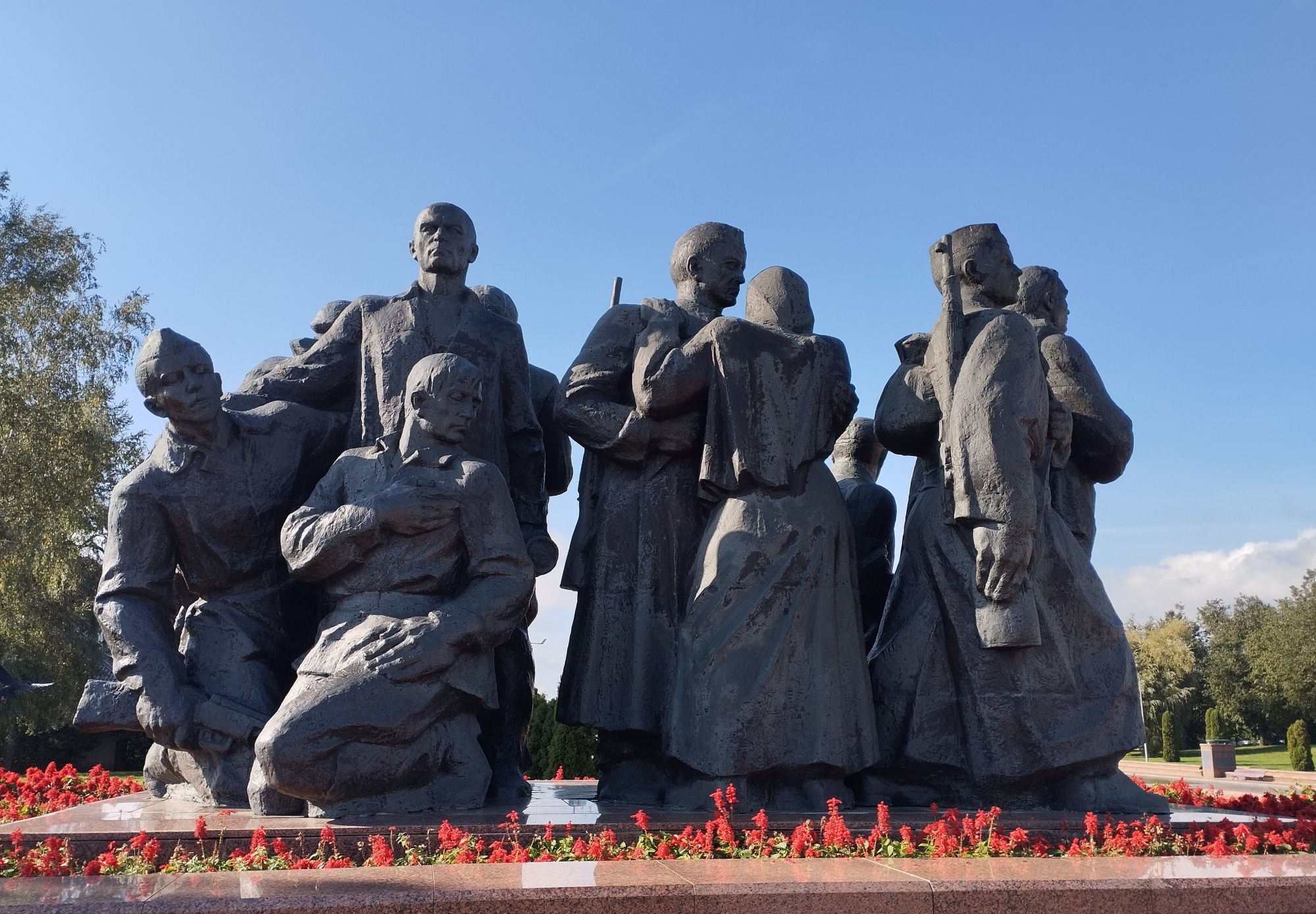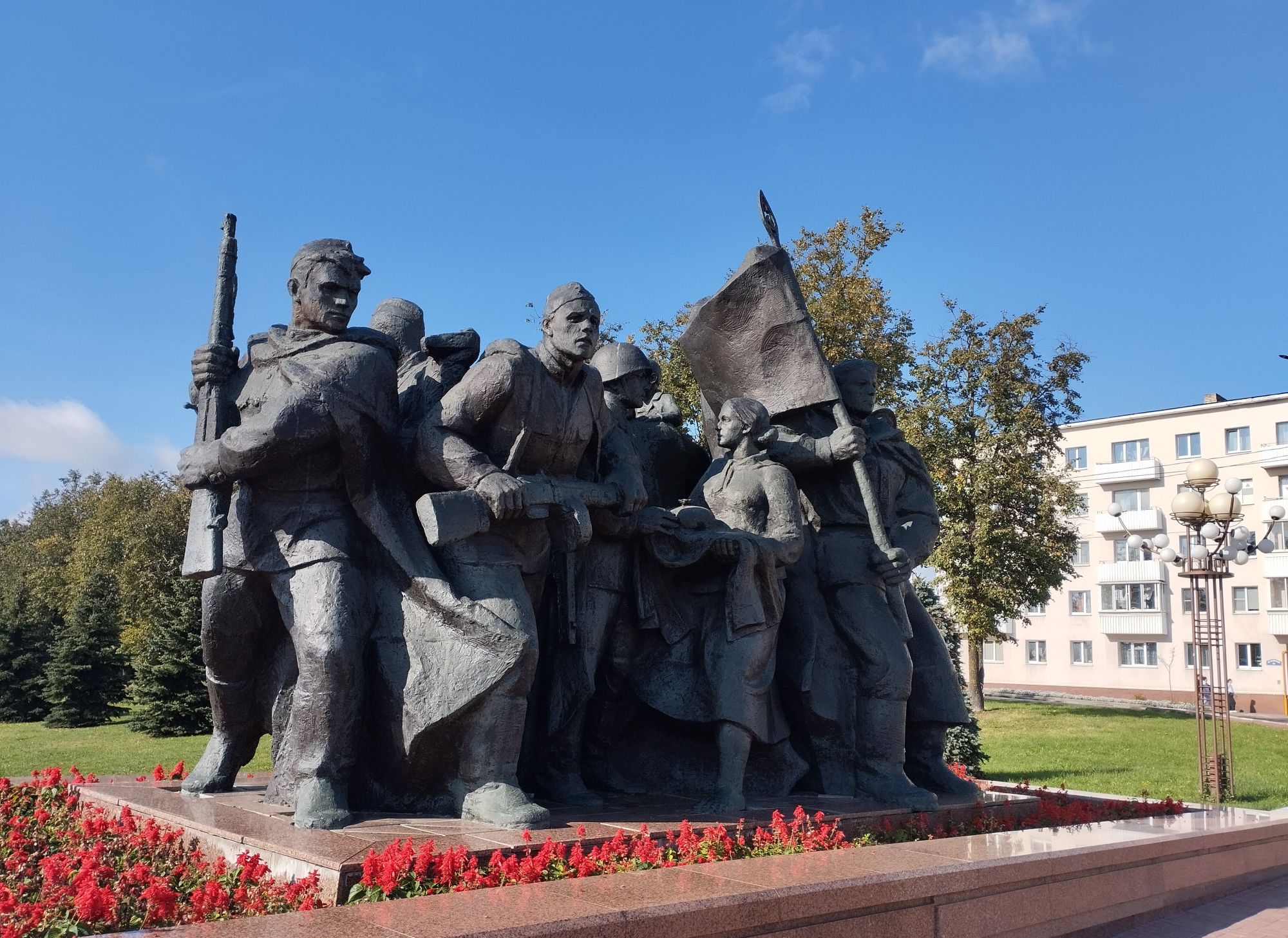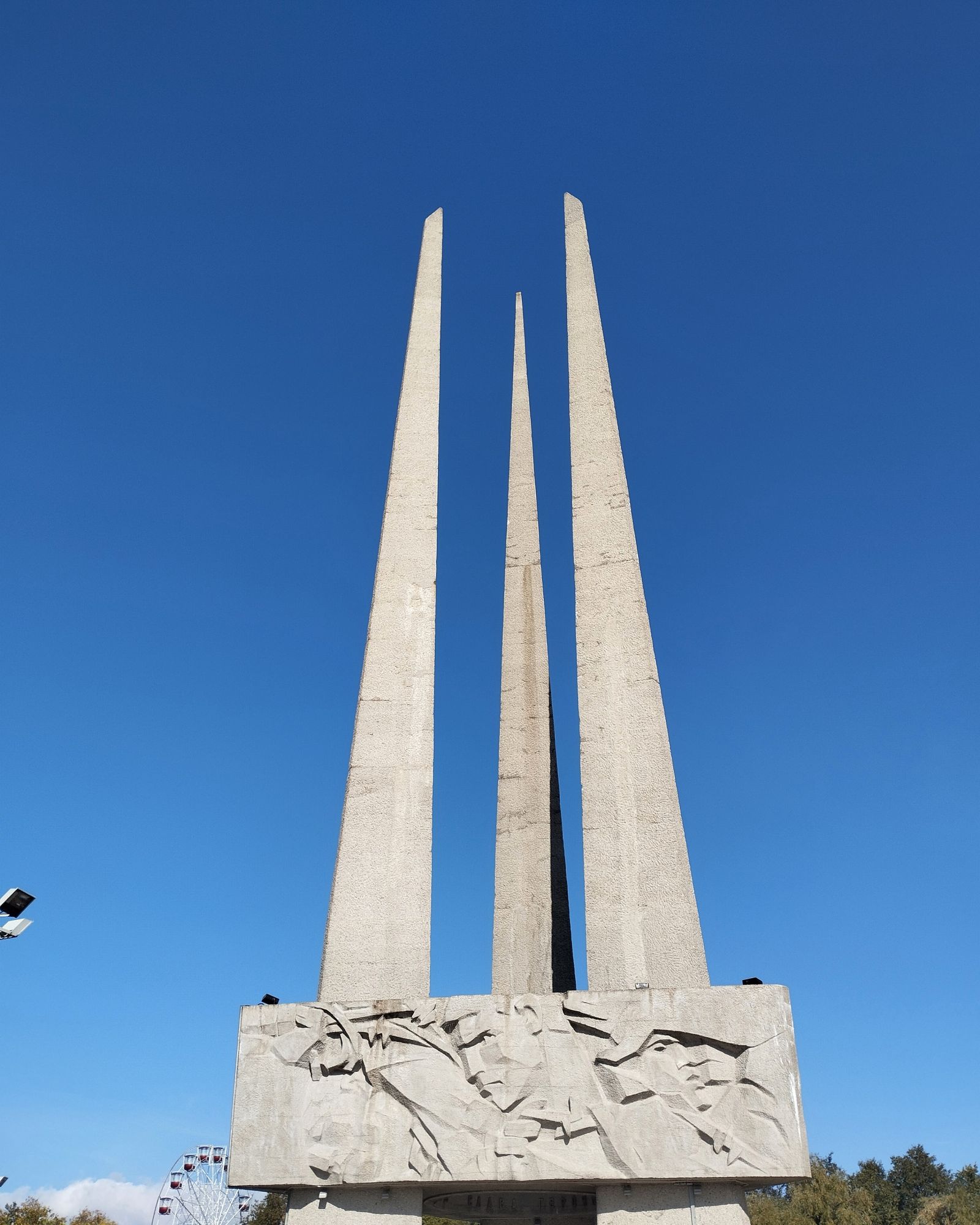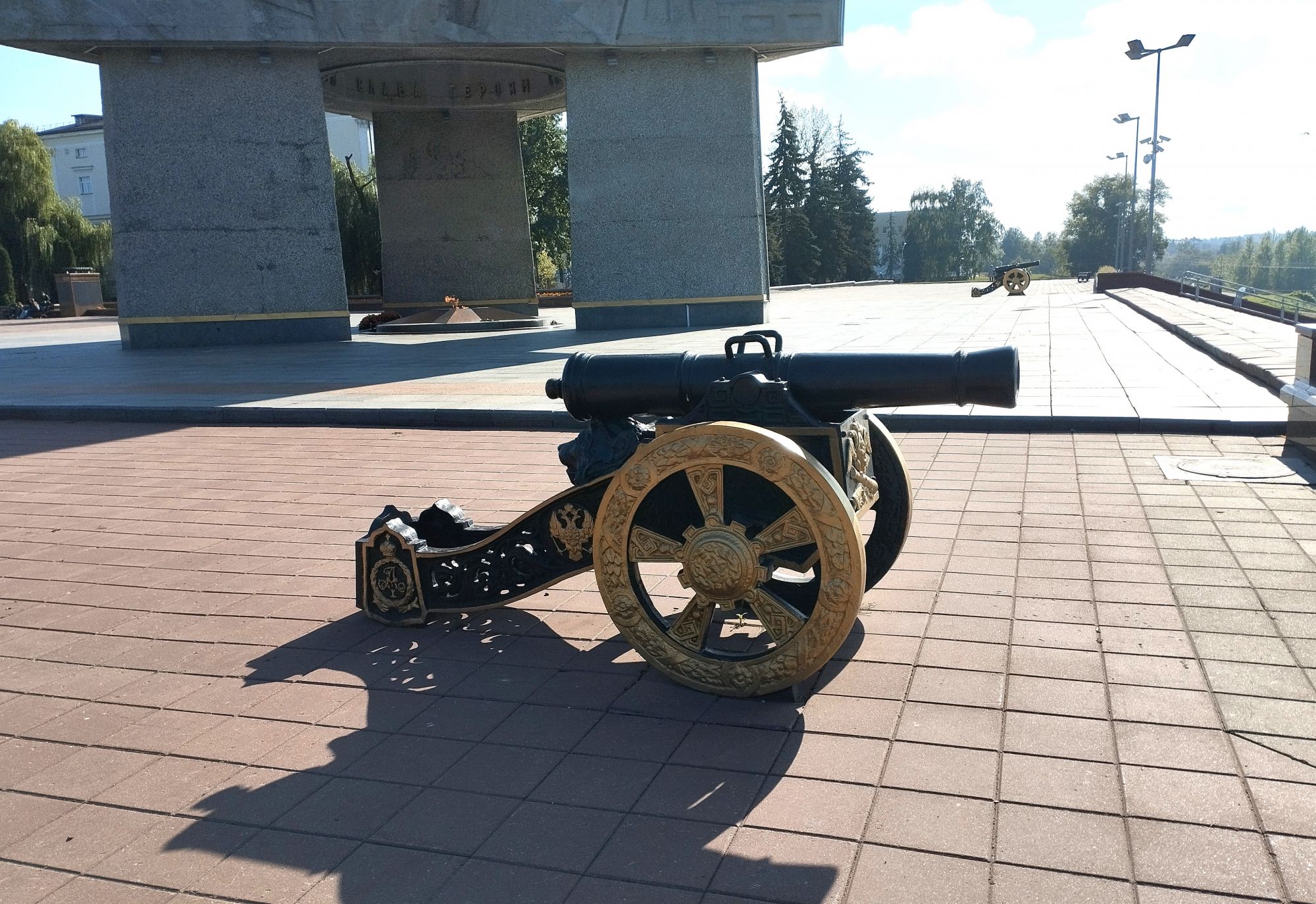 6 октября 2023 Описав круг возле Амфитеатра мы пошли по набережной к новой локации, которую хотел посмотреть мой муж - Площади Победы. И опять - зелень, зелень, зелень.... Шли, любуясь красивыми видами. Дошли вот до такого памятника. Это памятник воинам - десантникам. Молодой парень - собирательный образ десантника, рядом — символический купол парашюта, на котором располагаются эмблема ВДВ и барельефы генералов Ивана Лисова и Героя Советского Союза Василия Маргелова. Прокатились на колесе обозрения и посмотрели на Витебск сверху. Фото мутноватые, и их мало, потому что сейчас все ж помешаны на безопасности и колеса обозрения очень скучные - тебе его открывают, закрывают, все вокруг закрыто стеклами... Эх, то ли в моем детстве - вскакиваешь в дверцу, сам закрываешь за собой защелку (очень сомнительную и хлипкую, тебя обдувает ветерок, а еще в центре кабинки колесо, которое можно было покрутить и кабинка начиналась крутиться тоже... Романтика!!!!! И вот, наконец, мы дошли до того, чего хотели. Большое уважение и поклон беларусам за память. Они помнят, как страна пострадала от фашистов, бережно хранят память о подвиге и этих кровопролитных годах. Все чисто, ухожено, отшлифовано. Мой муж нафоткался за техникой, я как-то желания с таким фотографироваться не испытываю - они тянут в себе негативную энергетику, ИМХО... Больше мне импонировали пушки войны 1812 года. Наверное дело в том, что Великую Отечественную войну мы пережили - пусть не мы, но бабушки и дедушки, на рассказах которых я, например, выросла и все четко представляю. А война 1812 года уже не ощущается как война, скорее как страница учебника истории или художественной книги. Ну и, не побоюсь этого слова - главный памятник Витебска - мемориальный комплекс "Освободителям Витебска - советским воинам, партизанам и подпольщикам". Он отличается не только монументальностью, величием и красотой, но и богатой духовной основой, трагическая суть которой своими корнями уходит в кровавые годы Великой Отечественной войны. 1974 году. Тогда на главной городской площади Победы возвысился символичный мемориальный комплекс "Три штыка" (как я поняла, это не то чтобы официальное название, а народное). Основной монумент представляет собой 3 трапециевидных пилона-обелиска высотой 56 метров, сужающихся кверху, объединенных на высоте 5 метров трехгранным монолитным фризом. На внутренних гранях обелиска – мемориальные надписи, а скульптурные изображения на фризе отражают три главных темы памятника: «Воины», «Партизаны» и «Подпольщики». Именно этим трем силам, одержавшим победу в Великой Отечественной войне, посвящен этот монумент. Под ним горит Вечный огонь. К главному монументу ведут два бассейна длиной по 85 метров и шириной 10 метров с четырьмя бурлящими струями в каждом. Они стали символом слёз, пролитых за годы войны. И два памятника - один символизирует начало войны, уход на фронт и зарождение партизанского движения. Второй - наступление советской армии и освобождение от власти немецко-фашистких захватчиков. На самой площади стоит длинный 9-этажный дом. Сверху надпись «Подвиг советского народа бессмертен!». Я удивилась, узнав, что это обычный жилой дом. От площади мы направились обратно к гостинице, потому что скоро сказка сказывается, но не скоро дело делается, уже было часов пять. Шли вот по такой аллейке Над ней висели
