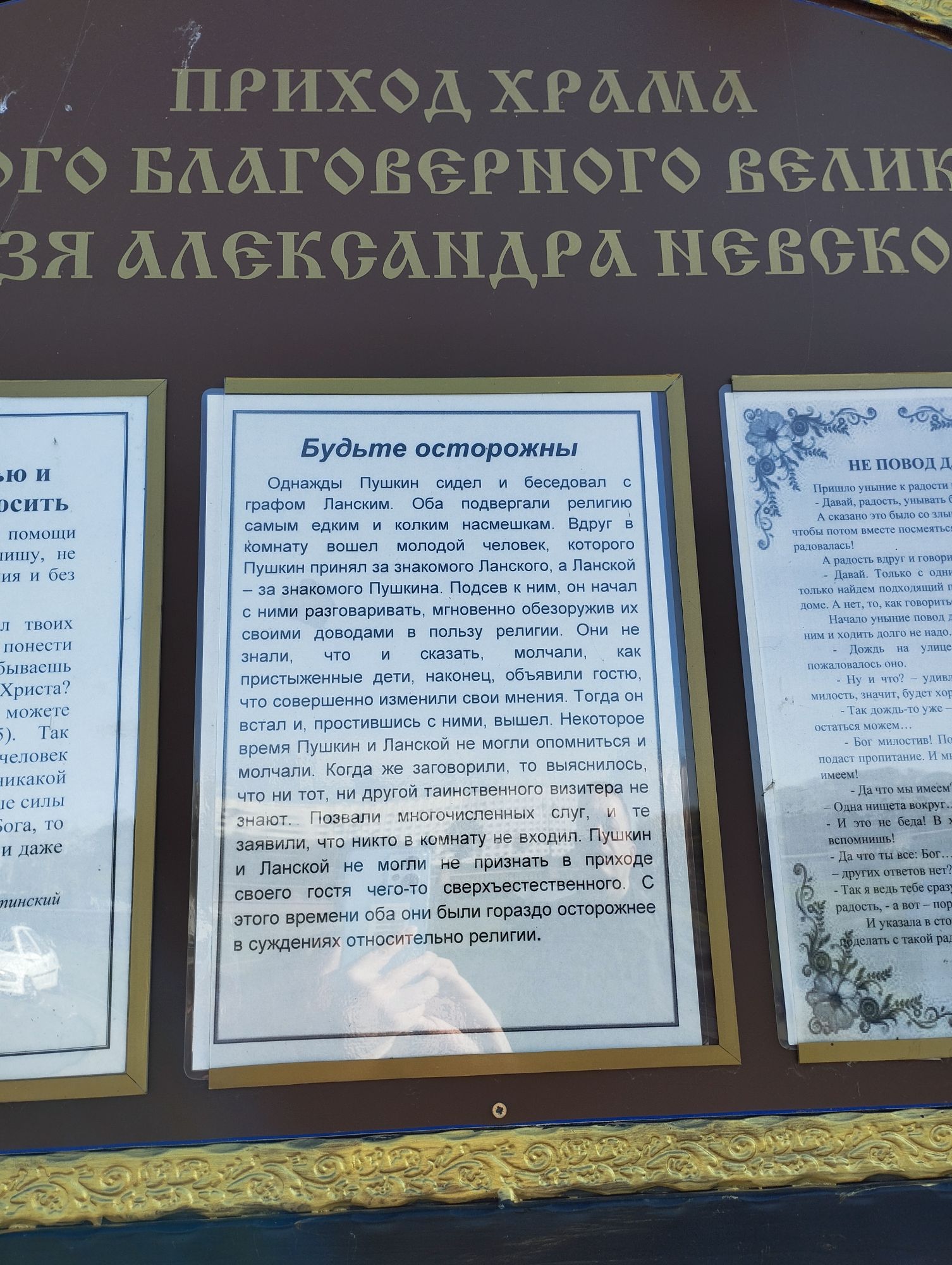 6 октября 2023 Всем привет! Ну что же - сегодня будет невышивальный отчет. А точнее - отчет о моем отпуске. Странно, но уходя на 5 дней в отпуск в пятницу я сказала, что буду сидеть дома и клеить обои. А в понедельник в шесть утра я стояла на вокзале в другой стране.. Сразу скажу, что это фото нашего отбытия. Как я уже писала выше - приехали мы в 5.50 и город покрывал плотный молочный туман. "К хорошему отпуску" - подумала я, потому что туманы очень люблю.. Как вы уже поняли, направились мы в Беларусь, город Витебск. Были мы там всего три дня, но они были активными и насыщенными, хотя из Витебска мы не выезжали. Нет, была мысль сгонять в Полоцк на какую-нибудь экскурсию, но стареем, видимо, уже не хочется вставать рано утром, целый день галопом бегать с группой, а потом поздно возвращаться и валиться в кровать.. Поэтому решили хорошенько прошерстить для начала этот город, а потом, если что, собраться в Минск, Полоцк или Брест. В следующий раз. остановились мы в самом центре, в гостинице "Витебск". Если вы тоже собираетесь в этот город и не очень придирчивы - искренне советую эту гостиницу. Да, она советская, там деревянные двери в номера со стеклянными ручками, никаких карт-ключей, ванна вместо душевой кабины и даже телевизор не плоский - но разве за этим большинство из нас едет в путешествия, особенно на несколько дней? Вода есть, санузел в номере, убираются каждый день, лифты работают.. И большущий плюс этой гостиницы - то, что она находится в самом центре всех достопримечательностей. В 20 минутах ходьбы от ж/д и автовокзала - просто идешь напрямую, в 20 минутах ходьбы от площади Победы, и рядом с пешеходной улицей, храмами, ратушей и пр., пр., пр. В общем, для туристов - расположение супер! Например, возле гостиницы имеется такая веселая композиция из фонарей-музыкантов, офонаревшей кошки и скамейки для влюбленных. Так сказать, современное городское искусство. А напротив - вообще красота!!! Место, где стоит гостиница, точнее, место напротив, носит название "площадь Тысячелетия Витебска", вот только до тысячелетия немного не дожили все ее архитектурные памятники: здесь была церковь, костел и одна из крупнейших в Белоруссии синагога. Всё это снесли в 1960-е годы, а вернули из небытия пока только Благовещенскую церковь - это белая церковь, к которой добавилась деревянная церковь Александра Невского совсем не белорусского типа. Скорее она напоминает лично мне Витославлицы - наш музей деревянного зодчества. По преданию в Благовещенской церкви святой князь Александр Невский обручался с полоцкой княжной Александрой. Кстати, их семье посвящен памятник, который стоит тут же. Фото памятника получились не очень, так как сзади как раз светило солнце. А перефотографировать возможности не было - мы добрались до него только в последний день, когда шли на вокзал. Странно. но это так А какая набережная! Правда в этом году подвела река - Западная Двина. Наверное обычно она красивая и полноводная, но, подозреваю, в Витебске было такое же сухое лето как у нас и река изрядно обмелела... А на берегу вот такой камень - Памятный камень в честь 2000-летия от Рождества Христова, установленный в 2000 году. Еще мне понравились развешанные возле деревянной часовни притчи и слова Забава_, Аринесса , irisheckin и 28 других сказали спасибо Поделиться сообщением Ссылка на сообщение