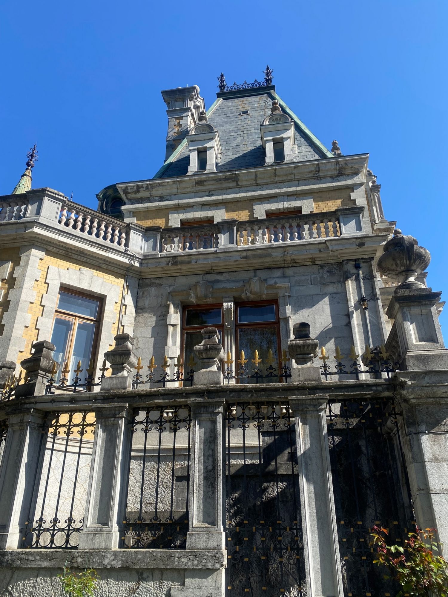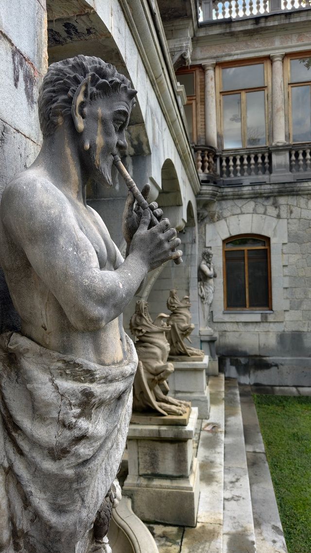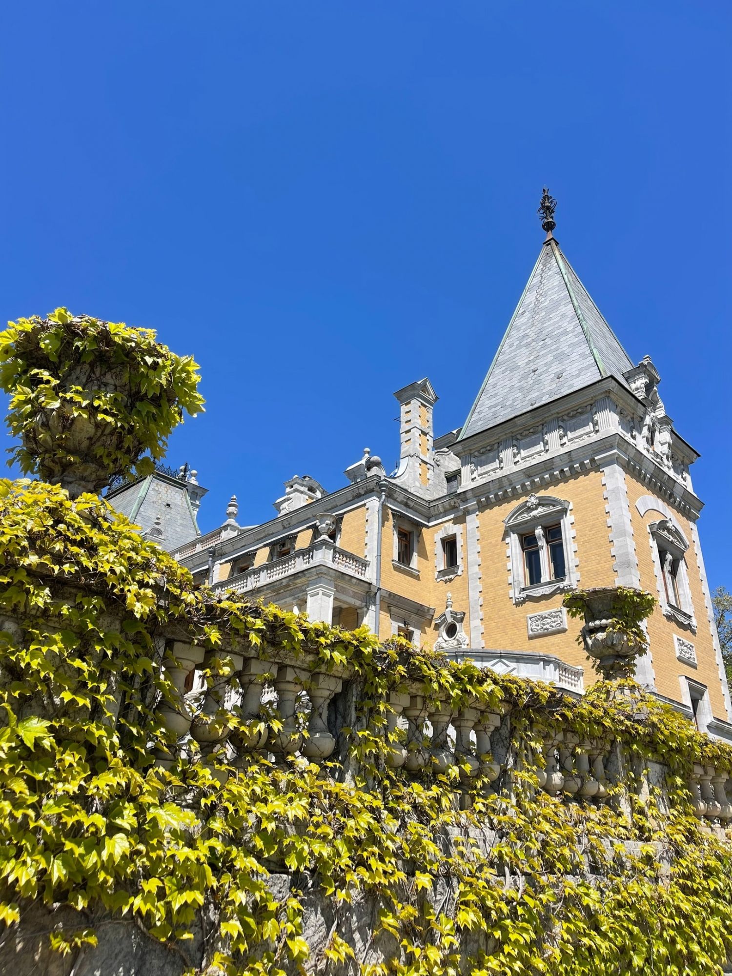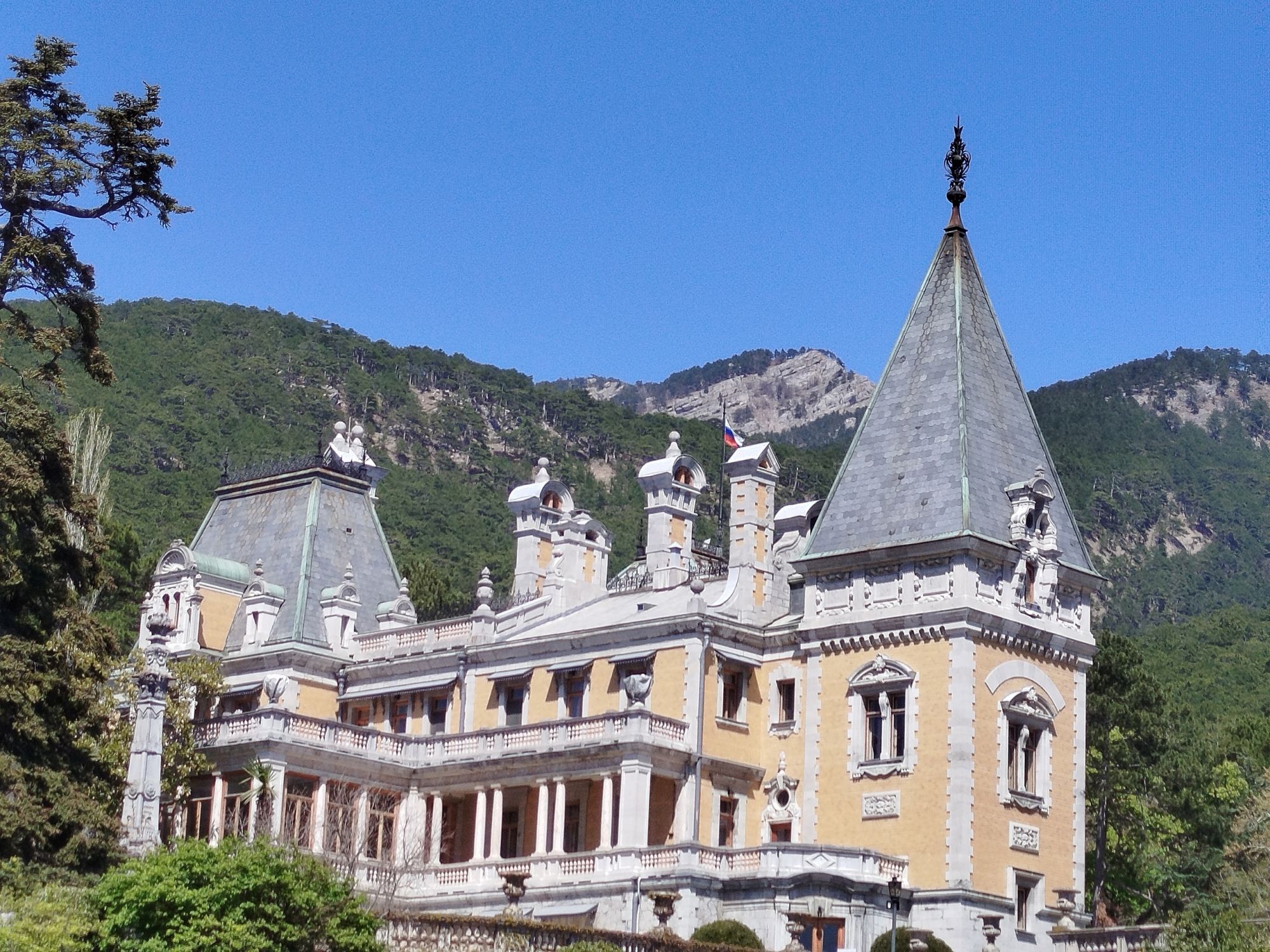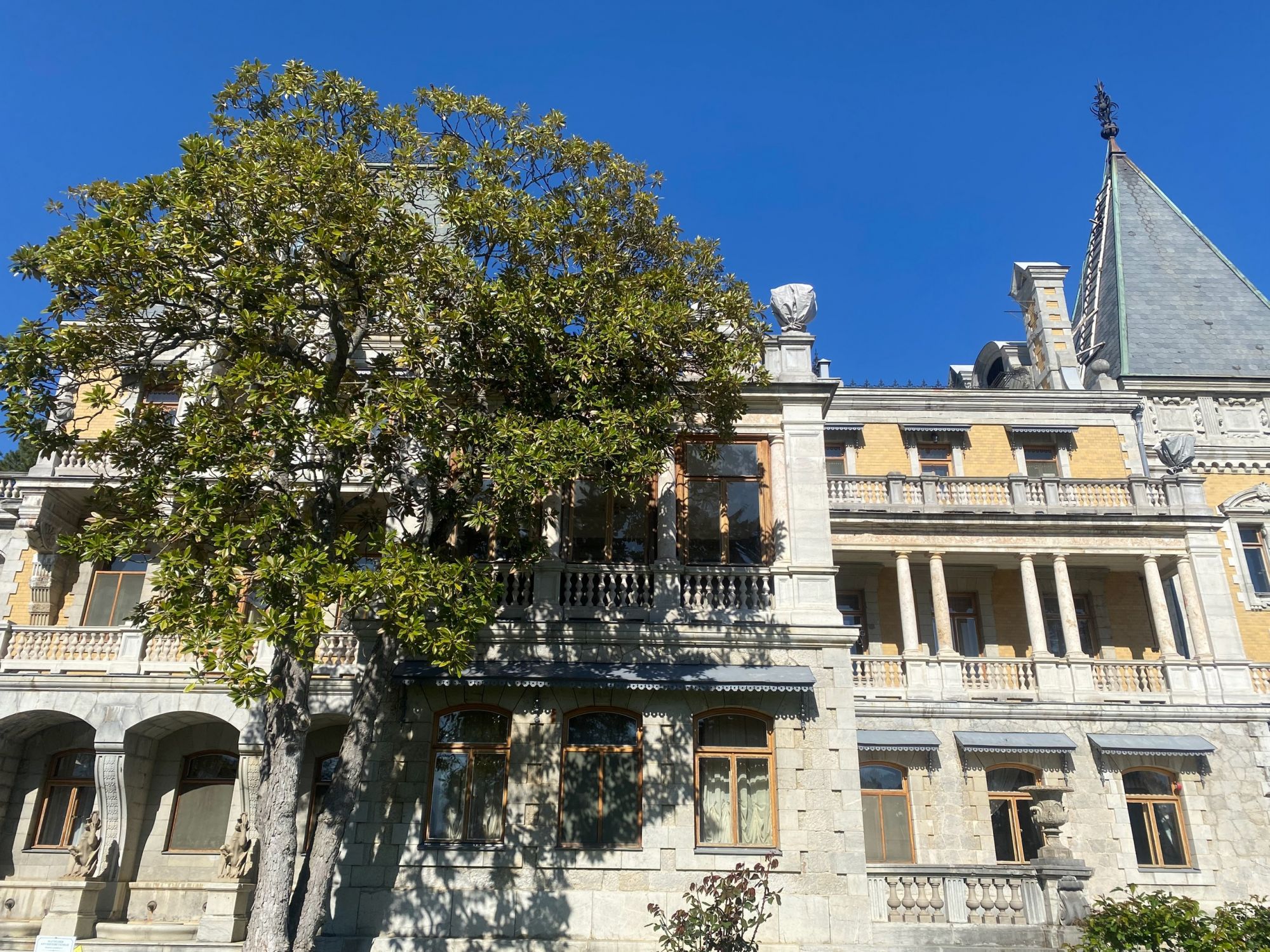 29 мая Буду заканчивать рассказ о поездке. а то сплошная болтология и никакой вышивки (хотя вышиваю мало, времени нет, на этой неделе вообще ни крестика не сделала) Значит, решили мы покорить все дворцы, которые возможно, и направились в другую сторону от Ялты - в Массандровский дворец. Все-таки интересно, на ЮБК столько много дворцов, но все они разные, все совсем друг на друга не похожие! Вот и Массандровский дворец нисколько не похож ни на Ливадийский, ни на Юсуповский, ни на Воронцовский! Массандровский дворец построен в стиле лучших французских ренессансных замков XVII-XVIII веков. начал строительство один из Воронцовых, но так и не закончил и стоял этот недострой до того времени, пока не купил эти земли для царской семьи Александр III. Александр III рассматривал Массандру как дачу, место летнего отдыха для своей семьи и приказал дворец достроить. Однако этим планам не суждено было сбыться: осенью 1894 года император умер, не успев пожить во дворце, строительство которого снова застопорилось. Словно злой рок преследовал это место. Ни один из владельцев дома не успевал его обжить. После этого Николай II приказал достроить Массандровский дворец в память об отце. Однако семья последнего российского императора тут никогда не жила, и даже не останавливалась на ночь. Сердце их безраздельно принадлежало любимой Ливадии. Дворец полностью оказался достроен лишь к 1902 году. До революции тут никто не жил. Чтобы правильно понять интерьер Массандровского дворца, нужно знать некоторые факты о Александре III как личности. Он был высокий и крупный мужчина огромной физической силы, при этом не любил просторные помещения и высокие потолки. Ему нравилось, чтобы свод комнаты был максимально близко над ним. Царь предпочитал темные цвета и приглушенное освещение. Он был также патриотом и предпочитал все русское, включая бороды бояр и допетровские костюмы. Именно таким образом был спланирован интерьер Массандровского дворца. В нем отсутствуют высокие потолки и просторные помещения. Даже в столовой, которая была довольно большой, потолок настолько низкий, что возникает вопрос о том, не ударился бы царь головой, если бы обедал там. Интерьер дворца прекрасно сохранился, позволяя оценить замысел архитектора и стиль жизни царской семьи. Однако из-за того, что дворец не использовался, многие помещения остались недоделанными. Например, комнаты на третьем этаже, предназначенные для детей царя, никогда не были обставлены. Лишь несколько помещений в полной мере были отделаны и готовы к использованию: вестибюль, приемные комнаты царя и царицы, кабинеты для венценосной пары, супружеская спальня, гостиная императрицы, столовая и бильярдная. В интерьере Массандровского дворца также широко использована метлахская плитка. Применялись разные породы дерева, такие как дуб, орех и красное дерево. Отделка выполнена с большим мастерством, включая сложную резьбу и расцвеченное выжигание по дереву. В дворце также есть другие интересные предметы. Например, в кабинете императрицы уникальный камин из коричневого мрамора, а также ручная люстра и уникальное зеркало. Для отделки помещений использовались также витражи и живопись по стеклу, создавая приглушенное освещение, которое так нравилось Александру III. Помимо красоты, дворец также обладал удобствами. Там была электрическая д