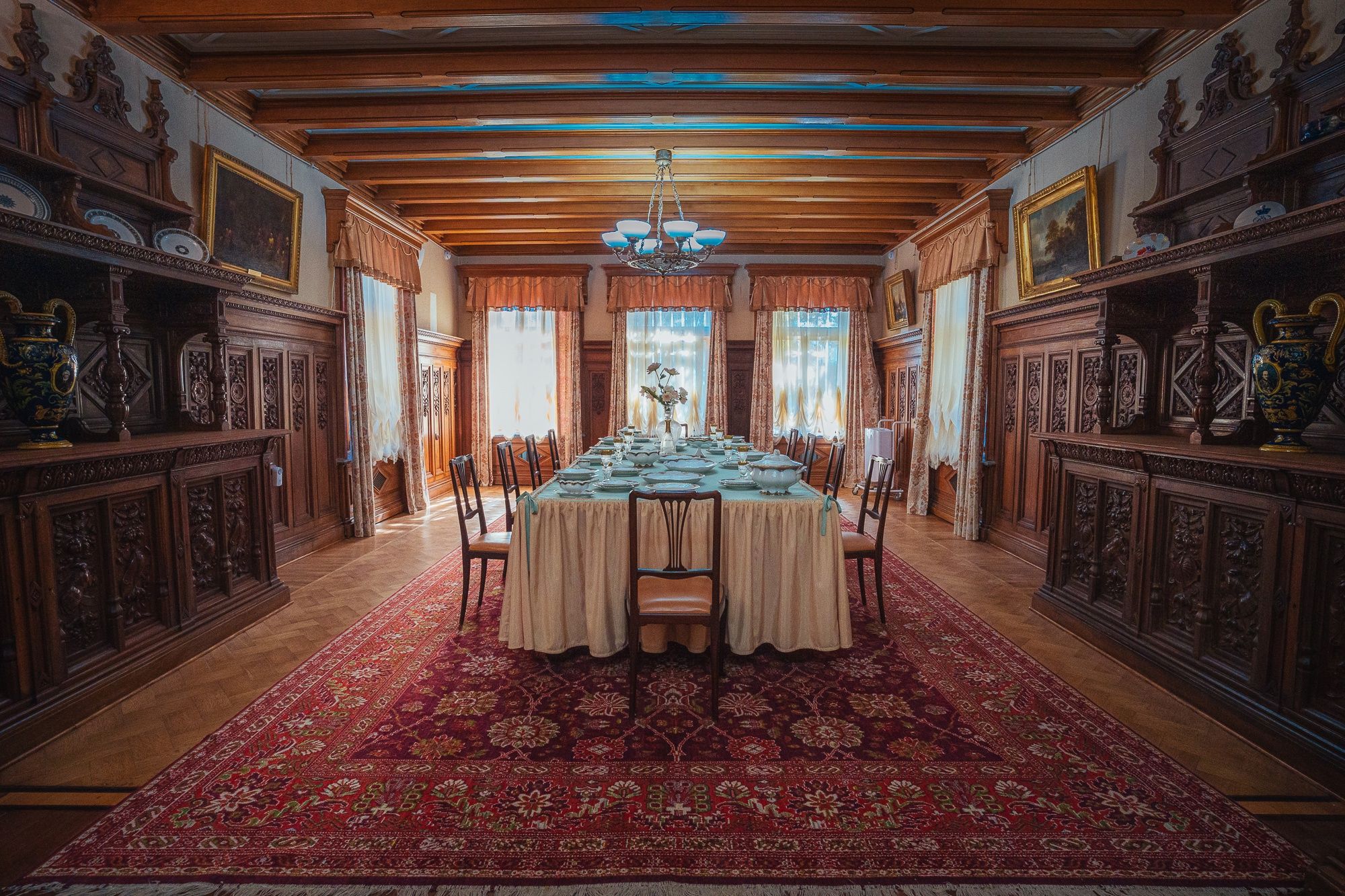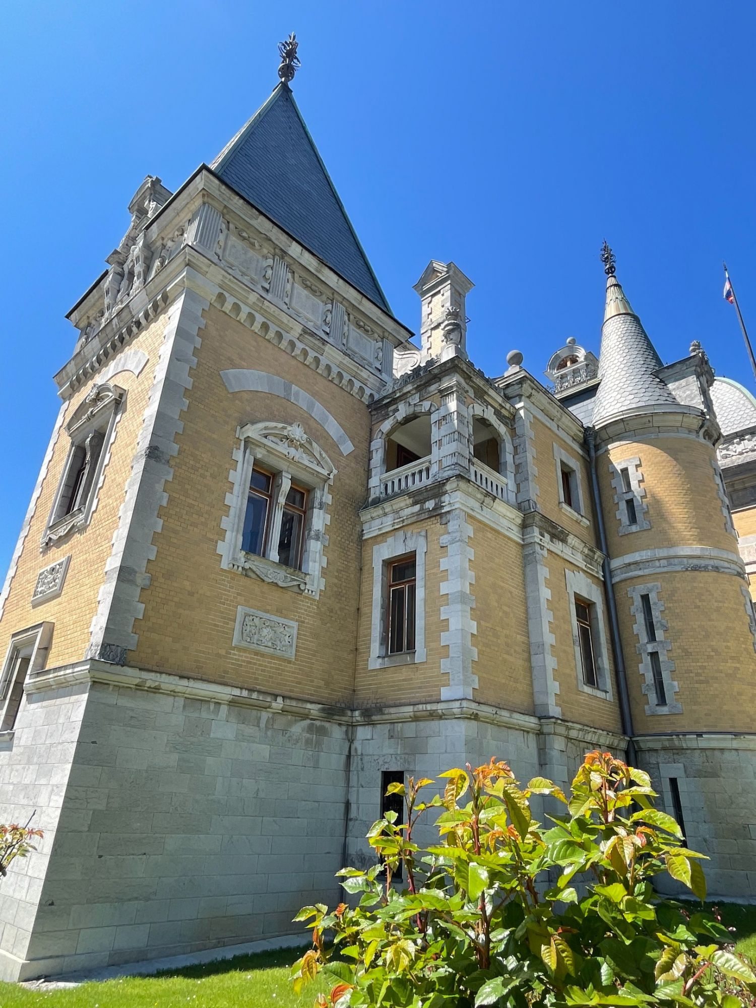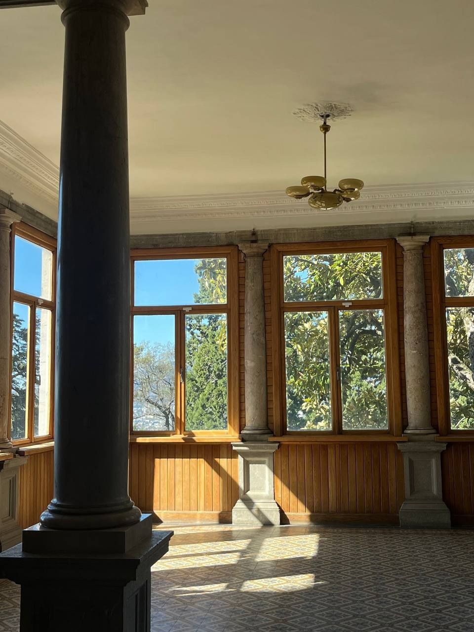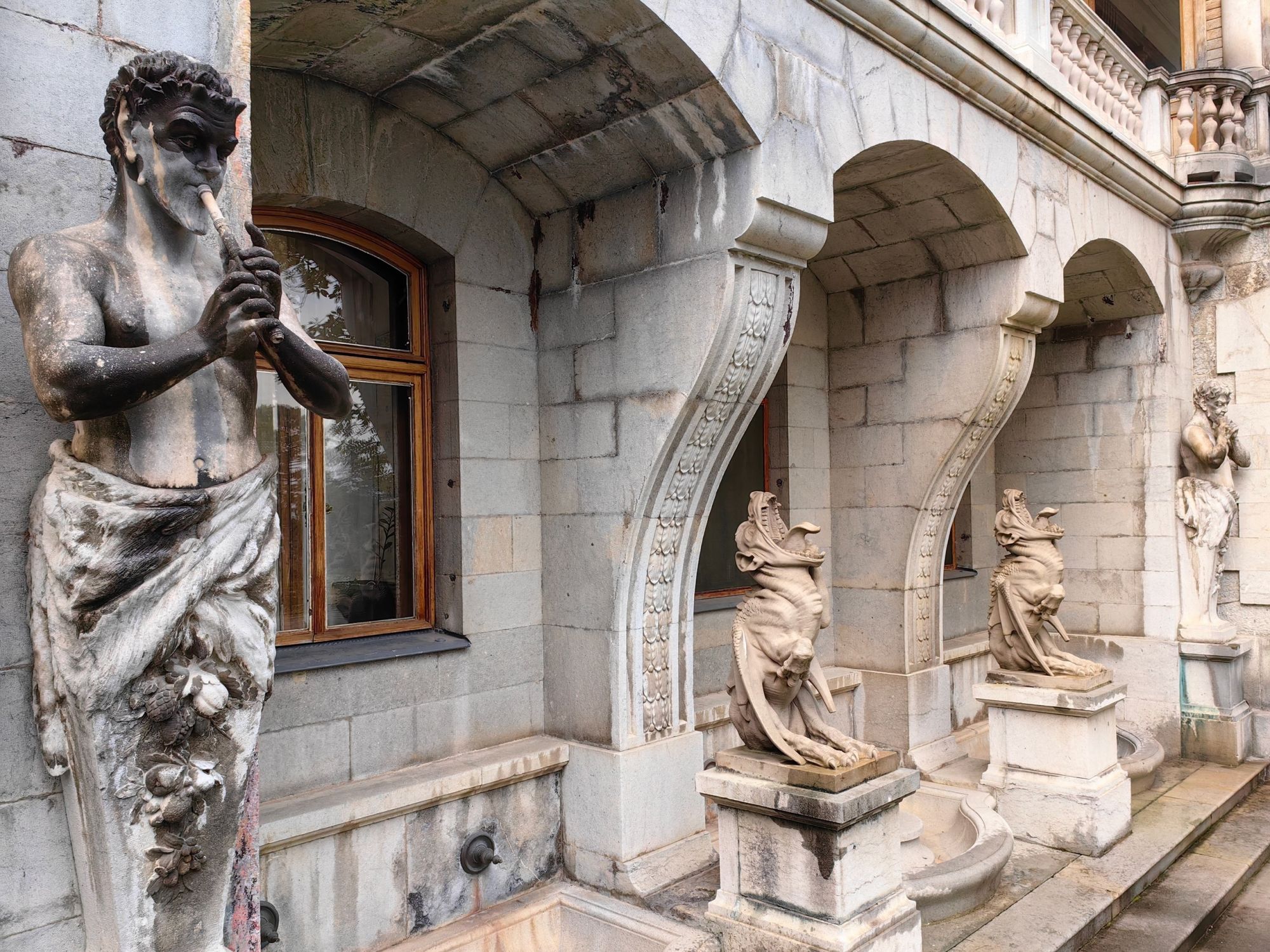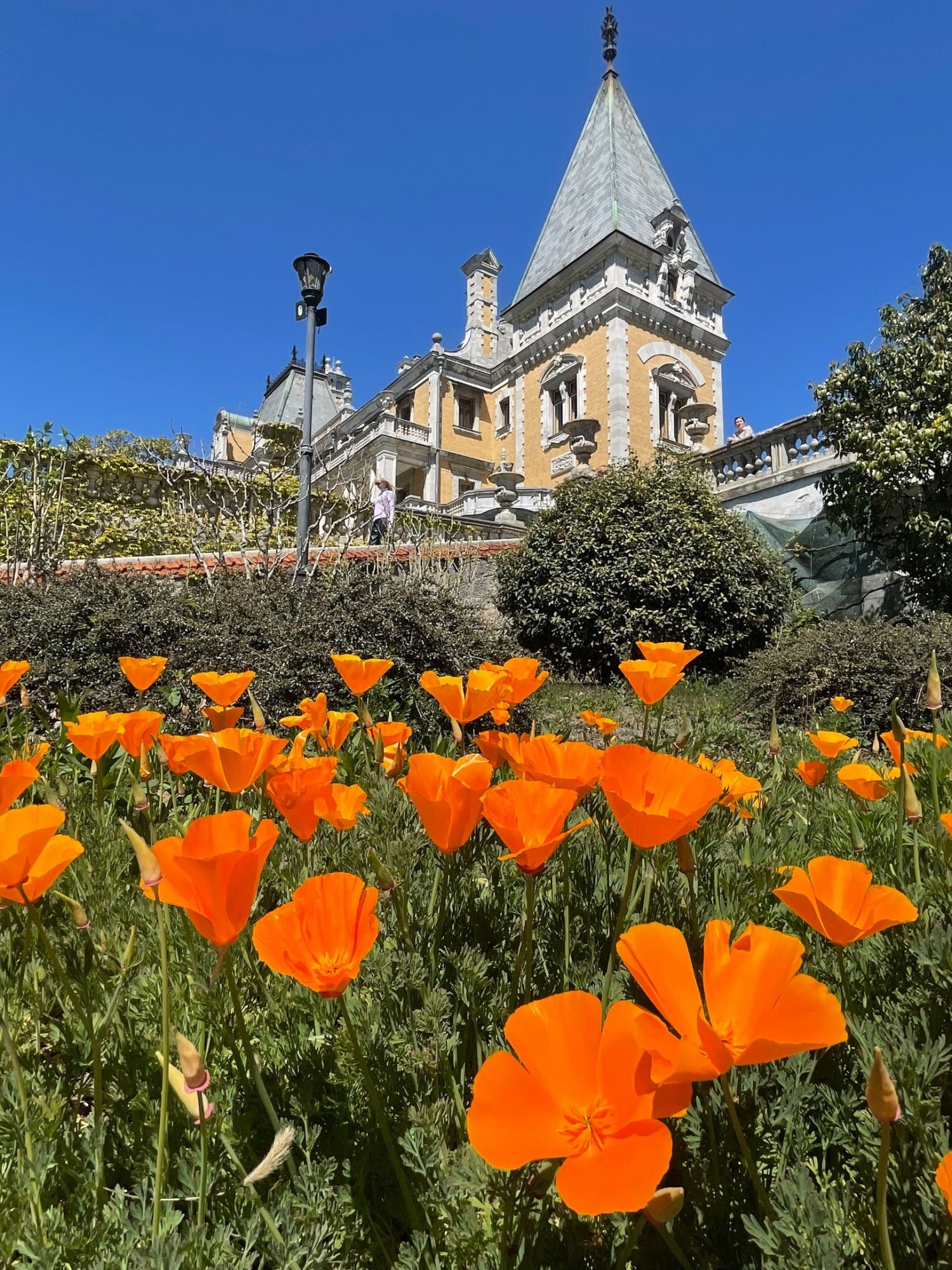 29 мая Буду заканчивать рассказ о поездке. а то сплошная болтология и никакой вышивки (хотя вышиваю мало, времени нет, на этой неделе вообще ни крестика не сделала) Значит, решили мы покорить все дворцы, которые возможно, и направились в другую сторону от Ялты - в Массандровский дворец. Все-таки интересно, на ЮБК столько много дворцов, но все они разные, все совсем друг на друга не похожие! Вот и Массандровский дворец нисколько не похож ни на Ливадийский, ни на Юсуповский, ни на Воронцовский! Массандровский дворец построен в стиле лучших французских ренессансных замков XVII-XVIII веков. начал строительство один из Воронцовых, но так и не закончил и стоял этот недострой до того времени, пока не купил эти земли для царской семьи Александр III. Александр III рассматривал Массандру как дачу, место летнего отдыха для своей семьи и приказал дворец достроить. Однако этим планам не суждено было сбыться: осенью 1894 года император умер, не успев пожить во дворце, строительство которого снова застопорилось. Словно злой рок преследовал это место. Ни один из владельцев дома не успевал его обжить. После этого Николай II приказал достроить Массандровский дворец в память об отце. Однако семья последнего российского императора тут никогда не жила, и даже не останавливалась на ночь. Сердце их безраздельно принадлежало любимой Ливадии. Дворец полностью оказался достроен лишь к 1902 году. До революции тут никто не жил. Чтобы правильно понять интерьер Массандровского дворца, нужно знать некоторые факты о Александре III как личности. Он был высокий и крупный мужчина огромной физической силы, при этом не любил просторные помещения и высокие потолки. Ему нравилось, чтобы свод комнаты был максимально близко над ним. Царь предпочитал темные цвета и приглушенное освещение. Он был также патриотом и предпочитал все русское, включая бороды бояр и допетровские костюмы. Именно таким образом был спланирован интерьер Массандровского дворца. В нем отсутствуют высокие потолки и просторные помещения. Даже в столовой, которая была довольно большой, потолок настолько низкий, что возникает вопрос о том, не ударился бы царь головой, если бы обедал там. Интерьер дворца прекрасно сохранился, позволяя оценить замысел архитектора и стиль жизни царской семьи. Однако из-за того, что дворец не использовался, многие помещения остались недоделанными. Например, комнаты на третьем этаже, предназначенные для детей царя, никогда не были обставлены. Лишь несколько помещений в полной мере были отделаны и готовы к использованию: вестибюль, приемные комнаты царя и царицы, кабинеты для венценосной пары, супружеская спальня, гостиная императрицы, столовая и бильярдная. В интерьере Массандровского дворца также широко использована метлахская плитка. Применялись разные породы дерева, такие как дуб, орех и красное дерево. Отделка выполнена с большим мастерством, включая сложную резьбу и расцвеченное выжигание по дереву. В дворце также есть другие интересные предметы. Например, в кабинете императрицы уникальный камин из коричневого мрамора, а также ручная люстра и уникальное зеркало. Для отделки помещений использовались также витражи и живопись по стеклу, создавая приглушенное освещение, которое так нравилось Александру III. Помимо красоты, дворец также обладал удобствами. Там была электрическая д