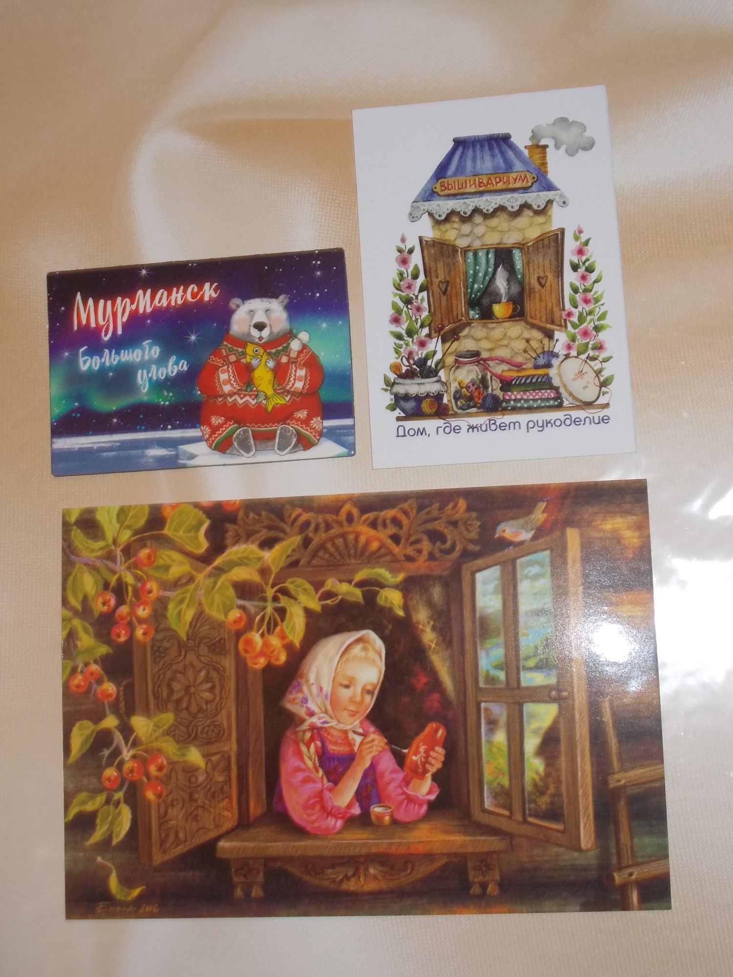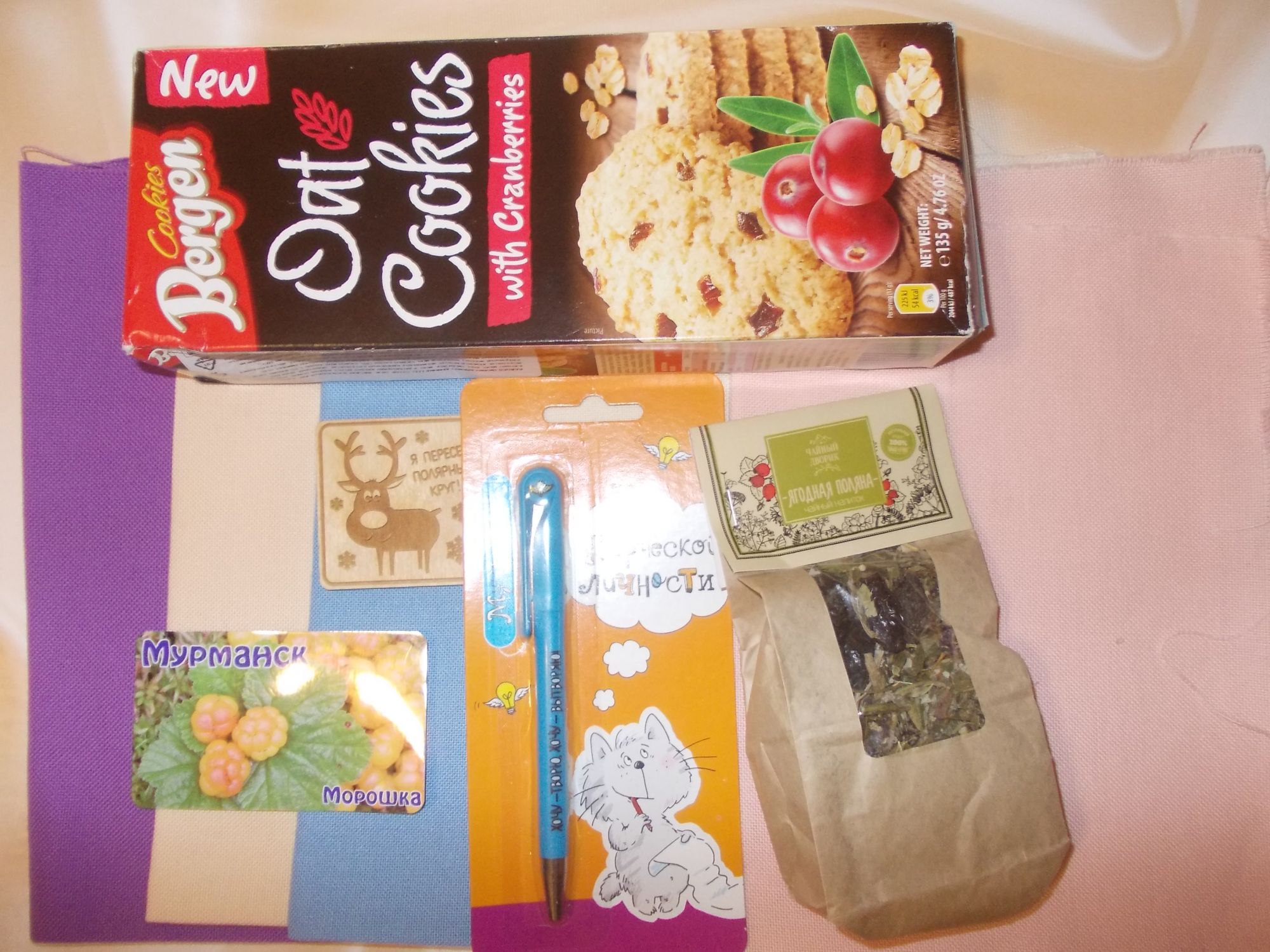 10 октября 2017 9 часов назад, Plotva сказал: Зато какой результат в конце. Первый набор вообще шикарный 7 часов назад, Zlatodara сказал: видела вторые. Может и скучно, но отшив красивый! Не уверена, что мне нужны такие большие картины)) Горшков у меня на все вкусы и почти все весёленькие А я с отчётом! Получила конфетку от Сашеньки @Tris 5 отрезиков укромерки , овсяное печенье с клюквой, чудесный травяной чай (пахнет даже через пакет), прикольная ручка , бобинки (забыла сразу снять, вернее, они выкатились в сторону) , два магнитика- с оленем и с морошкой. Сашенька, огромное тебе спасибо! Мне так приятно! Всё потрогали и рассмотрели вместе с мамой)) Сегодня получила сразу три посылки. Анечка @Камма80 прислала вторую часть деньрожденного подарка- фотофоны. Два под доски- белые и коричневые и один персиковый с разводами. Еще магазин положил магнитик (тоже Мурманск), календарик и открытку. И Ане, и магазину спасибо и ура!! А мне пришли три канвушечки- светло-розовая, зеленая и голубая с перламутром. Ням-ням!! лежат на новом фотофоне, конечно, надо не так снимать, но вечером выбирать не приходится, поближе к люстре, чтобы вспышка не сработала. Molly21, Ponochka, svetles и 28 других сказали спасибо Поделиться сообщением Ссылка на сообщение