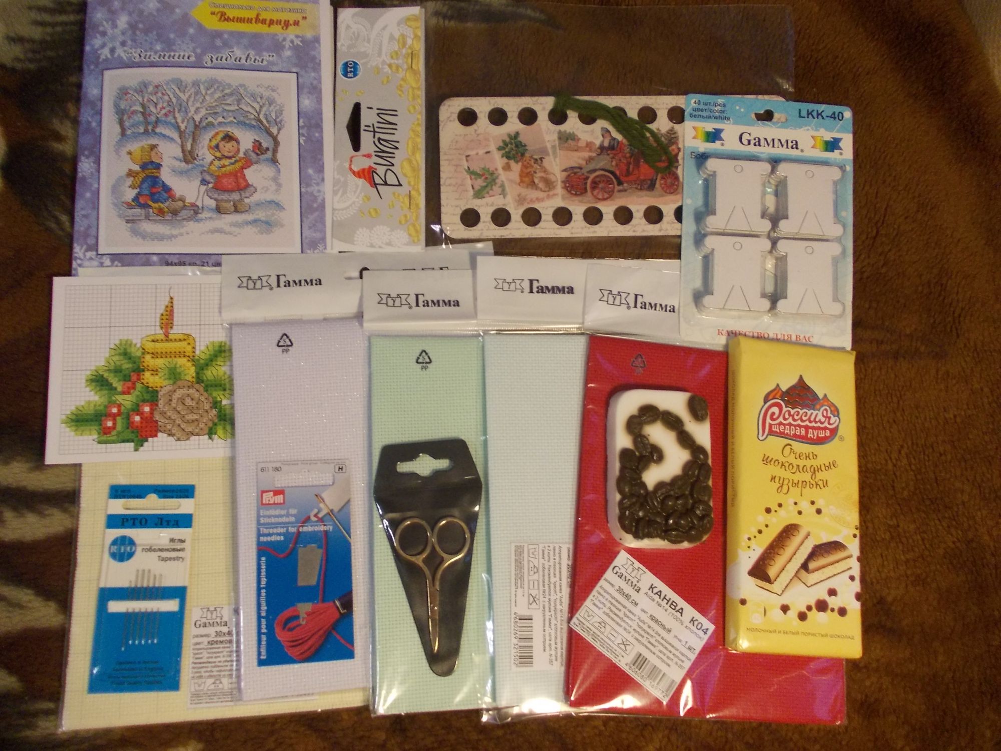 23 декабря 2016 Добрый вечер! А ко мне приехал нежданчик-партизанчик (на самом деле, партизанище!) от Юли @apanjul. Девчонки, если и есть где-то магия, то она у нас, на стич! Это надо же иметь столько желания порадовать, фантазии, доброты... А уж про время и средства (дензнаки имею ввиду) вообще молчу, явно оторваны от семьи и своих личных "закромов". Это я и про Юлечку, и про других феечек! Мне всё трудней подбирать слова благодарности... Как хочется всех знакомых по форуму порадовать, исполнить чьи-то желания... Простите, что нечем пока ответить.. Дополнительную экскурсию если только провести Ну вот! Посылка пришла сегодня и сегодня же принесли извещение (это, конечно, чудо!), забрала по дороге на почту как раз. Любопытство клокотало, как каша в котелке, и на пол-дороге я начала вскрывать конверт. А там моя любимая оберточная бумага, да так красиво упаковано , что рука не поднялась на улице разворачивать. Пришлось терпеть до дома. Внутри еще одна упаковка, еще более красивая . Удивительная открытка со схемой от Панны с прекрасными пожеланиями мне и маме. Как это приятно! А дальше на свет из упаковки появилось целое приданое для моей хомячихи . Ножнички, иголочки, бобинки и нитковдеватель. Юля, ты не поверишь, но на ножницы я вчера смотрела на сайте Низанки и сегодня в Магнит-косметик (решила, что они слишком острые), эти такие красивые, просто кукольные! Про нитковдеватель я вчера (!) советовалась с бывалыми людьми, так как сама не пользовалась. Такой же, как этот, я покупала в Самаре для подруги, себя обошла. Далее шоколадка и фирменное мыло ручной работы с чудесным запахом кофе (и какао еще померещилось, нет?) Очень позитивное и бодрящее. Деревянный органайзер для мулине, украшенный новогодними сюжетами в стиле ретро: щенки на санках, дед Мороз с ёлками и подарками в старинном автомобиле, детишки нарядные.. Благодаря херитажевскому набору с Украины, опознала листья остролиста. Упомянутая открытка со схемой и схема от Анны Петуновой "Зимние забавы". А в целом наборе канвы (пять видов!!) есть перламутровая, ну точно для этих детей подходит . Когда-нибудь вышью, может, к следующей зиме. У двух сестер-кузин и двух двоюродных племянниц по полному комплекту девочка+мальчик, придется жребий тянуть, кому достанется. Юлечка, огромное спасибо тебе и дочке за такое внимание, щедрость, желание порадовать! Пусть у вас всё будет хорошо! Мысленно с вами nogres, ОльгаВл, Дичок и 19 других сказали спасибо Поделиться сообщением Ссылка на сообщение