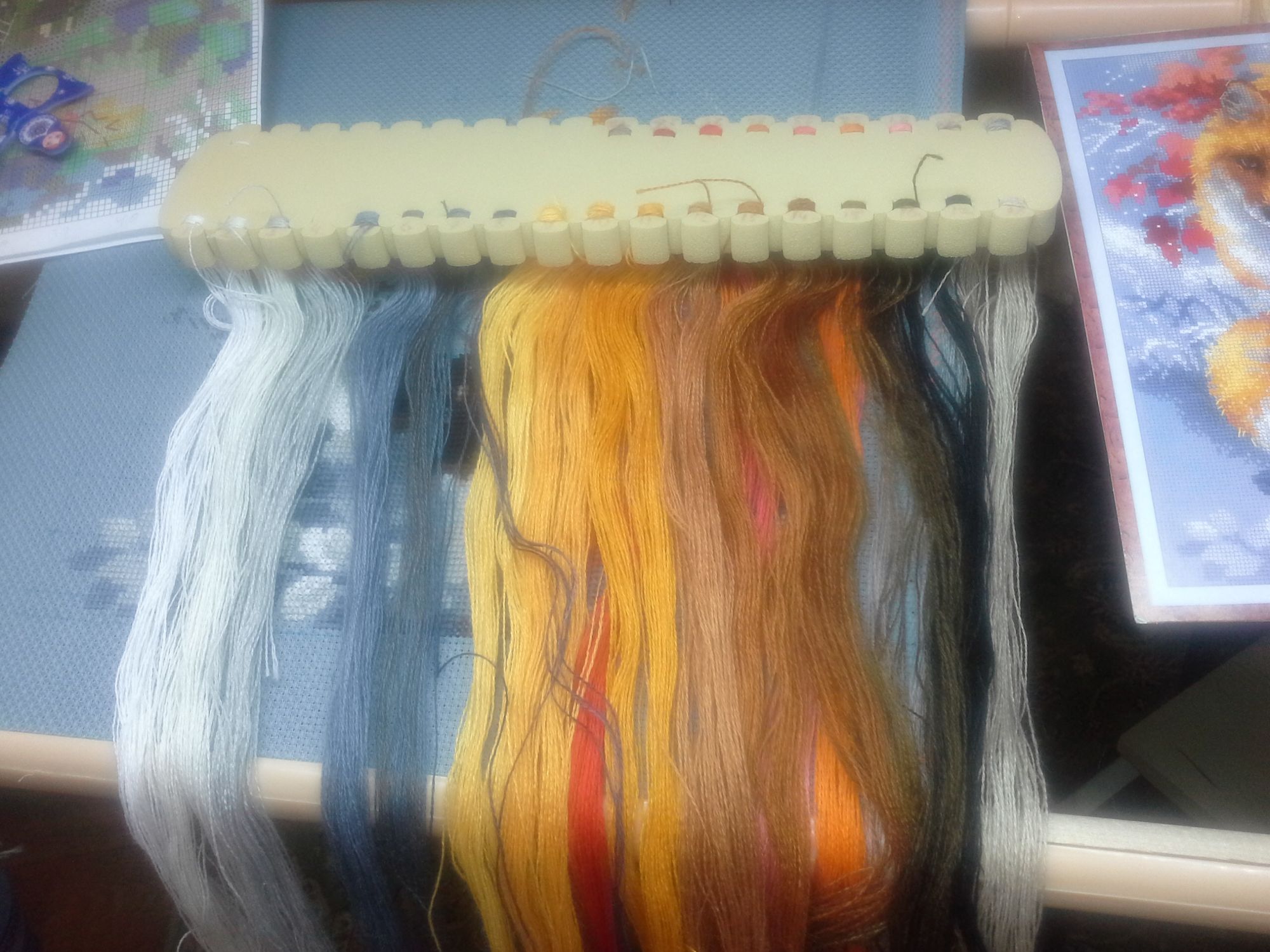 4 февраля 2016 Первый раз пользуюсь Дубко. Развесила на него шерстяные нитки. Вышиваю набор от Риолиса. Работать намного удобнее, чем когда нитки намотаны на бобинки. Фломастером прямо на органайзере подписала номера ниток. в дальнейшем, если буду вышивать шерстью, то только с Дубко!! Хорошуля, chip09, =Варвара= и 3 других сказали спасибо Поделиться сообщением Ссылка на сообщение