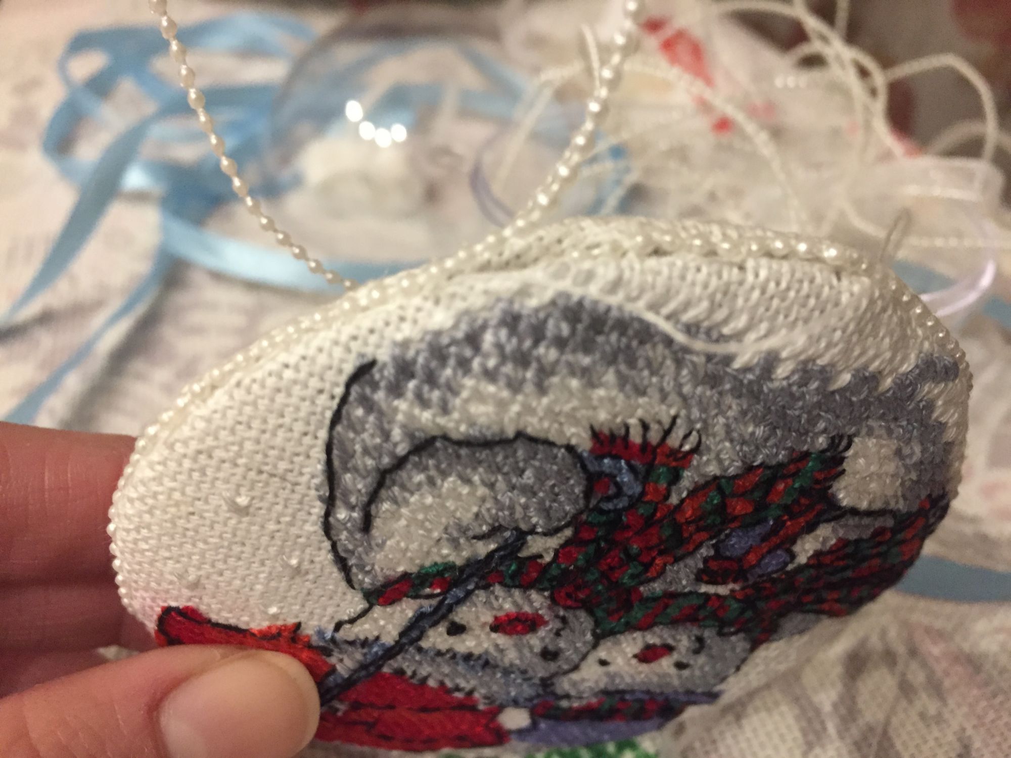 24 декабря 2018 Всем привет! Как и обещала, вышиваю только маки, поэтому и есть что показать: Было Стало Очень хочу завершить в этом году еще один лист и тем самым добраться до третьего угла. Осталось не так много, но боюсь загадывать. Хочу сказать, что мне быть однопроцесницей скучно, но я держусь. А так хочется начать шарик от Жар-птицы, а то все их уже вышили, а я нет. Для начала приобрела тот, что первым запал в душу - с рябинкой. Очень уж мне веточки на нем нравятся. Потом может войду во вкус и куплю остальные - с бисером и бусинами А сейчас хочу похвалиться подарочком, который мне пришел в рамках новогоднего мини-сюра "Зимняя сказка". Моей феей или снегурочкой оказалась Аня K_AnnA_D из далекого-далекого Владивостока. Она вышила мне в подарок вот такого замечательно олененка и оформила его в пинкип . А еще я получила в подарок чудесную рукодельную открытку в технике блэкворк Помимо игрушки в подарке была хомячья радость - наборчик с символом года, равномерка, дизайнерская канва, нитки, бисер и прочее: Отдельное Вау - приморский шоколад: Он обалденно вкусный!!! Просто трудно найти слова. Молочный нежен, что слюнки текут пока пишу. Но отдельный восторг у нас с мужем вызвал шоколад с морской солью - это самый вкусный шоколад, что я ела в последнее время. Мой подарок уехал в Новосибирск и так как он уже получен - то я могу раскрыть подробности его создания. Мне давно попались на глаза пластиковые шары - они состоят из двух полусфер, которые довольно плотно (до щелчка) захлопываются и получается шарик. Диаметр полусфер - 8 см. Самое сложное было найти подходящий миниатюрные сюжет. Для одной стороны я выбрала снежинку, а для другой парочку снеговиков. Фото процесса вышивки не сохранилось. Для сборки мне понадобился картон, самоклеящийся поролон получились у меня две детальки Я их сначала сшила друг с другом, а потом вшила в шов красивый шнур с бусинками . Потом все просто - вышитая деталь положилась в одну полусферу, закрылась второй и получился шарик с пинкипом внутри . Стык я закрыла лентой Сверху в петельку сделала подвес с бантиком. А в завершении хочу показать вам свою елочку гирлянду из игрушек и хитрого парня, который явно что-то замышляет natalya.petkaleva, Каори, Ivi и 14 других сказали спасибо Поделиться сообщением Ссылка на сообщение