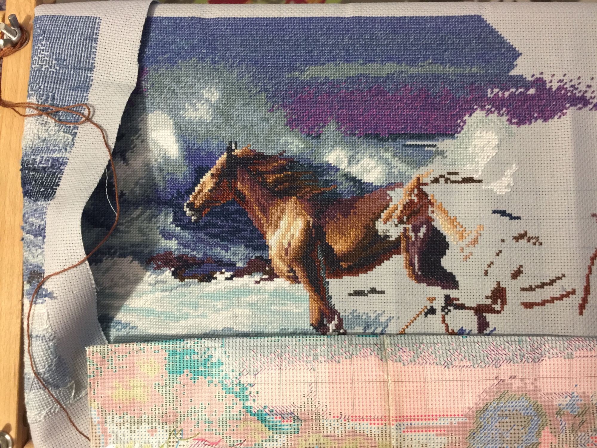 12 сентября 2017 Всем привет,как давно я не была а теме у себя,пришло время пыль смахнуть,паутину там... За это время успела вышить своих бегущим по волнам,процесс был потрясающим,море ,волны,лошади-все ,что люблю в одной картине.Полукреста очень много,шилось быстро,правда,небо немного утомило,где один цвет идёт. Итог очень радует,прямо очень,доча старшая,как любитель лошадей,тоже оценила,ждала окончания процесса.Пока не оформлена. Модераторы,процесс есть в процессах уже. nastygera, НатальяП, FEDORMaзиус и 7 других сказали спасибо Поделиться сообщением Ссылка на сообщение