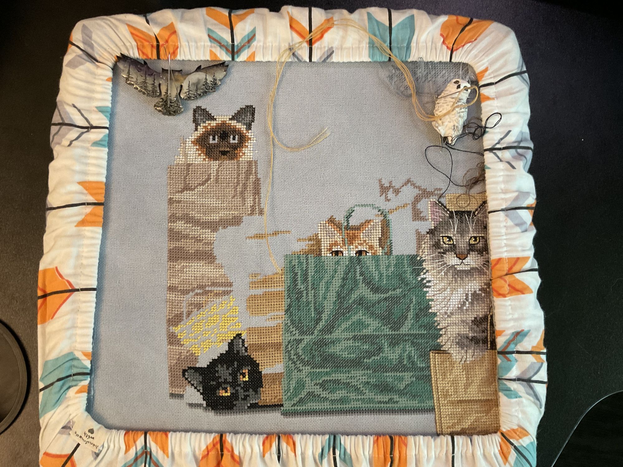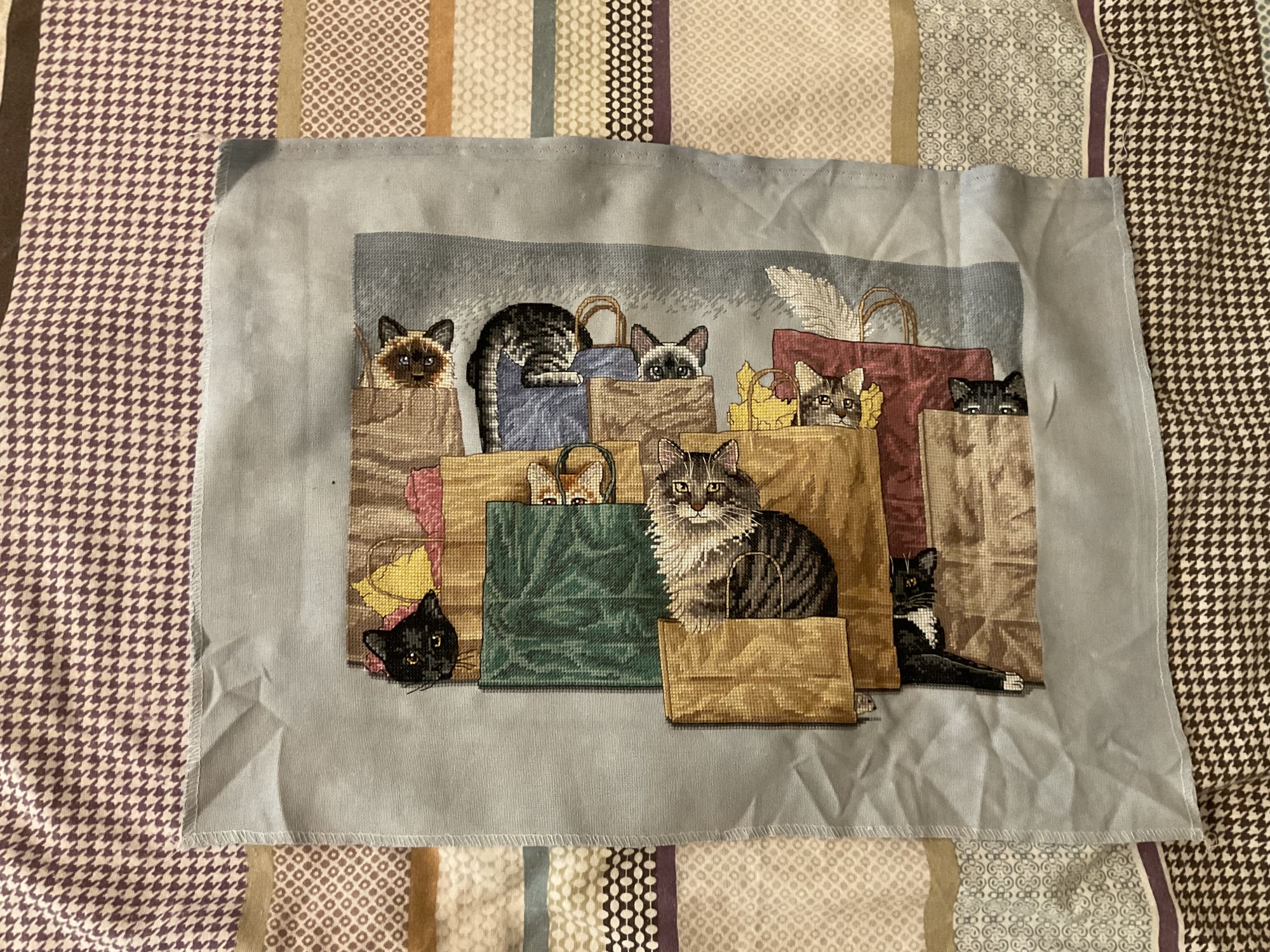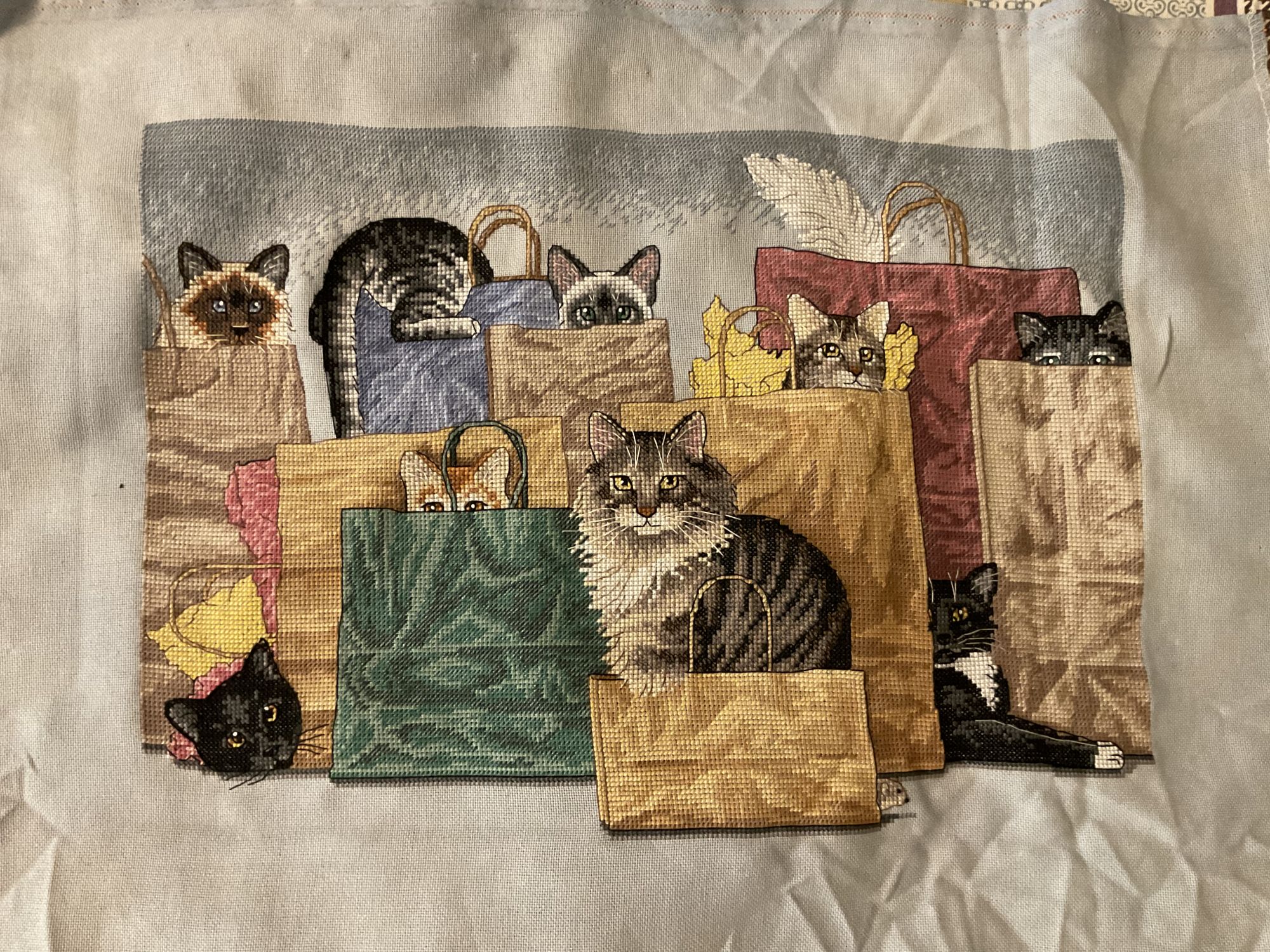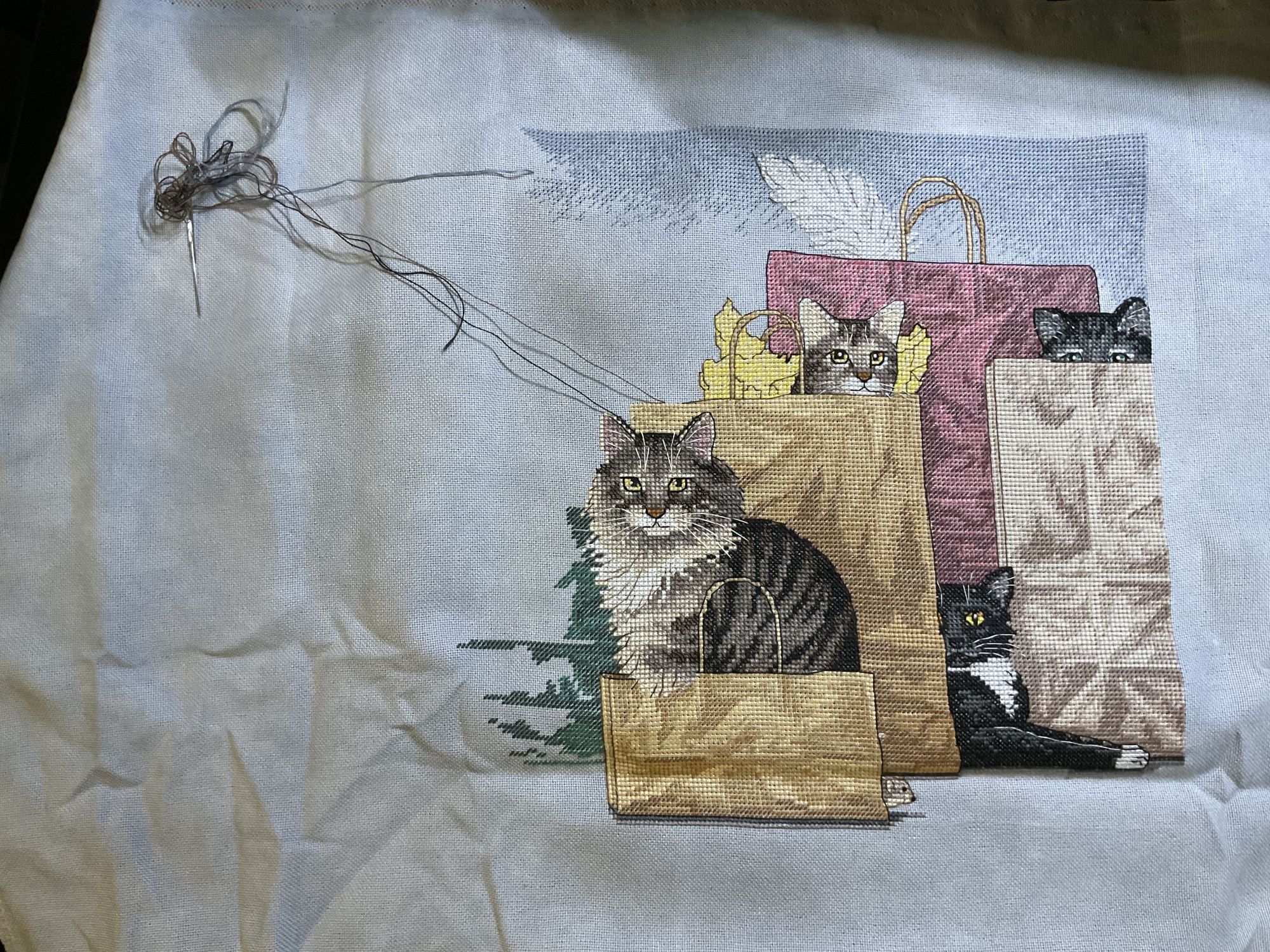 21 июня 2022 Всем добрейшего дня, что-то совсем не добираюсь до форума, хотя вышивать продолжаю исправно. Решила стряхнуть пыль со старых запасов и достала димовские кошкосумочки (Dimensions - Bag ladies 13662). Набор выцепила несколько лет назад на ebay. При получении набора только проверила, что нитки и схема есть. Когда же решилась начать набор, выяснила, что состояние у него достаточно грустное. Похоже предыдущий владелец планировал начать шить набор. Схема была слегка подрезана, думаю, что была попытка объединить две половины. Канва по краям была заклеена скотчем, который похоже сросся с ней намертво за несколько лет. Нитки были разобраны и, к моему огромному счастью, все были на месте в полном объеме. Как итог, нашла в сети перенабор кошкосумочек, а основу заменила на равномерку 32 каунта, если не ошибаюсь на монику. К сожалению, в перенаборе не обошлось без ошибок, причем в крестике они чаще всего не критичны и достаточно заметны, чтобы сразу исправить, а вот с бэком в перенаборе творится ужас и кошмар. В связи с этим, приняла решение крест/полукрест шить по перенабору, а весь бэк делать по родной схеме. Прошу создать новую гайку для работы Dimensions - Bag ladies 13662. Все фото в гайку. Marusya1978, PiyabJoe, Хозяйка смешных зверей и 3 других сказали спасибо Поделиться сообщением Ссылка на сообщение