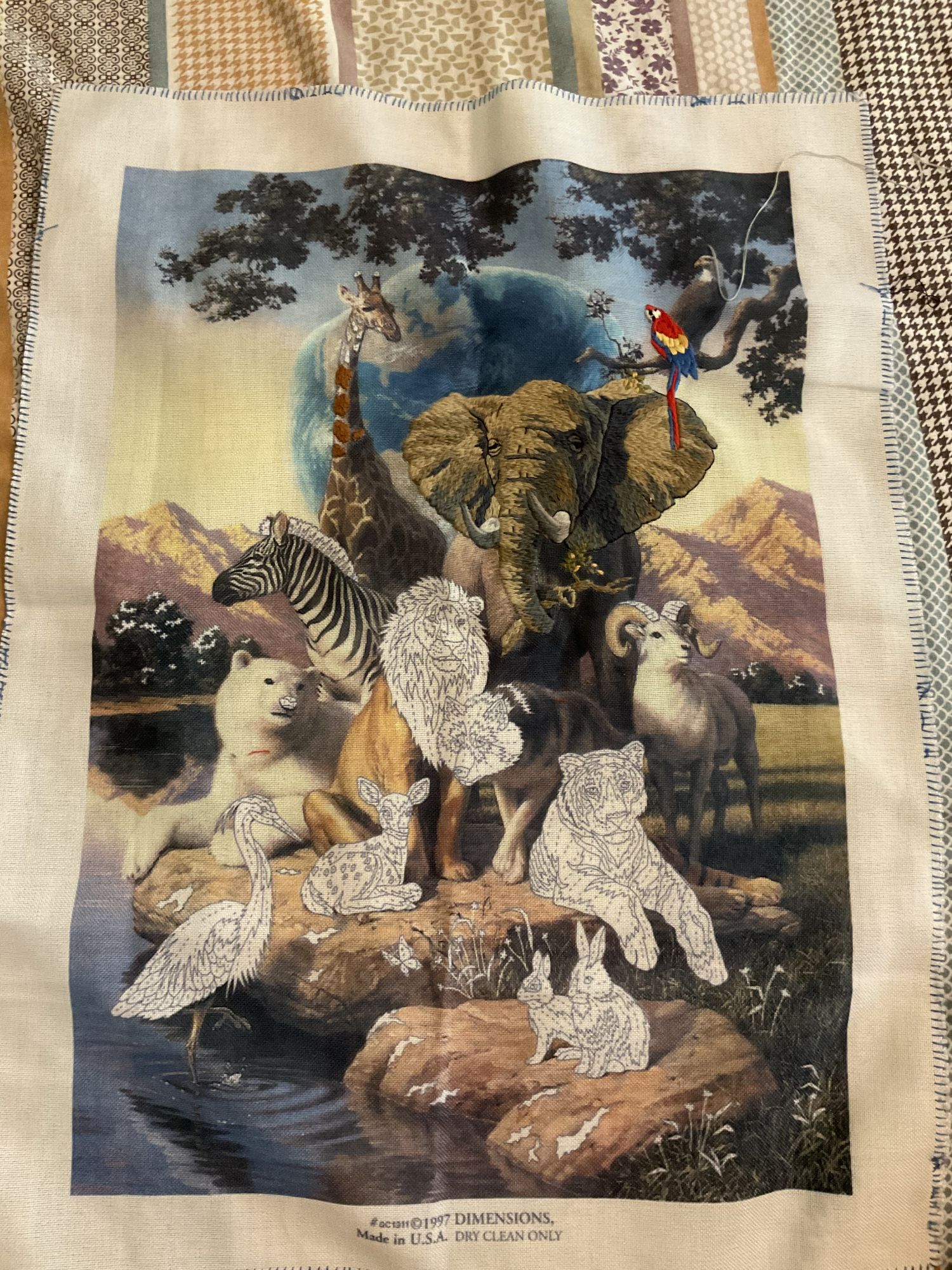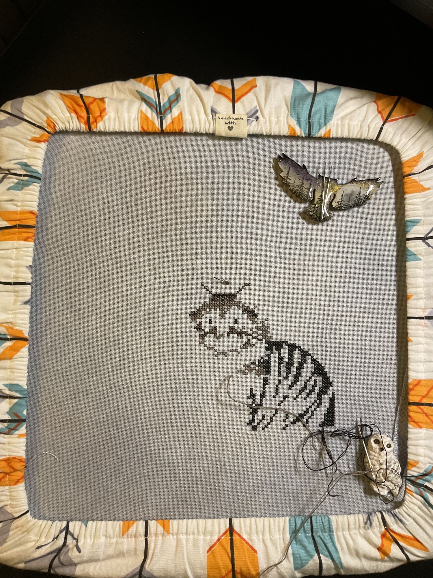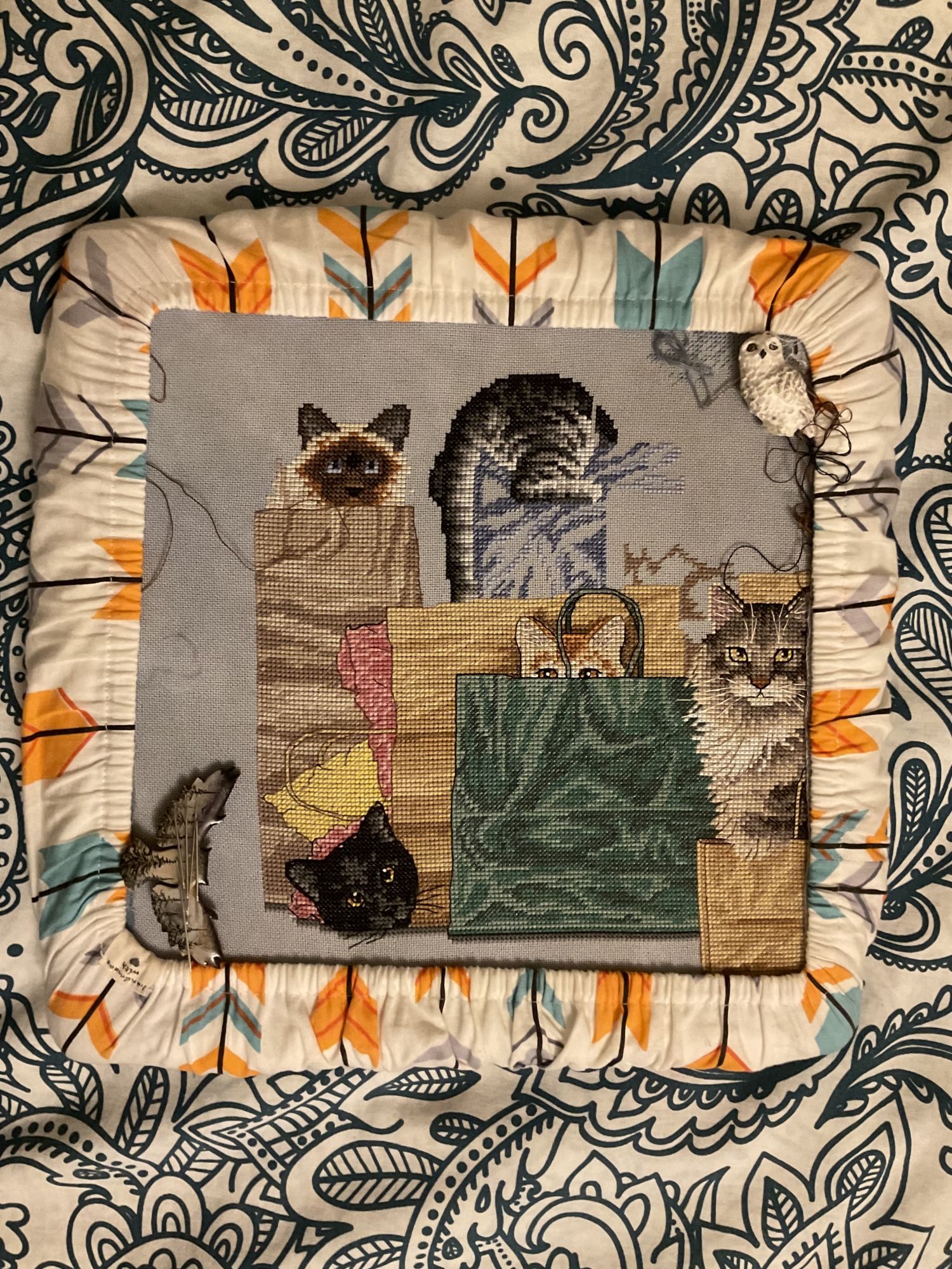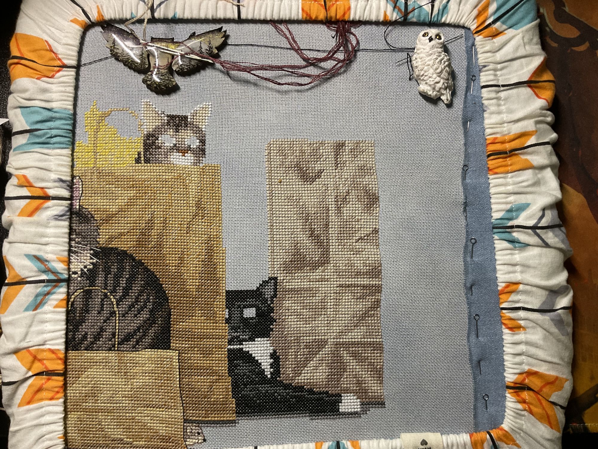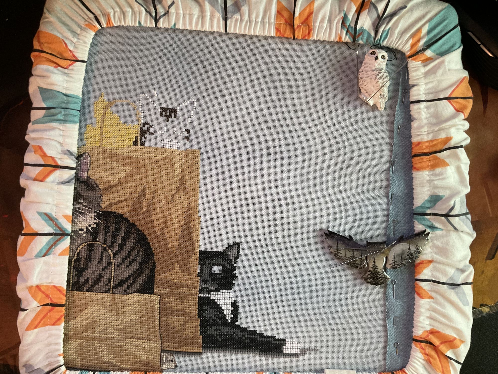 21 июня 2022 Всем добрейшего дня, что-то совсем не добираюсь до форума, хотя вышивать продолжаю исправно. Решила стряхнуть пыль со старых запасов и достала димовские кошкосумочки (Dimensions - Bag ladies 13662). Набор выцепила несколько лет назад на ebay. При получении набора только проверила, что нитки и схема есть. Когда же решилась начать набор, выяснила, что состояние у него достаточно грустное. Похоже предыдущий владелец планировал начать шить набор. Схема была слегка подрезана, думаю, что была попытка объединить две половины. Канва по краям была заклеена скотчем, который похоже сросся с ней намертво за несколько лет. Нитки были разобраны и, к моему огромному счастью, все были на месте в полном объеме. Как итог, нашла в сети перенабор кошкосумочек, а основу заменила на равномерку 32 каунта, если не ошибаюсь на монику. К сожалению, в перенаборе не обошлось без ошибок, причем в крестике они чаще всего не критичны и достаточно заметны, чтобы сразу исправить, а вот с бэком в перенаборе творится ужас и кошмар. В связи с этим, приняла решение крест/полукрест шить по перенабору, а весь бэк делать по родной схеме. Прошу создать новую гайку для работы Dimensions - Bag ladies 13662. Все фото в гайку. Marusya1978, PiyabJoe, Хозяйка смешных зверей и 3 других сказали спасибо Поделиться сообщением Ссылка на сообщение