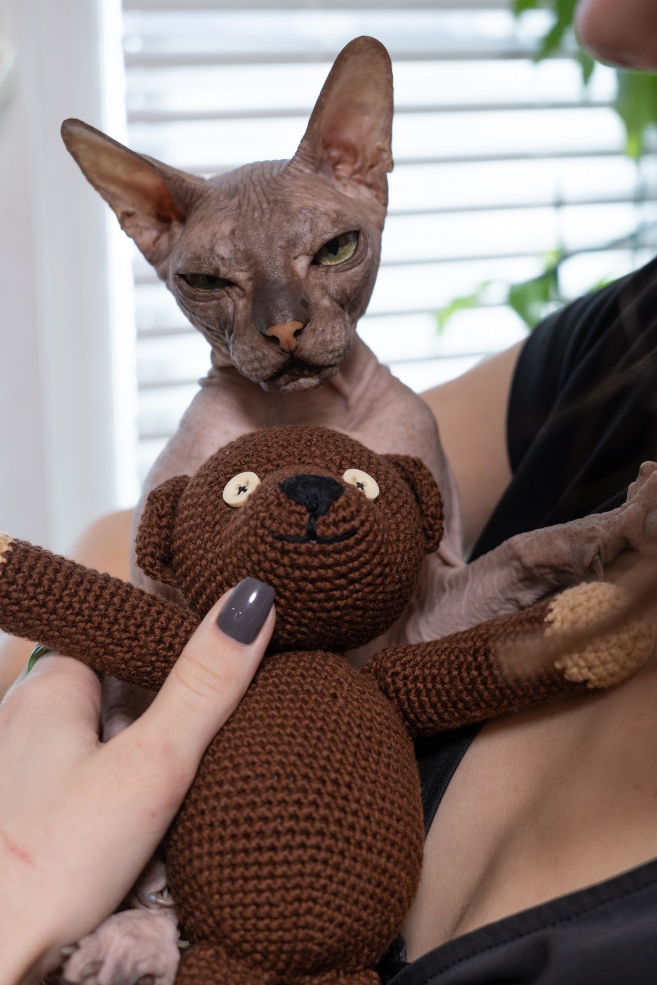 7 июля 2022 И игрушки, как и обещала. Первая, это заказ сына. Увидев моего первого медвежонка, он спросил, смогу ли я связать медведя Мистера Бина из популярного английского сериала. Я про этот сериал знала, но специально никогда не смотрела. Погуглив, поняла, что за игрушку хочет сын. Не обычный выбор, но интересный. От первого разговора про этого медведя до готовой игрушки прошло полтора года. Долго не могла найти схему вязания, которая бы мне понравилась, а потом ещё долго не могла купить подходящую пряжу. В результате, случайно наткнула на распродажу на Озоне отличной и дорогой шерсти нужного цвета. При вязании в схему тоже вносила некоторые изменения. Итог - игрушка получилась такой, как и задумывалась, да ещё и очень приятной на ощупь. Все таки качество пряжи играет в этом деле большую роль. Есть разница, будет ли это скрипучий, но дешёвый акрил или мягкая и нежная шерсть, но дорогая. Лысей монстр, который на фотках - это кошка детей и зовут ее Польза. Я к ней уже почти привыкла и даже могу брать на руки PrimaN, Leutnant Ripley, Lenara и 10 других сказали спасибо Поделиться сообщением Ссылка на сообщение