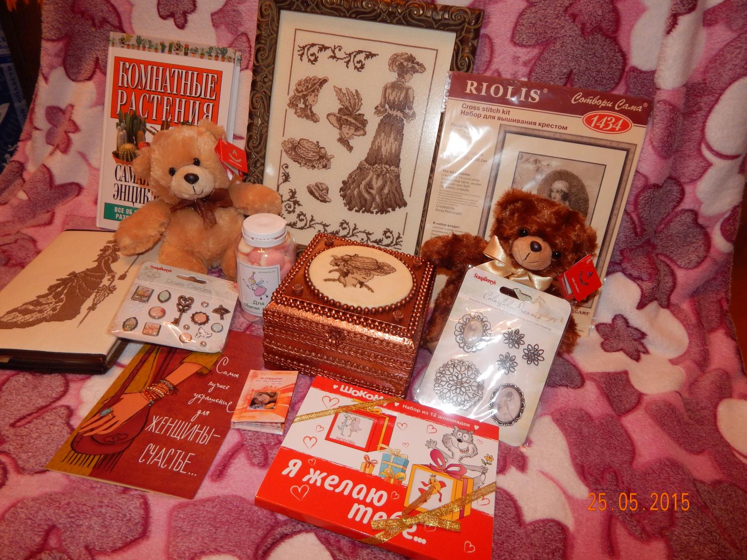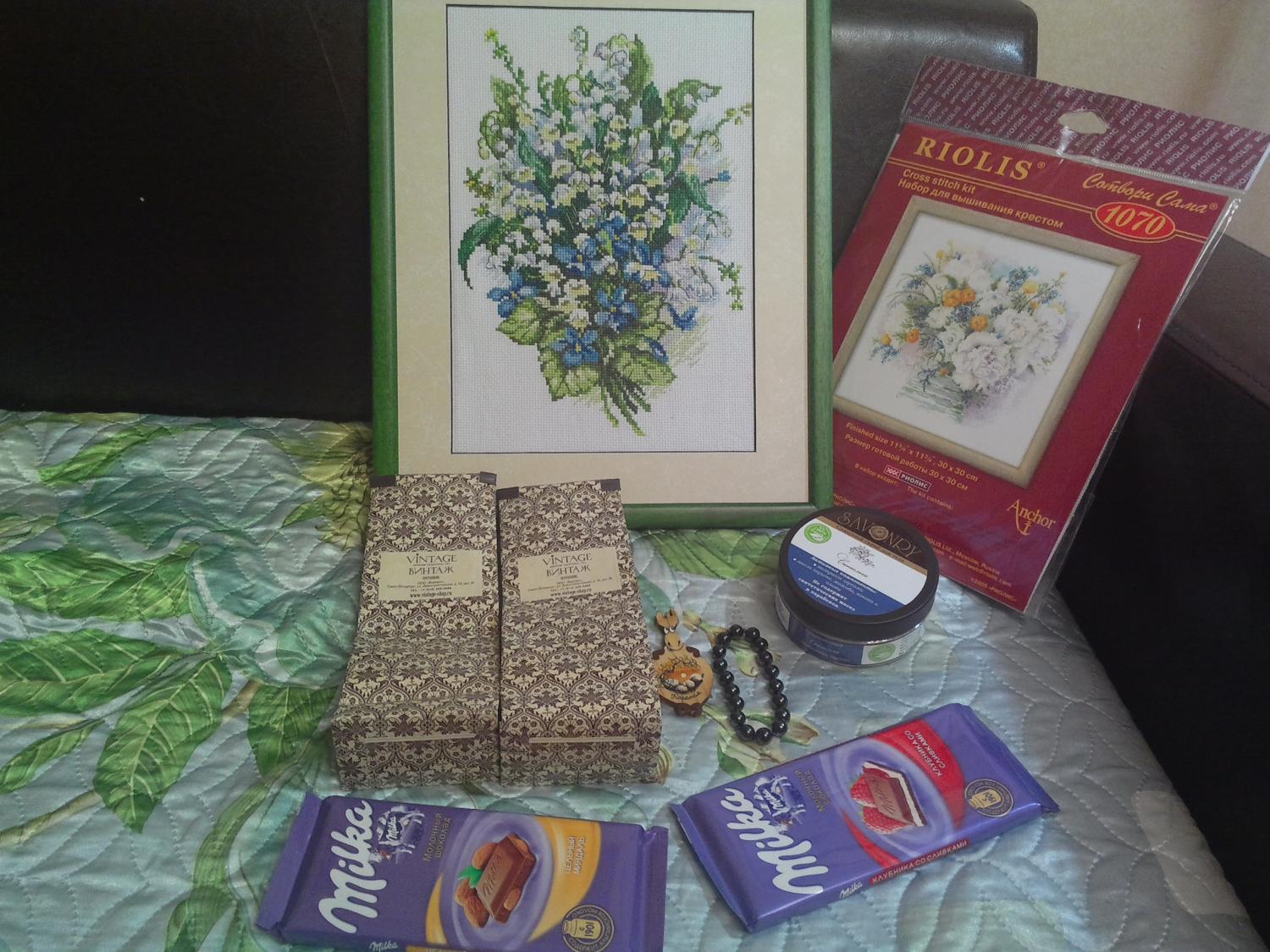 25 мая 2015 Начинаю хвастаться я. Как я написала, сюрприз получила от Женечки. Большое-большое спасибо! Подарок самый весенний. Картина с ландышами, нежная-нежная! Подарочки карельские в очень красивой упаковочке: браслет из шунгита и магнитик с таким забавным лосиком. Далее достала набор для вышивки и скраб для тела. Как он пахнет, но больше всего черникой. Не содержит синтетических масел, всё натуральные ингредиенты. Ну и,конечно, сладкий подарок с кофе в зернах (Женечка прочитала, что я обожаю сама молоть кофе и пить с удовольствием!) А это весь сюрприз: Женечка, спасибо тебе за такое весеннее настроение, недаром сегодня весь день блистало солнышко на небе! Клопшик, titania, monstrochka и 27 других сказали спасибо Поделиться сообщением Ссылка на сообщение