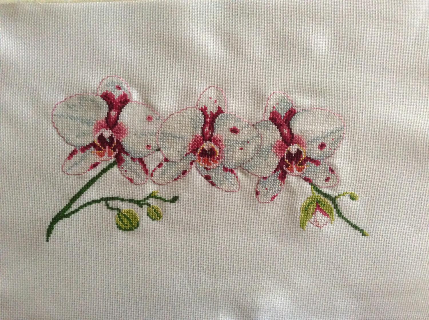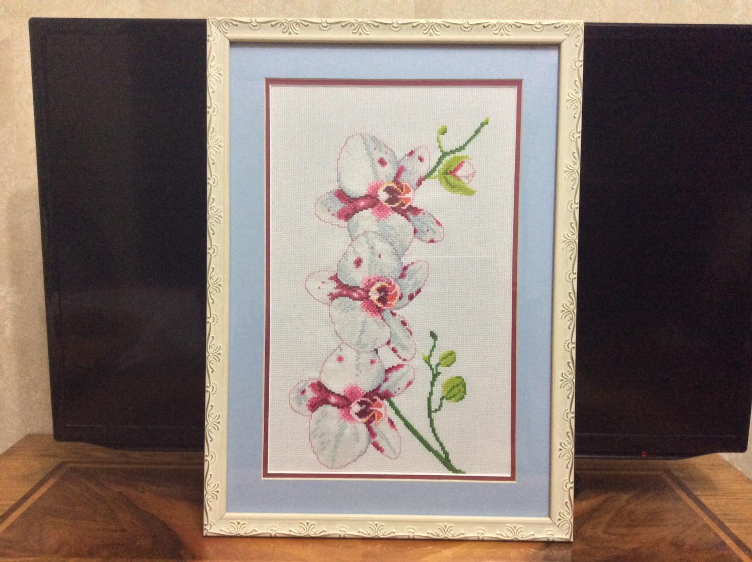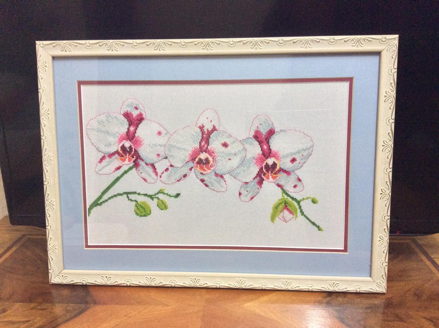 15 октября 2015 Девочки,всем привет!!! Закончила я вышивать Орхидейку и вот,что у меня получилось!!! И уже успела оформить ее,так что с подарком я успела,на выходных будем дарить!!! Освещение ужасное,но очень хотелось поделиться с Вами!!! Не скажу,что я в восторге от такого оформления,чувства протеворечивые,но в общем мне нравится, в-принципе получилось очень нежно! Но я изначально представляла ее просто в белом багете,чуть тольще чем этот и с бордовом паспарту,но такое оформление как оказалось очень "кричащим" и отвлекал от самих цветов,поэтому по совету самого багетчика разбавили голубым! А еще меня очень сбили с толку, многим кажется,что эта работа должна висеть по вертикале,я совершенно не вижу в таком положении работу!!! И что,самое интересное, багетчик сделал крепление именно под вертикальное положение,и сейчас я прямо загнанна в тупик,даже и незнаю как лучше,хотя я склоняюсь к горизонтальному положению! А вы как считаете??? Маша, привет! С завершением работы!!! Орхидеи оформились очень интересно! По поводу положения картины мне кажется, что она должна висеть вертикально, просто орхидеи в природе растут вверх (видела на плантации в Тайланде). sheyla55 сказал(а) спасибо Поделиться сообщением Ссылка на сообщение