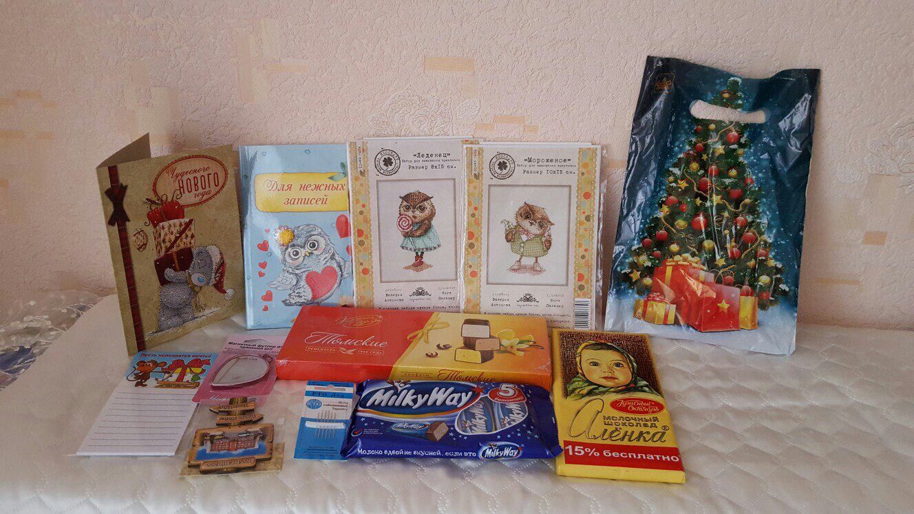 25 декабря 2015 Девочки,дорогие мои,всем привет! Спасибо,Вам,огромное,что не забываете и помните про такую ЛЕНИВУЮ Машу. Совсем я забросила форум,к тому же никак от меня не отстанет невышивальная хандра. Дочка пошла в ясельки,привыкаем к режиму дет.сада, к другим деткам и воспитателям. С трудом нам дается такой распорядок дня,но мы стараемся! Еще у меня произошло очень важное событие,мы всей семьей ездили в гости в г.Электросталь к Олесе (Lesya80) . Долго мы ждали этой встречи и дождались,естественно за все эти чудесные 3 дня,мы не сделали ни одного крестика,ну вы сами понимаете почему Зато от души насмеялись,наболтались и наобнимались! А также Олеся меня одарила мега-хочушными подарками. У меня на одно мгновение потерялся дар речи. Я была и до сих пор нахожусь в таком восторге,что не передать словами! Дорогая моя,спасибо тебе огромное за ваше гостеприимство,за уют,хорошую компанию и за чудесные подарки!!!!Надеюсь,что мы обязательно повторим нашу встречу!!! Очень надеюсь,что я скоро вольюсь в прежний ритм и порадую своими "законченными" процессами....ахаха мечтать-не вредно А еще сегодня ко мне пришли две замечательные и волшебные посылки с подарками! Я на седьмом небе от счастья! Девочки,мои хорошие,спасибо Вам за такое предновогоднее настроение,Ваши подарки просто бесподобные! Вот такой мешок богатства я получила от Риточки ( M@rgarita) А эти бесподобные сюрпризы от нашей любимой Леночки kolpluna Огромное,приогромное спасибо!!! Всех люблю и целую!!! Фро-J, irinka-mandarinka, НатальяП и 18 других сказали спасибо Поделиться сообщением Ссылка на сообщение