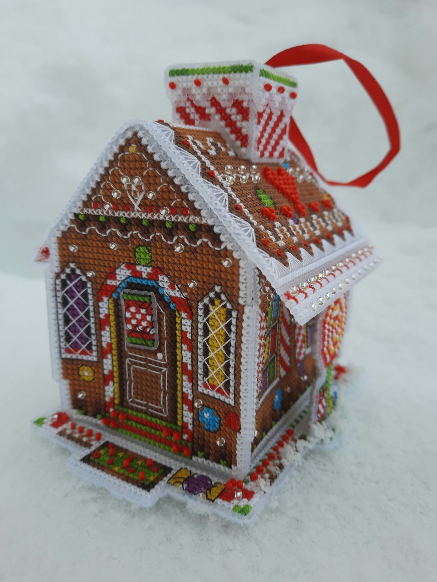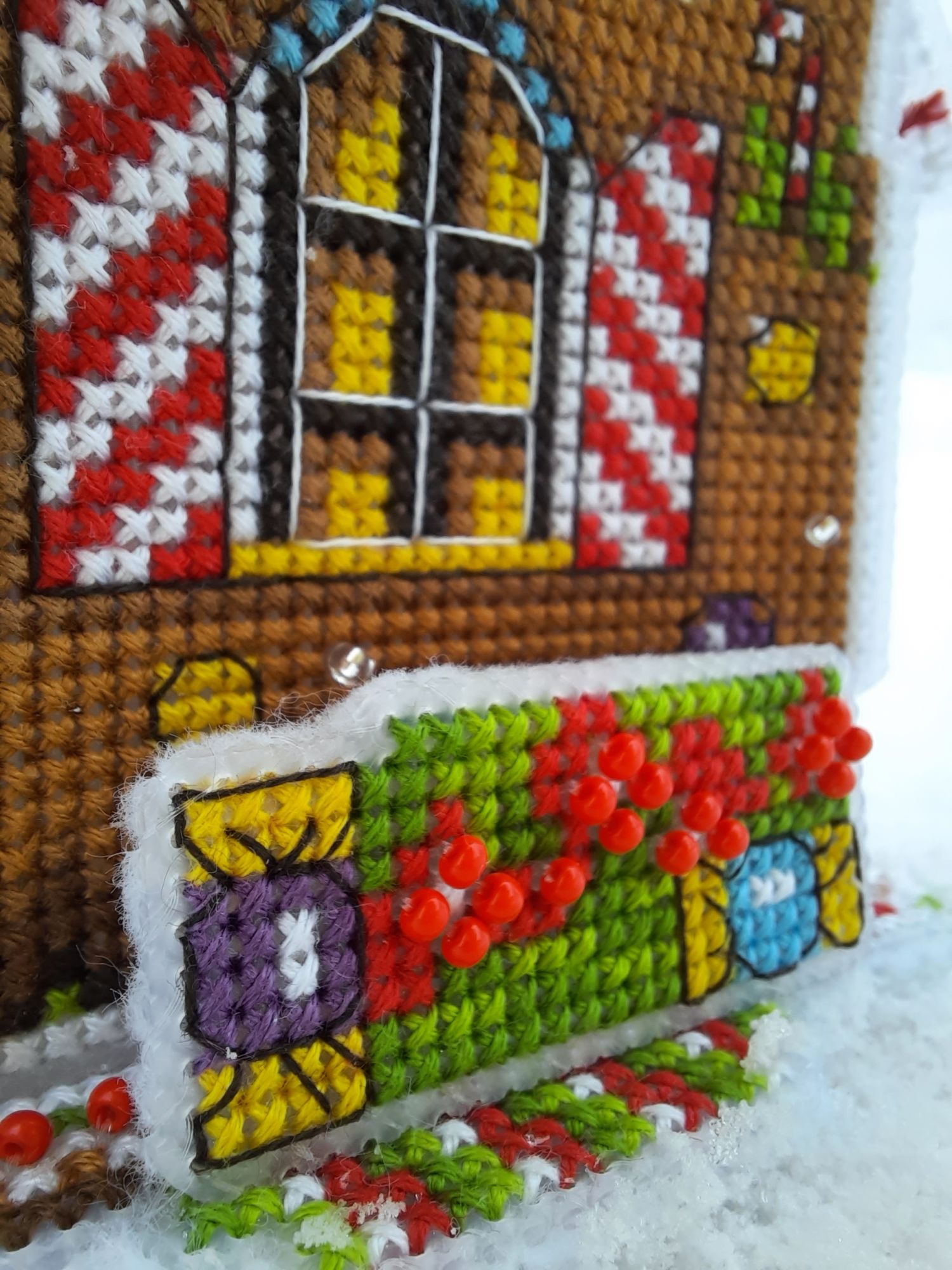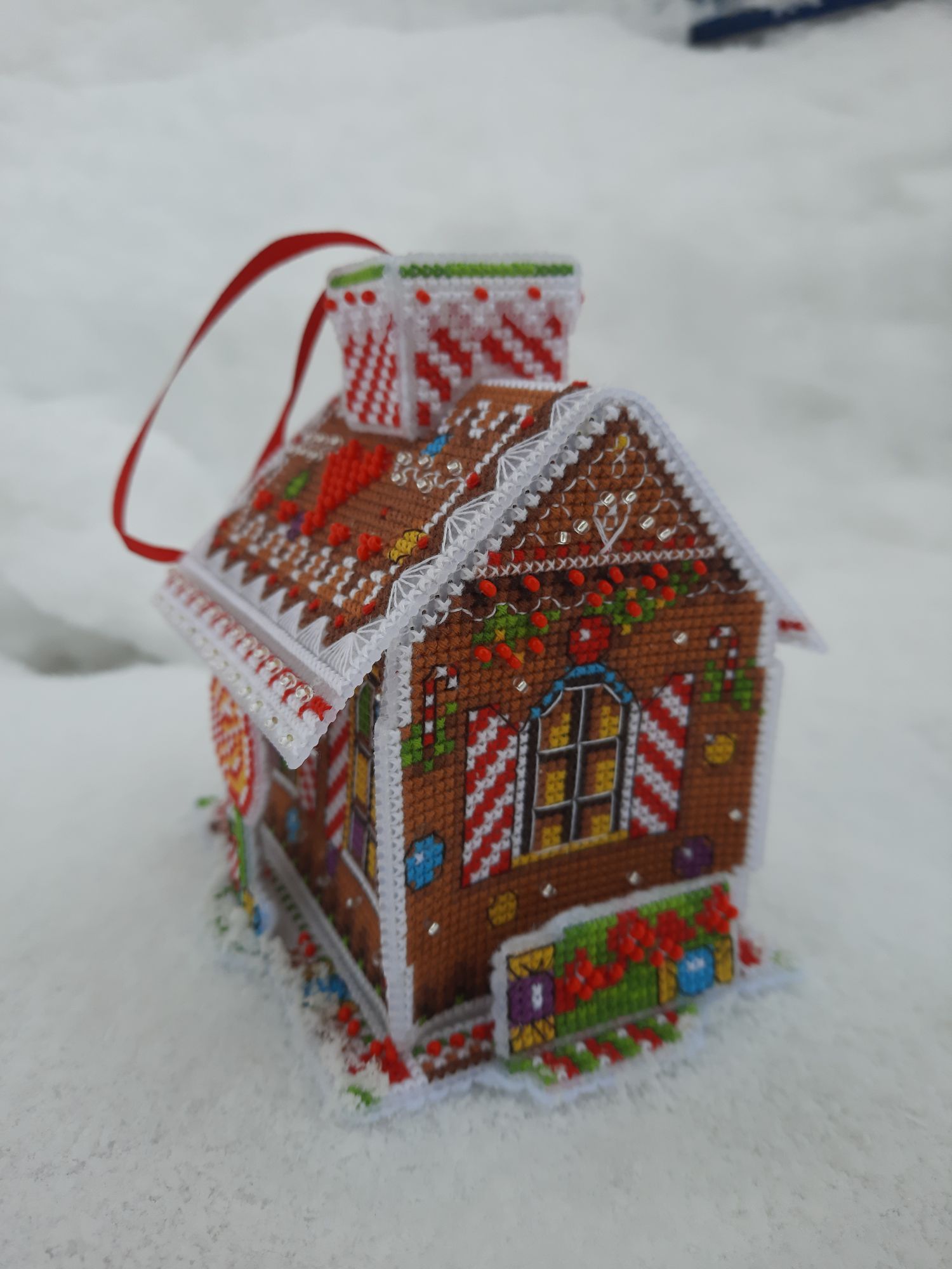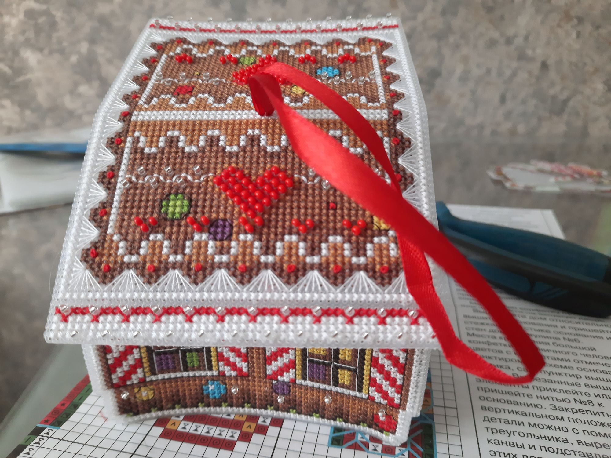 12 января 2021 Время для домика и филина пришло Садитесь по удобнее, будем зеленить гаечку Panna. Пряничный домик. Все детали вышиты. Перед сборкой. Села в ночь, очень хотелось закончить, но переоценила свои возможности и проковырявшись 2,5 часа, ушла спать. А на утро продолжила и провозилась практически целый день Заморочилась с подвесом, ленту просовывала в дырочки между крестами и завязывала на узелок с изнанки. Плюсом решила обшить все детали, у которых изнанка будет видна, кроме крыши, белым фетром. А теперь домик во всей красе. И на ёлочке Вышивала с удовольствием, всё просто. Канвы осталось почти целый лист и небольшие кусочки, подойдут для мелочей и брошек. Нитки средней длины, брала по две и мне было удобно. Две иглы, одна тонкая и короткая, видимо для бисера, но не весь серебристый через неё проходит. Я бы положила в набор действительно бисерную иглу. Бисер чешский, ровненький. Красного осталось 10-15 штучек, серебристого много. Ниток половина или около того. Так что, если кому нужны остаточки, я с удовольствием вышлю. Схема крупная цветная, не глянцевая, удобная и понятная на 2х листах. Из изменений: сердечко на крыше вышила не с серебристым бисером, а с красным. О сборке ничего приятного сказать не могу. Производитель пишет, что можете пришивать или приклеивать, можете обшивать или не обшивать детали. Вообще что хотите то и делайте Первым делом надо было сшить стенки, но ни слова, чтобы посмотрели на обложку или, что нужно пришивать одну к другой как бы внахлёст (одна стенка должна на один крестик перекрывать торец другой). И я, конечно же, пришила как пришила из-за чего длинные стеночки встали дугой во внутрь домика. Но это я заметила уже после того как сделала ещё один этап, пришила крышу (как я её отцентровывала и верхний уголок от стенки не хотел красиво стыковаться с коньком крыши - отдельная история) и почти пришила дно. В общем не стала всё разбирать и переделывать, постаралась закрепить центр стеночки к крыше и немного подтянуть её. Пластик плохо гнётся, это не ткань, подлезть очень сложно, особенно вытащить из какого-нибудь угла иголку. Сделала вывод - пластик люблю, этот дом тоже, но больше 3Д игрушки на пластике не шью. Собирала, кстати, монониткой, что тоже добавило трудностей к сборке. В целом результатом более чем довольна. Всем он очень нравится, домашние относятся к нему с особым трепетом, а у гостей он вызывает восторг. У меня же гордость за наше творчество, любовь и воспоминания о том, кто его мне подарил Светик, спасибо тебе огромнейшее за этот чудесный вкусный домик! lenning, nata2017, Маса и 15 других сказали спасибо Поделиться сообщением Ссылка на сообщение