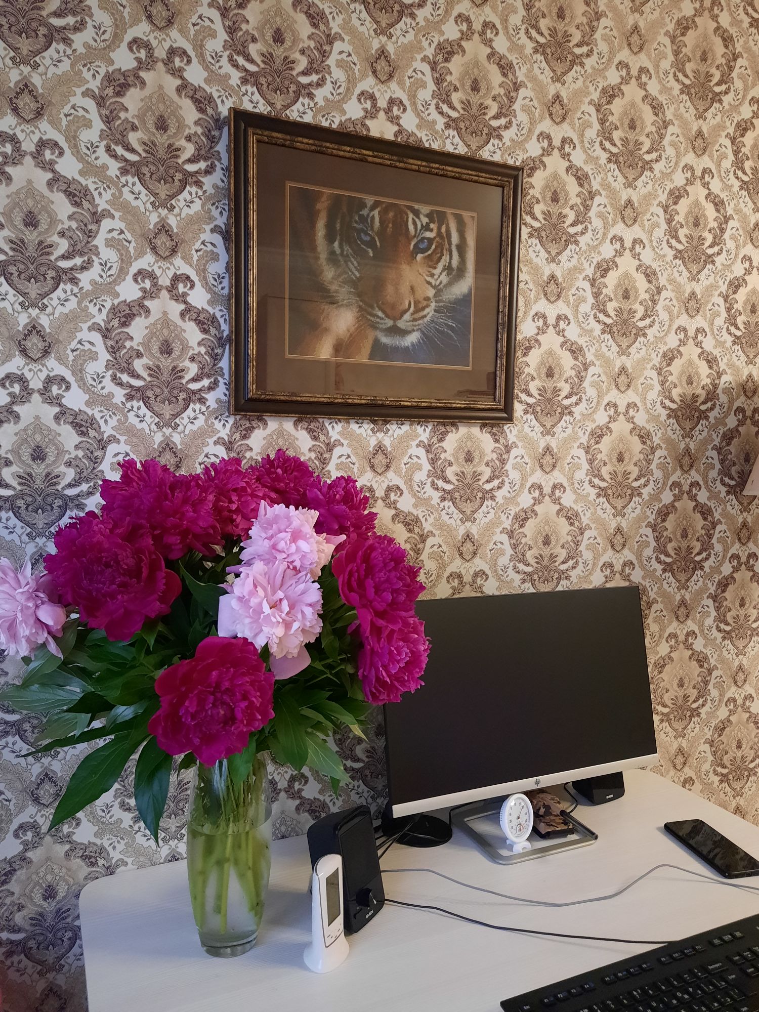 4 июня 2021 Пора уже отчитаться Отпраздновали вчера день рождение мужа в тесном кругу самых близких. Моя мама, как всегда, подарила любимому зятю пионы Как проводили гостей, устроили фотосессию для всех желающих)) Паша без стиснения тоже вдоволь нафотографировался со своим букетом а это моё любимое! Вот так теперь цветы украшают его рабочий стол и тигру На улице у нас больше месяца было лето, без дождя и гроз, чаще всего до +37. Но теперь уже похолодало и пришла осень дожди, до +20 чаще с северным ветром. Бывает и +25, когда из за туч после дождя выходит солнце. И так ещё хуже чем жара! Толпы мышек, духота и излишняя влага, которой невозможно дышать! Скорее бы снова лето. А пока было тепло, я сфоткала ещё одно своё продвижение в цветах Nova Sloboda. Богородица Казанская. / В другом бисерном процессе я достигла экватора Ура! Золотые Ручки. Мышки-хохотушки. / Полностью вышито окошко с цветочками на подоконнике, голубая бабочка, окошко с розовой шторкой на двери и отдельными бисеринками начинают появляться мятная травка и жёлтые цветочки. Продолжаю дальше и до завершения не планирую откладывать и останавливаться. Продолжение следует... Catopuma, nogres, nata-g и 10 других сказали спасибо Поделиться сообщением Ссылка на сообщение