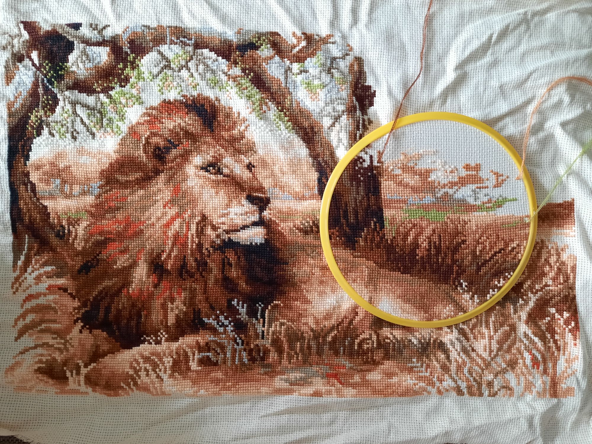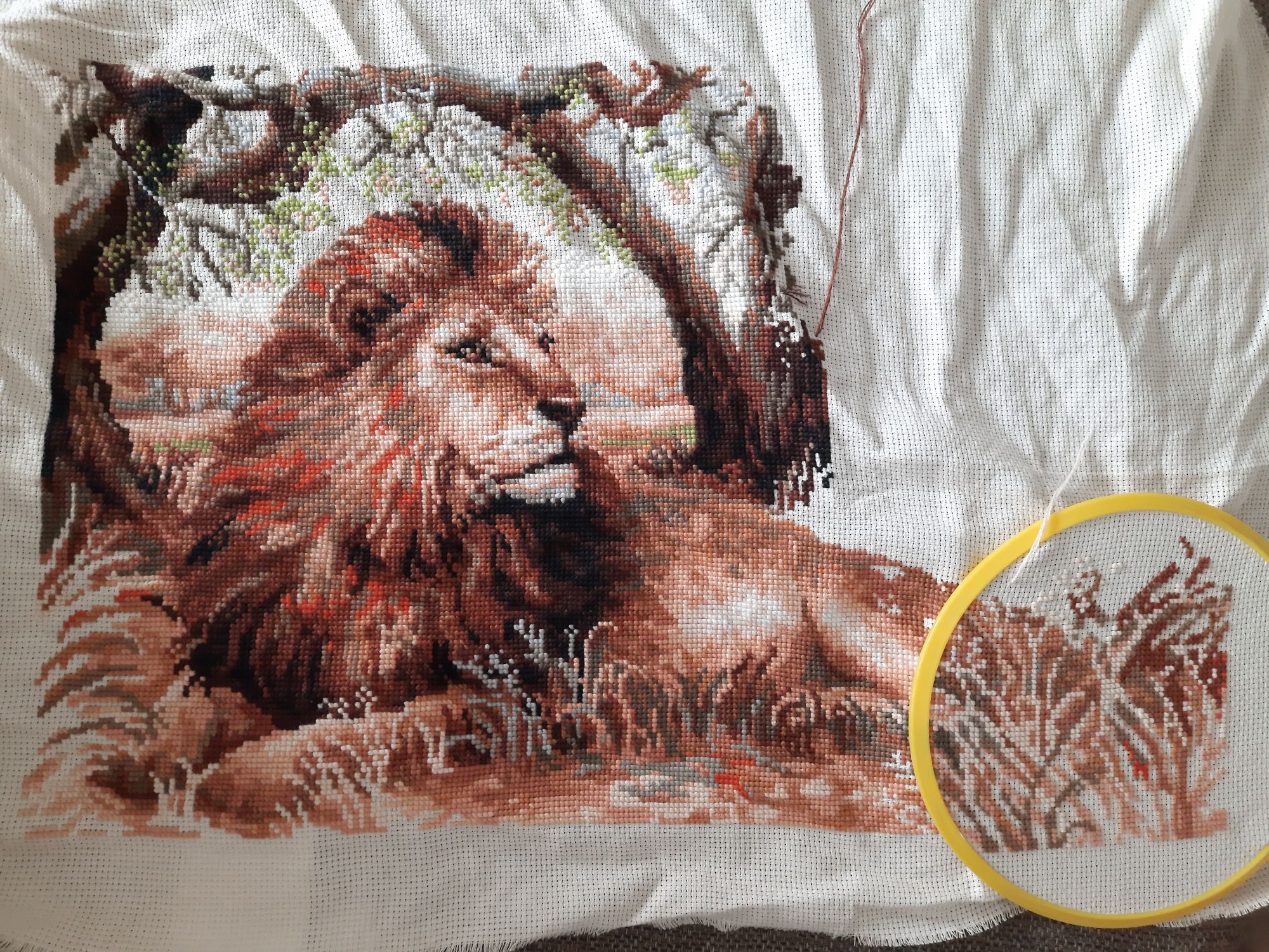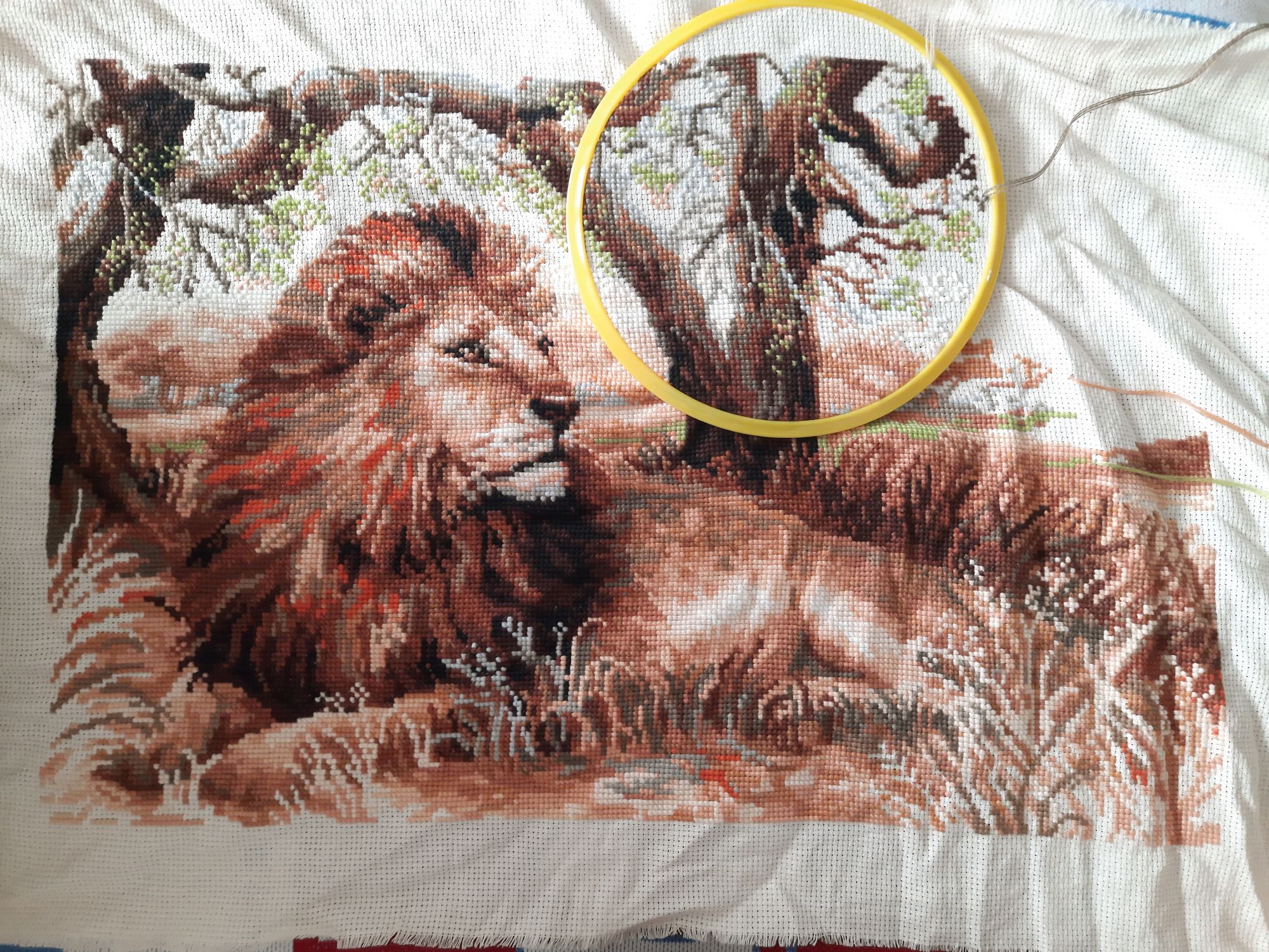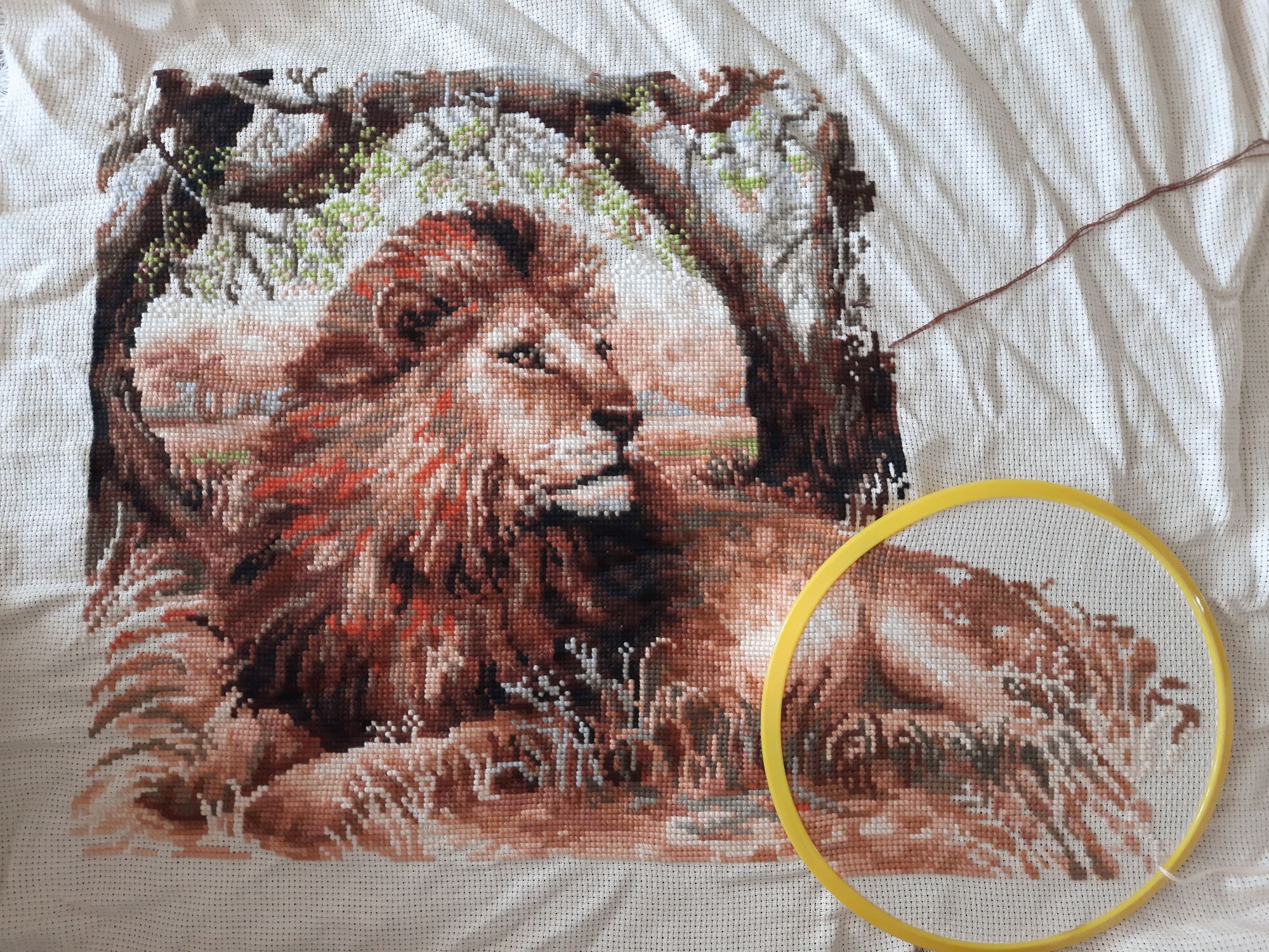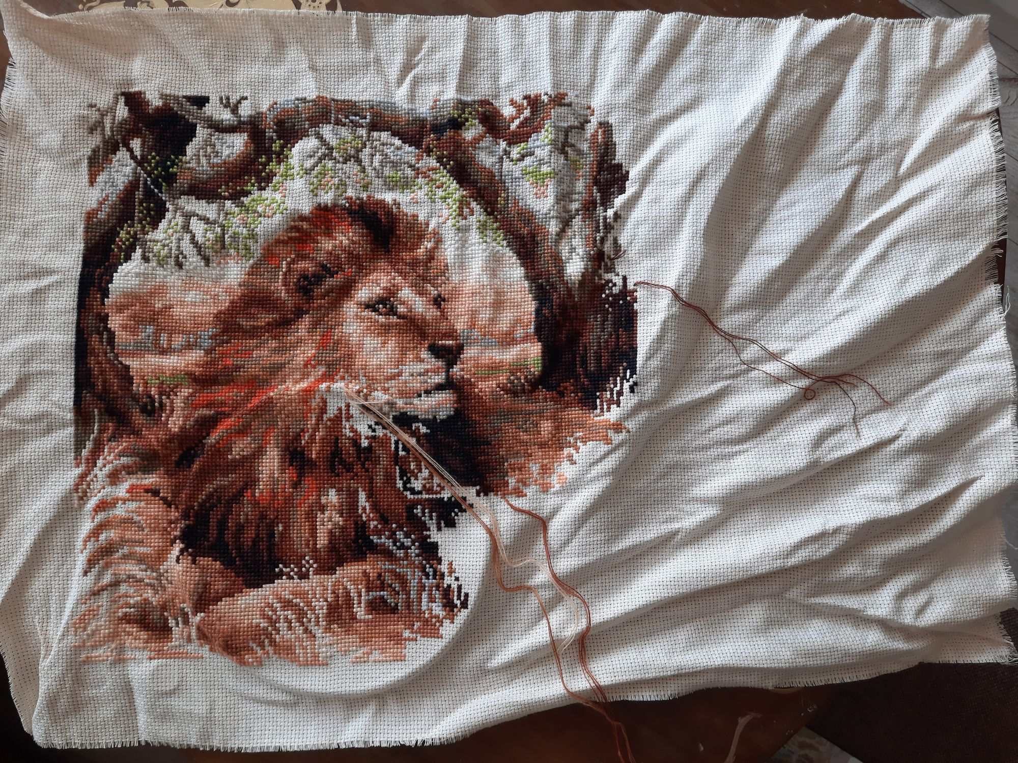 22 мая 2024 Всем привет Объявилась пропажа)) Вышивала понемногу, а сейчас стабильно практически ежедневно. Причина -вышивка на заказ. Спешу ко дню рождения в июле. Кажется одаряемый - лев по гороскопу) Риолис. Царь зверей. Размерчик большой 60х40, но зашивка не полная. Канва крупная, вышивать легко. Ниточки шерсть. С ними у меня проблем нет. Вообще без разницы чем и на чём вышивать)) Цветов 20 и из них меня радует только зелёненький) На данный момент вышито чуть более 30%. Уже есть замечание. Зачем одиночки? Такие яркие большие пятна и практически нет плавного перехода между ними. Зачем тогда впихивать один несчастный крестик Их я не вышиваю, закрываю ближайшим цветом. Охотница, танюша123, Забава_ и 15 других сказали спасибо Поделиться сообщением Ссылка на сообщение
