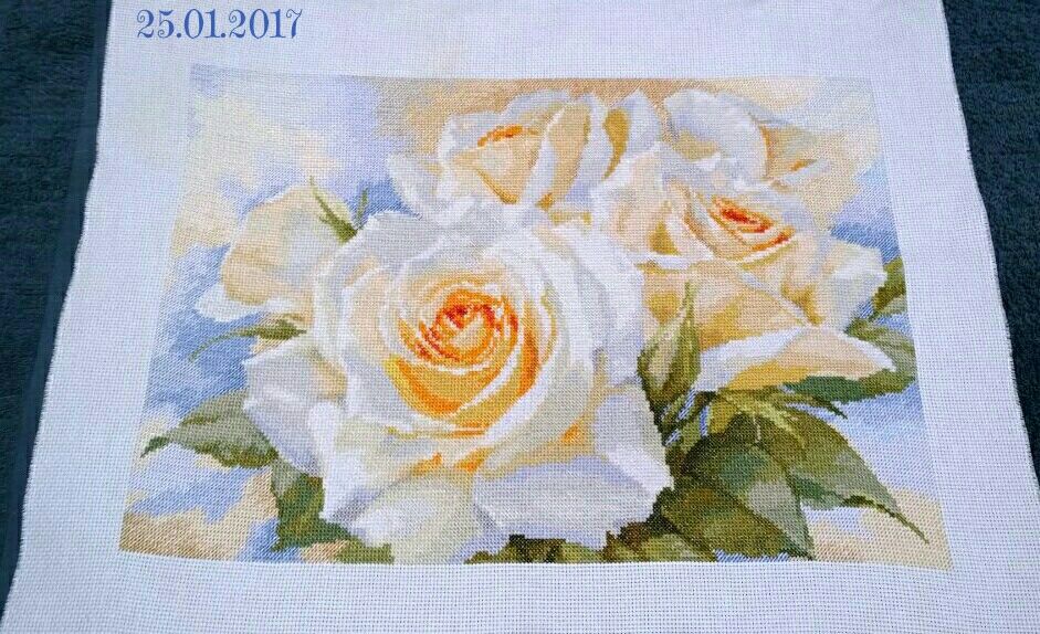 2 декабря 2016 Розочки оказались совсем не белые,как заявлено автором. Сочная рыжая серединка,кремовые лепестки с нежно- голубым налетом. Не могу похвастаться тем,что эта вышивка дается легко и просто. Очень много блендов и нижним полукрестом одной нитью + верхним полукрестом другой нитью. Замедляет процесс. Но очень эффектно смотрится. kreolka и bieloczka сказали спасибо Поделиться сообщением Ссылка на сообщение