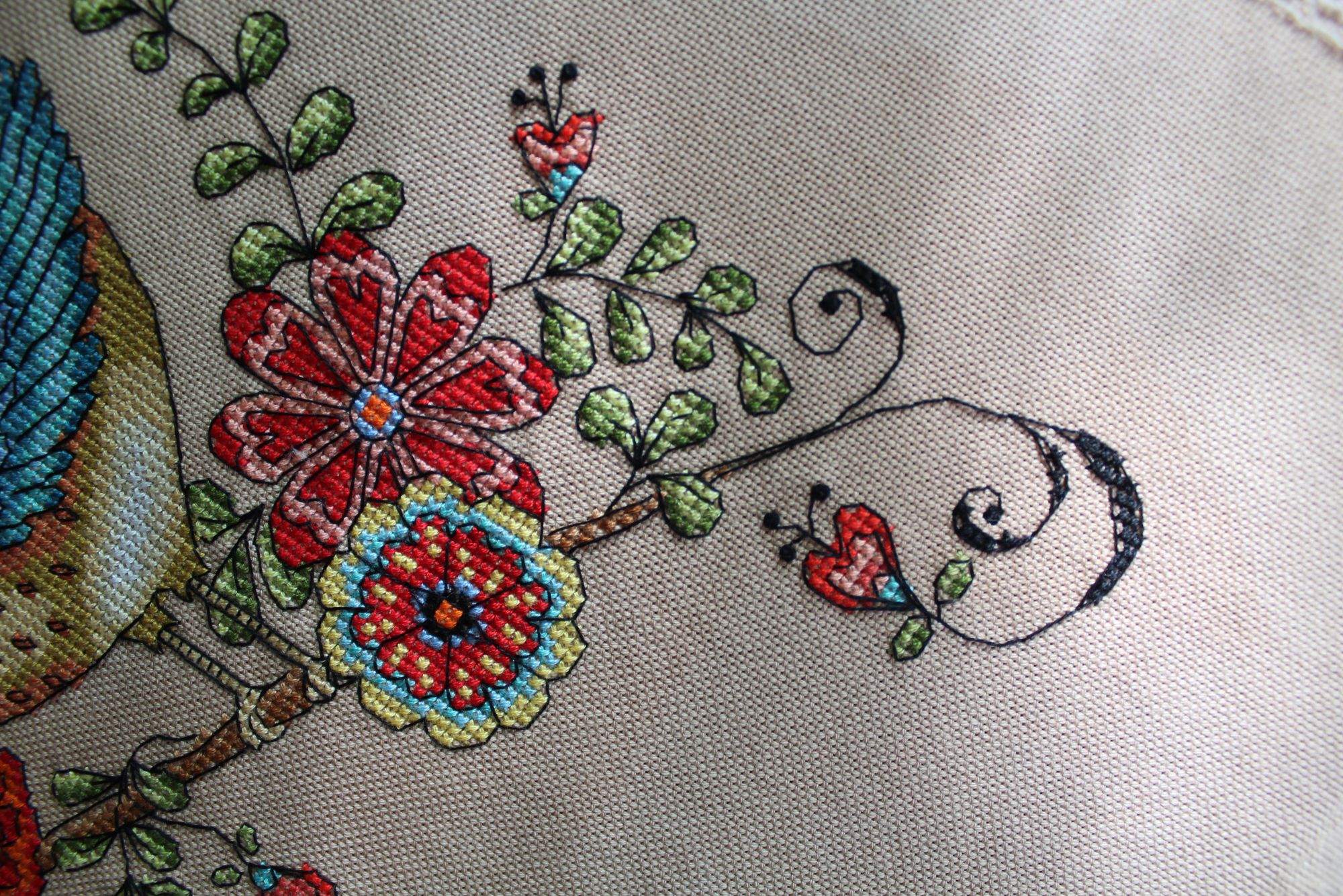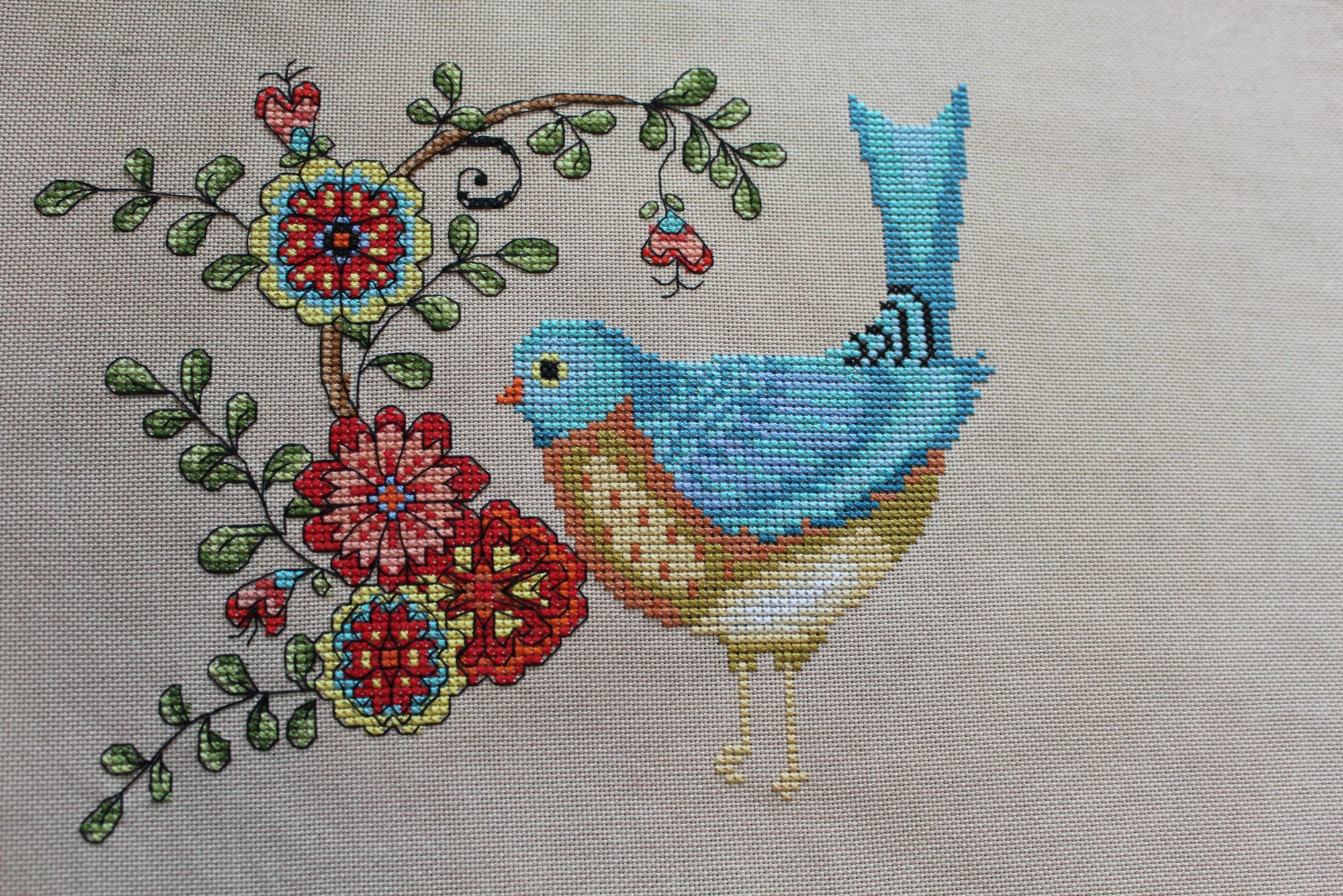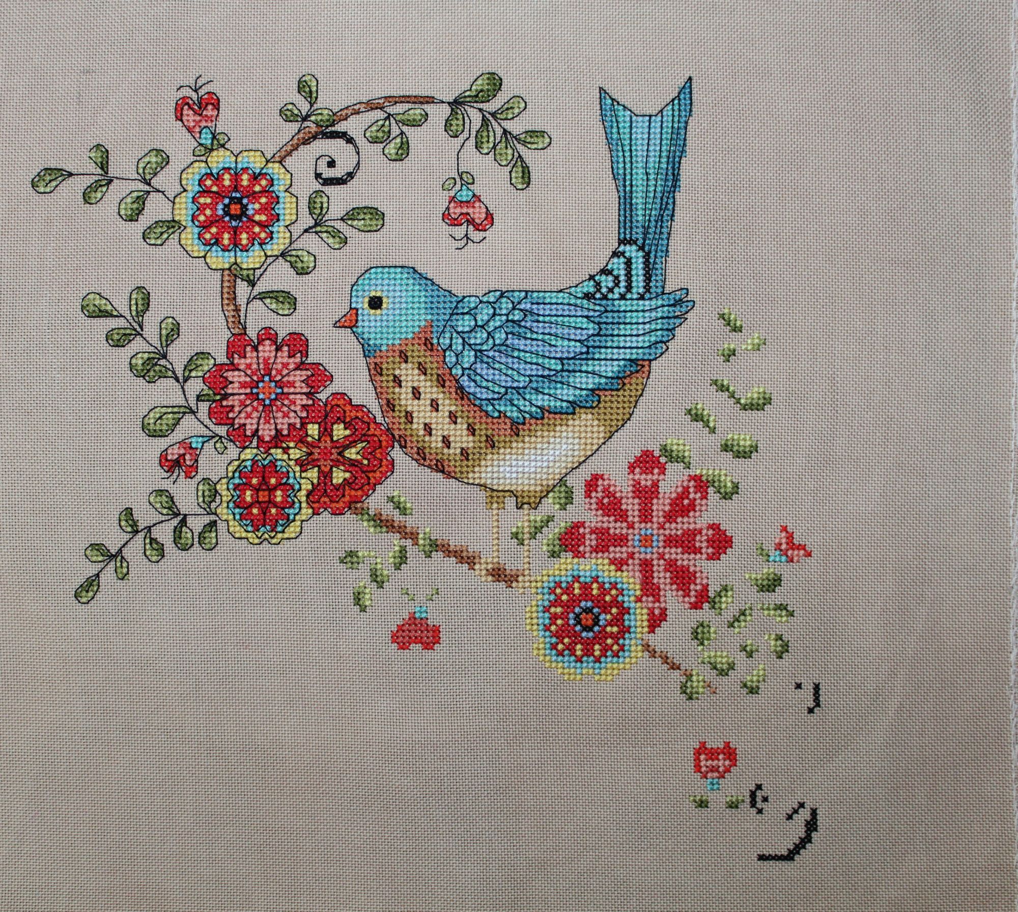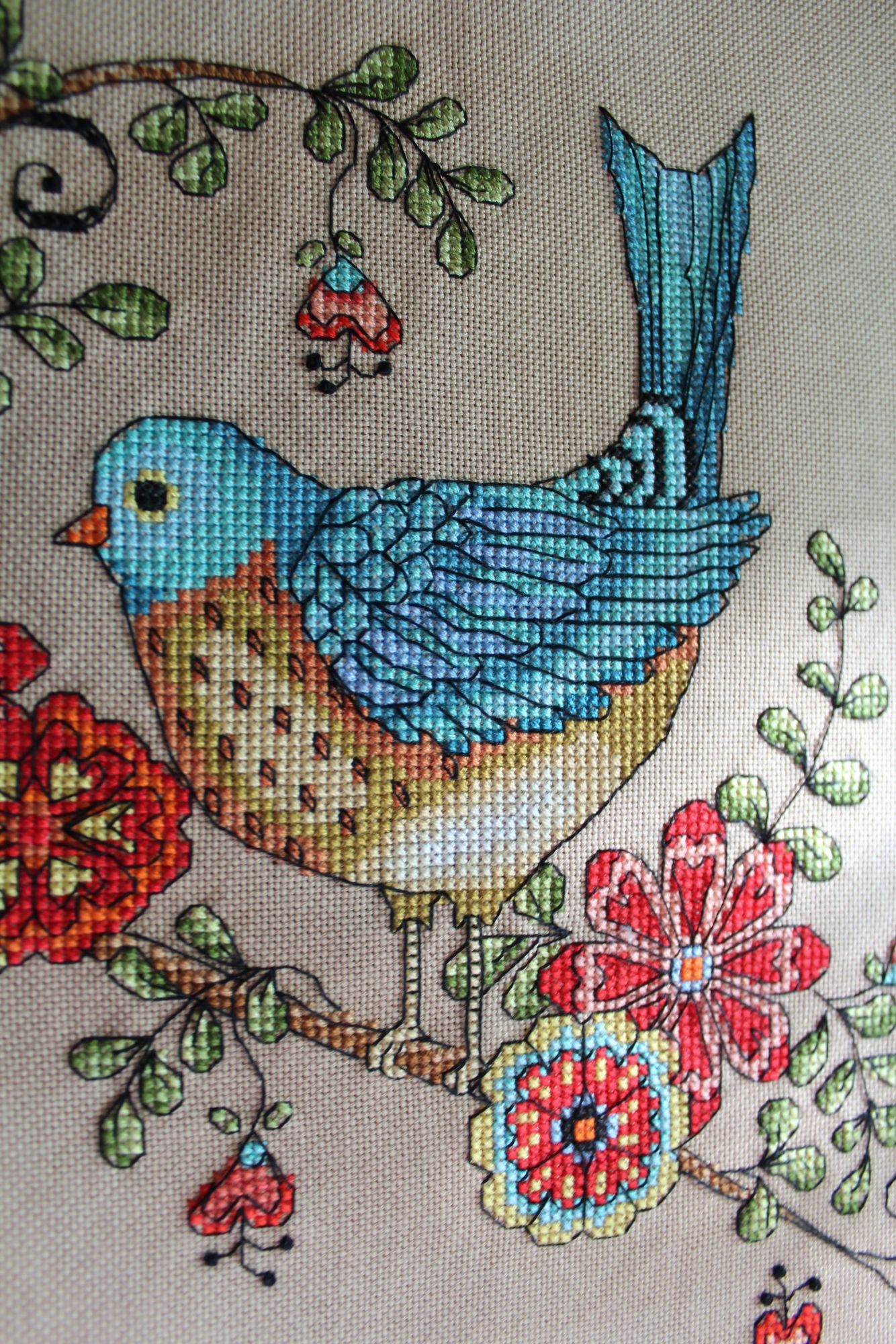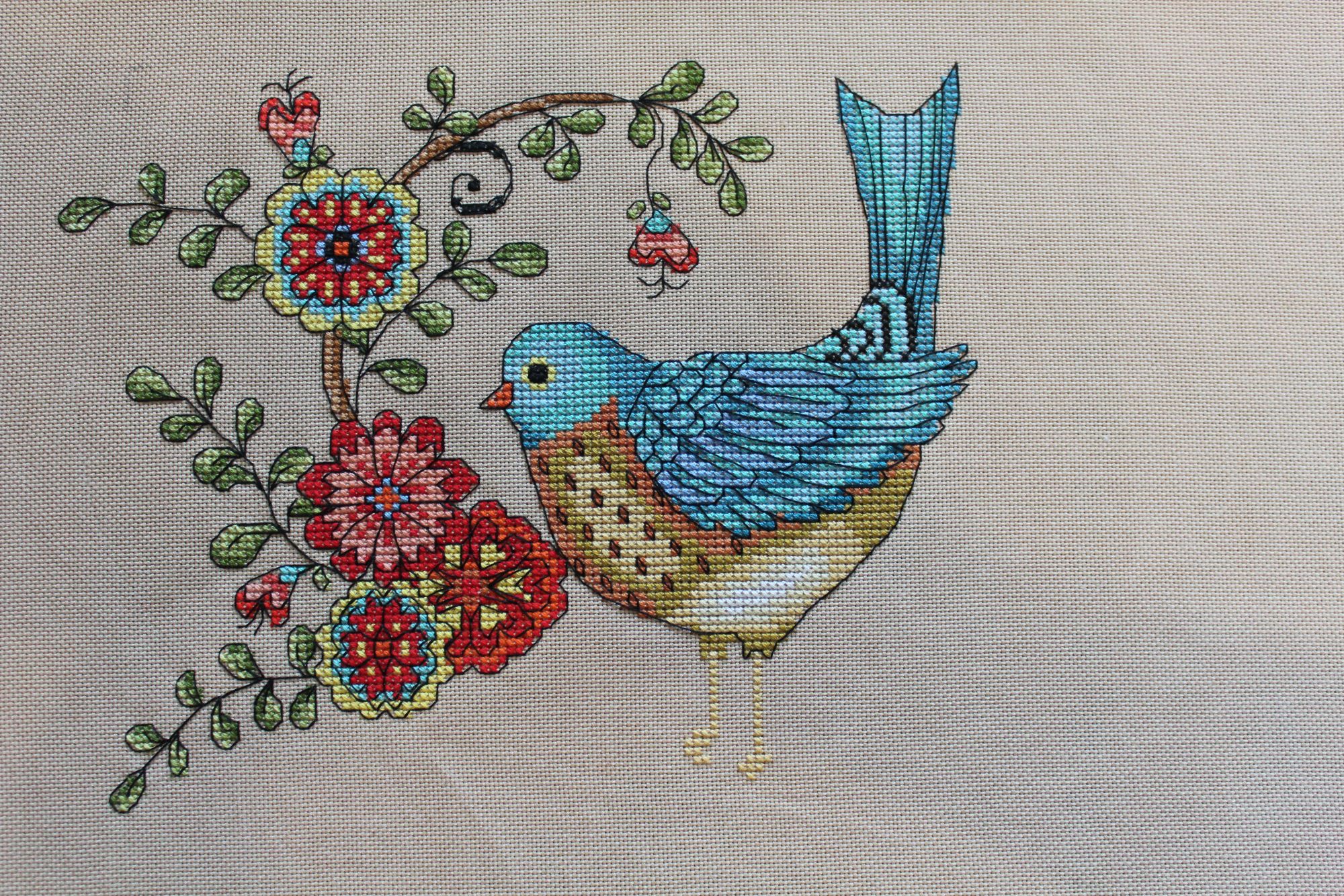 27 мая 2019 Добрый день! Показываю, что навышивала за месяц! Первым делом , с большим удовольствием, вышивала ягуарчика, какая морда шикарная получается! Продвижения КК "Портрет ягуара". Итак, моё знакомство с Панной , я пейзажи очень люблю, но редко вышиваю, т .к. схемы обычно самые сложные. В данном наборе используется чистых цветов 56 и моих "любимых" смешанных аж 53(!), похоже столько в моей вышивальной жизни впервые! Чтобы меньше путаться и ошибаться, а также для удобства вышивки по цветам использую разметку и закрашиваю вышитые значки. Пока, на вышитом участке, не скажу что было сложно, почти все цвета используются в большом количестве и менять нить часто не приходится. А вот канву похоже заместо заявленной 16 положили 18! Решила не менять, но, размер если уменьшится, я не буду в восторге! Ах, да, совсем забыла, спасибо Татьяне Барракуда, наборчик был подарен мне ею! Продвижение Панна "Сосна на берегу реки". У Ольги Владимировны увидела процесс по знакам зодиака и так понравился козерог, что захотелось тоже, у меня мама козерог. Все прошлое лето просила меня вышить, решила что надо уважить , тем более он занял всего неделю! Честно говоря, показался вначале слишком замороченным неоправданно. Но после отшива, я поняла до чего же он хорош, фото не передает всей красоты! Заставила понервничать металлизированная нить, которой нужно вышивать очень много! Помучавшись половину, решила прочитать, как ею вышивать, ибо сильно перетирается в ушке иглы или выскальзывает! Вот так рекомендуют делать, складываем нить пополам, продеваем  иголку в петельку и затягиванием, держится все хорошо и ничего не выскальзывает.Результатом очень довольна, но похоже нужно оформлять с музейным стеклом, чтобы не утратить этот блеск! Новый процесс закончен Панна ЗН-931." Знаки зодиака.Козерог." Давно нравилась эта птичка, может по содержанию и не примитив , но по сути он самый! Но что-то в ней есть! Благодаря Оле Оленёк осуществила мечту! Взяла равномерку, окрашивала один раз чаем для одного дизайна, так цвет мне понравился, что решила и для птички покрасить. Но цвет так и не удалось сфотографировать, птичку передает в правильных цветах, а канва нет .Схемаая и значки плоховато видно да ещё бэка много, поэтому иногда долго всматривалась и ошиблась на первом цветочке и долго не могла понять где! 13 цветов у меня нашлись ДМЦ, а 10 подбирала по фото, сильно выручили остатки от фонаря РТО и маки Мережки. Цветочки не вызывали нареканий, а вот птичка не так проста, хоть и примитив , но цвета должны сочетаться.И, когда начала её вышивать, меня и сомнения терзали и не нравилось, пока бэк не сделала, вроде неплохо! Ещё где-то ошиблась и птичка уперлась грудкой в цветок, хотя по схеме разница в две клетки! По схеме должен пришиваться бисер на хвост и много фрузиков на голове и ножках, но мне не нравится, не делала! И надпись тоже не вышила, не люблю их. Сейчас на фото увидела, что бэк не поправила на хвосте, некогда теперь делать другое. Сегодня уезжаем к родителям! Новый процесс закончен Design Works 2789 "Be Joyful" TheSunniestDay, Юнона1960, Гало4ка и 45 других сказали спасибо Поделиться сообщением Ссылка на сообщение