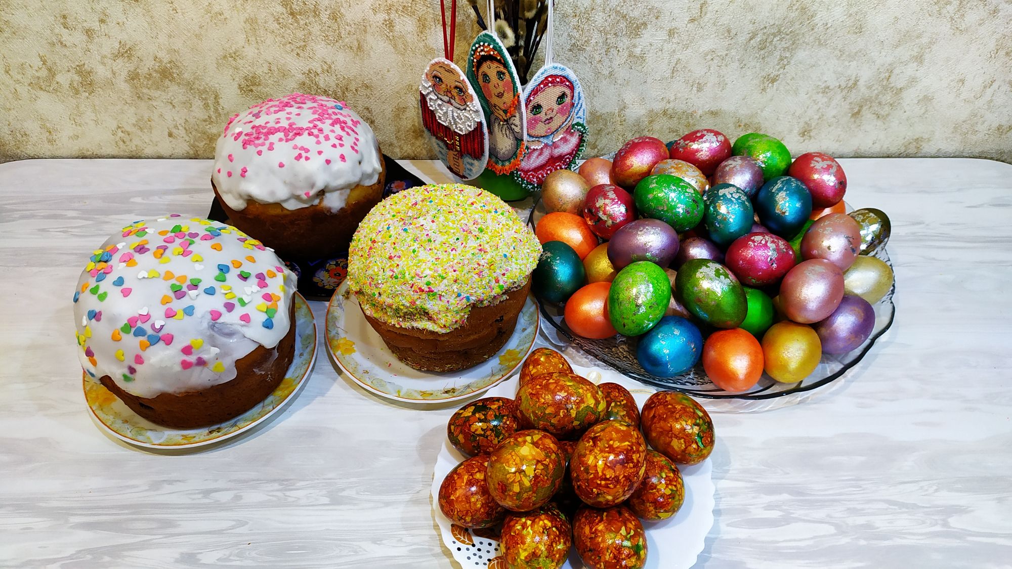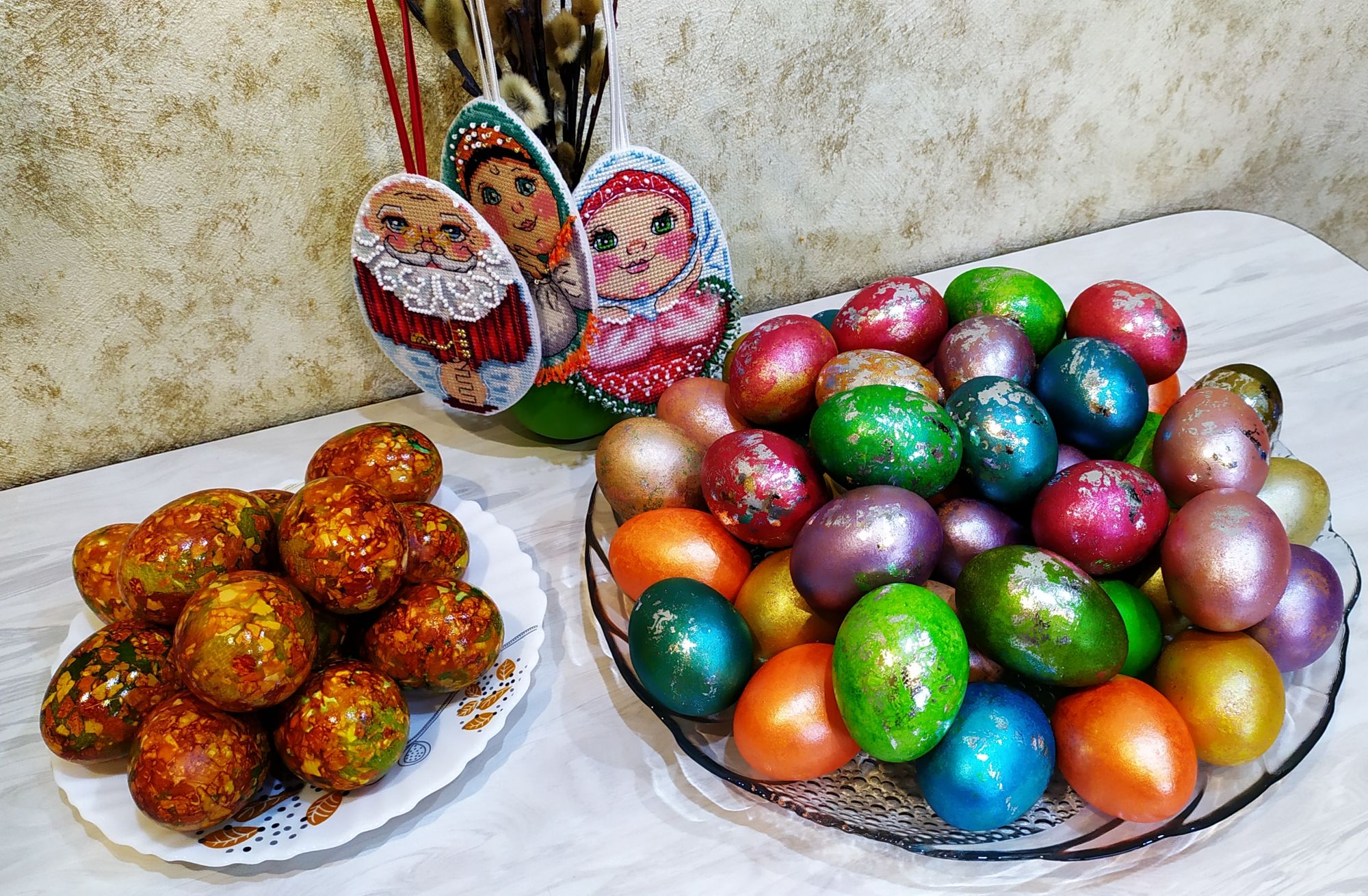18 апреля 2020 Девочки всем привет! Извините, что сразу вам не отвечаю, у людей карантин, а я пашу как папа Карло, замоталась совсем. Из вышивального показать нечего ! На днях продолжила сапожок, вышила так прилично, потом поняла что где то зихернула и что то у меня не стыкуется, начала искать ошибку. Пол дня провозилась, вдоль и поперек всё пересмотрела пересчитала, еле нашла, потом распускала, итог плачевный: за весь день 40 крестиков. Ну да ладно, давайте я лучше приглашу вас к своему пасхальному столу! Только сегодня поняла, что пасха самый мой любимый праздник после нового года. Очень люблю экспериментировать с покраской и крашением яичек. Вроде все делаешь просто и краски те же, а всё ровно каждый раз всё по разном получается. Нынче использовала вот такие наборчики с красителями. Давно хотела попробовать покраску с фольгой и вот что у меня получилось. Мраморные яички это тоже новый опыт, очень понравился результат, а главное быстро, просто и эффектно. Если кто заинтересуется напишу рецепт. Ну и прошу к столу, мои куличики и пицца! Egelia, махно, AnnaMarie и 22 других сказали спасибо Поделиться сообщением Ссылка на сообщение