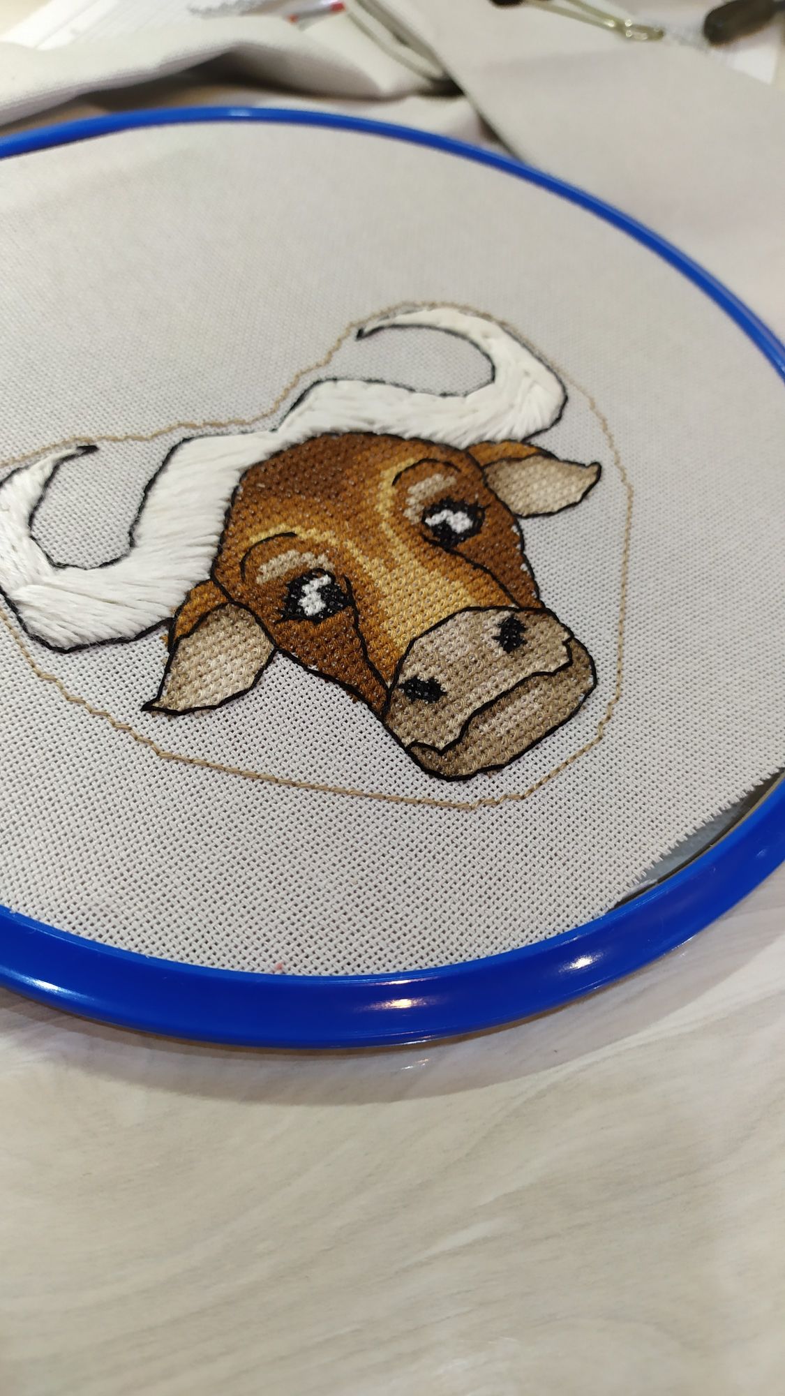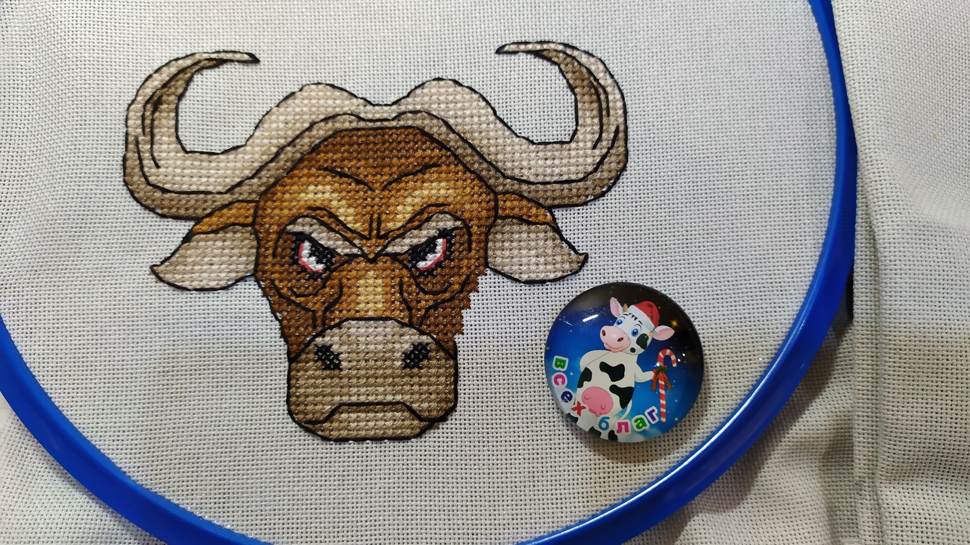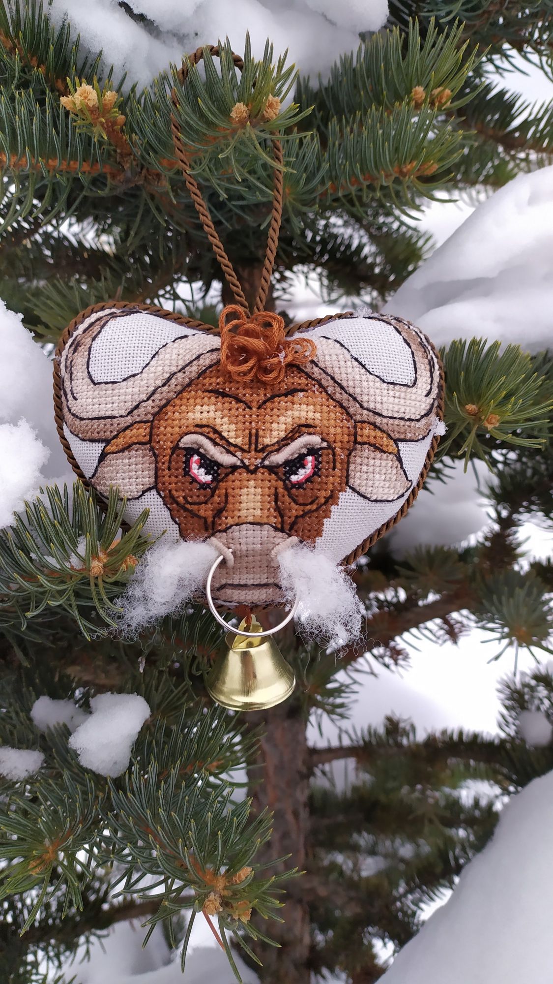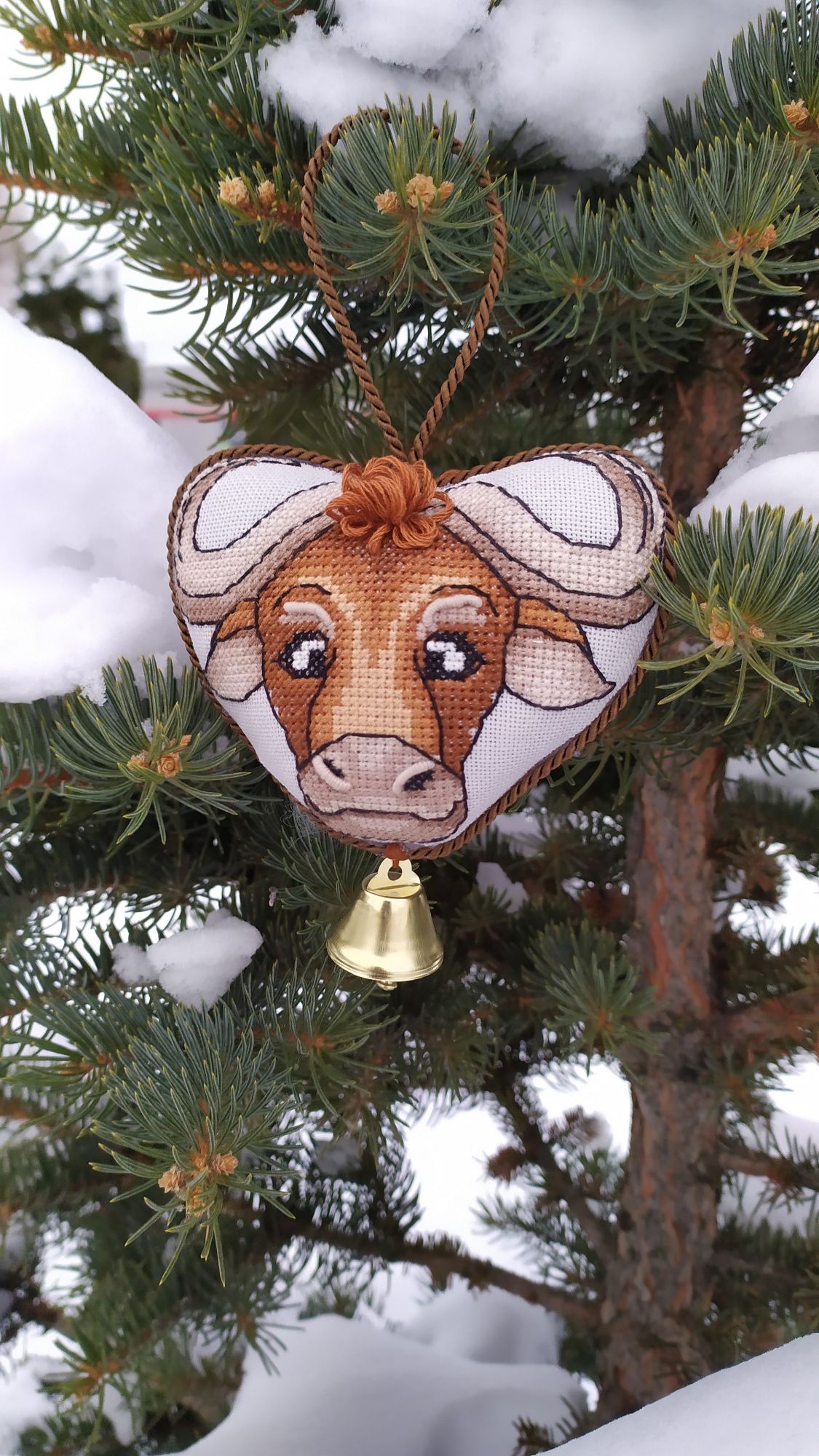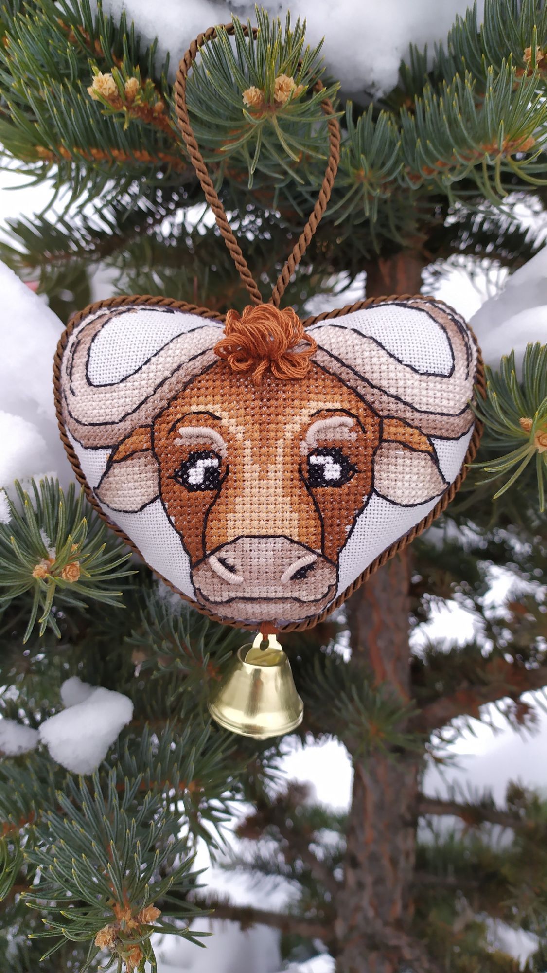 7 января 2021 Всем добрый Рождественский вечерок! Ну вот и первая "ласточка"- финиш 2021!!!! Бычки от Ирины Наниашвили. Вовсе не планировала вышивать двух, думала одного будет достаточно, но после передумала, так как решила сделать игрушку двухсторонней. Дурашка коровка! Это фото не для гайки. Рога хотела сделать гладью и даже настил приготовила, но что то пошло не так и я всё выпорола и прошлась крестиком. С бычком уже так не экспериментировала, но тоже были переделки. Шов рокко к примеру не сразу мне покорился, с кольцом это вообще было что то. Перепробовала штуки 4 и всё было не то и впрочем не так то просто продеть его. После очередных моих попыток на помощь пришёл муж, всё мне аккуратненько вдел. После как всё отшила поняла, что контур вышила по ключу и он на моей серой линде не очень то смотрится, всё распустила и перешила, уже оттенками в тон канве. С серебряным колокольчиком тоже вышла проблема- они просто исчезли в магазинах, кругом одно золото. Был крупный серый бубенчик, но он тоже не очень вписался. Набит синтепухом, внутри картон ( так лучше держится форма игрушки), кофейный витой шнур и впрочем и всё. Грозно- брутального быка вообще не хотела сперва шить, (но он понравился моим домашним). И вот как не странно именно его процесс создания был самым интересным и увлекательным. Очень надеюсь, что дурашка коровка принесёт нам удачу, а брутальный бык будет оберегать наш дом от всего плохого! Сегодня с детьми ездили в храм, после погуляли по местным окрестностям, очень довольны остались прогулкой.На улице просто божья благодать- тепло, безветренно, "барханы" снега, красотища кругом, гуляли и наслаждались. Увидели этого шагающего красавца в витрине магазина и не смогли пройти мимо не засняв его. Возле дома на центральной ёлке. musya, TheSunniestDay, Путешественница и 22 других сказали спасибо Поделиться сообщением Ссылка на сообщение