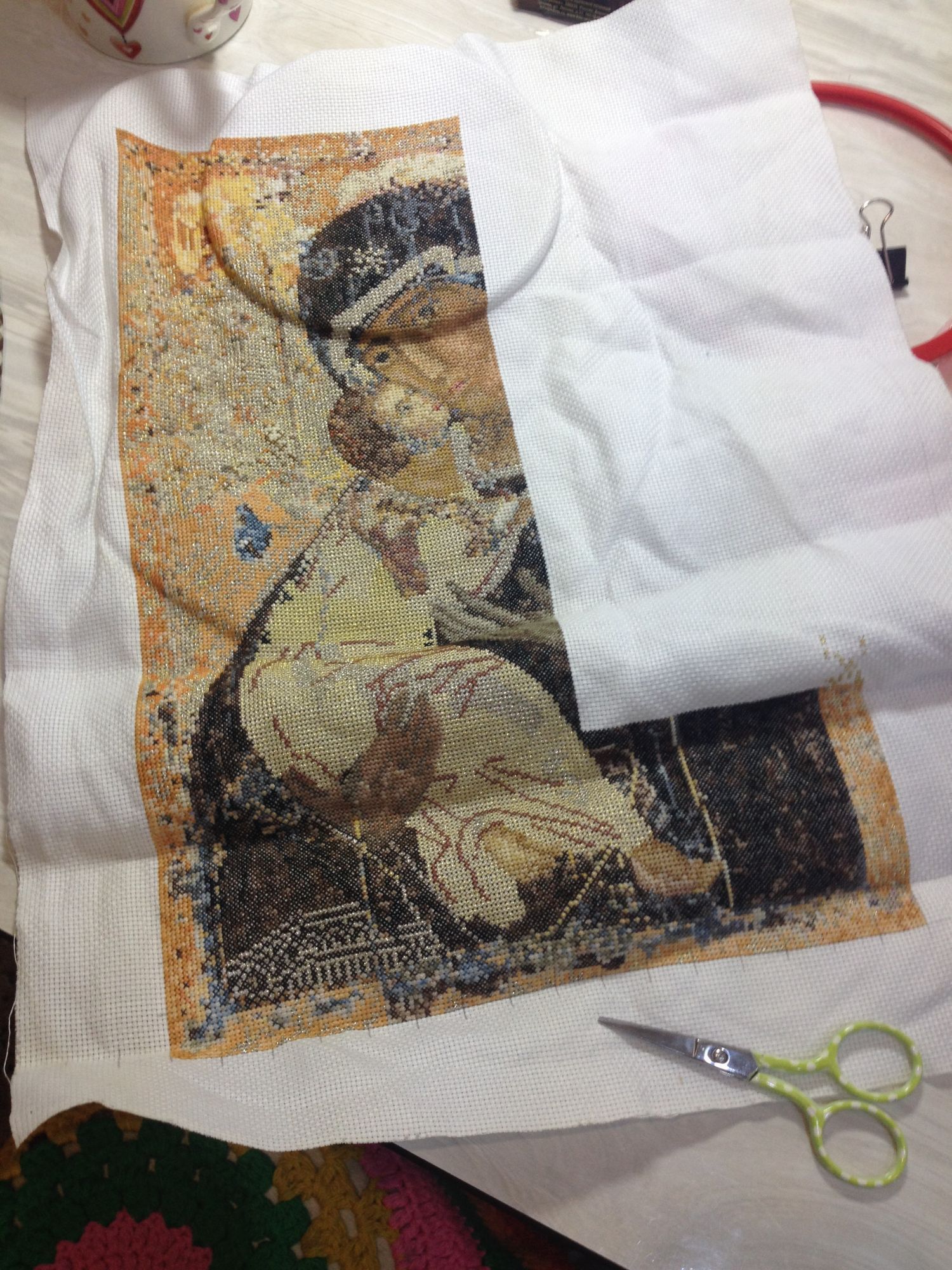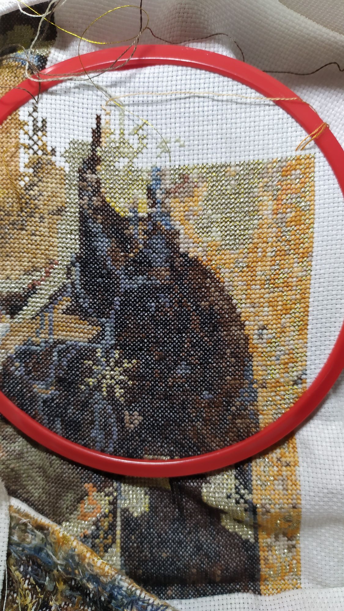 28 февраля 2021 Всем привееет!!! Я к вам спешу с отчётом. Меня распирает гордость от проделанной работы, очень хочется поделиться! Насмотревшись нашего рукодельного Ютюбчика, как там девочки играют в рулетку, устраивают себе рокировки и прочее и подумала, а чем я хуже? У меня был давно залежалый процесс иконы Владимировской, НАЧАТ БЫЛ В НОЯБРЕ 2016я ПРОСТО УЖАСНУЛАСЬ! Мама дорогая это уже каких никаких 5 лет. И вот дала себе слово, наложила табу на все остальные процессы, запретила себе даже думать о них и смотреть в их сторону и с 1 февраля пустилась во все тяжкие. План был отшить икону до конца февраля. На последнем этапе было уже больше половины отшито. Было. Посчитала грубо остаток и вышло у меня примерно 16 тыс крестиков. Ну что сказать: сперва шла тяжко, яж уж половину ниток разбазарила по всем остальным процессам, что то уже позаканчивалось. В общем заново привыкала к значкам, мелкой схеме, добирала нужные ниточки, потом вошла во вкус и дело пошло. Ещё хочу поделиться своими переживаниями и сомнениями: Я ее по всей видимости доставала раз в год и так она у меня лежала в свернутом положении. Когда ее начала разворачивать и распрямлять, она начала вся трещать как старый изношенный лоскут ткани, крестики с металликом все просто скукожились, страшно было ее не то чтобы заново запяливать, а вообще трогать. Мне всё казалось, она от моих движений рук вот вот лопнет. На свой страх и риск ее постирала, отпарила, вроде ничего стала. Но при оформлении всё ровно надо будет предупредить, чтоб особо не тянули, а то кто его знает, вдруг расползется. Металлик конечно всё ровно как ни крути и не укладывай, ровно не ложится, но как уж есть теперь, лучше бы всё ровно не вышила. Еще забегая на перед скажу, что отшить мне её помогли новые пяльца Нурге и новый держатель Нурге ( специально для неё приобрела, чтоб хоть как то себе облегчить работу. Пяльца пришли быстро, а держатель пришлось чуток подождать. Девочки это ВЕШЬЧ!!!!! МЕГА УДОБНЫЙ И САМОЕ ГЛАВНОЕ УСТОЙЧИВЫЙ!!! Я с ним теперь везде могу передвигаться и шить. Первое время не знала куда деть руки, они же свободными оказались! Научилась делать закрепки на лице, ничего не видно всё аккуратно. Ну сперва мои помогайки! Низкий им поклон иначе бы я точно не дошила ее и процесс был бы мукой. Пяльца супер, станочек тоже. Особо на нём останавливаться не буду, есть много обзоров на него в интернете, кому интересно посмотрите. Единственное скажу, что он держит только те, что у меня на фото( рамы, куснапы, самозапяливающиеся металлические круглые нет. Поэтому я дополнительно купила к нему держатель бос, от держит ВСЁ! Просто его надо слегка подкорректировать,( одну детальку отпилить) так как он не подходит на нурге. Пока его еще не модернизировала, но опять же на Ютюбе есть видео, где одна девушка так сделала и всё здорово, собственно поэтому я его и приобрела. Хотела сперва тиски купить, но вот этот мини станочек победил и я очень рада, что его себе как бы на 8 марта купила. Дальнейшее продвижение. Эти пяльца тоже держат здорово! Вот в этом маленьком не отшитом участке 1.5 тыс крестиков, а кажется чуток. И вот он долгожданный финиш, но пока без бэка, а его тут тьма тьмущая, да ещё по капризному металлику. На последнем этапе я уже ныла про себя, глаза уже были в кучу, ныл затылок, шила то я её в основном по ночам. Но понимала, что если остановлюсь, 