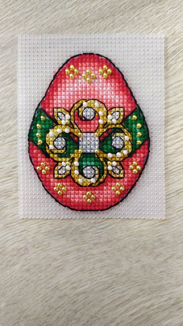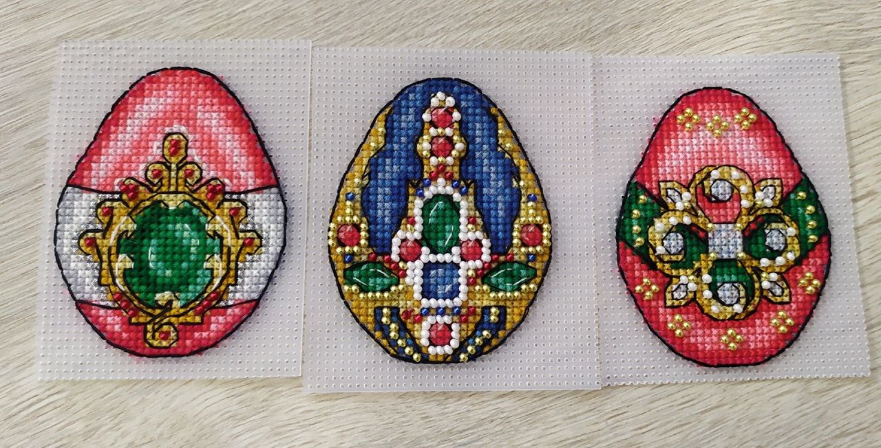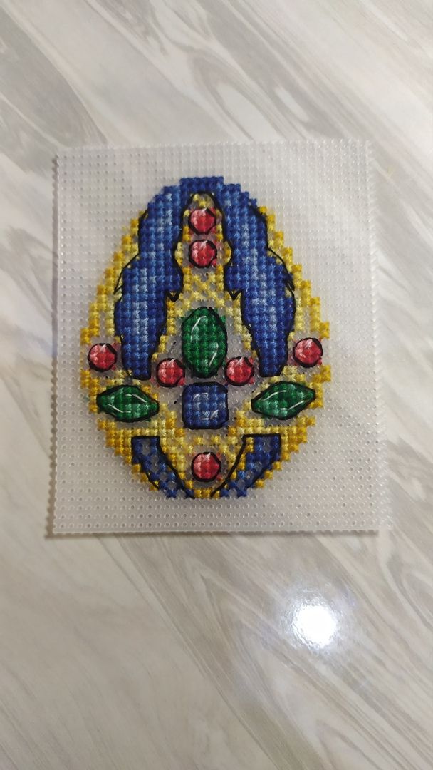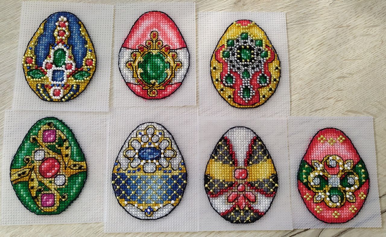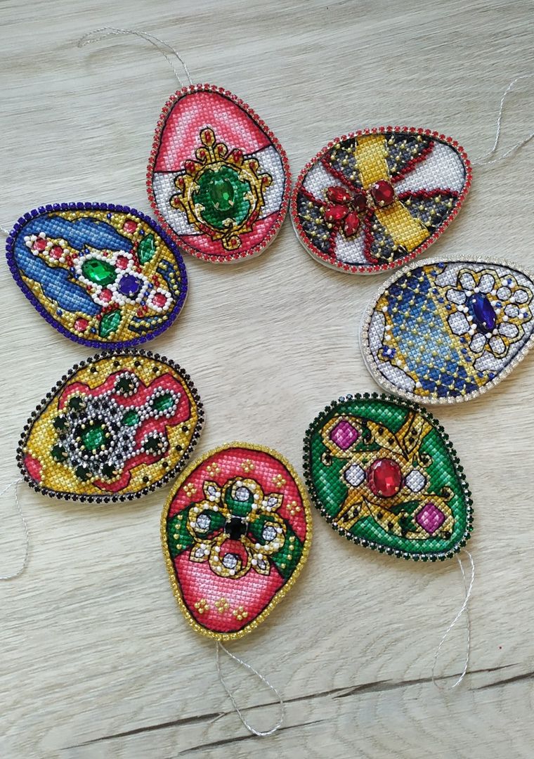 30 марта 2021 Всем приветик! Мы с сыном до сих пор на больничном. 23 Числа сняли гипс, но на ногу полноценно наступать ещё не мог, была опухоль, больничный продлили. Завтра нам на приём, нога ещё болит, но уже получше, наверно выпишут. Как правило после таких травм долго восстанавливаешься, по себе знаю. Ну не будем о болячках, покажу что смогла навышивать за март месяц. Очень хорошо удалось продвинуть пиончик. Было. Стало. Процесс самый настоящий весенний, буйство радужных красок, даже бэк был в радость. Бэкстич выполняется в одну и в две нити. Темный оттенок 938 отлично ложился, а вот с белым пришлось повозиться, как то не совсем ровно ложился и от этого обведенный участок смотрелся как то небрежно и неопрятно. Хотела его завершить, осталась самая малость, но не осилила. Благополучным образом вернулся с выставки Формула рукоделия мой мишка. Приятным бонусом от автора Насти Кравцовой мне был подарен сертификат на покупку её схем, чему я была очень рада. Многие схемы мне нравятся и поэтому не решила ещё что прикупить. Далее была готова новая игрушка от дименшенс. Мой кардинальчик. Было. Стало Сюжет сам по себе очень красивый, вышился на одном дыхании. Фр.уз как нельзя лучше получились, самой даже понравились, но вот выкладная нить кординг дал мне прикурить, переделывала три раза и всё ровно им осталась недовольна. Следующий процесс который мне хотелось в этом году вышить- это Авторская схема ( бесплатная) Аллы Ероховой " Держи яичко" Давно мне эта девчушка нравилась, схемка лежала и ждала своего часа. Вот моя прелестница! Вышивала на 14 аиде, ниточки дмс, размер в крестиках 48x89, 18 цветов, 5 блэндов, виды стежков: крест и бэкстич. Есть идея как её оформить, надеюсь к пасхе успею. Ну а теперь мои фавориты Марта!!! Пасхальные яички "Императорские сокровища" по схемам Натальи Лужанской . Признаюсь честно, что не сразу они мне приглянулись, даже после первых отшивов я ещё сомневалась. Но после того как Света Letka их все оформила я поняла, что тоже их хочу видеть на своём пасхальном столе. Яички очень кропотливые, используется много цветов (ниточки дмс), два вида металлика, несколько видов бисера, много бэка, но поверьте они этого стоят. Первое моё яичко: Тут используется даже бленд. По ключу бисер шёл красного оттенка, но я намеренно изменила цвет бисера на ярко гранатовый. Второе яичко: Здесь всё по ключу. Третье яичко мое самое любимое! Четвертое не менее красивое! Пятое яичко! Шестое яичко! Здесь прозрачный бисер заменила на красный. И последнее! Покажу все отшитые вместе ещё до окончательного оформления! Мне очень понравилась идея Светы Letki обрамлять их в стразовую ленту, так что идея была позаимствована у нее. Но я её крепила по другому. Ход работы: обрезала каждое яичко по контуру бэка, оставляя при этом примерно три миллиметра. Далее с помощью зубочистки на саму ленту очень дозированно наносила клей Титан-100 и прижимала к пластику, держится намертво и при этом не плавит саму основу. Лента очень податливая и ложится отлично. На каждое яичко ушло 23см ленты. При этом она суперски скрывает все погрешности неровного среза заготовки- идея такого оформления пластика просто Бомба! На обратную сторону впервые попробовала фаомиран, так же был приклеен на этот клей. Возможно так же клеить ленту ребром на грань пластика и фоамирана, как сделала Света, так образуется некий з