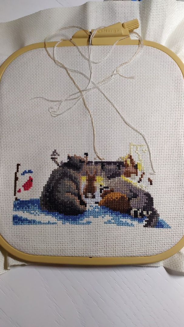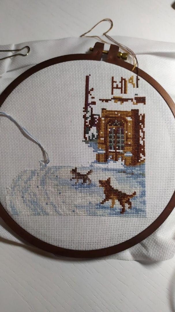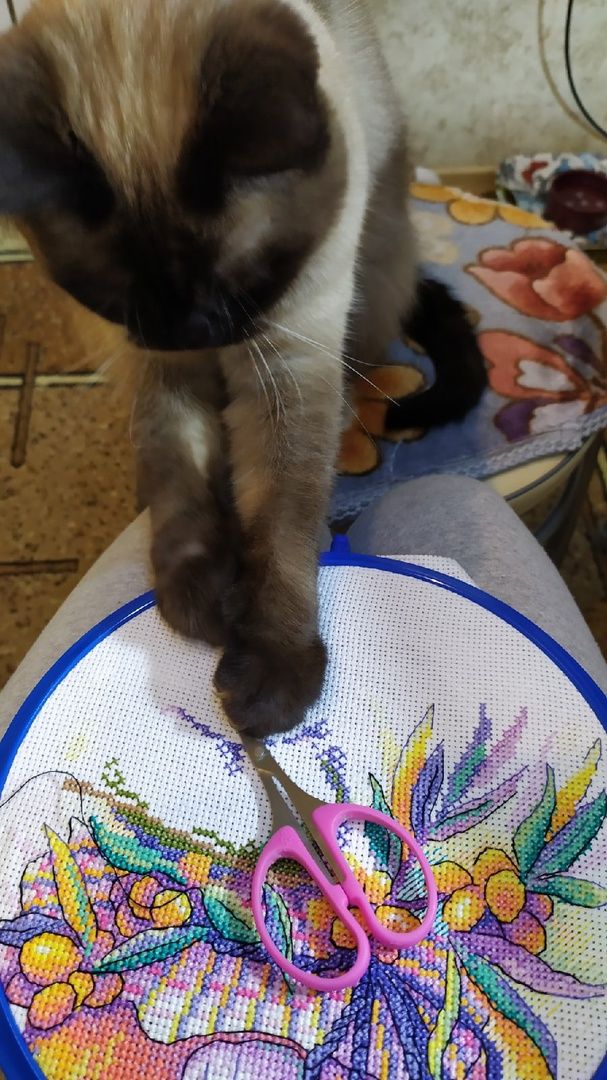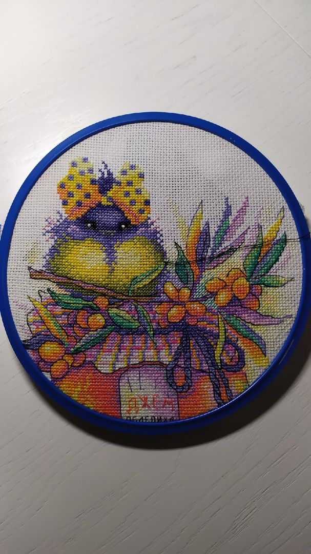 19 января 2022 Ну что наверно пора отчитаться! Всех заглянувших приветствую!!! Начнём с процессов по сезону: Уютная зима. Пыталась отшить один лист, по крестикам он примерно что то около 3000 тыс весил, но чуток не дошила. Не потому что надоел, ни в коем случае, процесс доставляет большое удовольствие, просто отвлеклась на др не менее любимый сюжет. Действительно такой теплый и уютный сюжет, котик уже подсматривает одним глазком, а сколько ещё впереди мелких деталек, предвкушаю что называется и потираю ручки. Было. Стало. В Рождестве от дим появились первые посетители. Без бэка они ещё не так ясно просматриваются, но разглядеть уже можно. Было. Стало. У нас продолжается снегопад, дома все окна наполовину в снегу, от этого темно, но как то уютно и тепло. Снежинки пушистые, крупные, витают и после так красиво налипают на карниз окна и стекло, нравится над этим наблюдать. Ну и в связи с этим конечно процесс : А снег идёт! Было. Стало. Что хочу сказать: Кажется, что отшит малюсенький участочек, ну что тут показывать? Но на самом деле тут приличненько прибавилось( 800 крестиков ) и они дались мне не легко. Канва Bestex оказалась очень жесткой, нитка с хрустом проходили, упор иголочки приходился на большой пальчик и под конец он начал болеть, пришлось прерваться. Следующий процесс шить без лейкопластыря было уже проблематично. Сейчас решила не мучаться и постирала канву, она стала мягкая, надеюсь что на этом все не комфортные ощущения закончатся. А как сюжет безумно нравится. Ниточки ПНК Кирова отлично себя вели. Сейчас у меня период ВСЕГОХОТЕНИЯ, ВЫШИТЬ ВСЁ НА ДАННЫЙ МОМЕНТ ЖЕЛАЕМОЕ И КОНЕЧНО ОБЪЯТЬ НЕОБЪЯТНОЕ! А как известно рук всего две, да и в сутках только 24 часа. Не знаю как у других, но меня старые процессы в какой то степени тяготят, не то чтобы прям очень, но не могу себе позволить начать что то новое, точнее конечно могу, но не в таких количествах как я желаю на данный момент. В связи с эти я постоянно оглядываюсь на свои хвосты и понимаю, что если их не завершу, то ещё долго к ним не приступлю. Ну к примеру в эту номинацию у меня попал мой процесс замечательных дед морозиков от дим, но обещаю я найду для него время. Но а пока закрутим гаечку моей птахе, ей по видимому повезло больше и я поделилась с ней своей вышивальной энергией. Но не буду лукавить, шила её не одна, у меня появилась мохнатая помощница. Облепишка от всем известной МП Студии. Было. Стало. Эту птичку планирую подарить маме на 8 Марта, она по цветовой гамме на кухне она отлично ей подойдет. Оставалось дошить всего то ничего около 2000 крестиков плюс бэк. После жесткой канвы это было как бальзам на душу. Канва тут рыхленькая, мягонькая, иголочка сама ныряла. Пару вечеров и она оказалась готова! Ниточек всех хватило, вот такие остаточки. Специально для нее заказала рамку и ее должны были привезти к 20 января. И вот вечером я ее закончила, а на утро пришло оповещение, что заказ прибыл. Получив раму сразу оформила. Сперва конечно была в замешательстве и некое оформление видилось мне малость по другому ( что то типо пинкипа), а на деле оказалось совсем не так. Но не так страшен чёрт, как его малюют. Сложного абсолютно ничего нет, главное правильно вымерить и правильно отрезать нужный формат канвы, во всём остальном справится даже ребенок. Биндерами зажала, чтоб не было смещений и удобно было сшивать. По совету пр