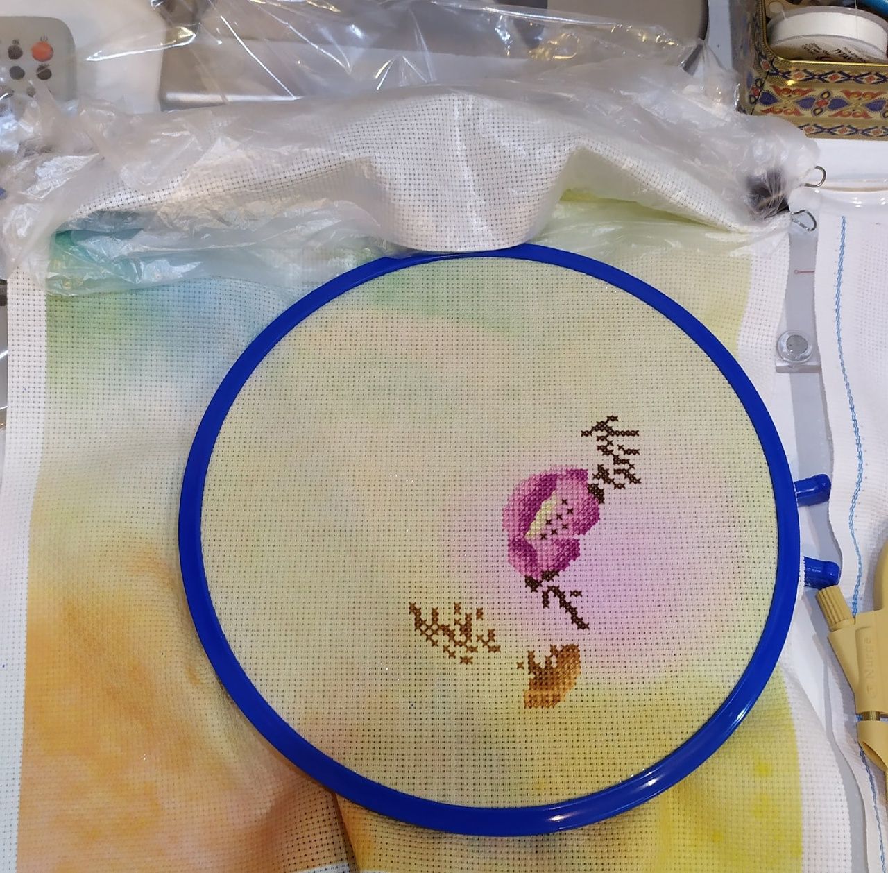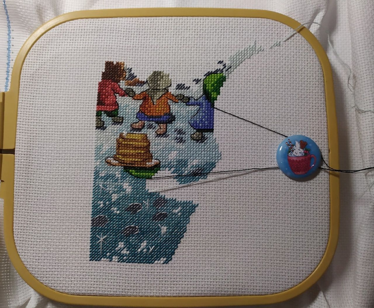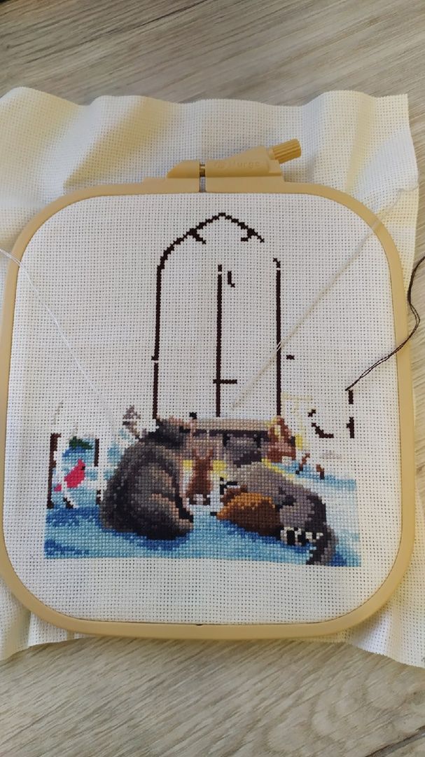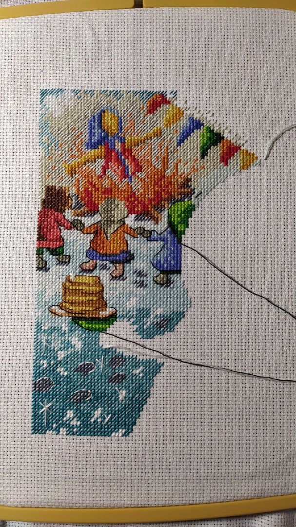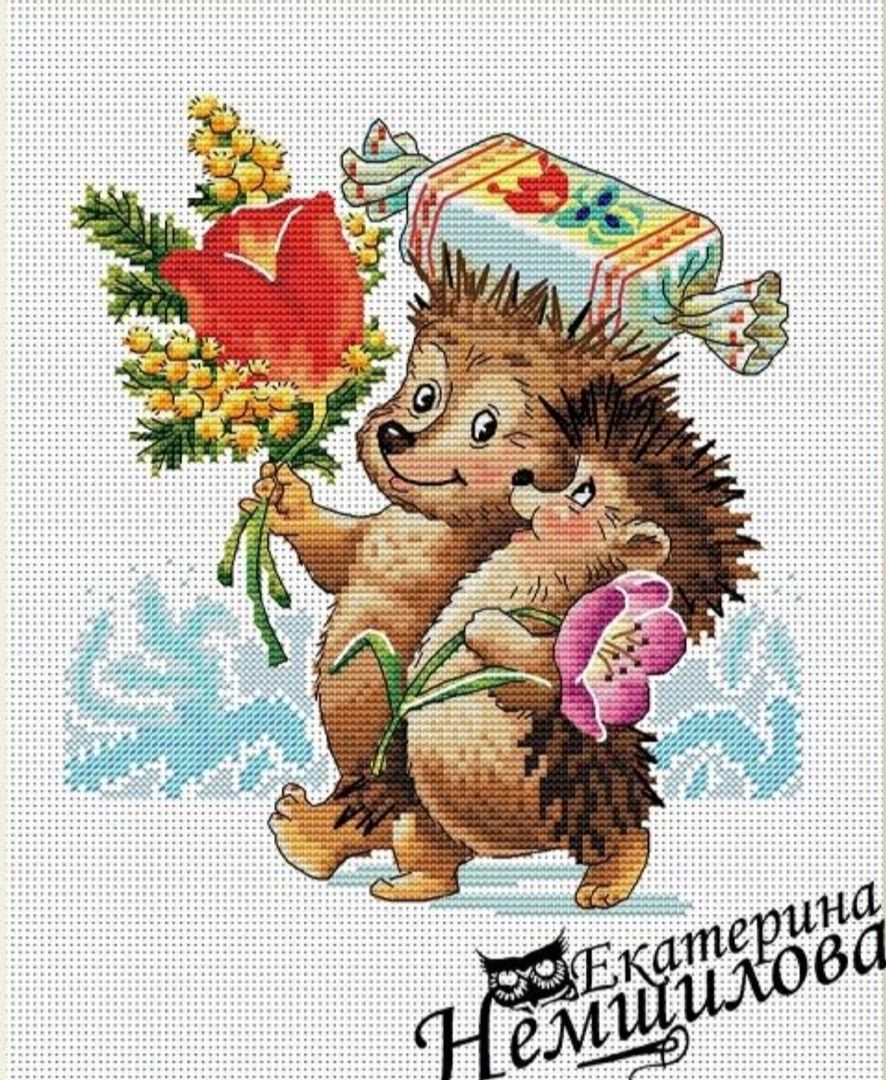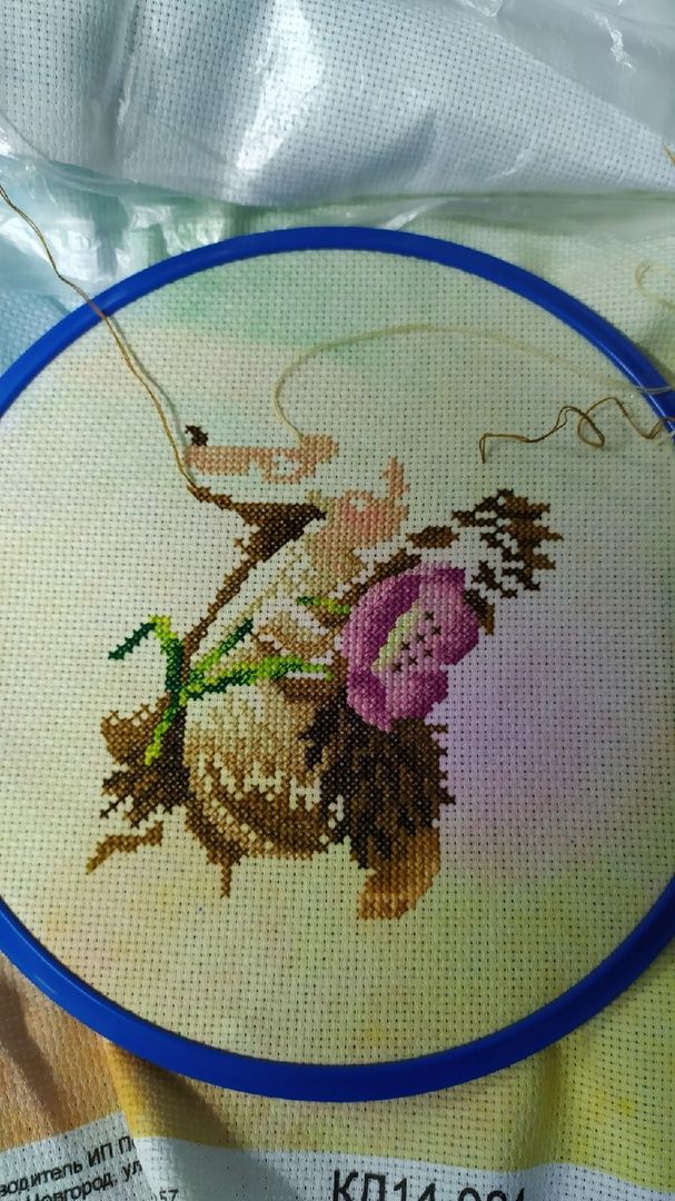 4 февраля 2022 Всем приветик. Ну что неделька позади, надо бы отчитаться. Начну с текущего процесса под кодовым названием Марфуша Сметановна, она же Весёлая масленица от МП Студии. Было. Стало. Добавился у меня костерок и ещё один уголок картинки отшит. Фон достался мне с трудом, так как ниточки под номером 33 (в одну ниточку) совсем не вышивались, через каждые 5 полукрестиков рвались как труха. Я этот символ наверно дольше шила чем всё остальное. Так как ниточки гамма решила в дальнейшем взять из своих запасов и посмотреть как будет отшиваться, надеюсь не придется больше так мучаться. В остальном вроде всё нормально было. Не очень мне конечно нравится бэк в две нити, особенно светлыми ниточками, но не стала ничего менять. Далее были конечно старты, об одном я как то уже упоминала, так вот крутим гаечку. Колючая ( восьмимартовская) парочка от Екатерины Немшиловой. Технические характеристики: Так как не хотела шить задний фон что то типо оставшегося снега, вышивать решила на дизайнерской канве от МП Студии, размер 40X30 артикул канвы КД14-084. Ориентировочный размер на 14 аиде без учёта припусков на оформление 27X22, 30 чистых цветов и 23 блэнда, стежки крест, бэкстич и 3/4 креста, полукрест в моем случае будет отсутствовать, так как он только в снежном фоне. Так как дизайнер предлагает ниточки в двух палитрах дмс и гамма, я решила все основные участки шить дмс, но несколько не столь значительных цветов взяла в и гамме. Не смотря на то, что в схеме достаточное количество 3/4 креста, шьется на одном дыхании. За счёт этого линии получаются более плавными и красивыми. Особенно понравилось, как вышился тюльпанчик. Как не странно, самое большое количество 3/4 креста будет в конфете, но об этом подумаем позже, пока только кайф от процесса. Да и сама канва классная: в меру жесткая, края обработанные, прокрас ровный без каких либо пятен, но и в тоже время не сильно яркий и не будет отвлекать от основных персонажей. Пыталась интересно размесить вышивку и по моей задумке должно было быть так: тюльпанчик в районе розового фона, конфета на бледно зеленом, главный букетик на голубом. Это был не главный процесс моей вышивальной недели, но кое какой результат уже имеется и если присмотреться, то можно увидеть мордашку первого ёжика. Продолжаем старты! Это конечно громко сказано, но 1004 бисеринки всё же занимают энное количество времени. Маленькие шаги и подготовка к ПАСХЕ. Пасхальное яичко от торговой марки Волшебная страна. Комплектующие на высоте, вышила очень быстро буквально за 4 часа. Сперва думала рано ещё его отшивать и показывать, но посмотрела, что девочки уже в галерее выставляют свои работы и подумала, а почему бы и нет. Ещё был один совсем крохотный процессик, но такой нужный тоже от Волшебной страны. Этот нужный наборчик с нитковдевателем получила в подарок от сестры по иголочке и вдвойне приятно что он и тематически подобран( тут же вишенки).Сейчас только вспомнила, что у меня есть именной органайзер( Вишенка аллая) так что в паре они будут классно смотреться и создавать мне настроение. Составляющие наборчика на высоте, всё продумано, всего хватает и эти милые открыточки просто прелесть, обожаю их. В этом году просто шикарная и снежная зима, всё как в детстве. На против дома у нас парк и утром глянешь в окно, а там такая красота неземная. На фоне этих снежных барханов и вс